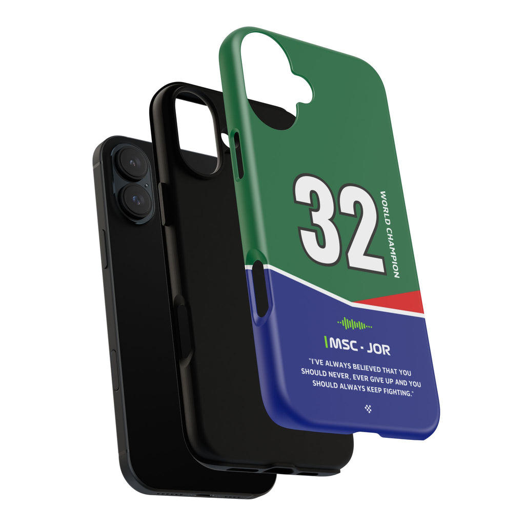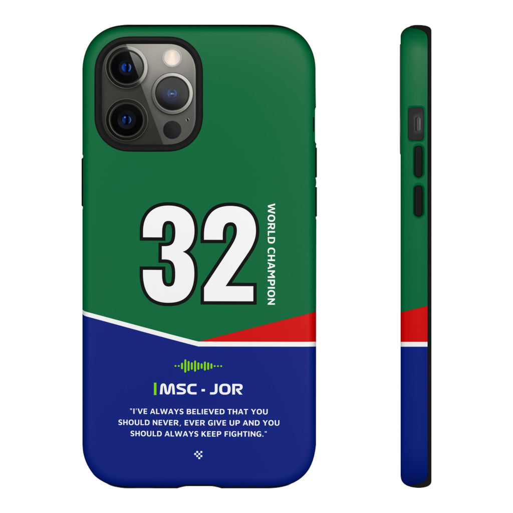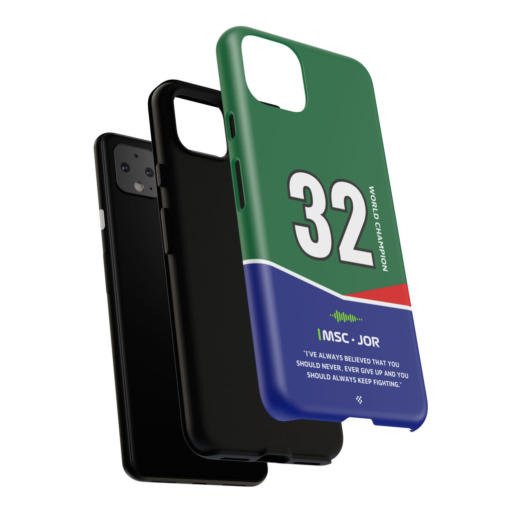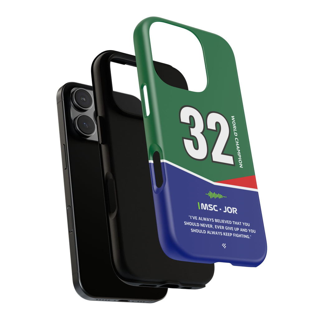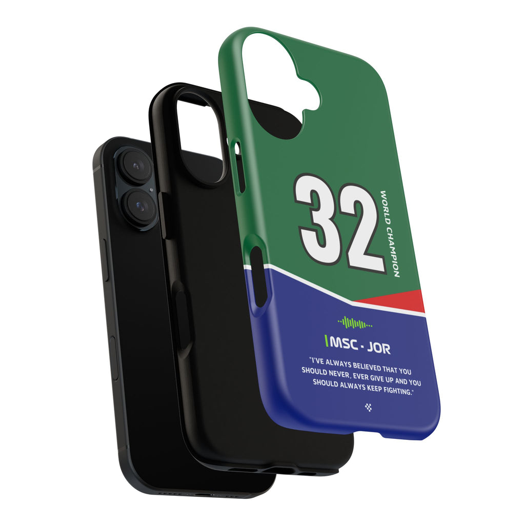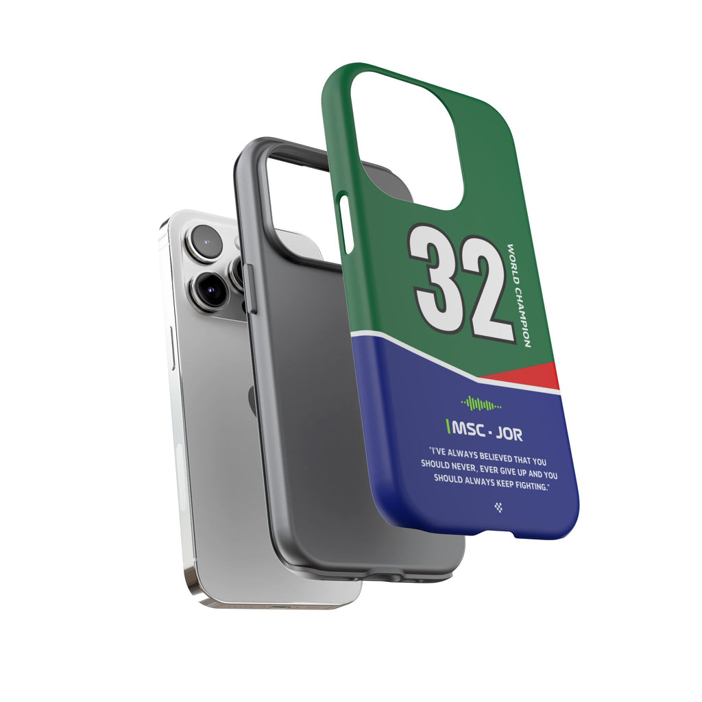 Make sure his legacy persists with the exclusive Michael Schumacher F1 Legend Phone Case. It's the perfect accessory for every passionate Formula 1 and Schumacher fan. Featuring Michael's iconic #32 race number and the bold 1991 Jordan team colors, this green phone case brings racing energy straight to your hand.