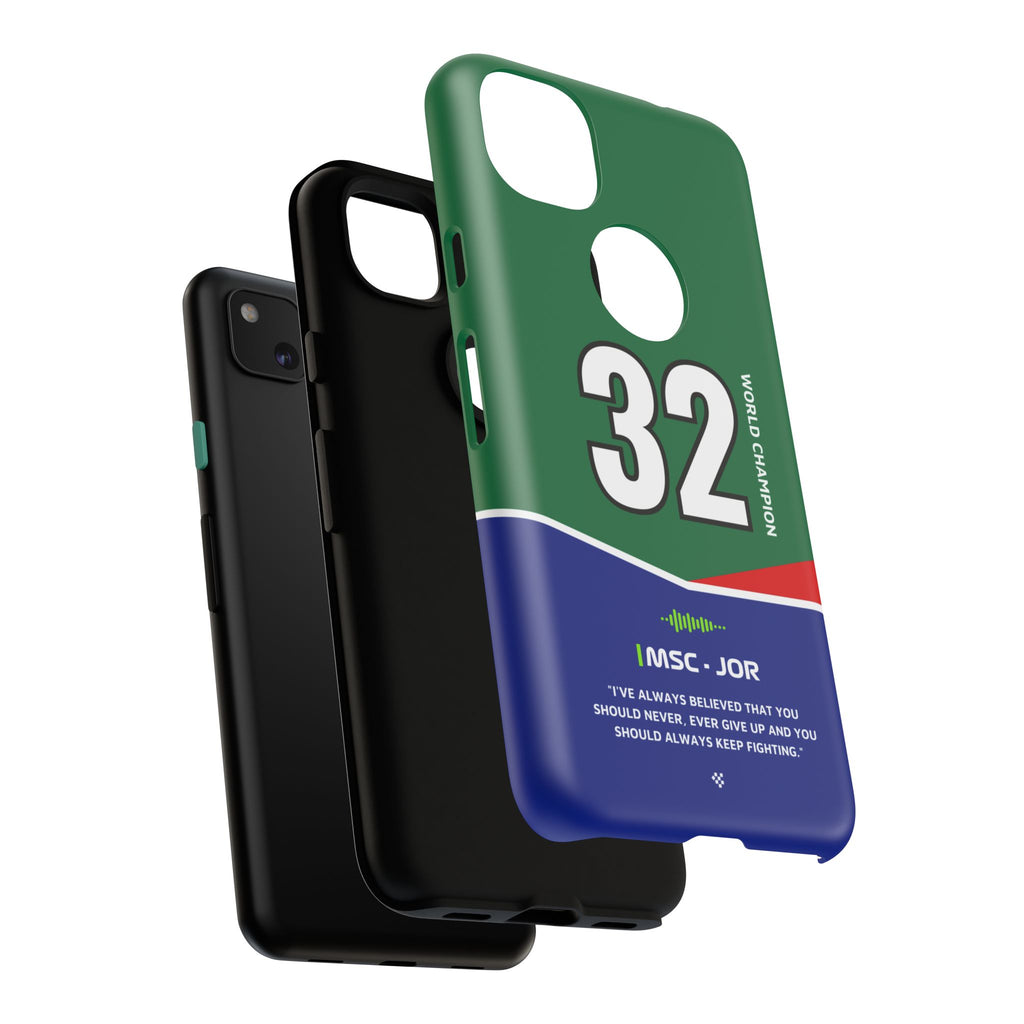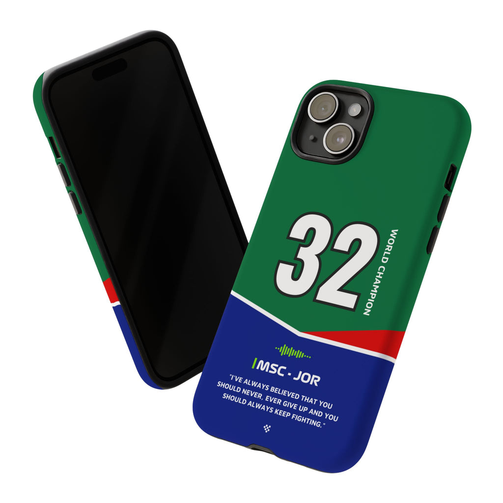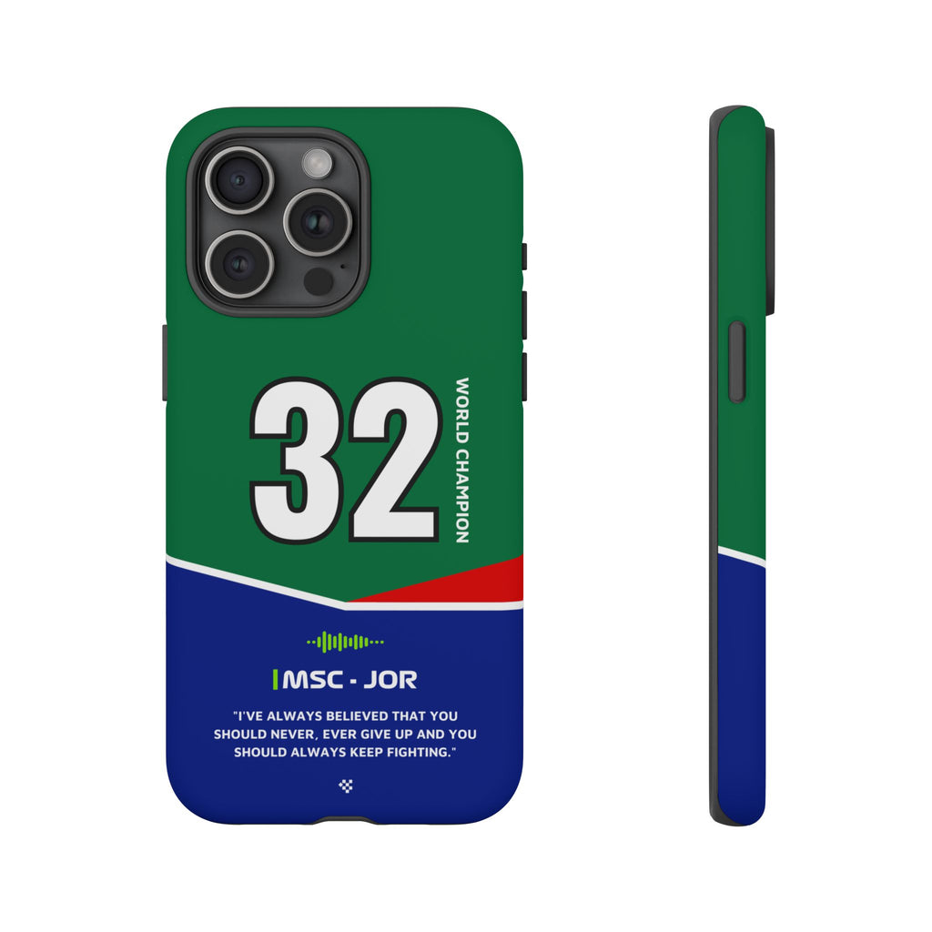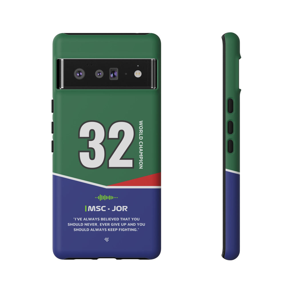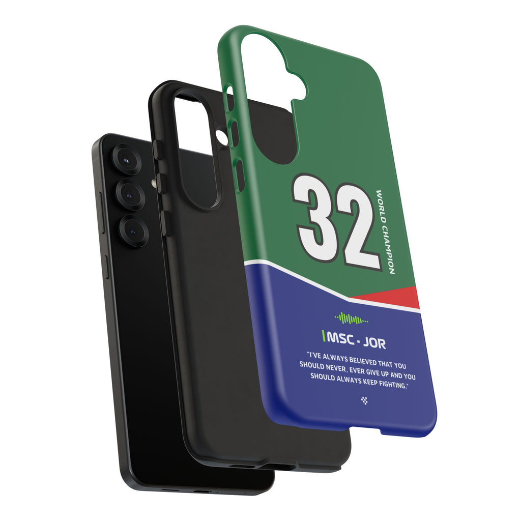 Make sure his legacy persists with the exclusive Michael Schumacher F1 Legend Phone Case. It's the perfect accessory for every passionate Formula 1 and Schumacher fan. Featuring Michael's iconic #32 race number and the bold 1991 Jordan team colors, this green phone case brings racing energy straight to your hand.