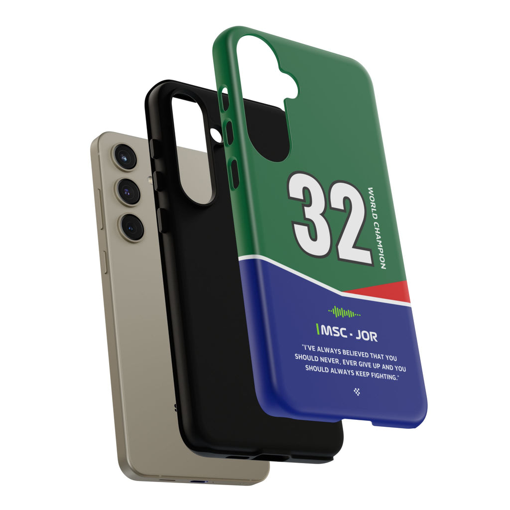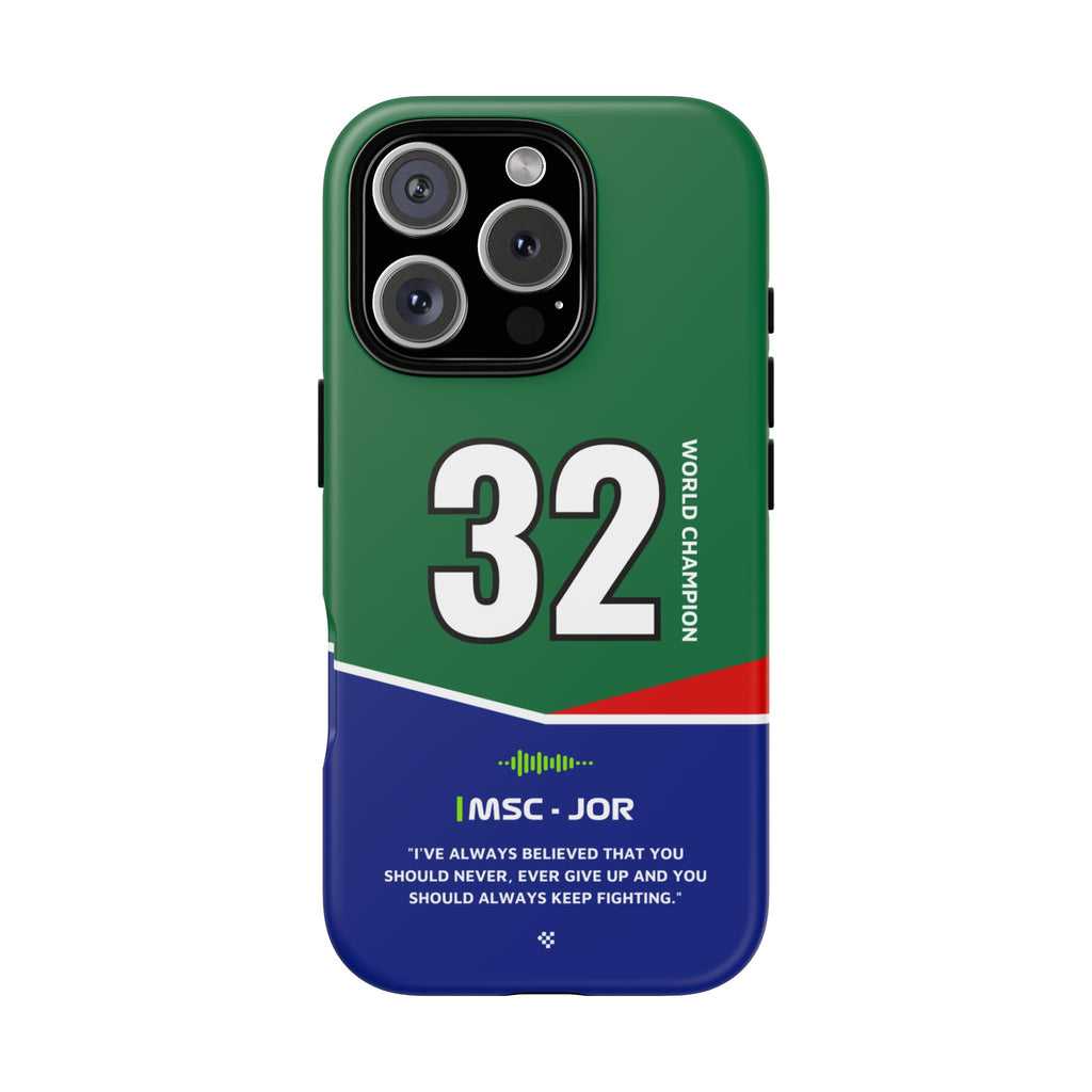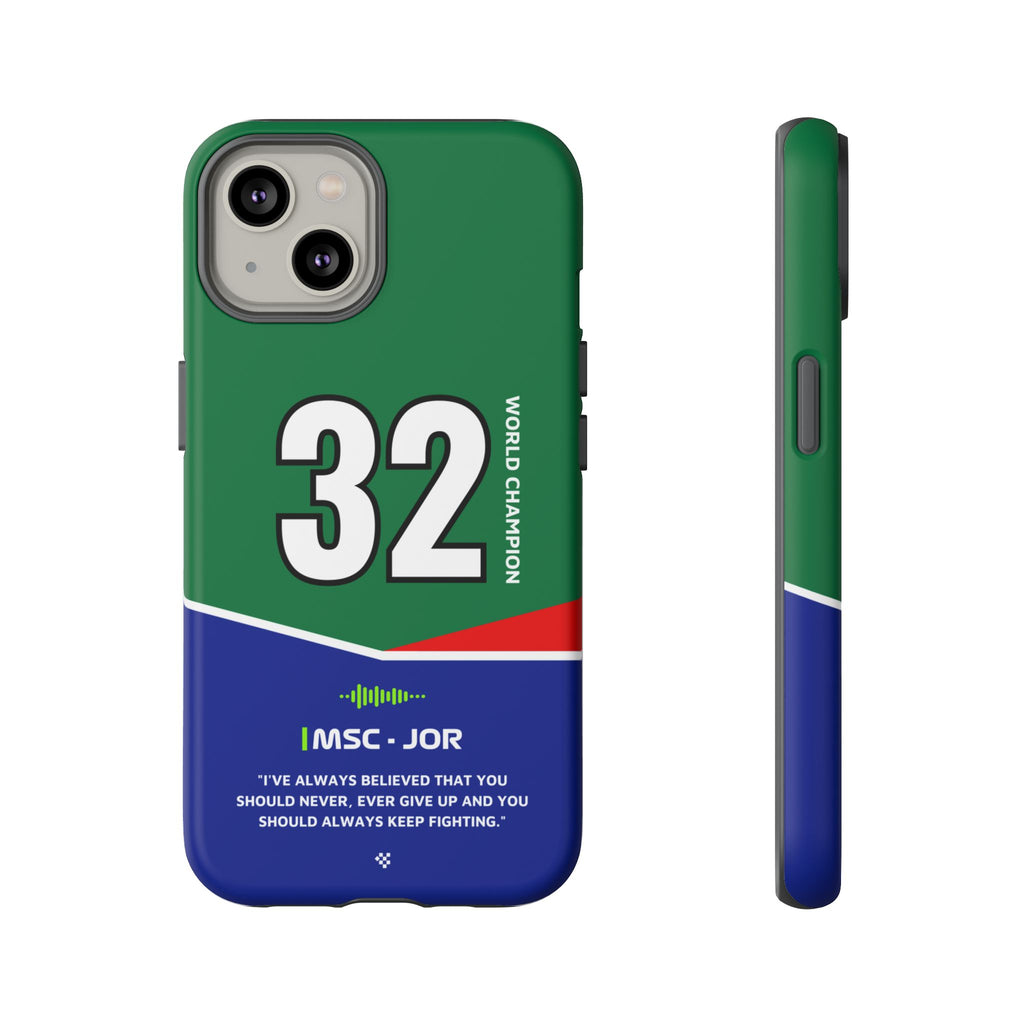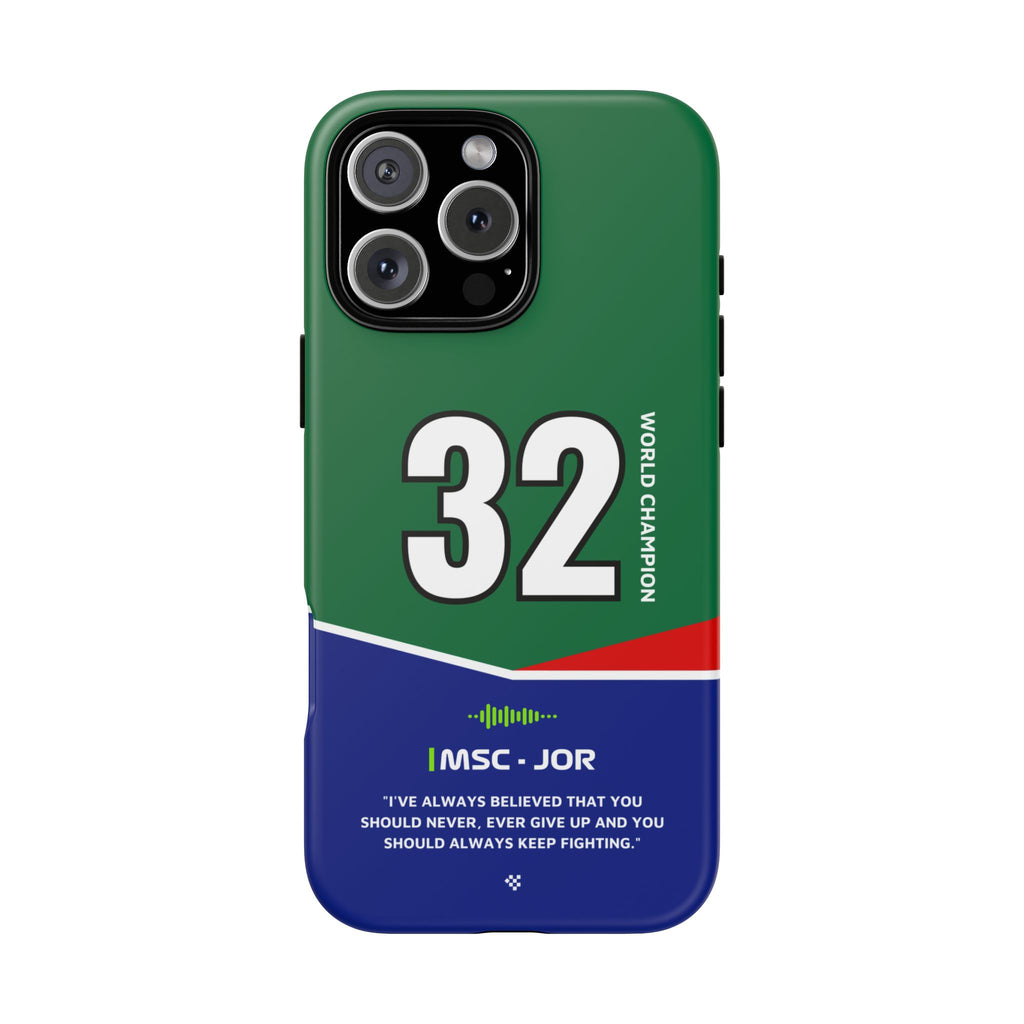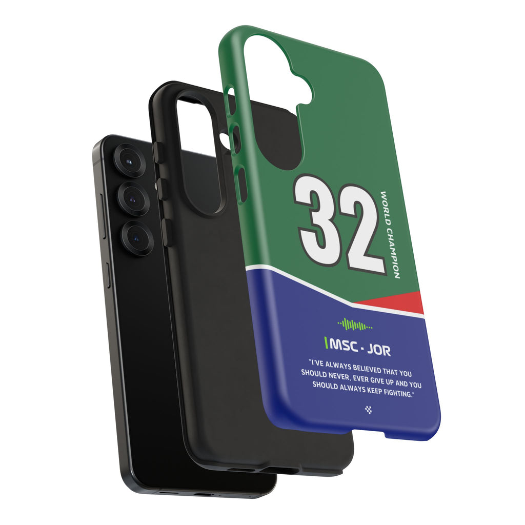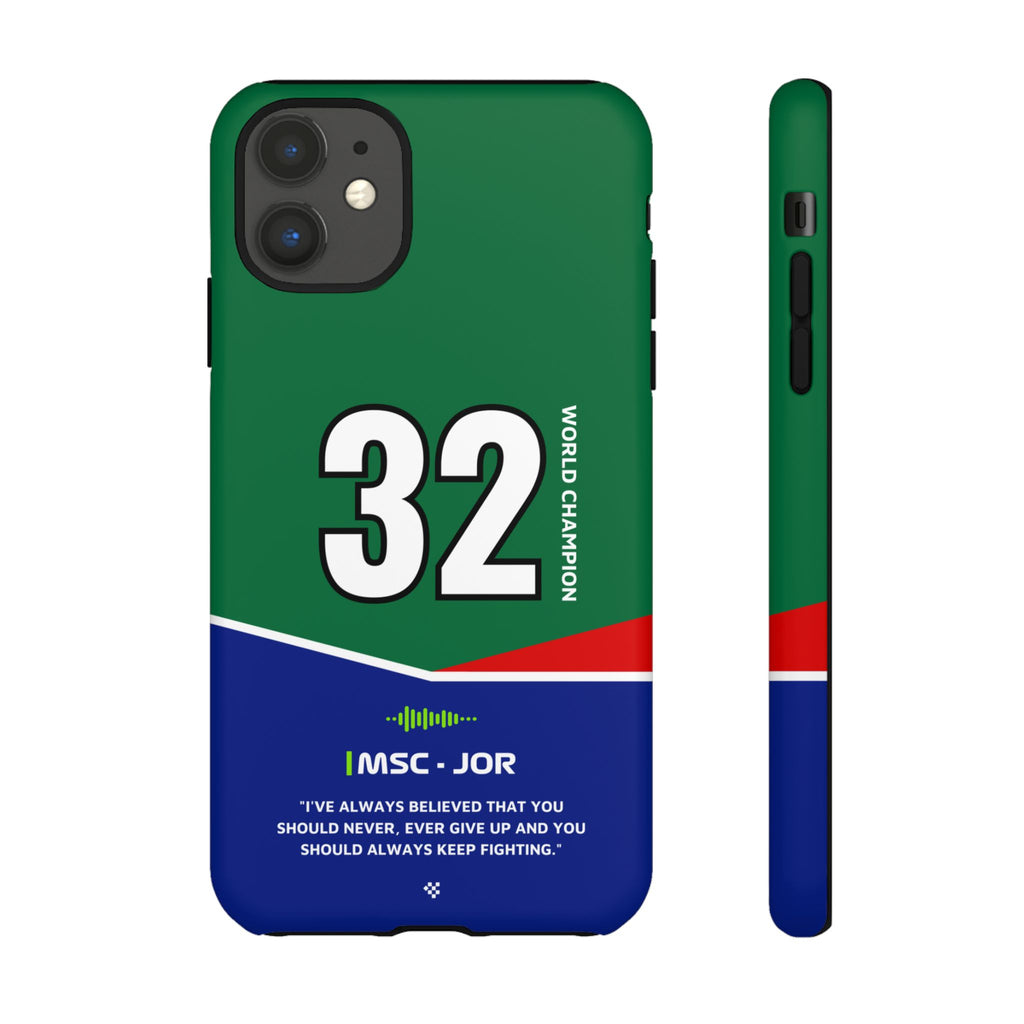 Make sure his legacy persists with the exclusive Michael Schumacher F1 Legend Phone Case. It's the perfect accessory for every passionate Formula 1 and Schumacher fan. Featuring Michael's iconic #32 race number and the bold 1991 Jordan team colors, this green phone case brings racing energy straight to your hand.