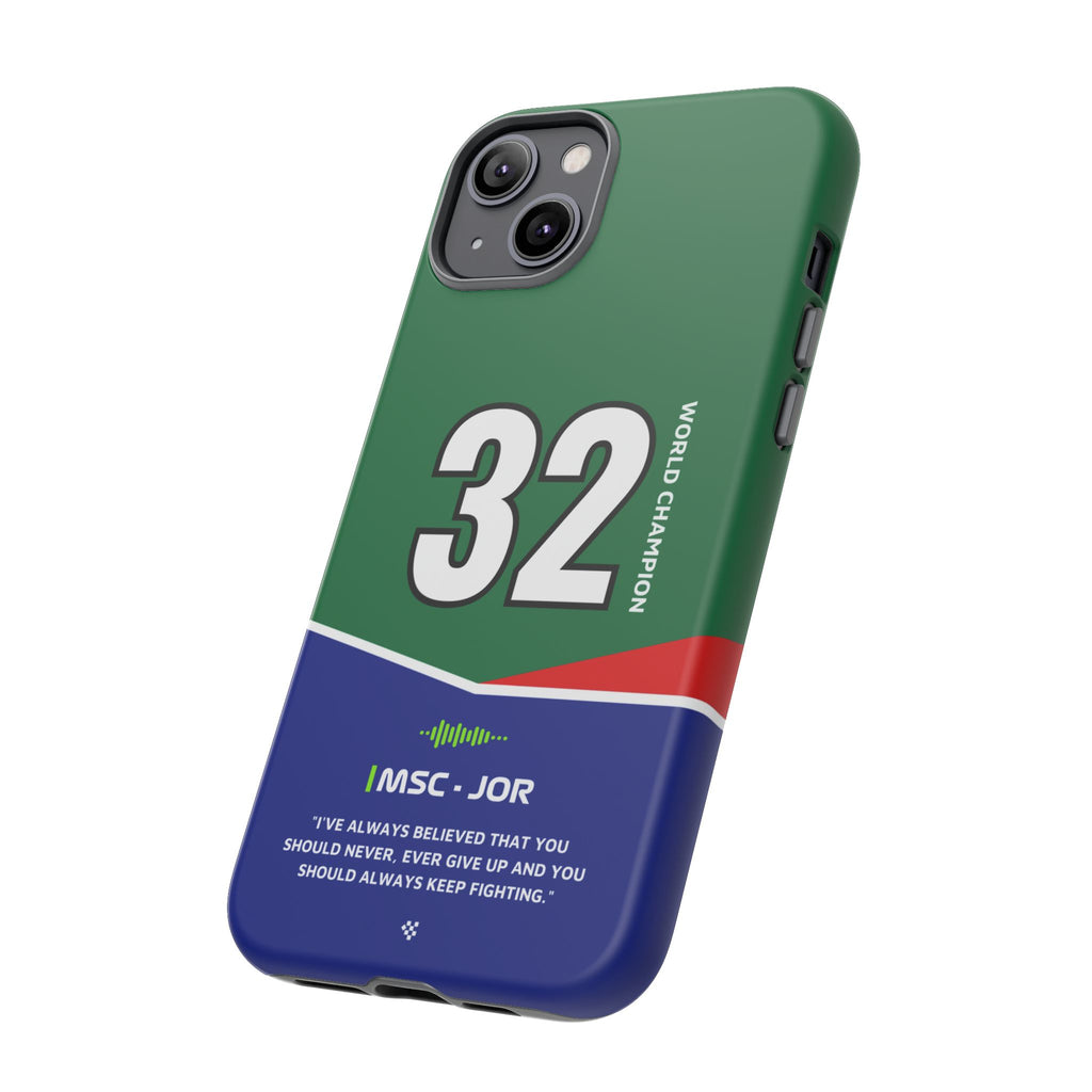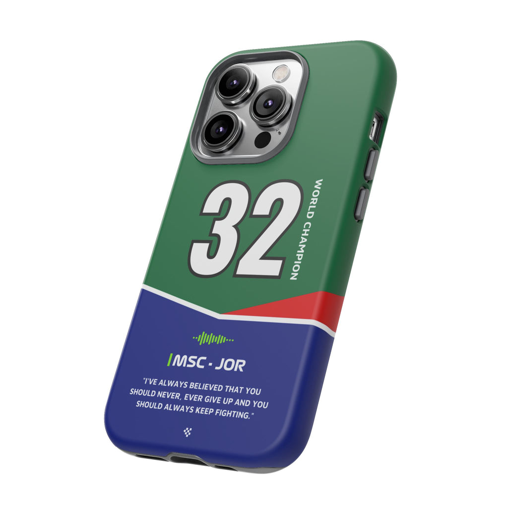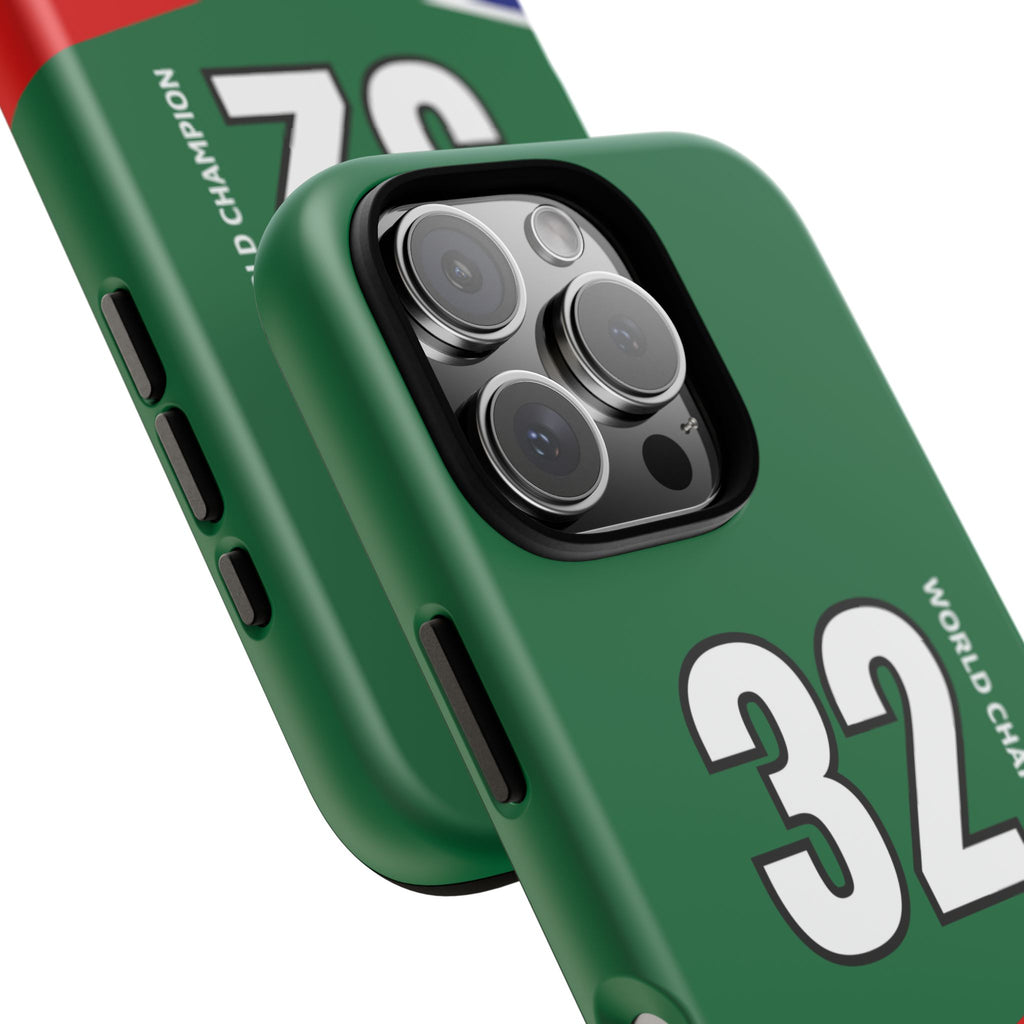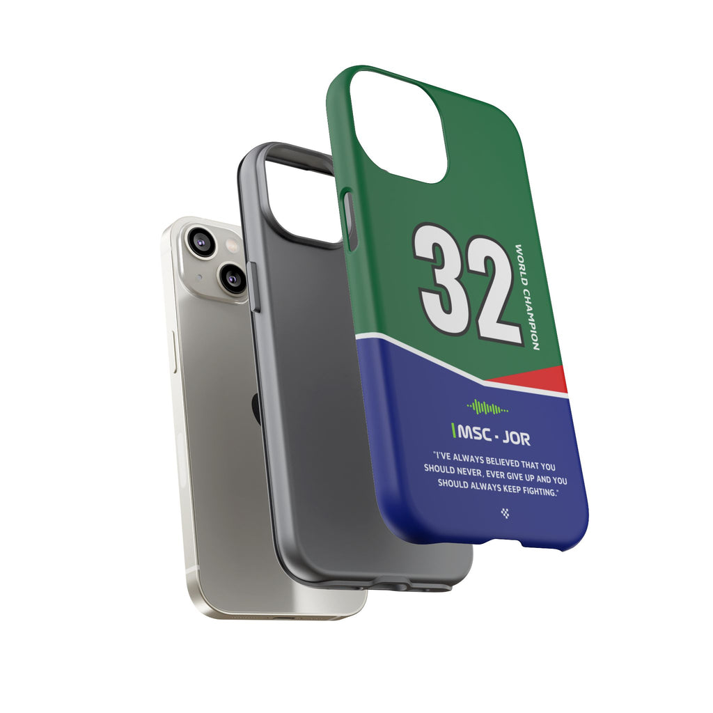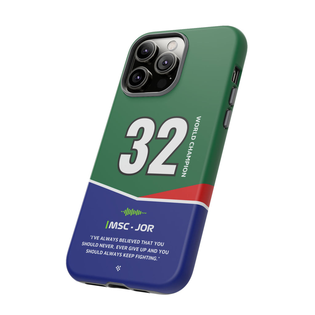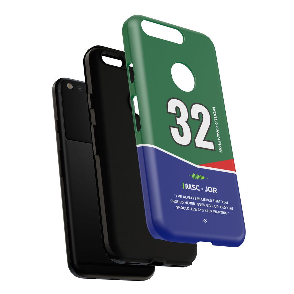 Make sure his legacy persists with the exclusive Michael Schumacher F1 Legend Phone Case. It's the perfect accessory for every passionate Formula 1 and Schumacher fan. Featuring Michael's iconic #32 race number and the bold 1991 Jordan team colors, this green phone case brings racing energy straight to your hand.