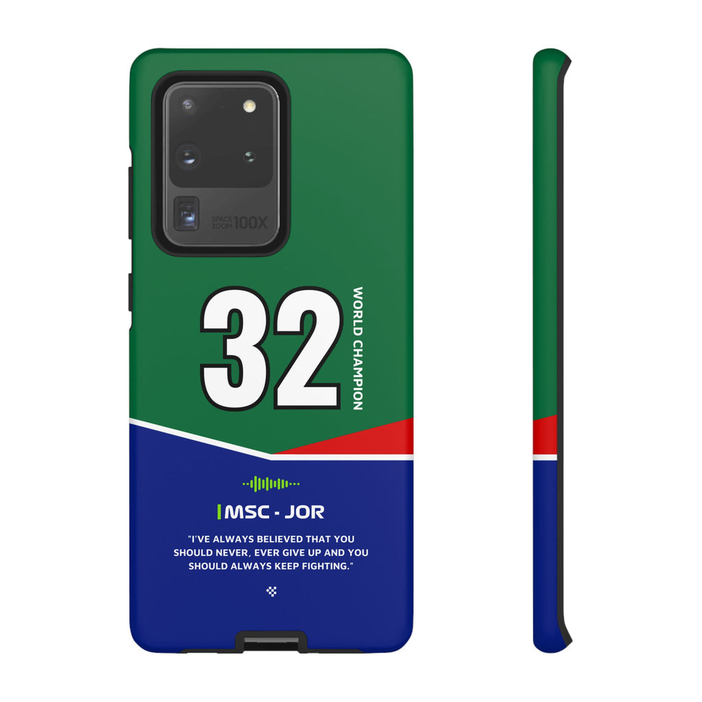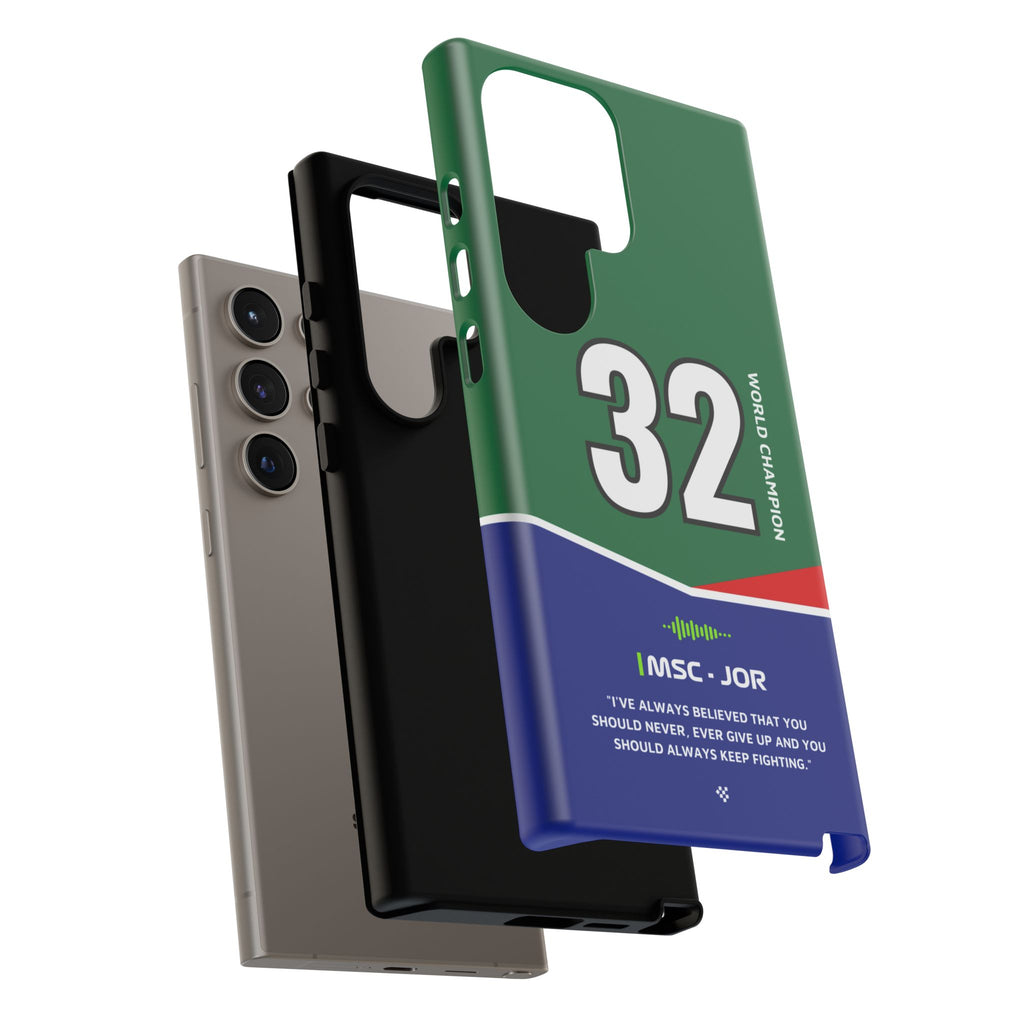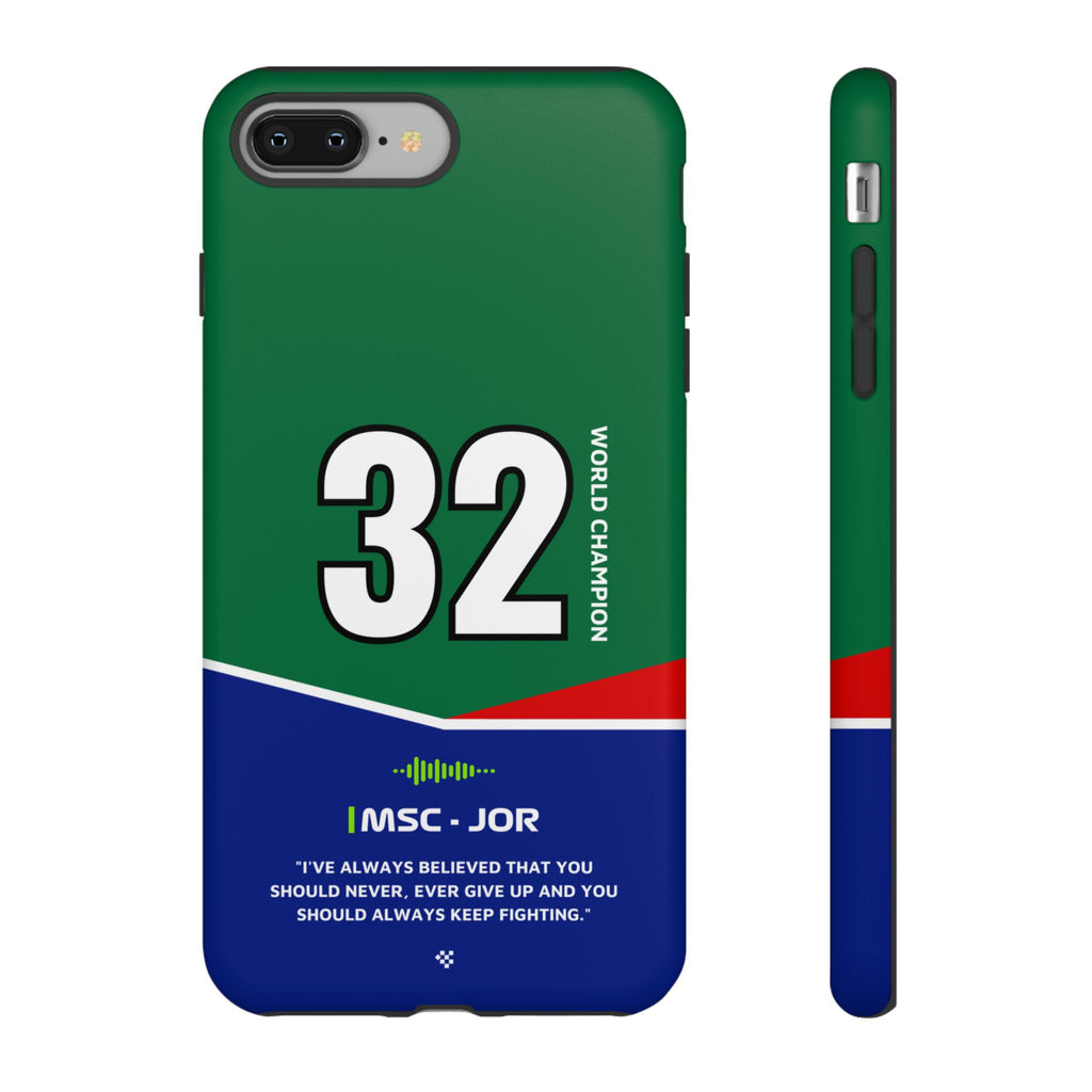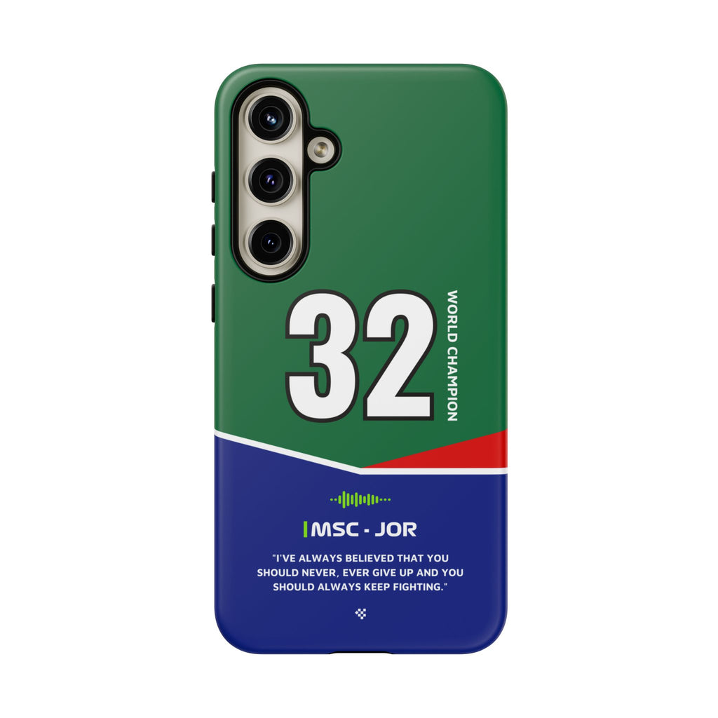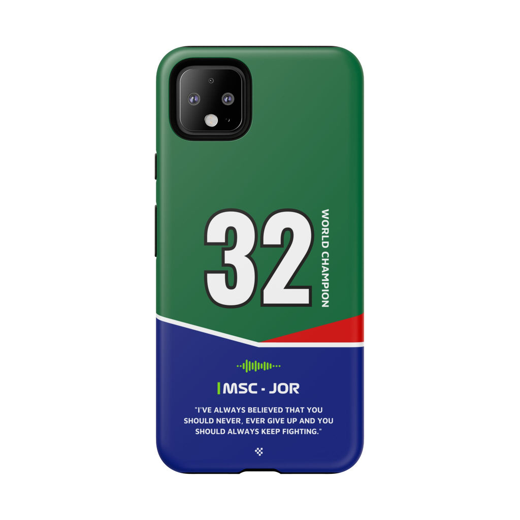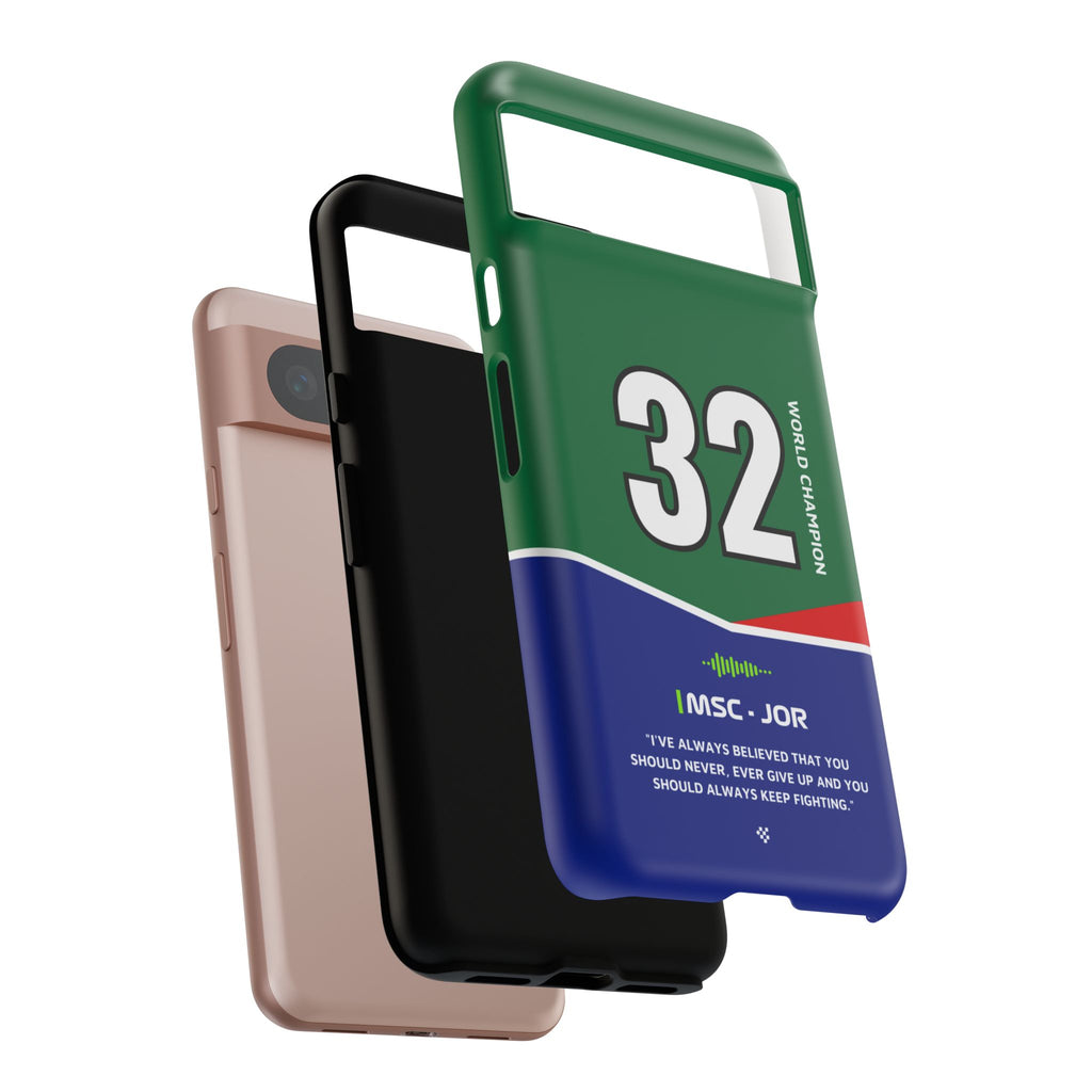 Make sure his legacy persists with the exclusive Michael Schumacher F1 Legend Phone Case. It's the perfect accessory for every passionate Formula 1 and Schumacher fan. Featuring Michael's iconic #32 race number and the bold 1991 Jordan team colors, this green phone case brings racing energy straight to your hand.