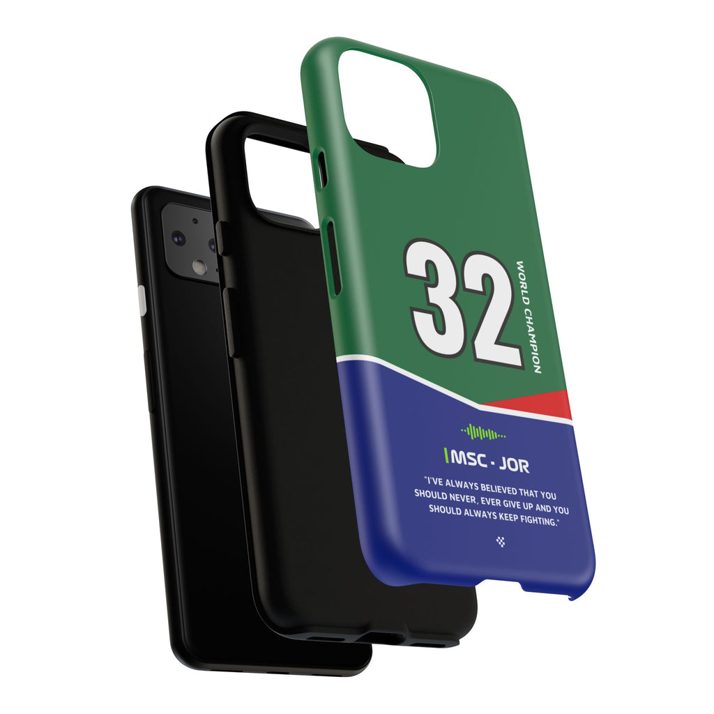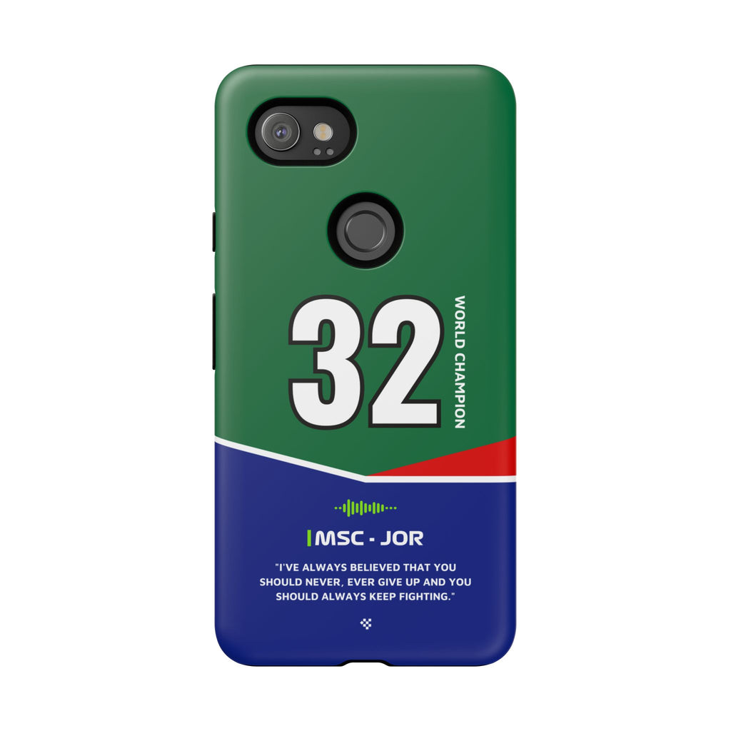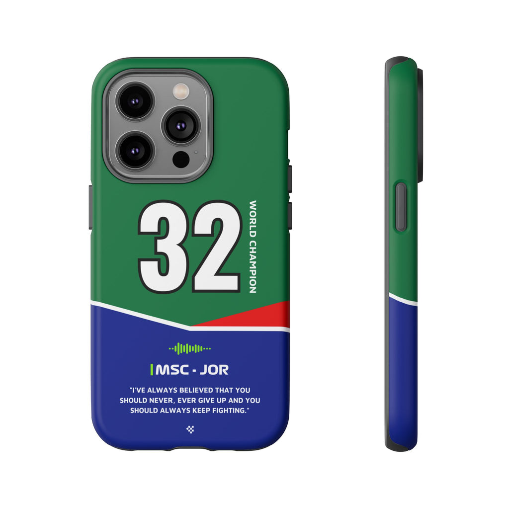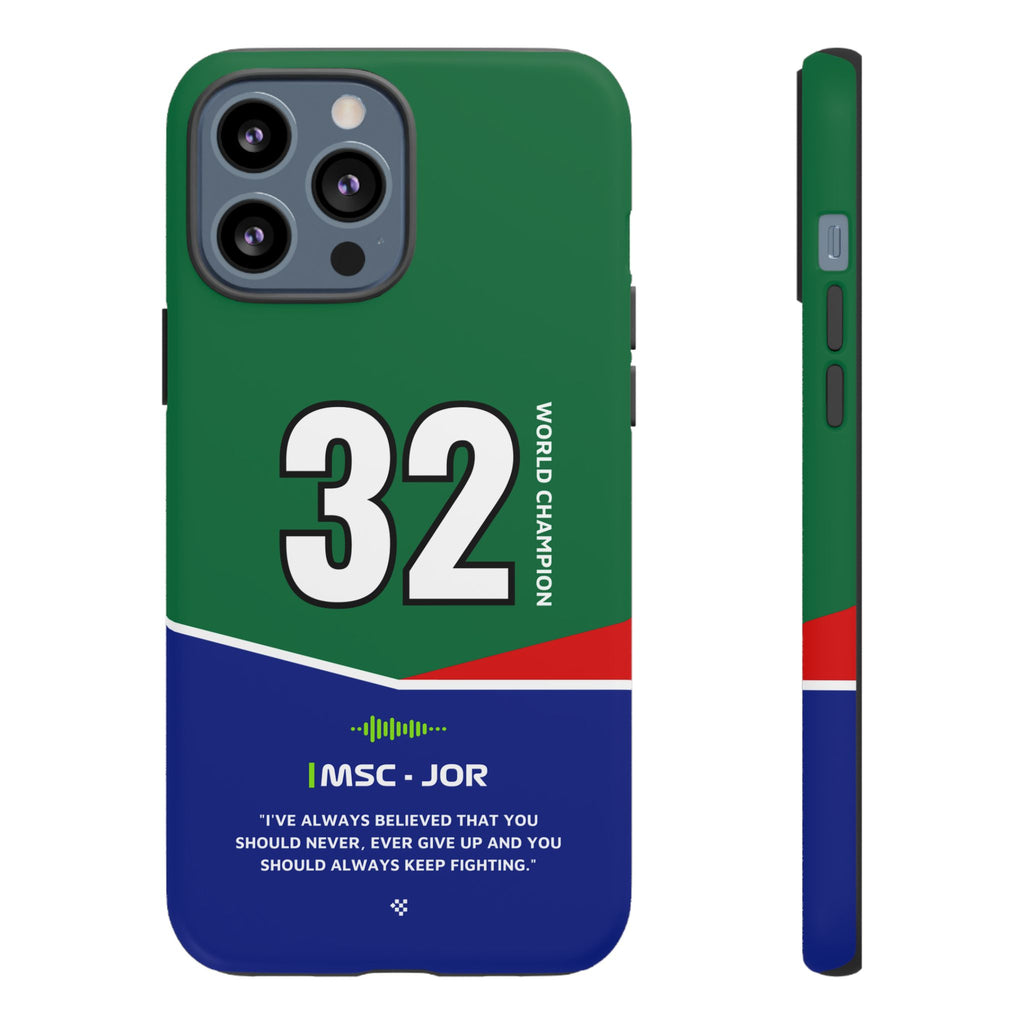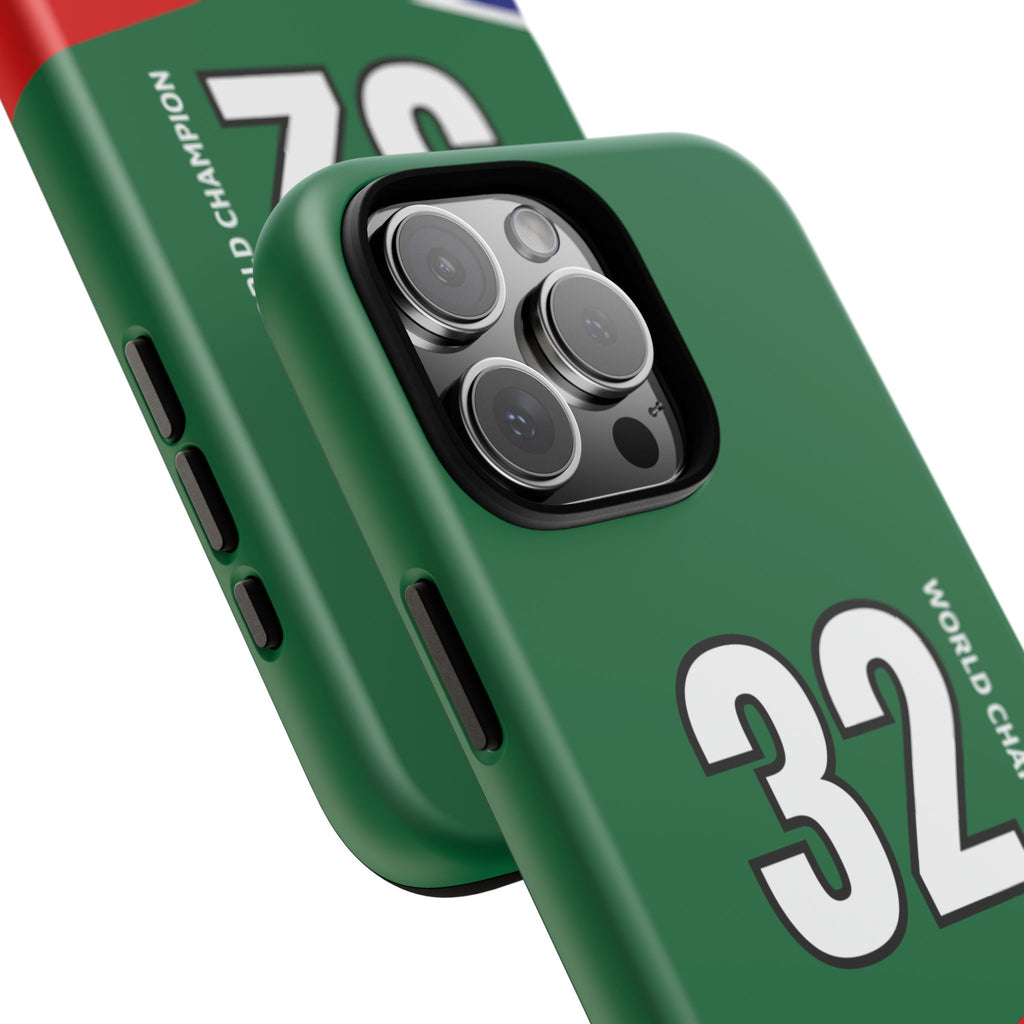 Make sure his legacy persists with the exclusive Michael Schumacher F1 Legend Phone Case. It's the perfect accessory for every passionate Formula 1 and Schumacher fan. Featuring Michael's iconic #32 race number and the bold 1991 Jordan team colors, this green phone case brings racing energy straight to your hand.