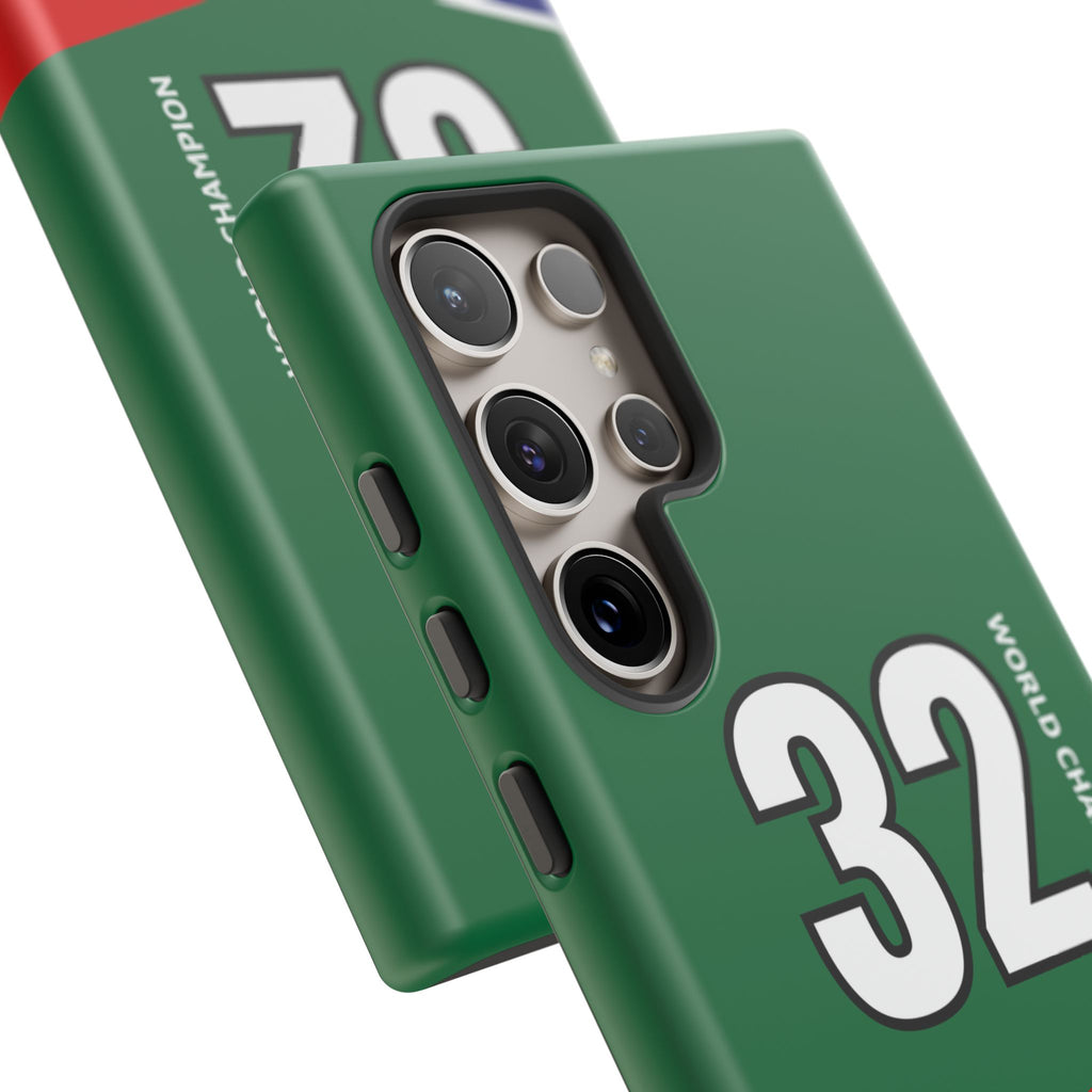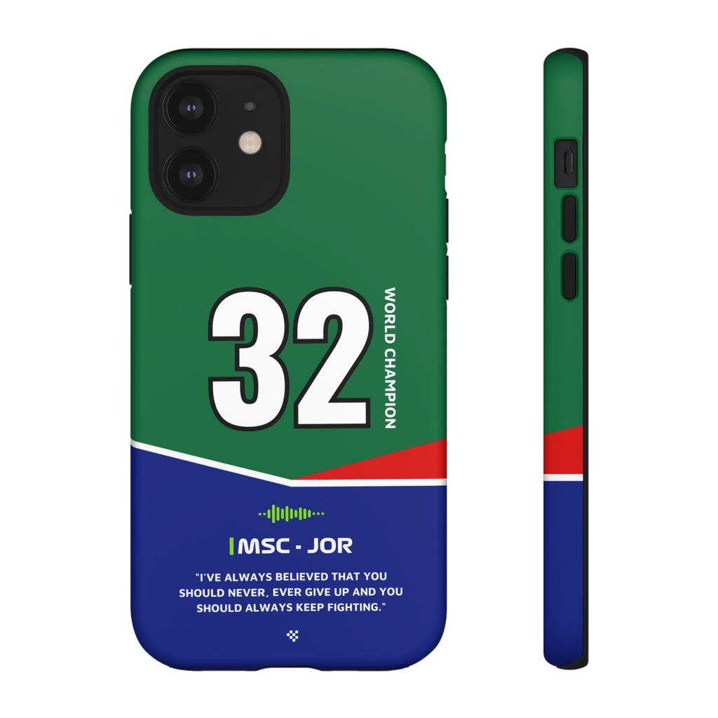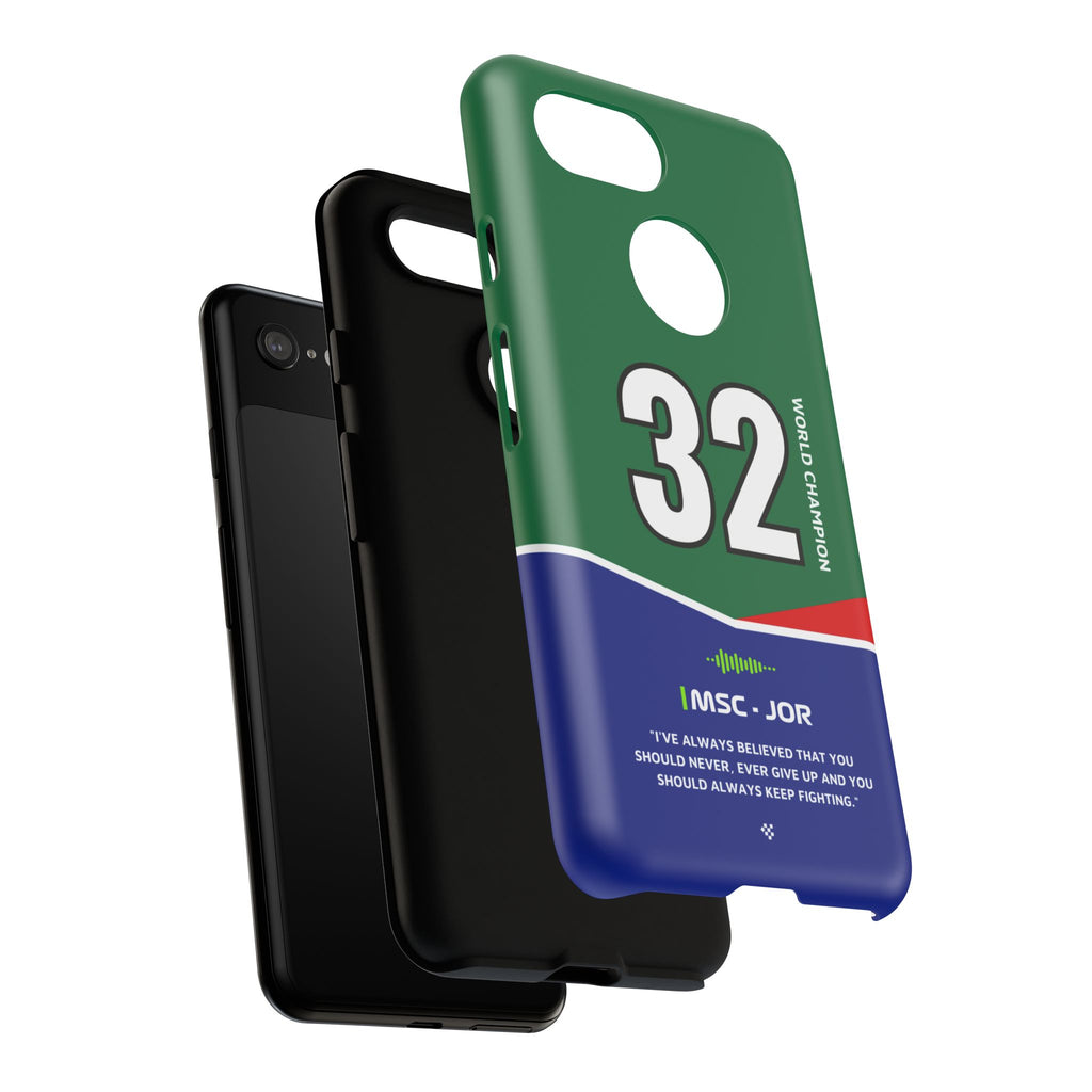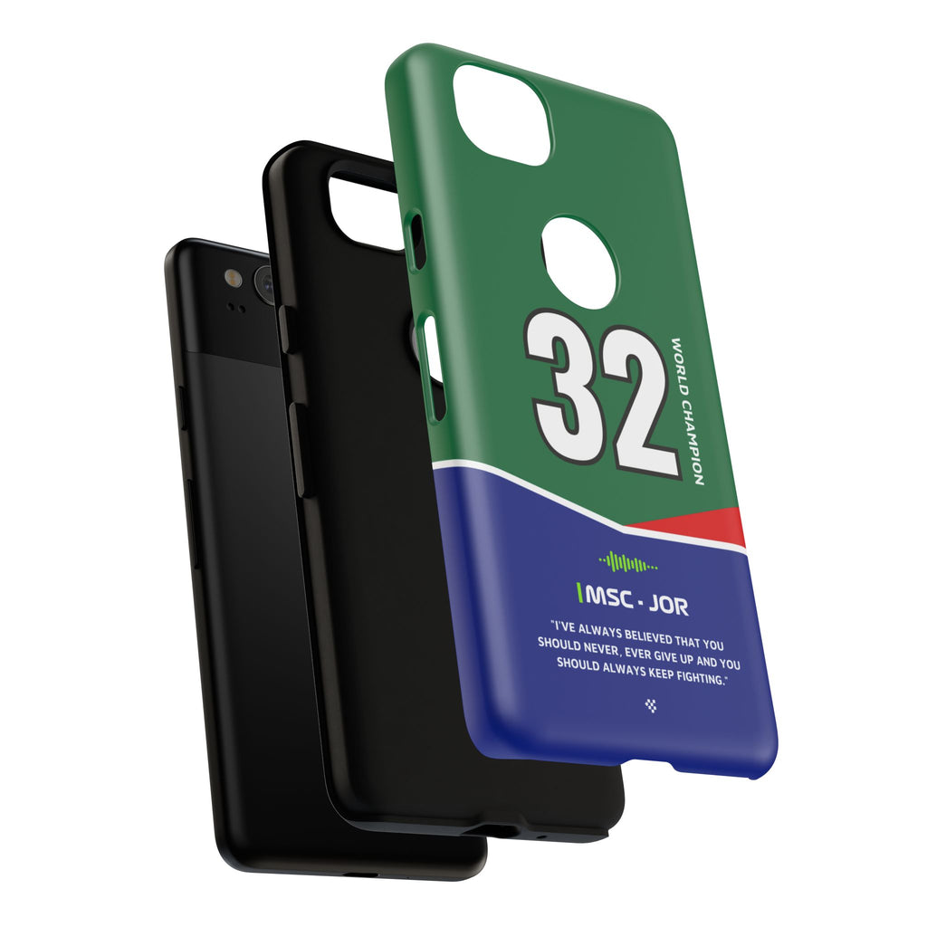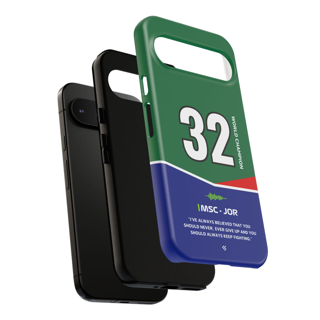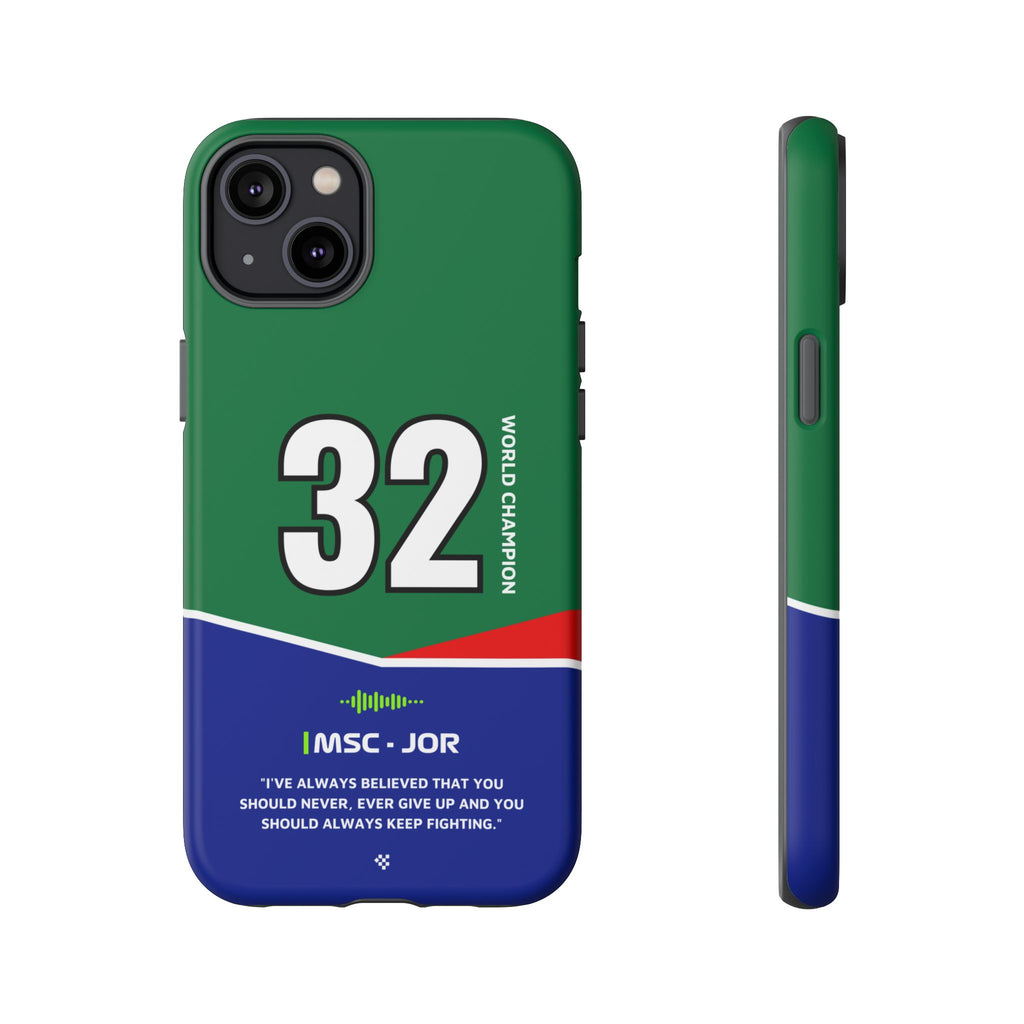 Make sure his legacy persists with the exclusive Michael Schumacher F1 Legend Phone Case. It's the perfect accessory for every passionate Formula 1 and Schumacher fan. Featuring Michael's iconic #32 race number and the bold 1991 Jordan team colors, this green phone case brings racing energy straight to your hand.