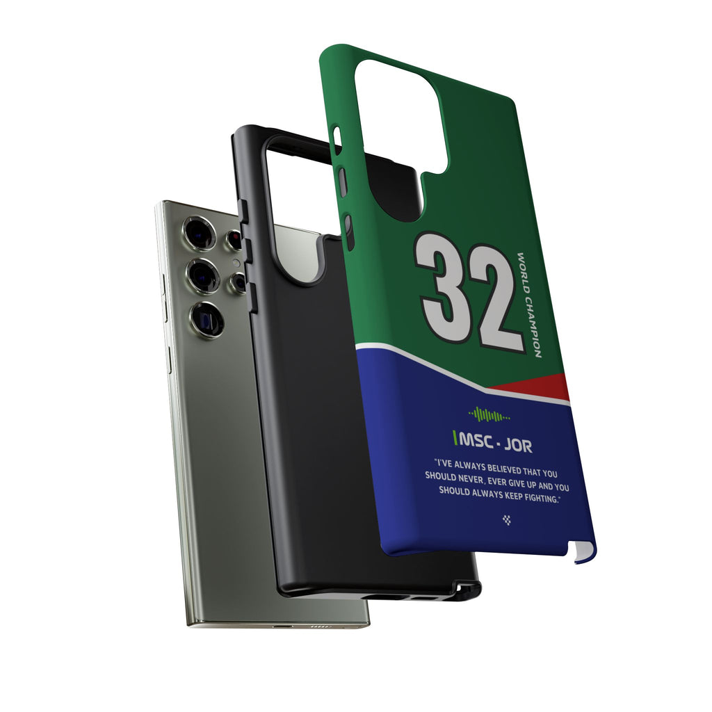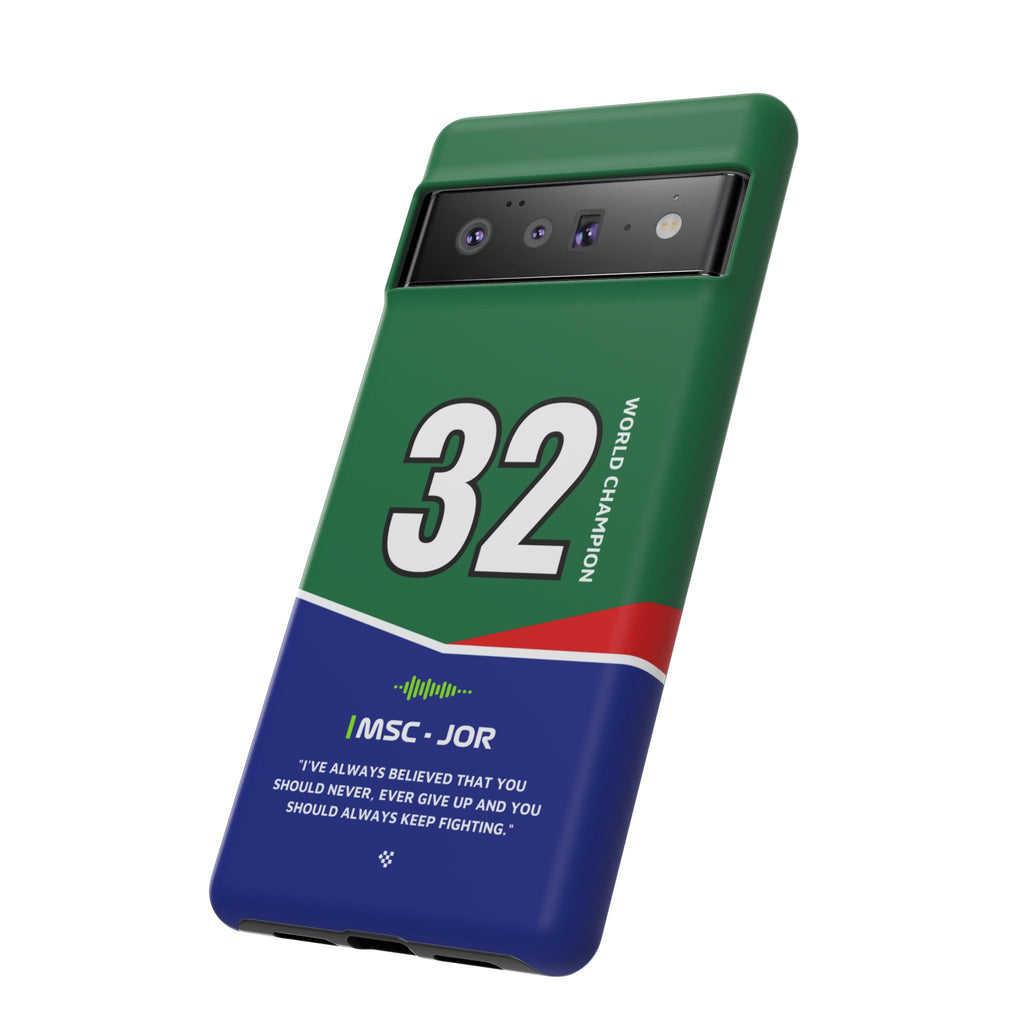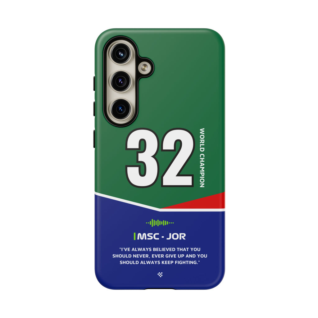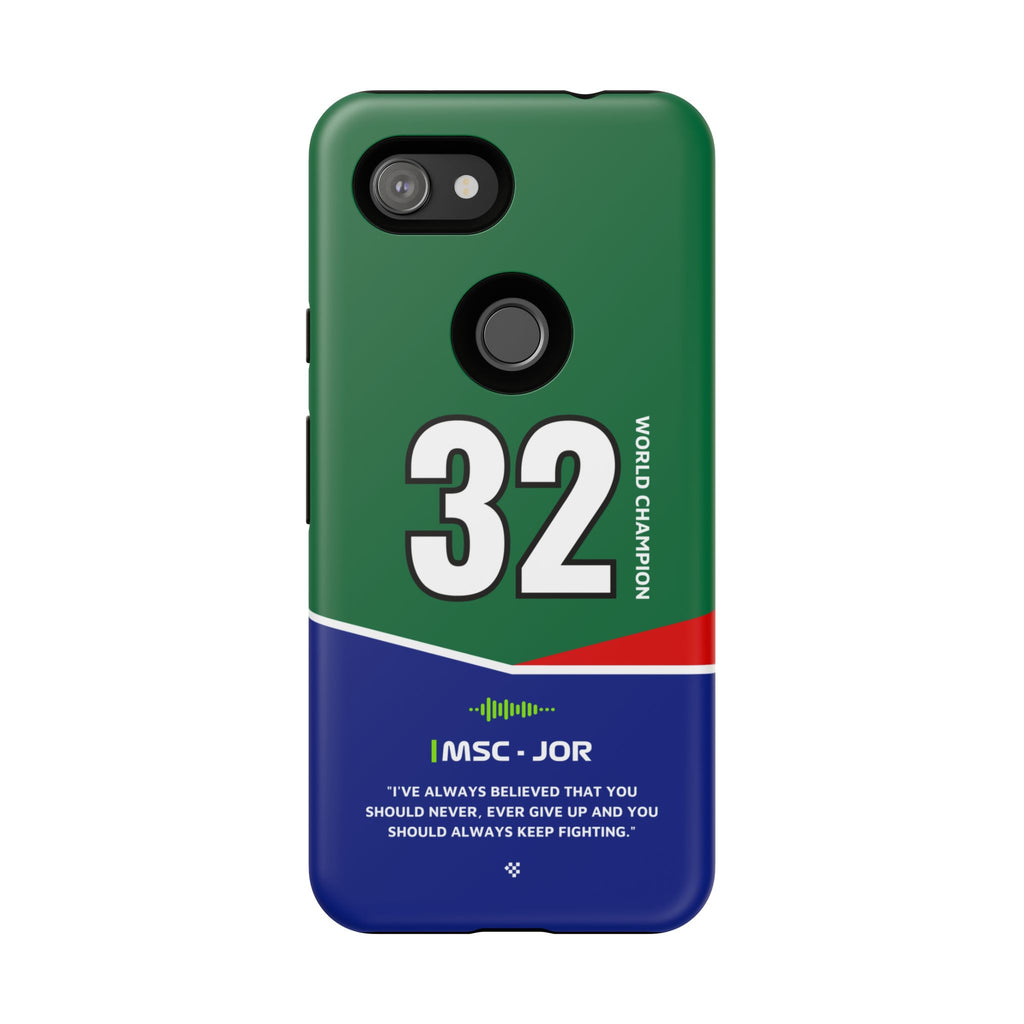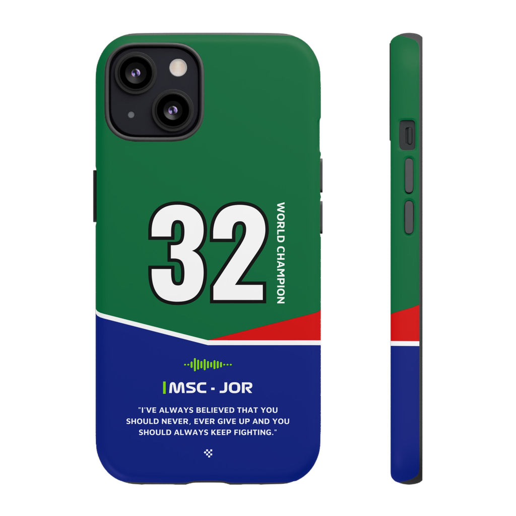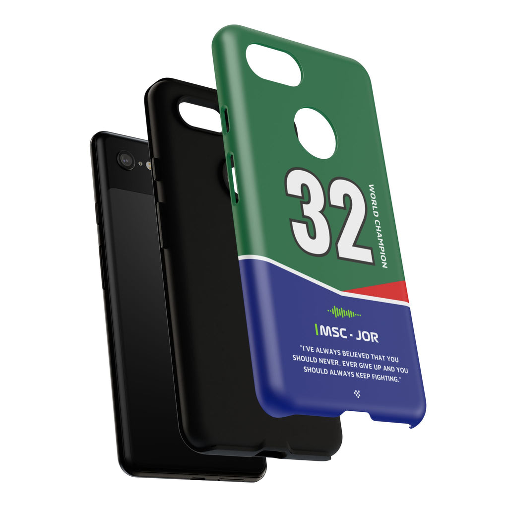 Make sure his legacy persists with the exclusive Michael Schumacher F1 Legend Phone Case. It's the perfect accessory for every passionate Formula 1 and Schumacher fan. Featuring Michael's iconic #32 race number and the bold 1991 Jordan team colors, this green phone case brings racing energy straight to your hand.