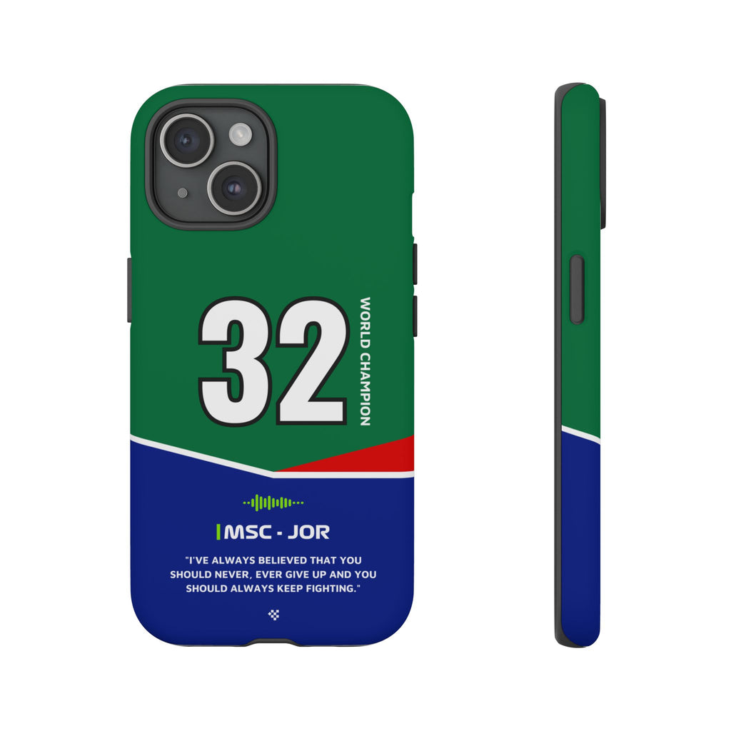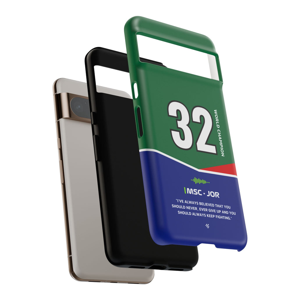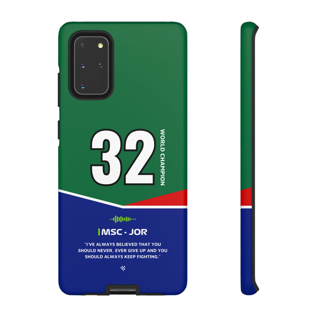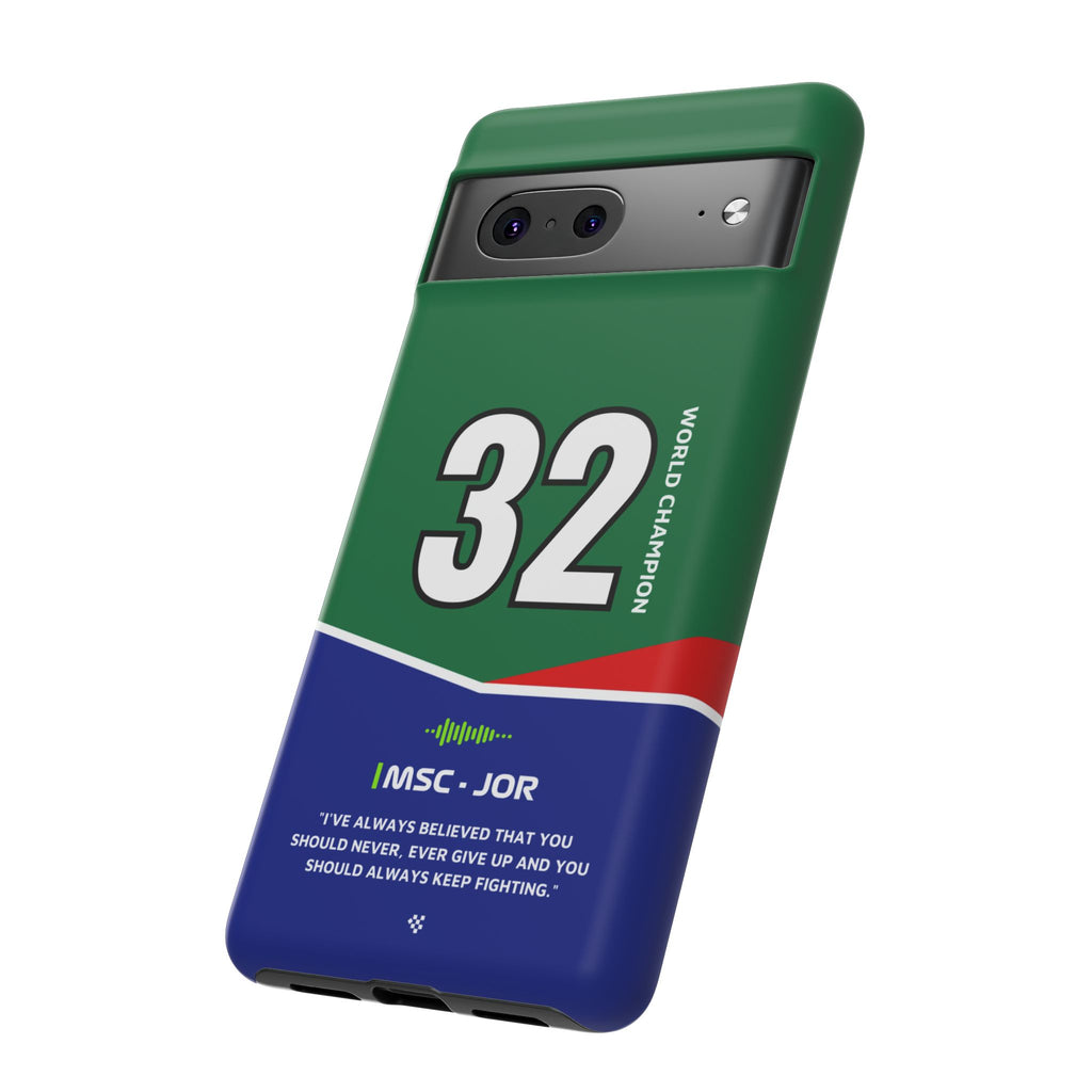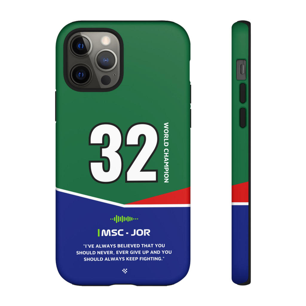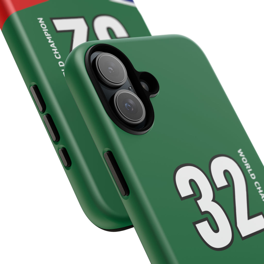 Make sure his legacy persists with the exclusive Michael Schumacher F1 Legend Phone Case. It's the perfect accessory for every passionate Formula 1 and Schumacher fan. Featuring Michael's iconic #32 race number and the bold 1991 Jordan team colors, this green phone case brings racing energy straight to your hand.