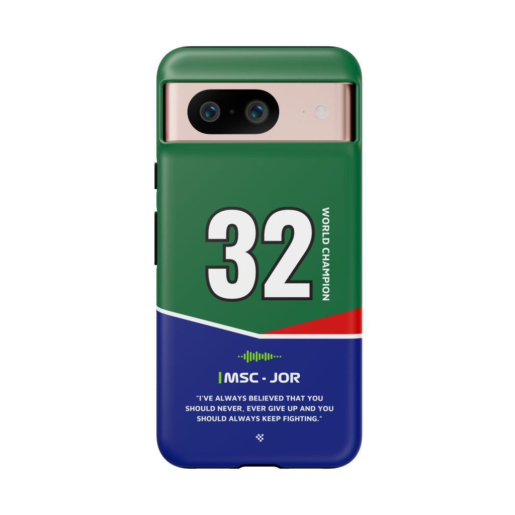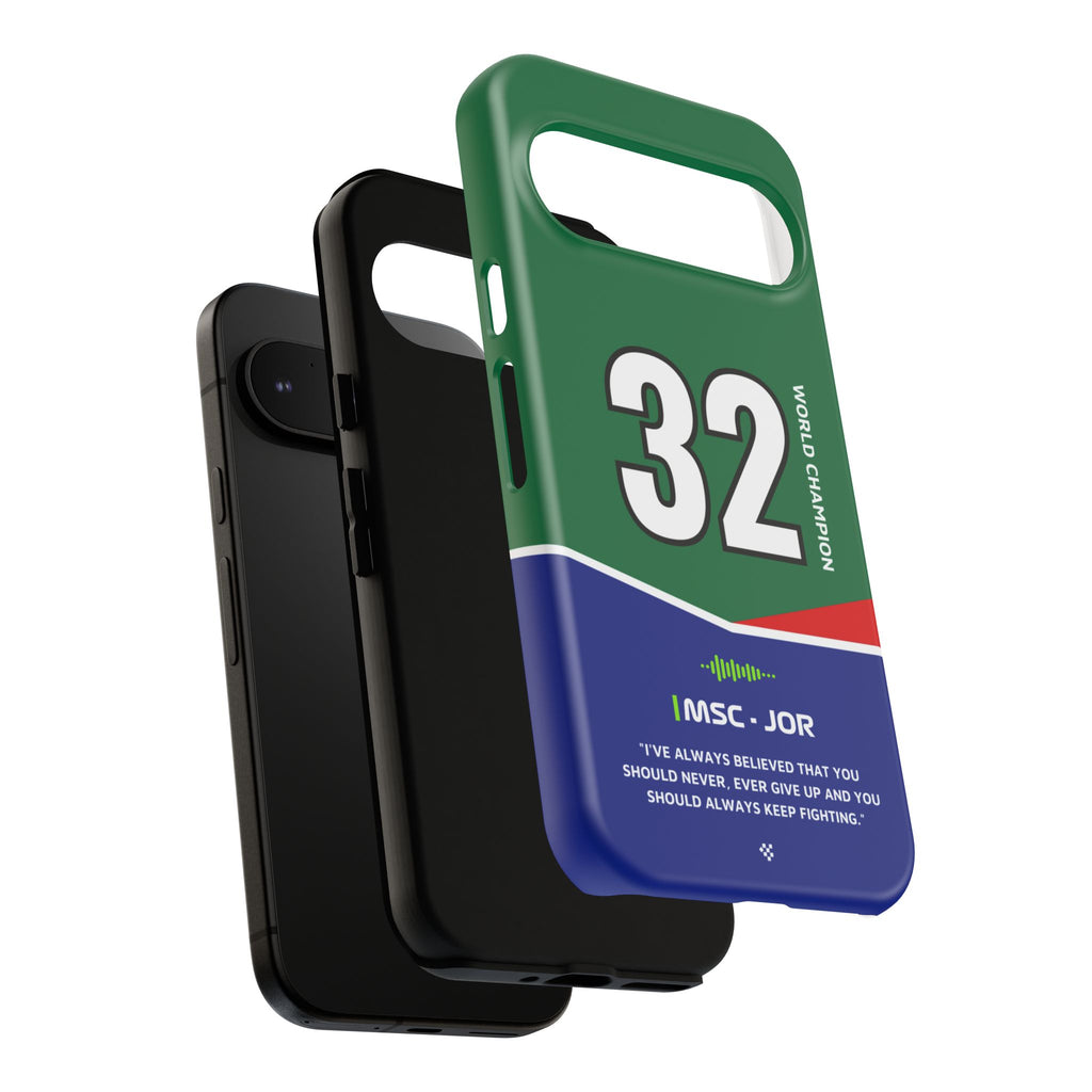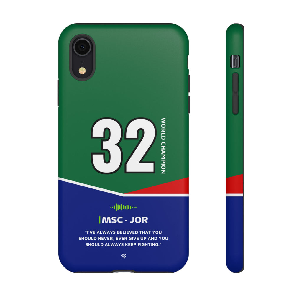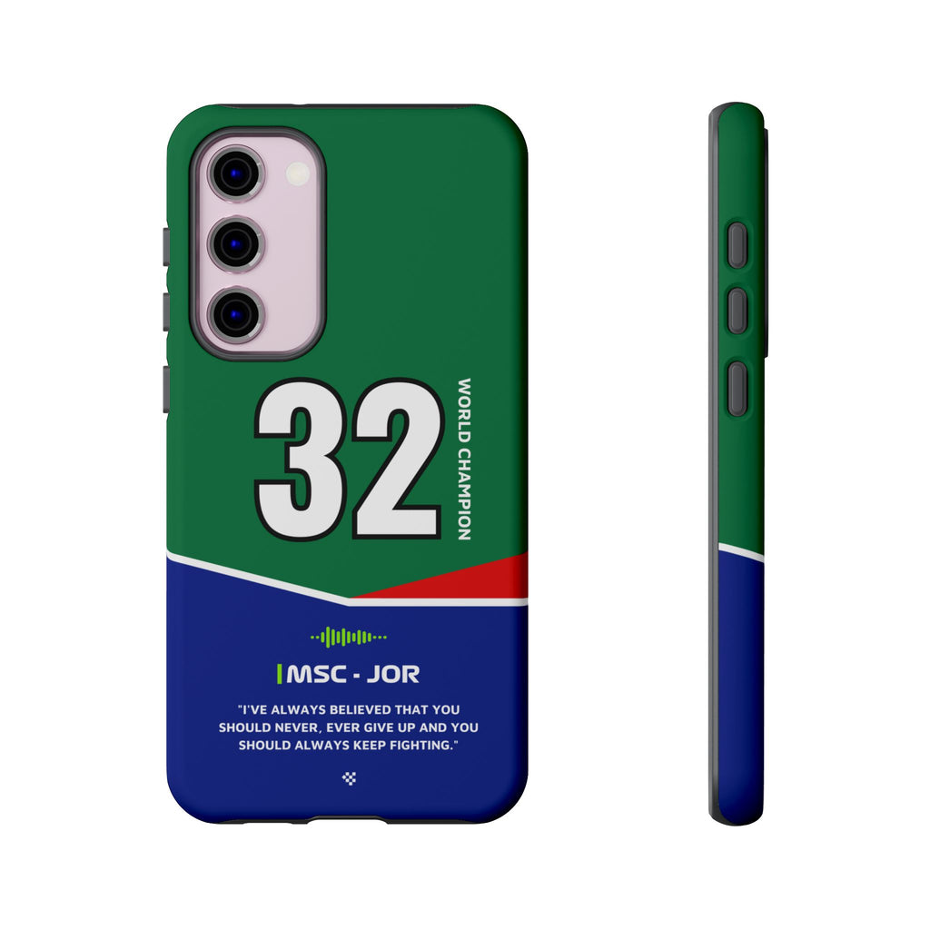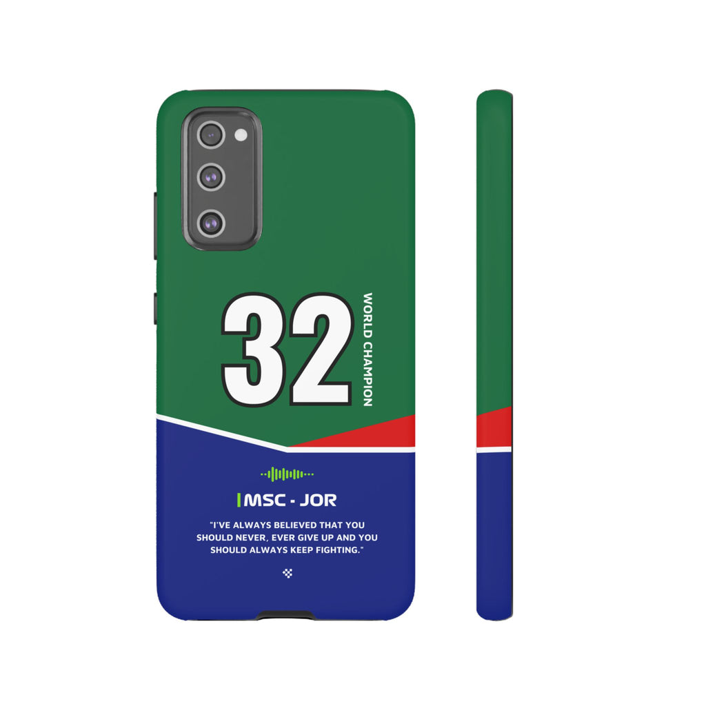 Make sure his legacy persists with the exclusive Michael Schumacher F1 Legend Phone Case. It's the perfect accessory for every passionate Formula 1 and Schumacher fan. Featuring Michael's iconic #32 race number and the bold 1991 Jordan team colors, this green phone case brings racing energy straight to your hand.