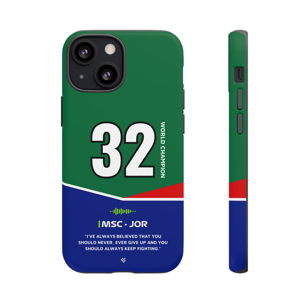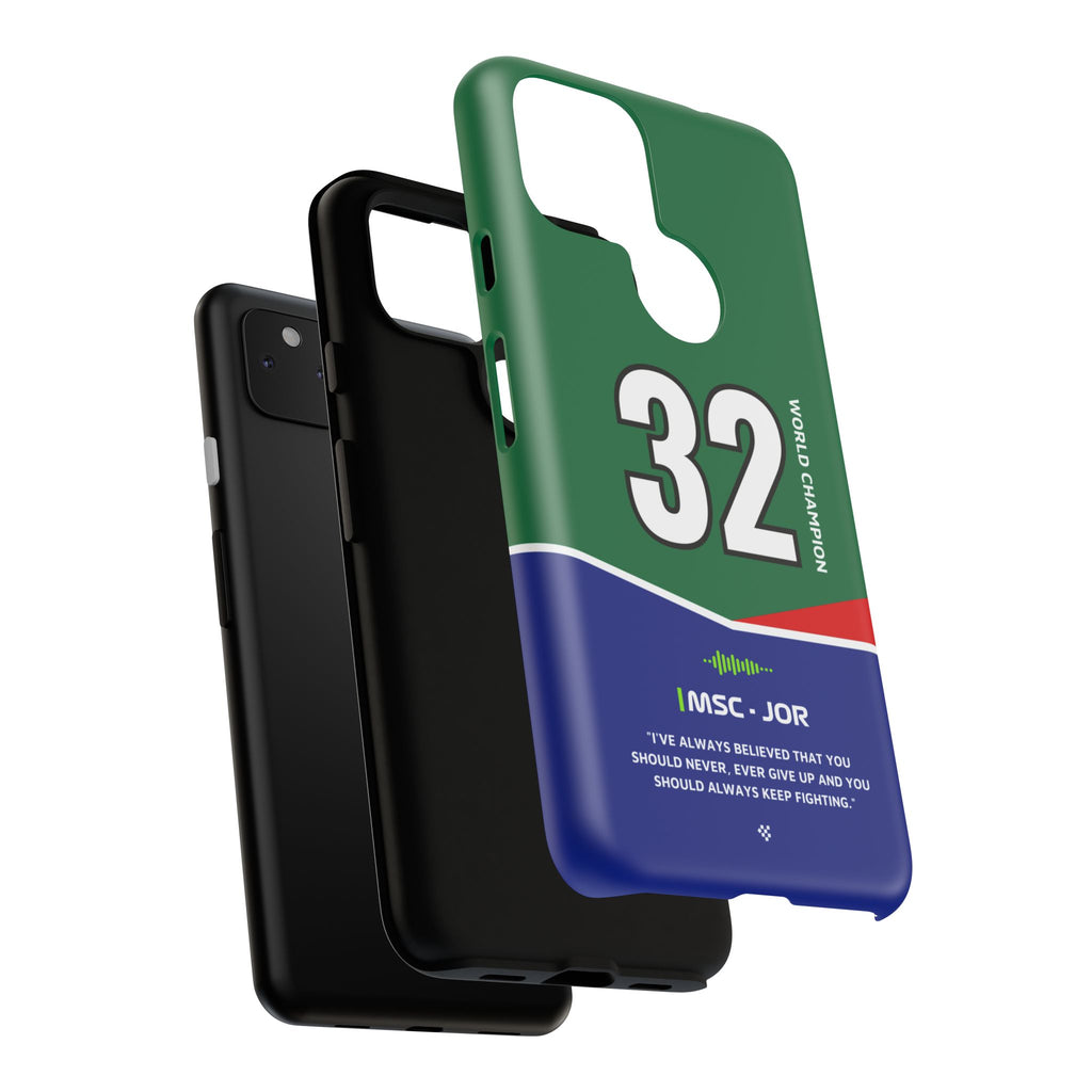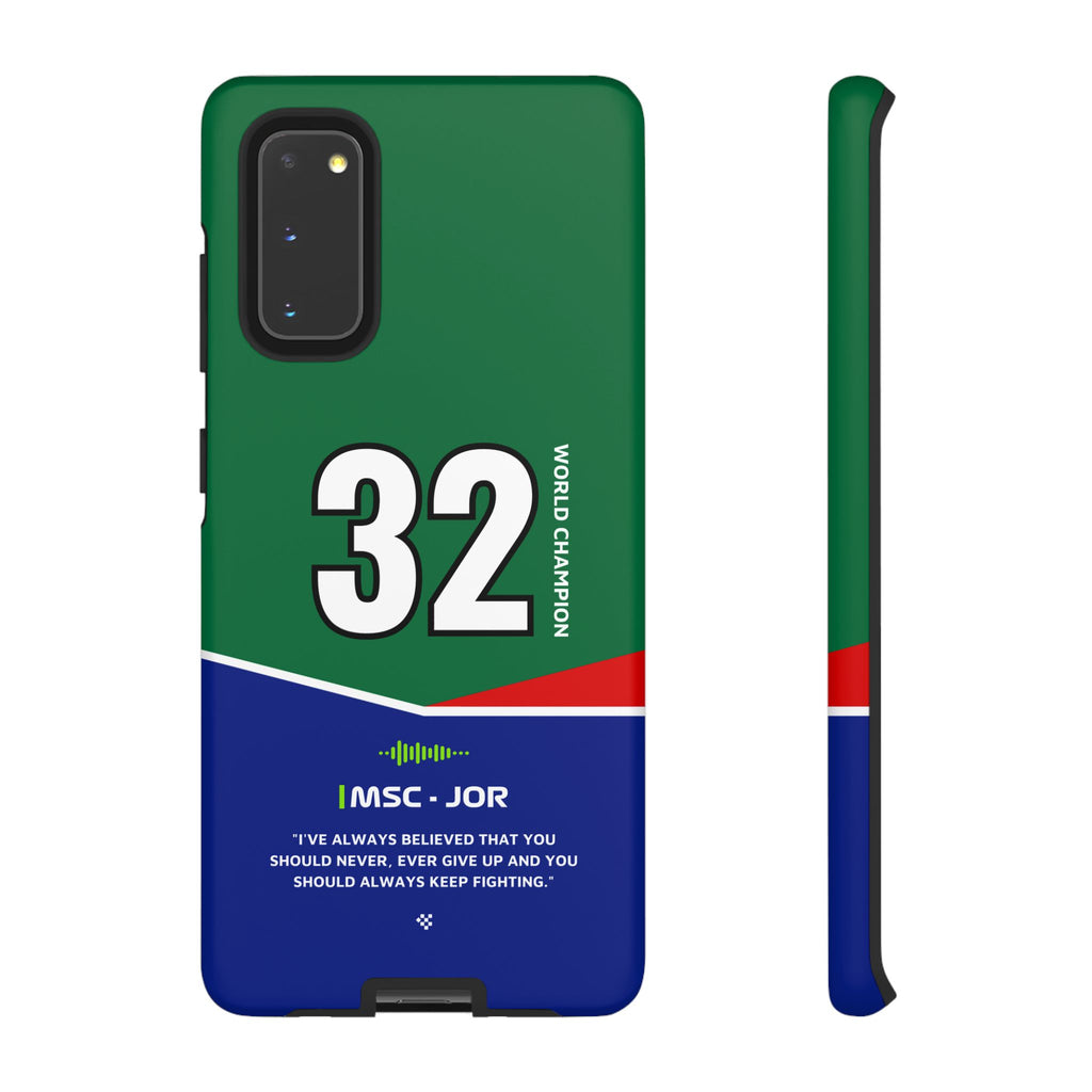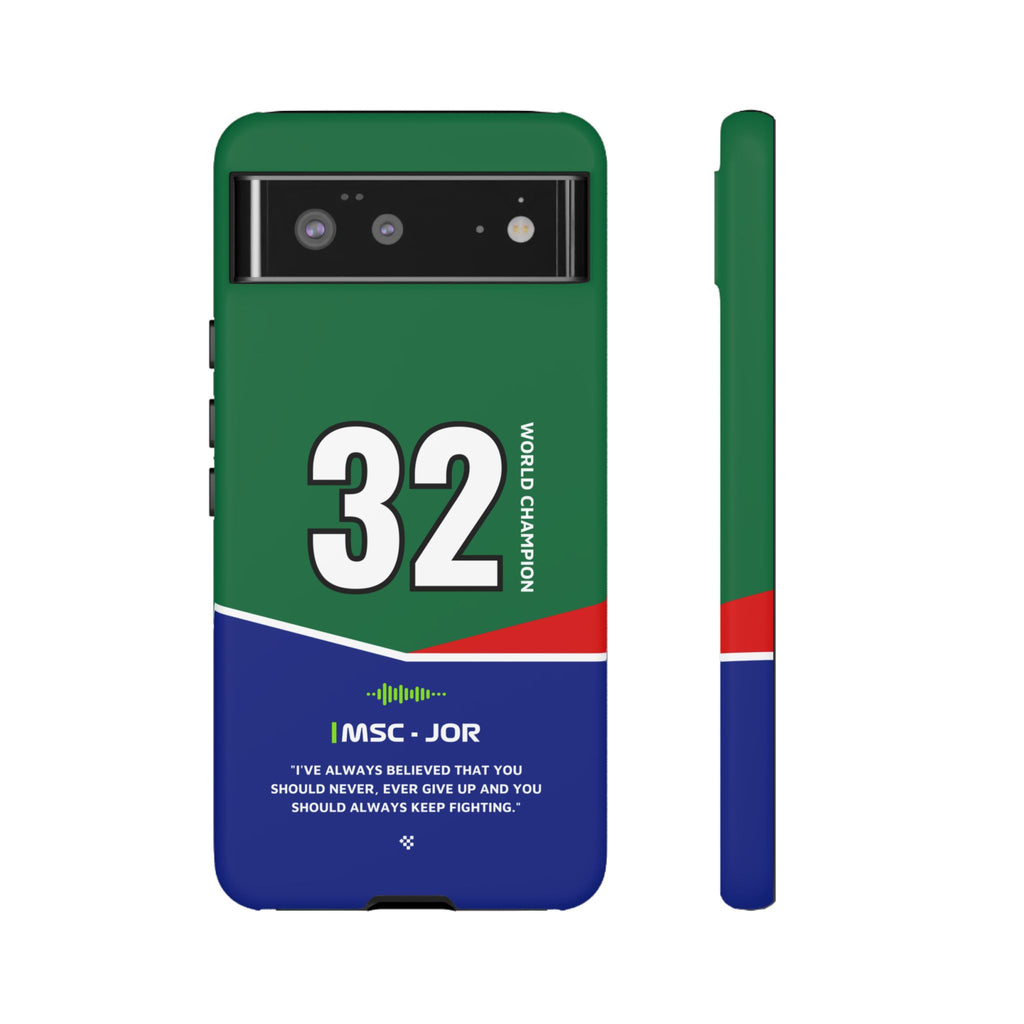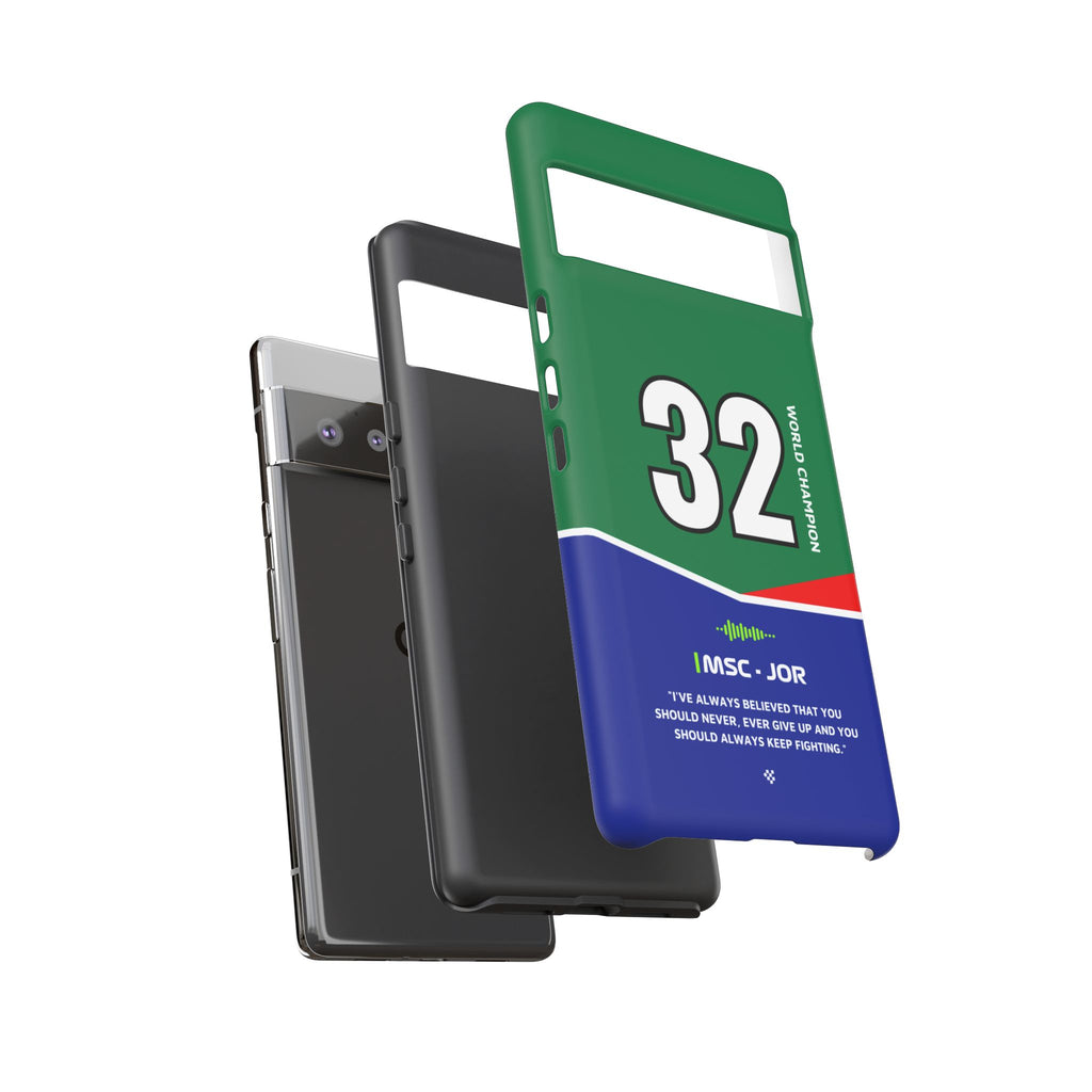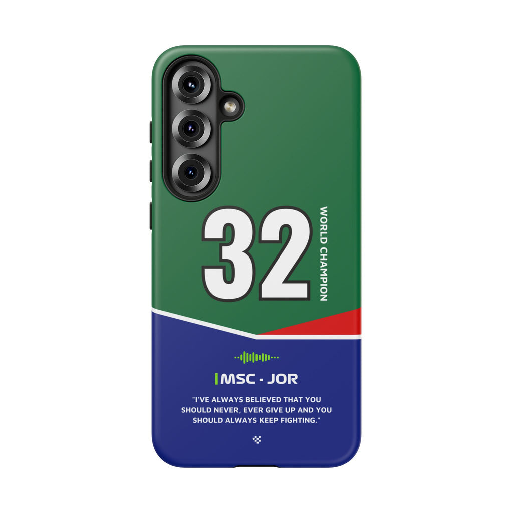 Make sure his legacy persists with the exclusive Michael Schumacher F1 Legend Phone Case. It's the perfect accessory for every passionate Formula 1 and Schumacher fan. Featuring Michael's iconic #32 race number and the bold 1991 Jordan team colors, this green phone case brings racing energy straight to your hand.