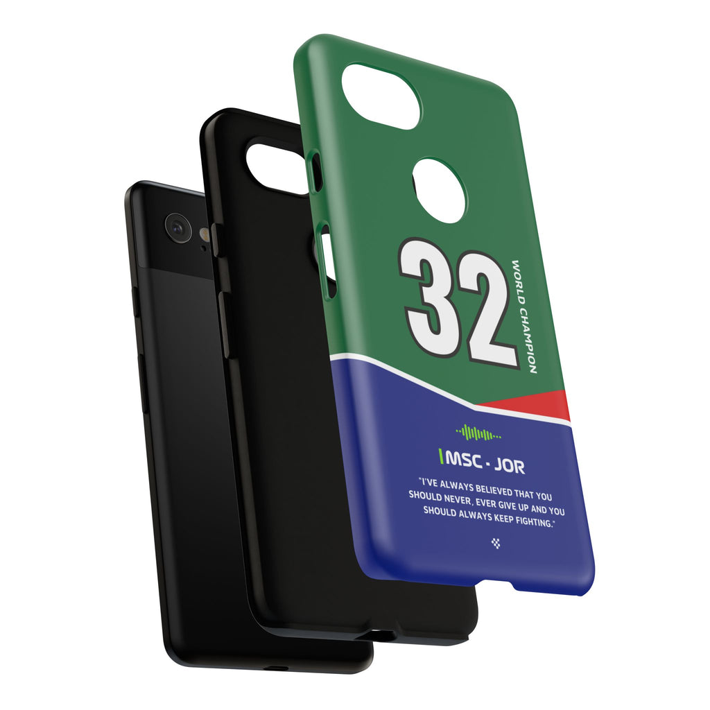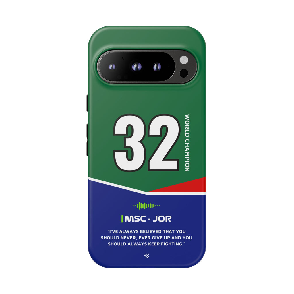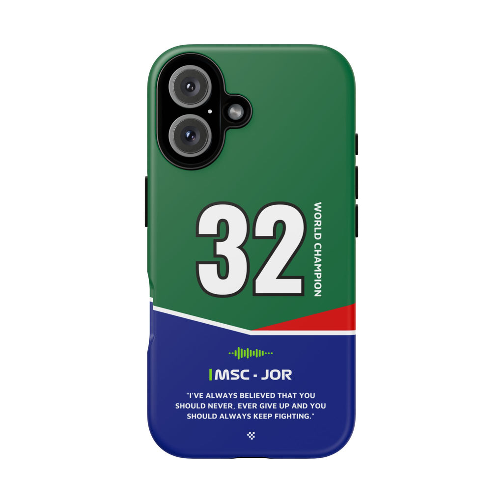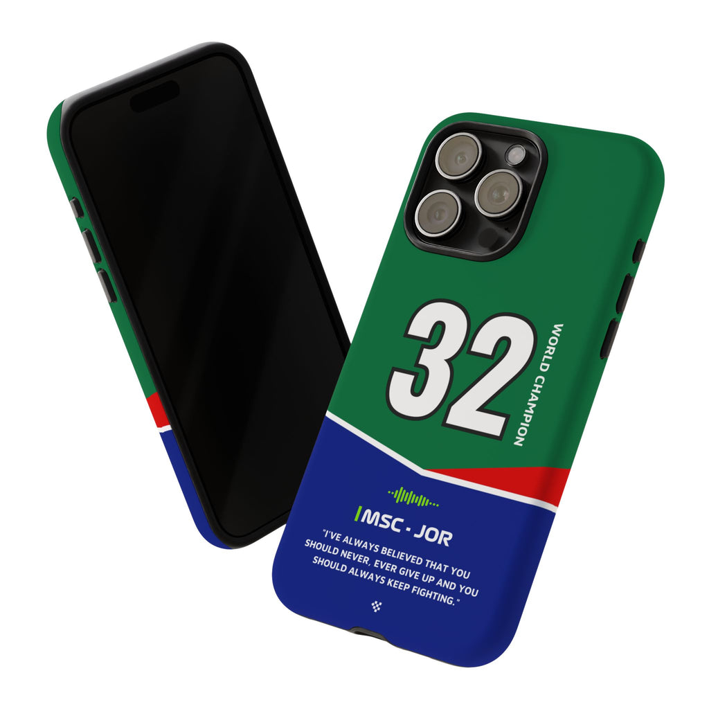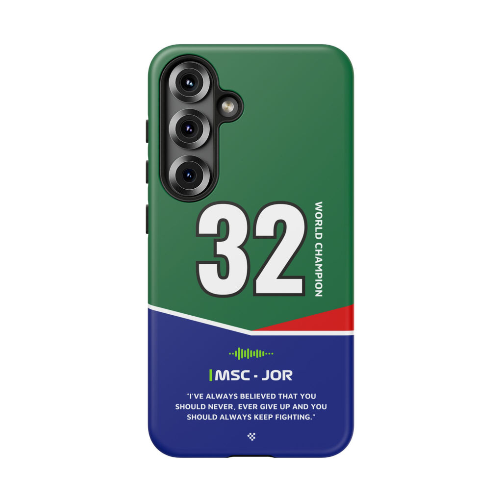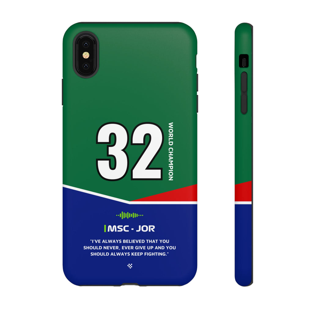 Make sure his legacy persists with the exclusive Michael Schumacher F1 Legend Phone Case. It's the perfect accessory for every passionate Formula 1 and Schumacher fan. Featuring Michael's iconic #32 race number and the bold 1991 Jordan team colors, this green phone case brings racing energy straight to your hand.