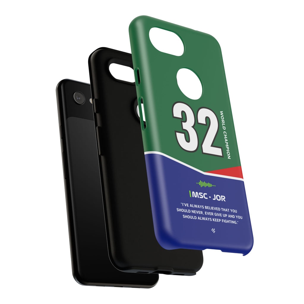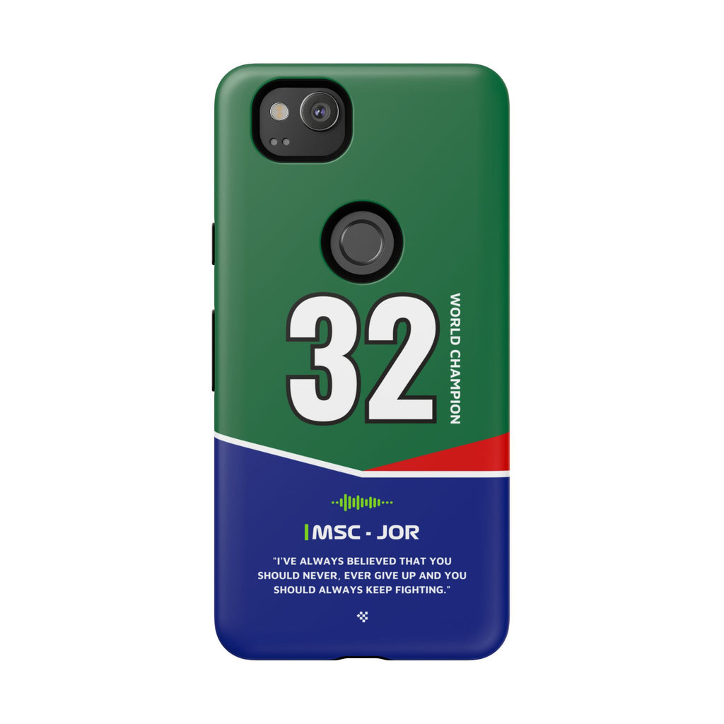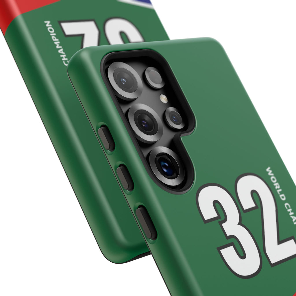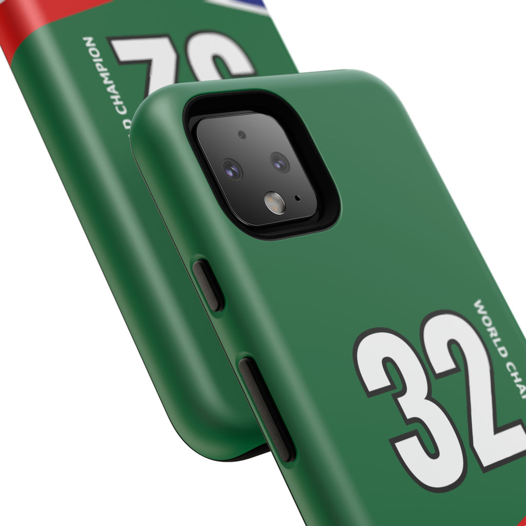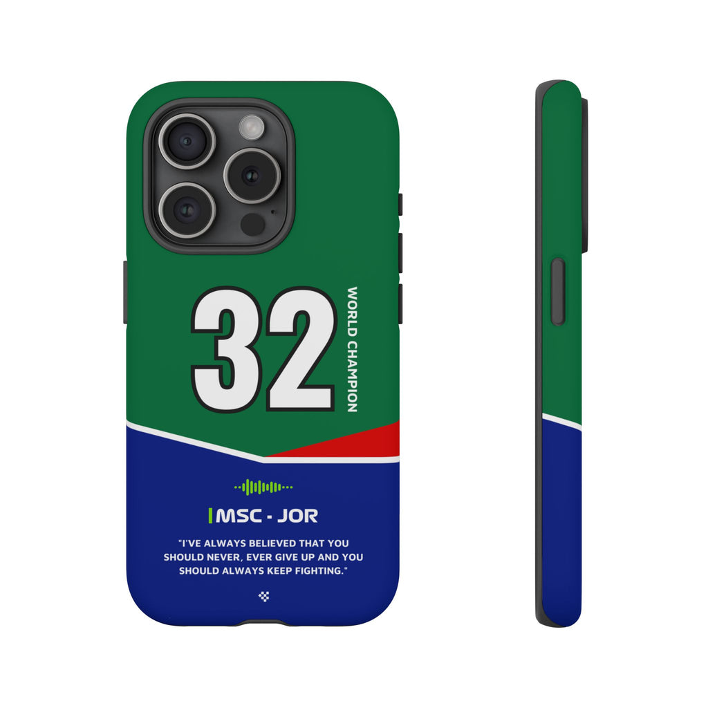 Make sure his legacy persists with the exclusive Michael Schumacher F1 Legend Phone Case. It's the perfect accessory for every passionate Formula 1 and Schumacher fan. Featuring Michael's iconic #32 race number and the bold 1991 Jordan team colors, this green phone case brings racing energy straight to your hand.