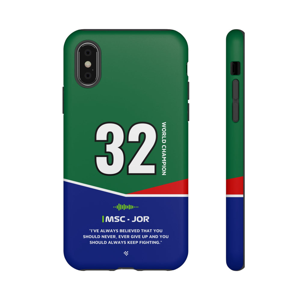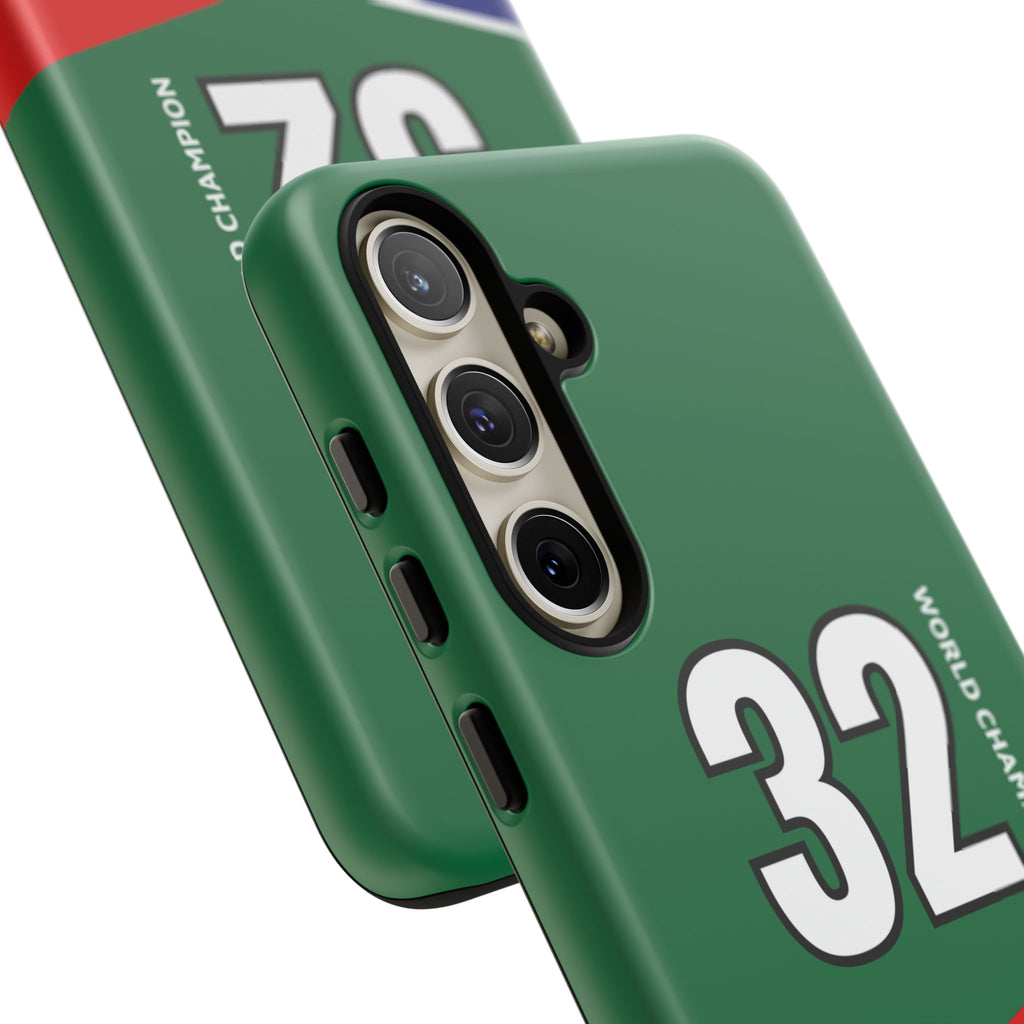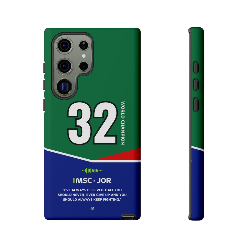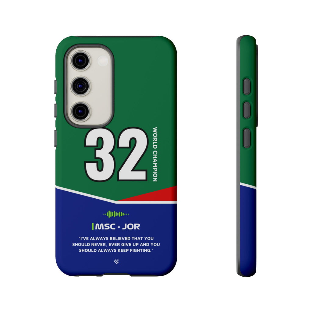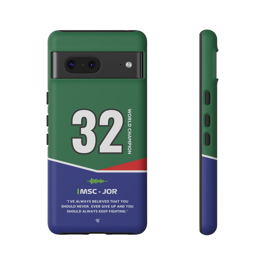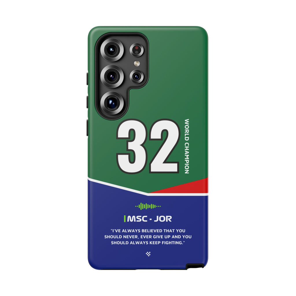 Make sure his legacy persists with the exclusive Michael Schumacher F1 Legend Phone Case. It's the perfect accessory for every passionate Formula 1 and Schumacher fan. Featuring Michael's iconic #32 race number and the bold 1991 Jordan team colors, this green phone case brings racing energy straight to your hand.