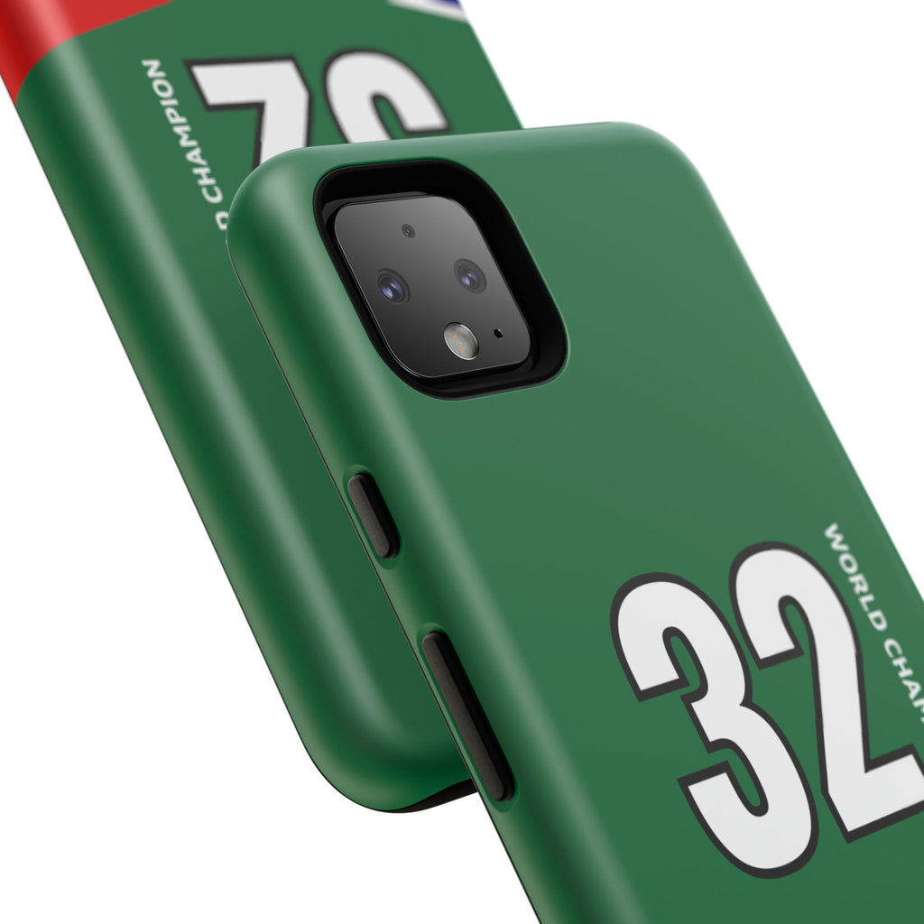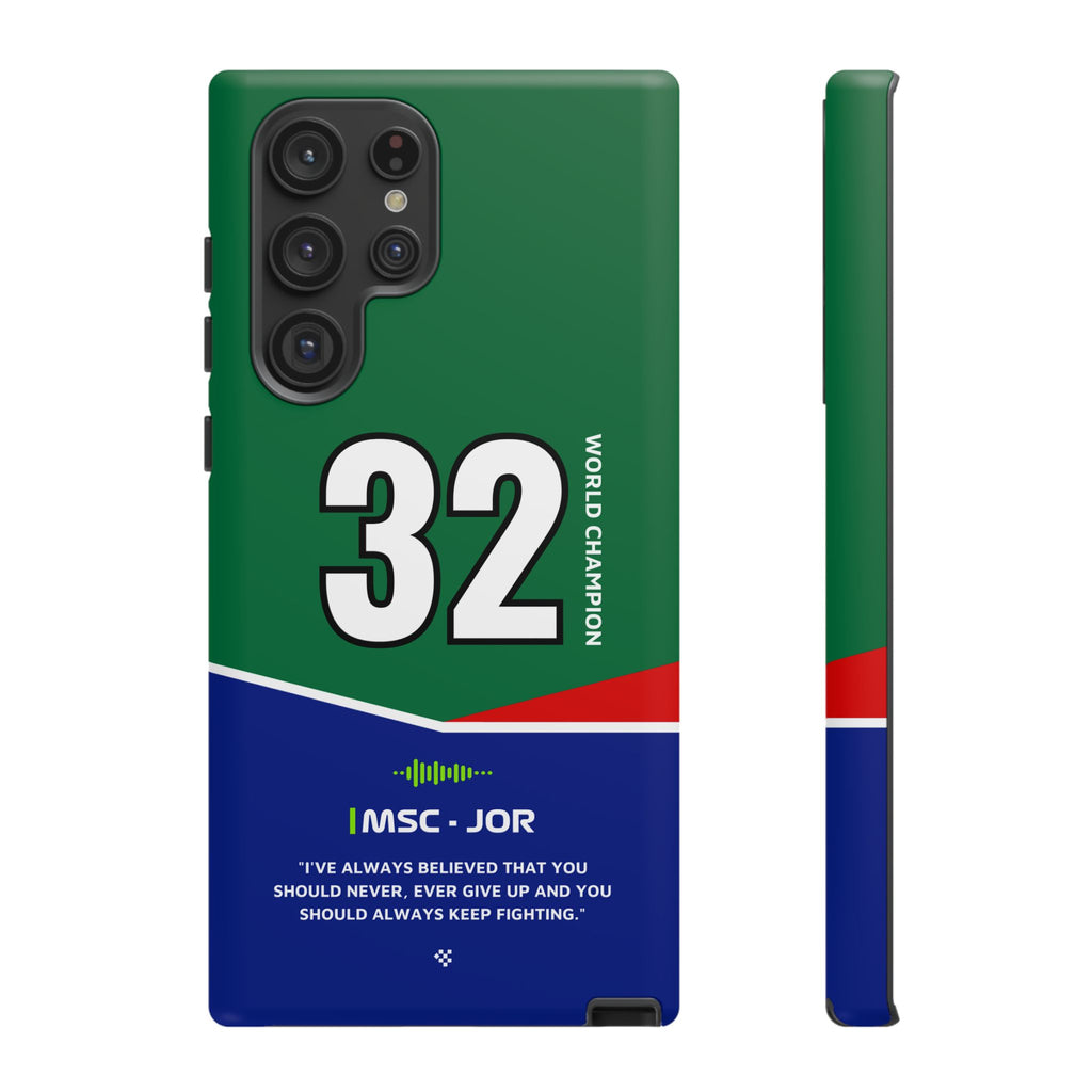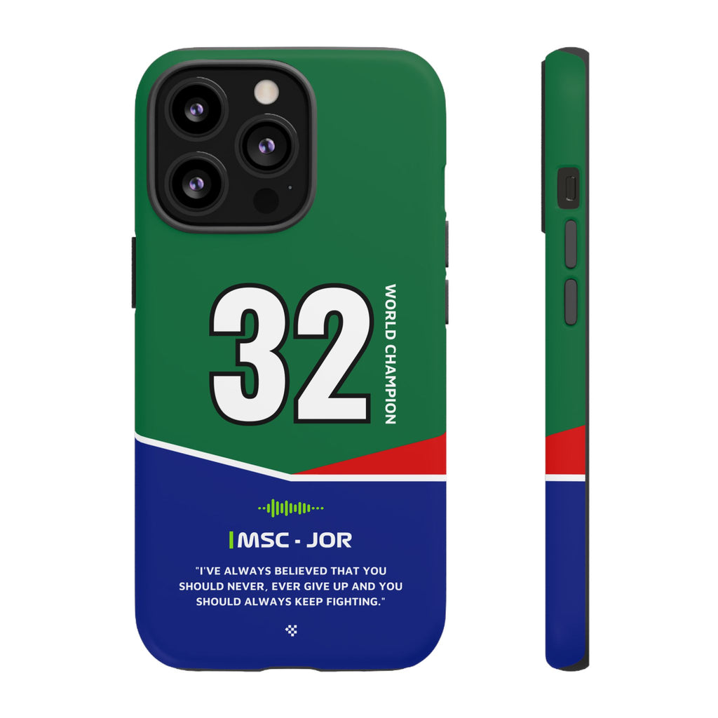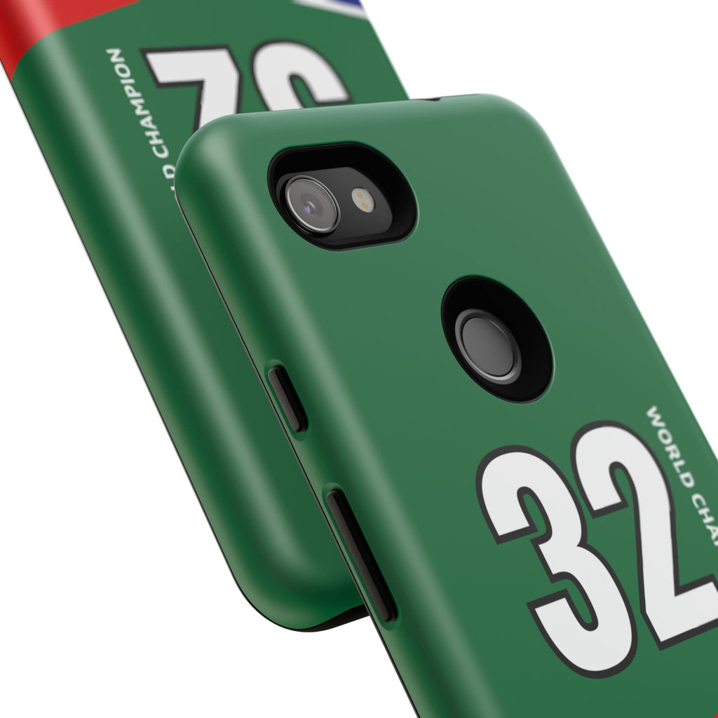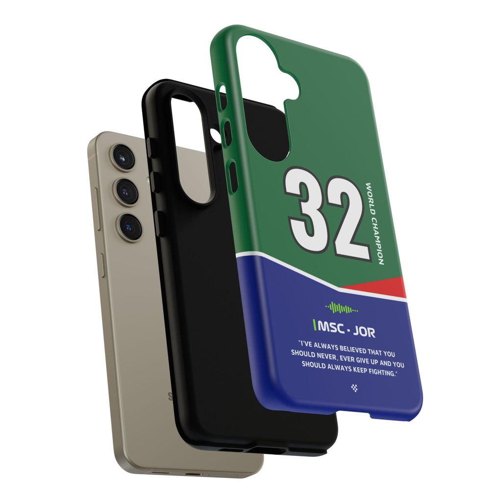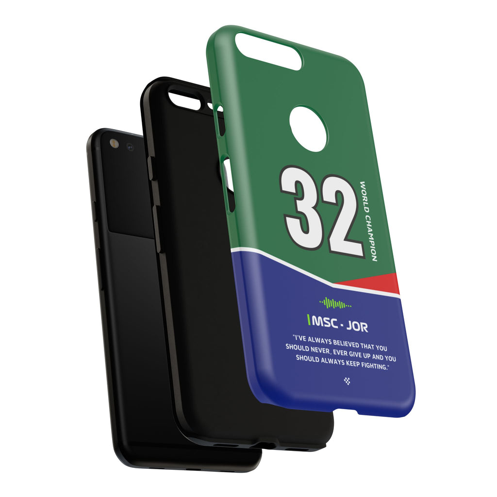 Make sure his legacy persists with the exclusive Michael Schumacher F1 Legend Phone Case. It's the perfect accessory for every passionate Formula 1 and Schumacher fan. Featuring Michael's iconic #32 race number and the bold 1991 Jordan team colors, this green phone case brings racing energy straight to your hand.