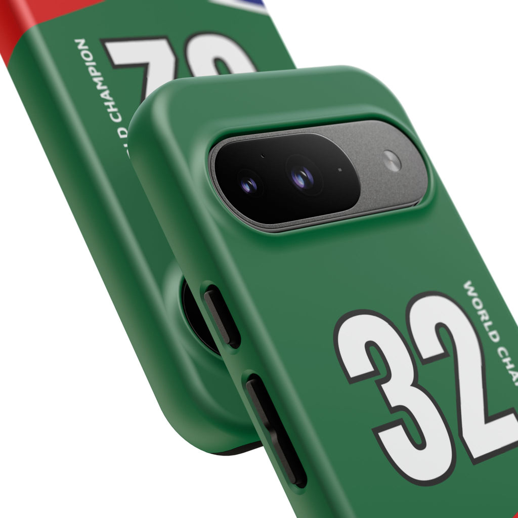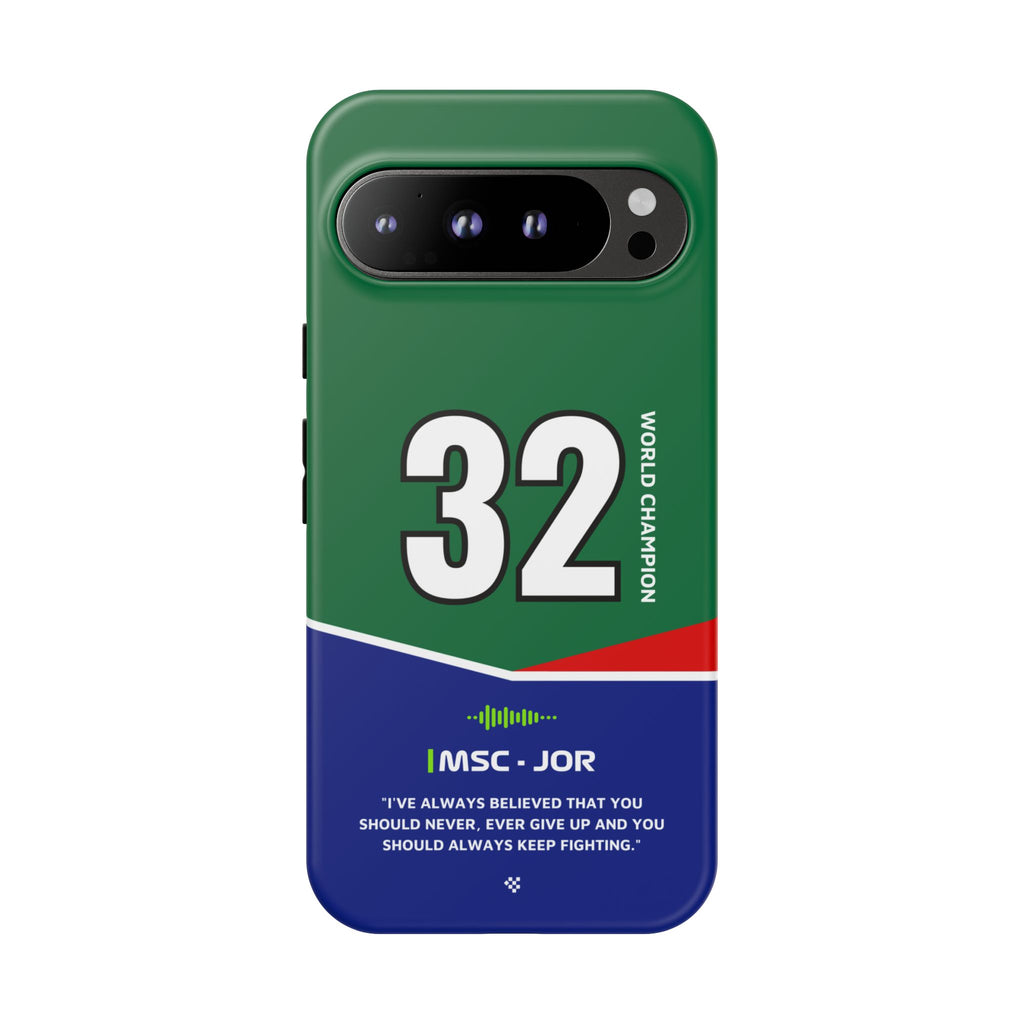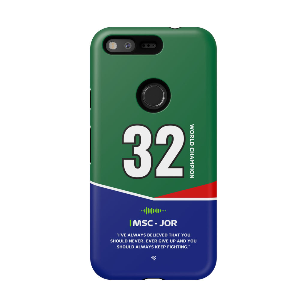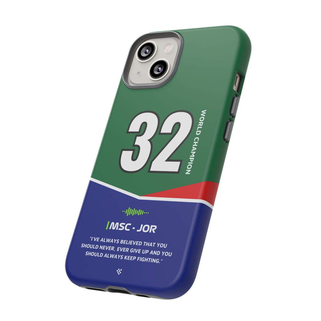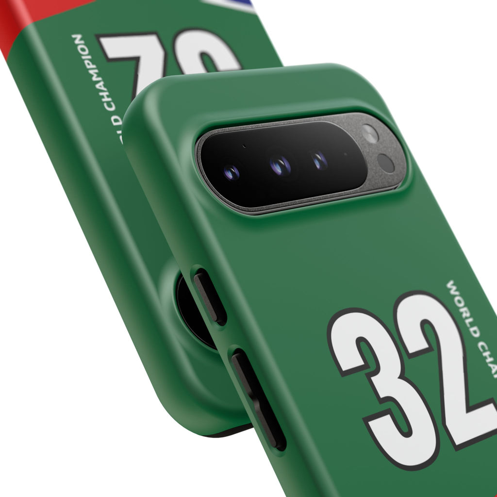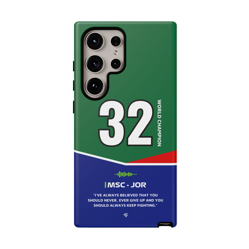 Make sure his legacy persists with the exclusive Michael Schumacher F1 Legend Phone Case. It's the perfect accessory for every passionate Formula 1 and Schumacher fan. Featuring Michael's iconic #32 race number and the bold 1991 Jordan team colors, this green phone case brings racing energy straight to your hand.