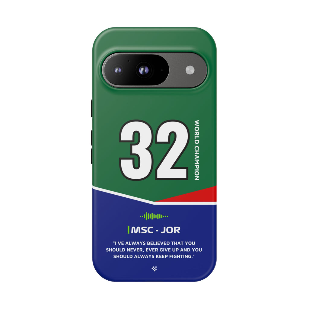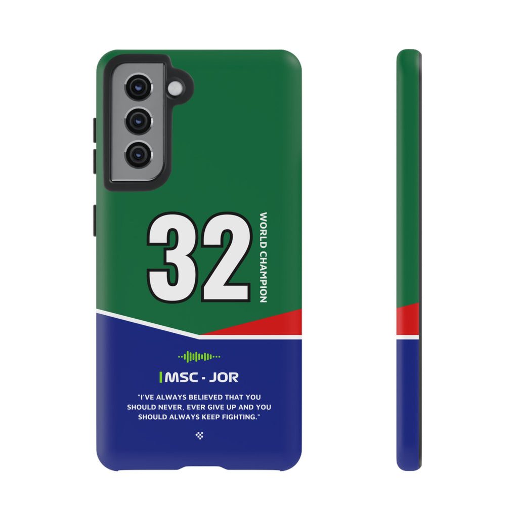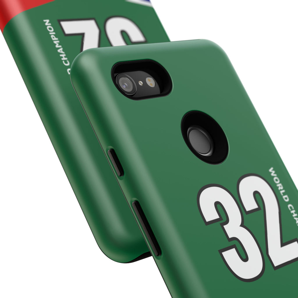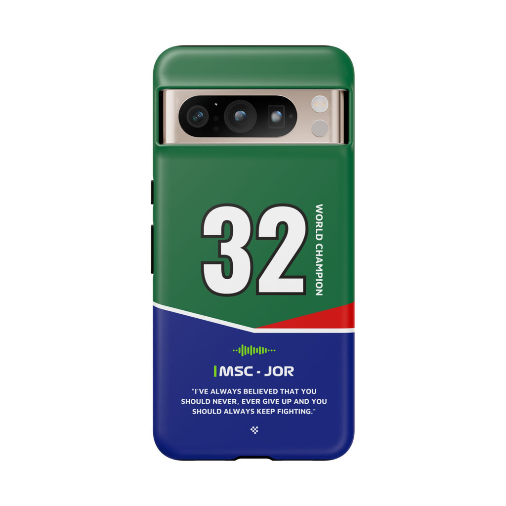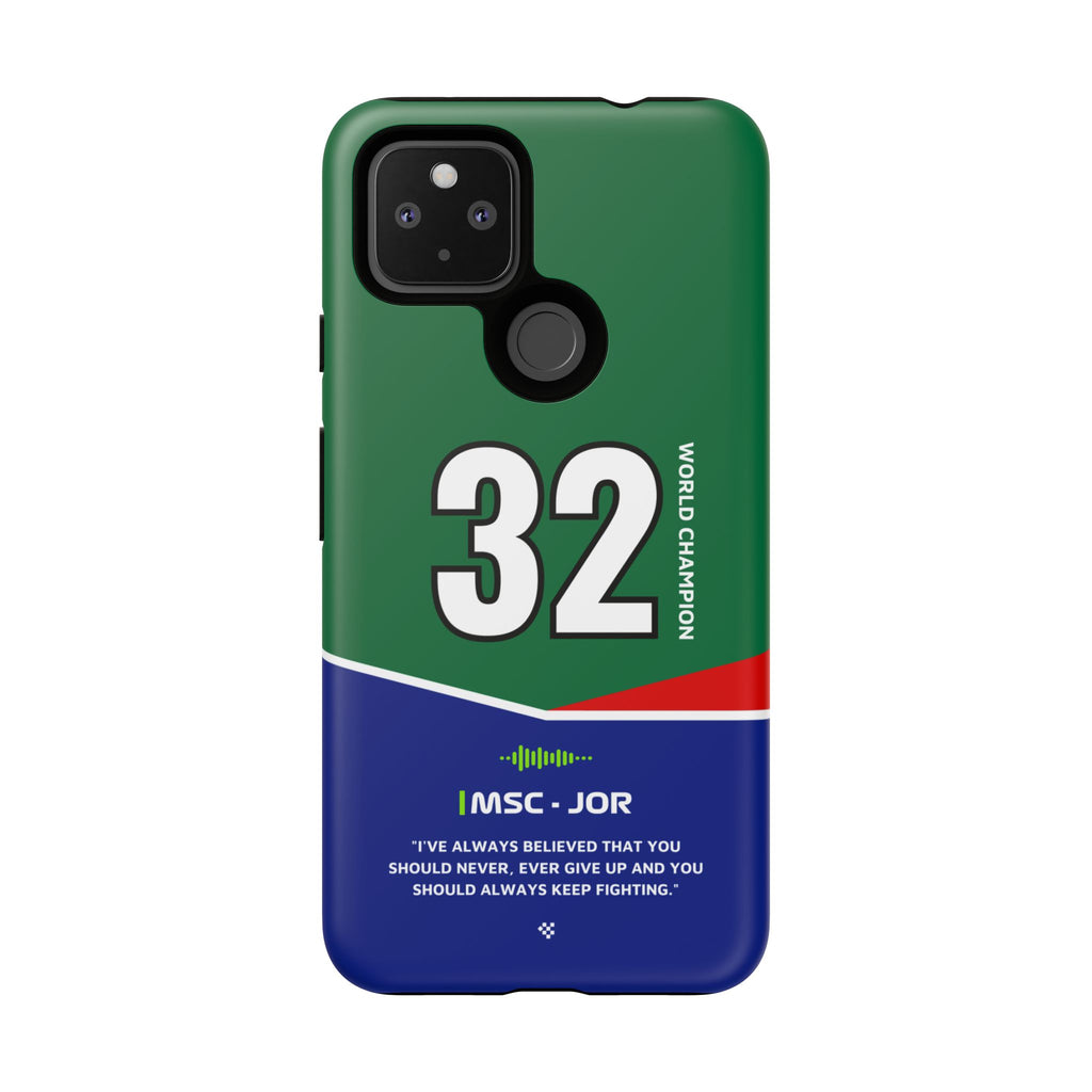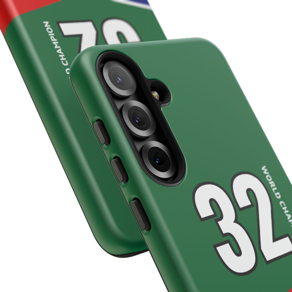Make sure his legacy persists with the exclusive Michael Schumacher F1 Legend Phone Case. It's the perfect accessory for every passionate Formula 1 and Schumacher fan. Featuring Michael's iconic #32 race number and the bold 1991 Jordan team colors, this green phone case brings racing energy straight to your hand.