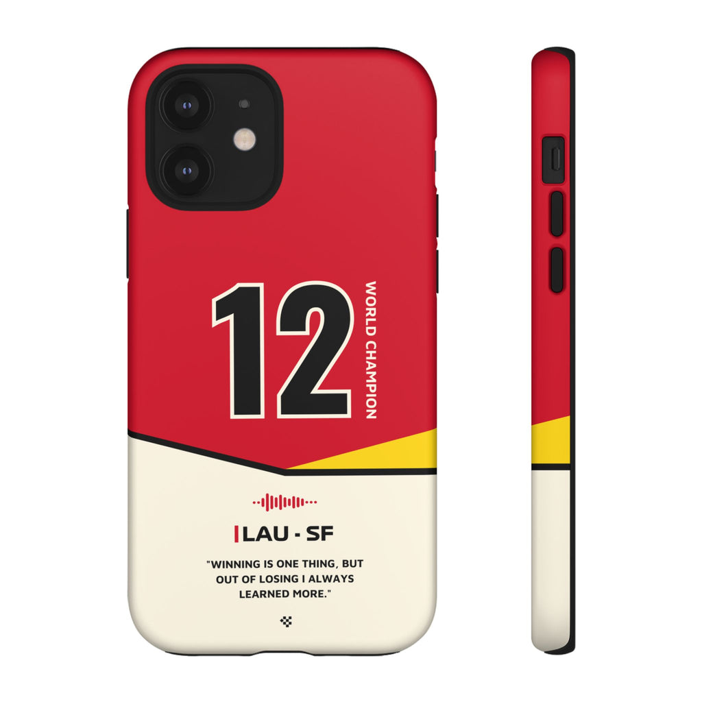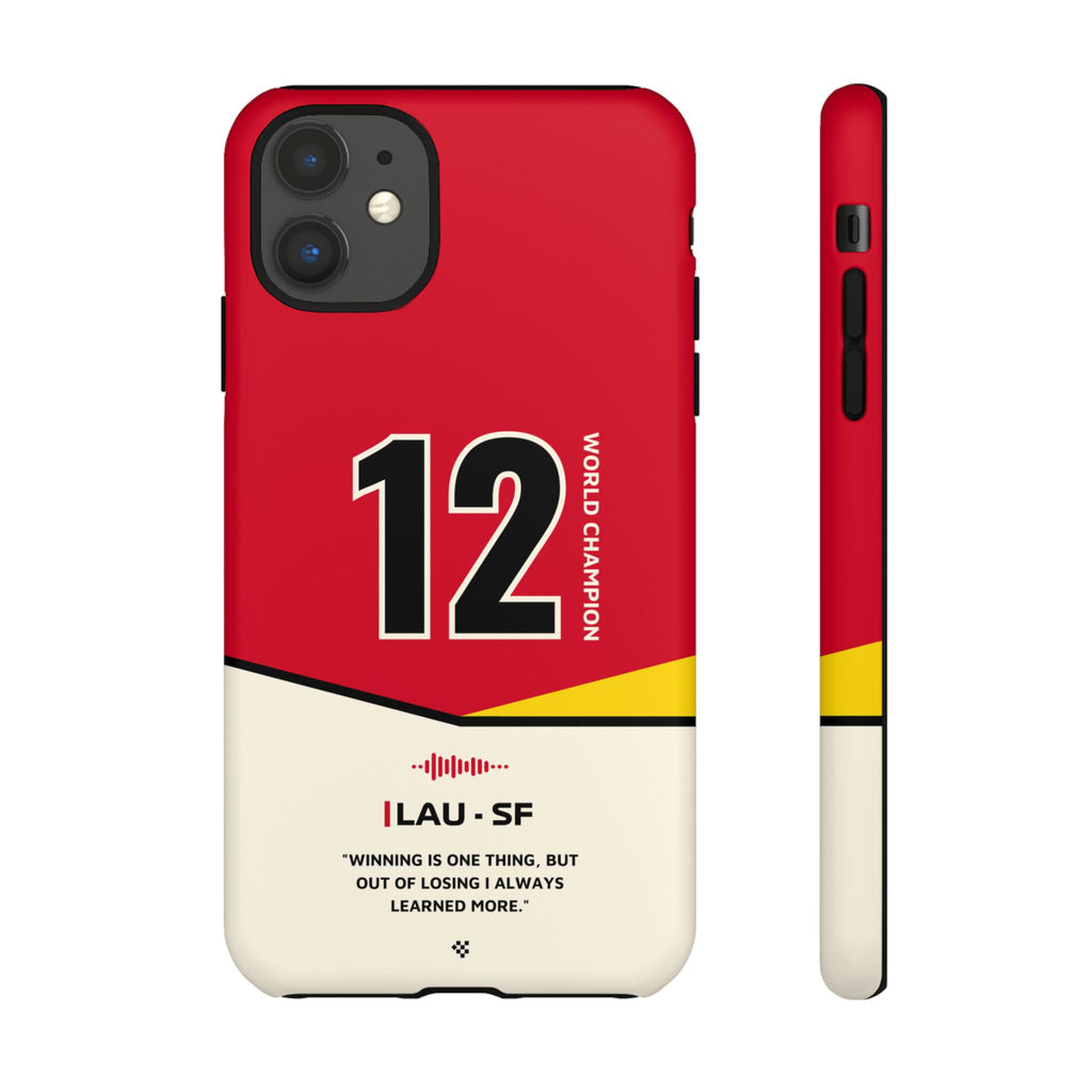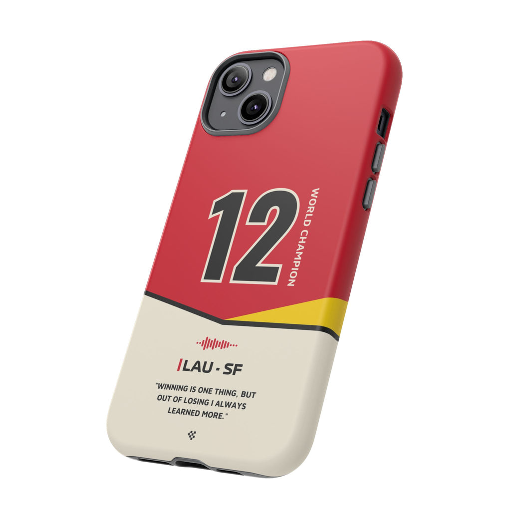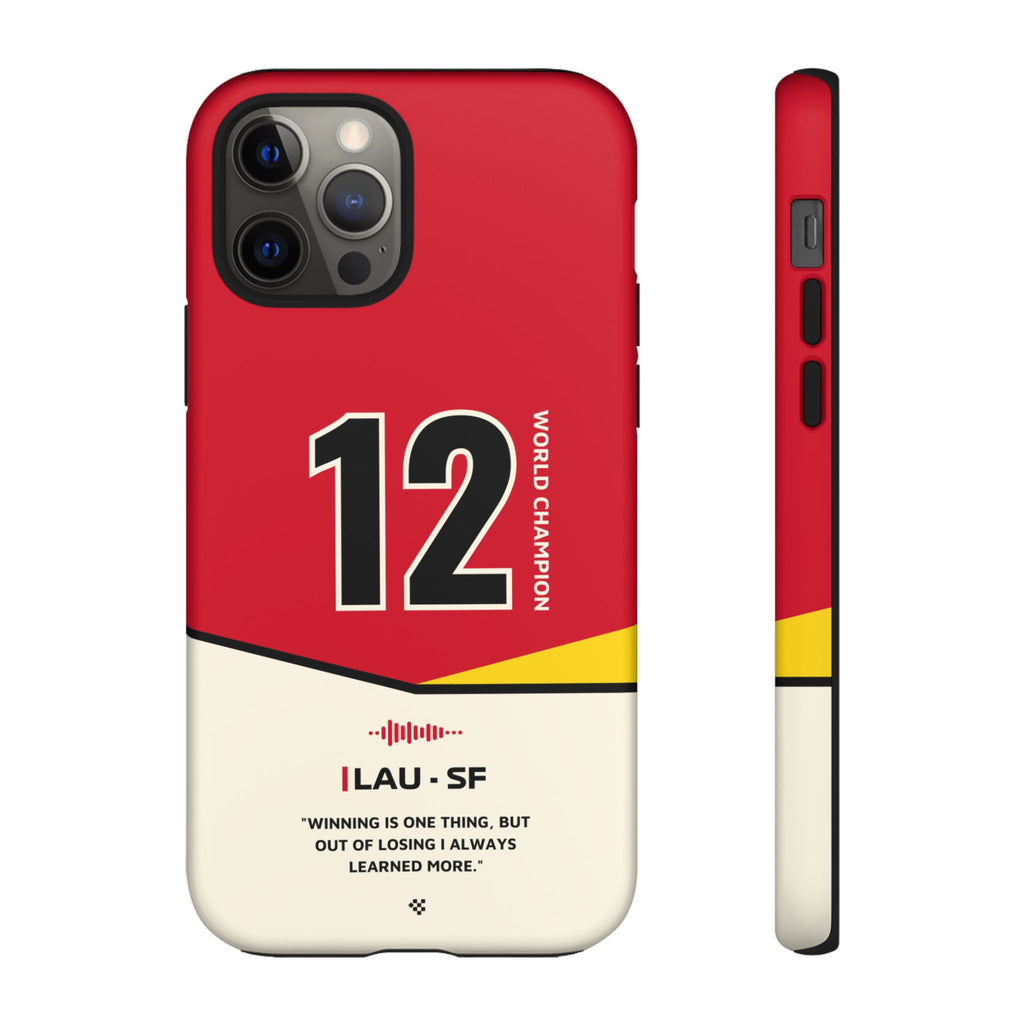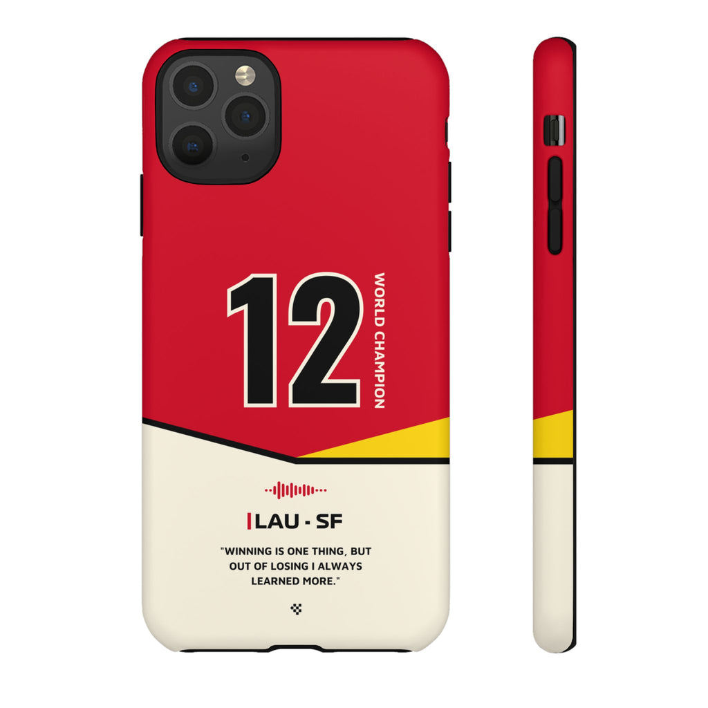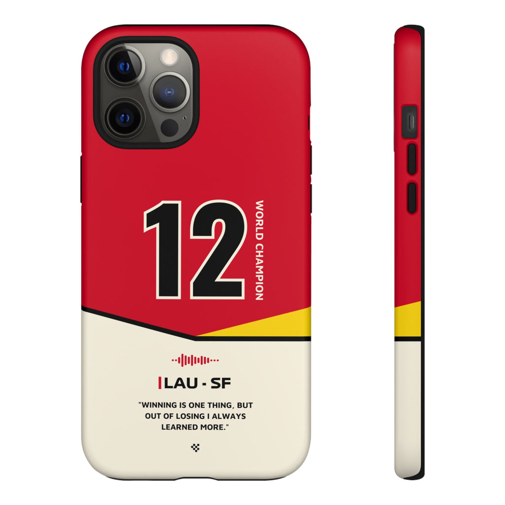 Make sure his legacy persists with the exclusive Niki Lauda F1 Legend Phone Case. It's the perfect accessory for every passionate Formula 1 and Lauda fan. Featuring Niki's iconic #12 race number and the bold 1975 Scuderia Ferrari team colors, this red phone case brings racing energy straight to your hand.