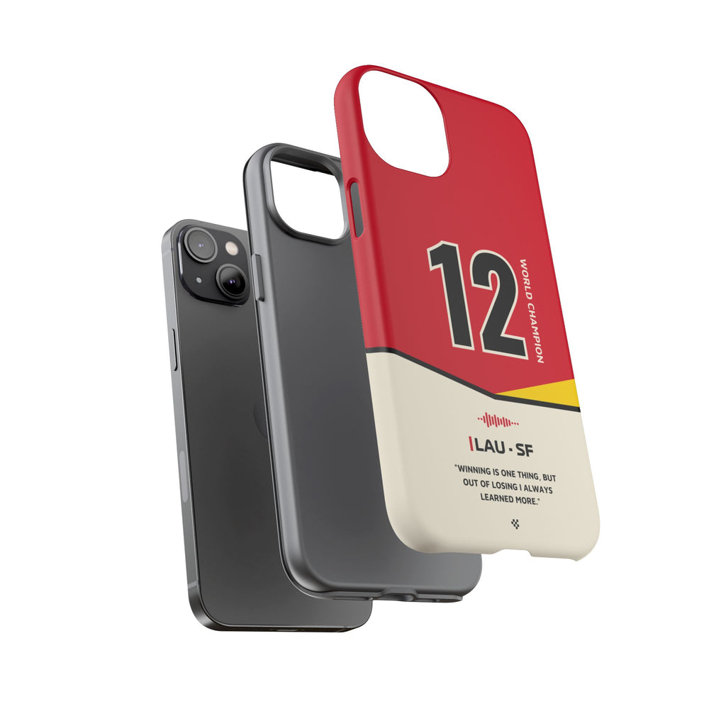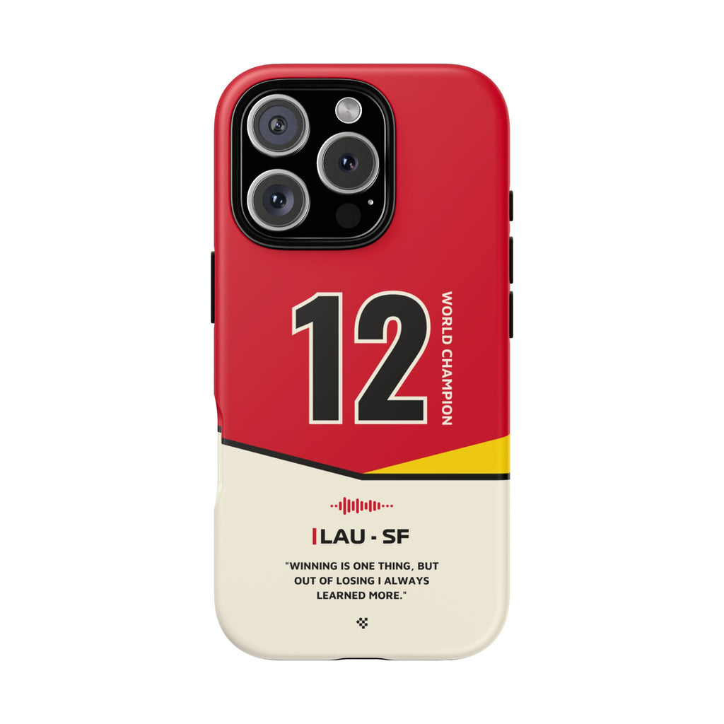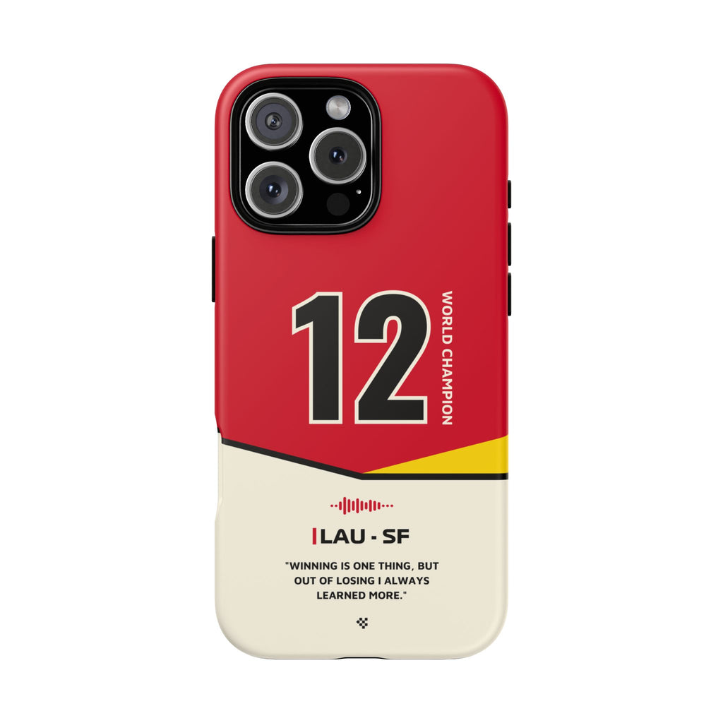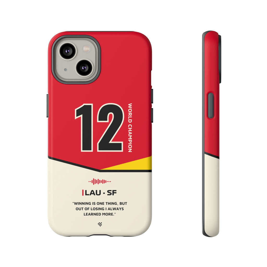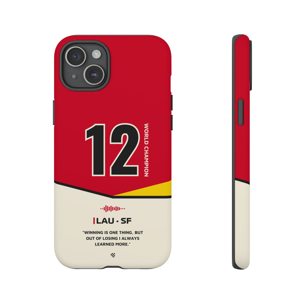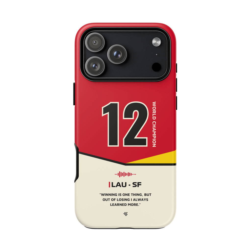 Make sure his legacy persists with the exclusive Niki Lauda F1 Legend Phone Case. It's the perfect accessory for every passionate Formula 1 and Lauda fan. Featuring Niki's iconic #12 race number and the bold 1975 Scuderia Ferrari team colors, this red phone case brings racing energy straight to your hand.