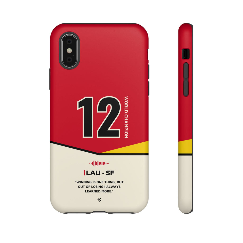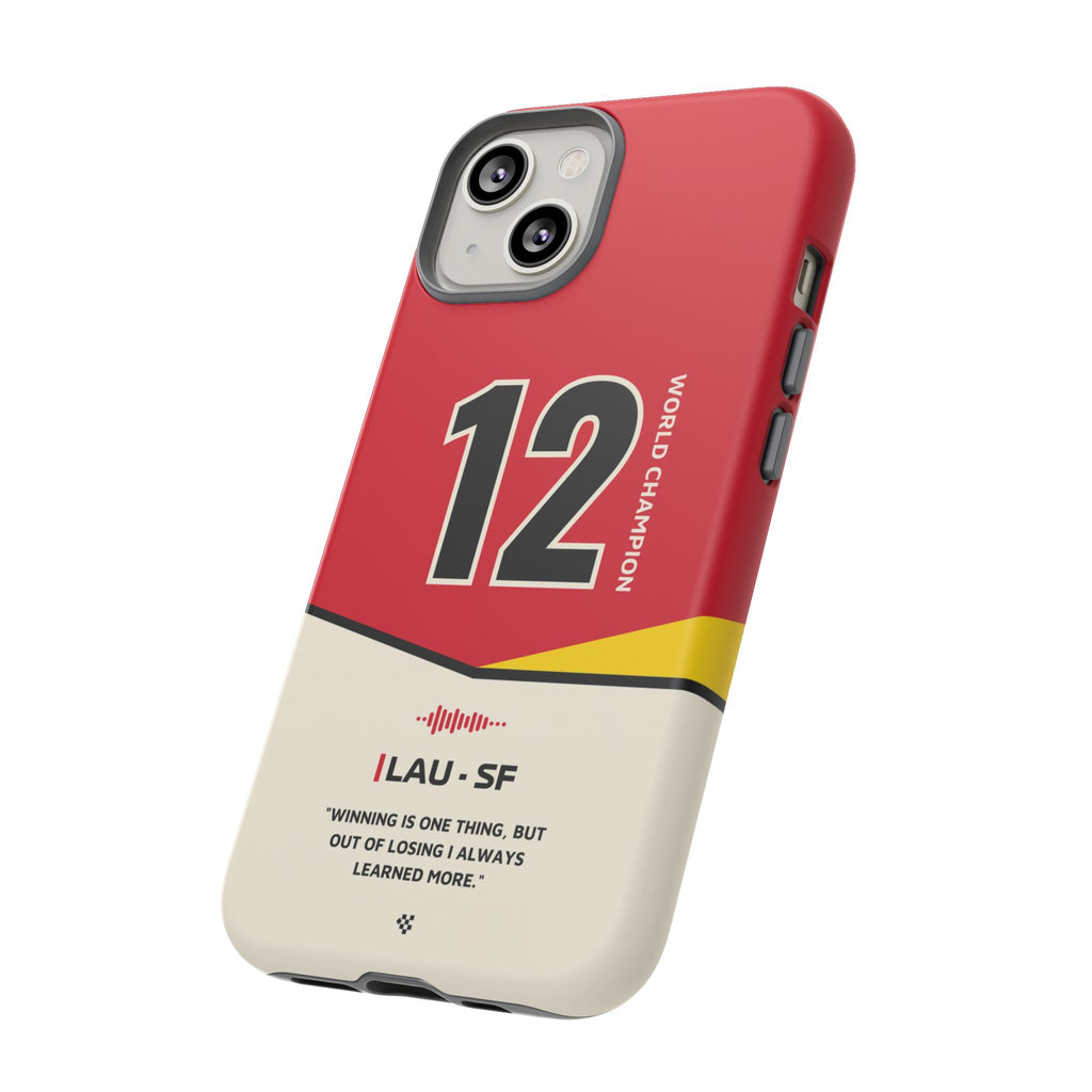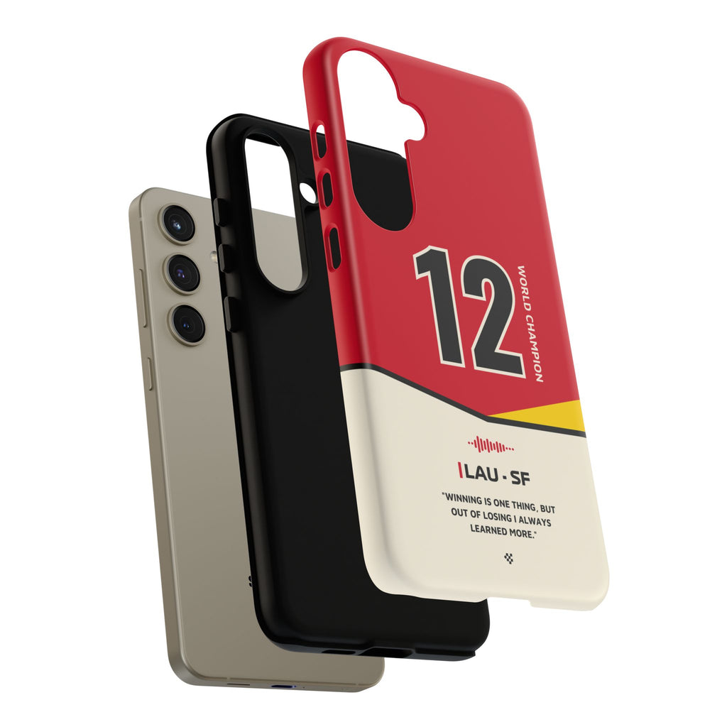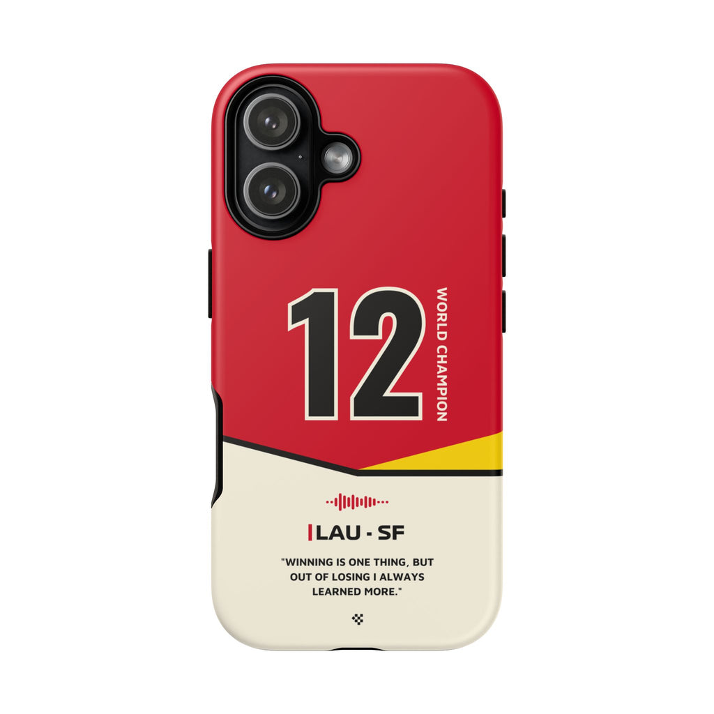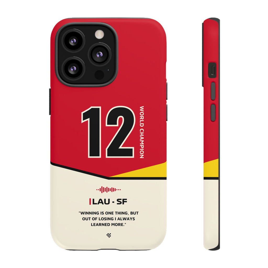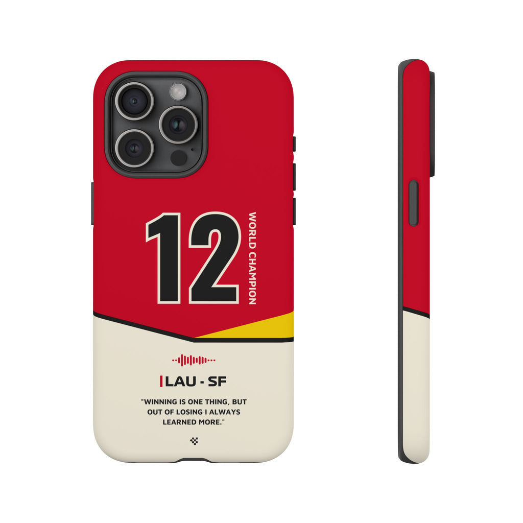 Make sure his legacy persists with the exclusive Niki Lauda F1 Legend Phone Case. It's the perfect accessory for every passionate Formula 1 and Lauda fan. Featuring Niki's iconic #12 race number and the bold 1975 Scuderia Ferrari team colors, this red phone case brings racing energy straight to your hand.