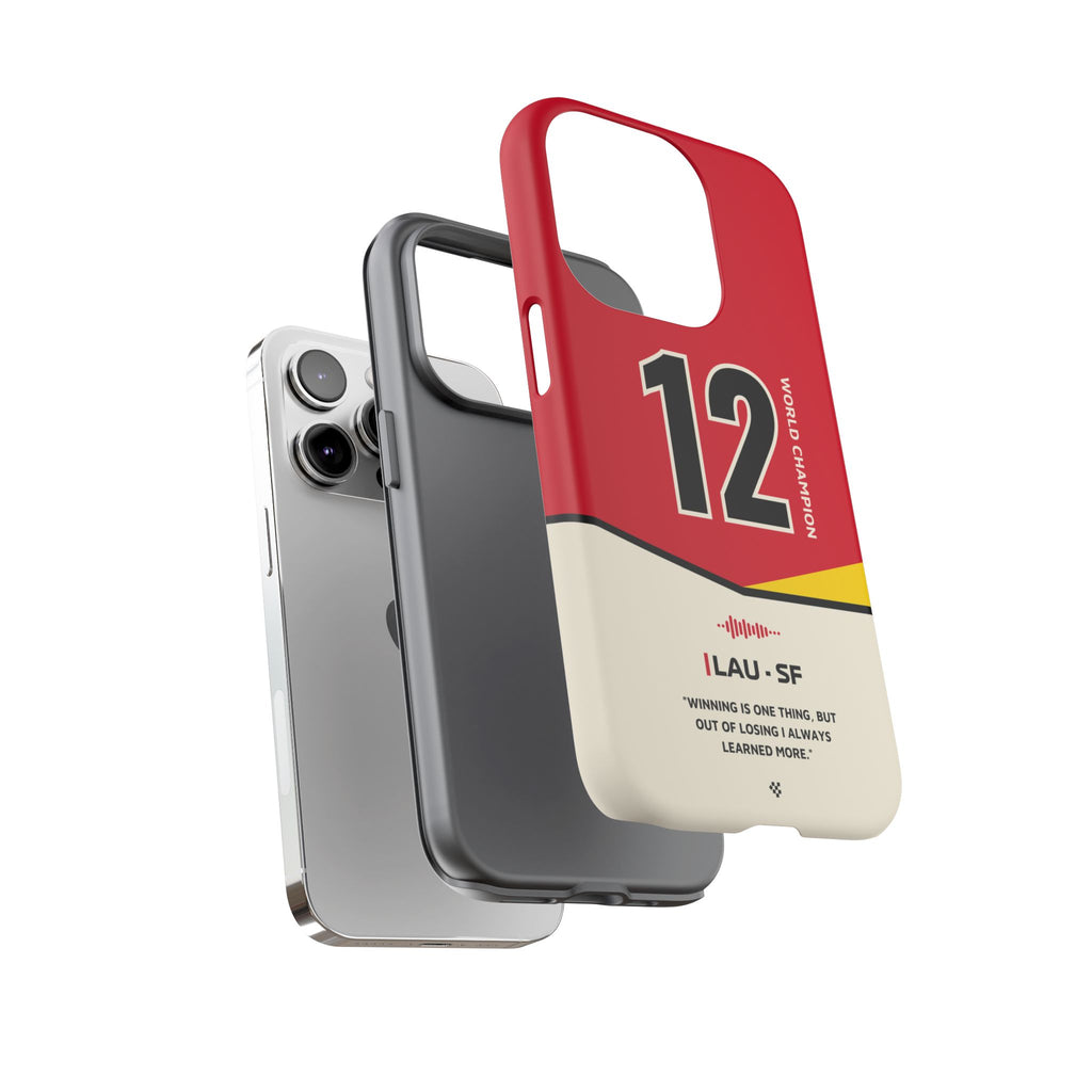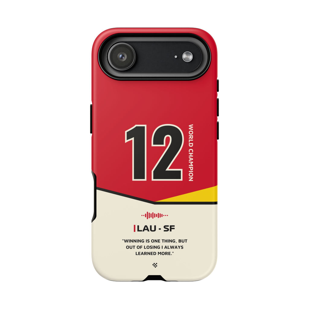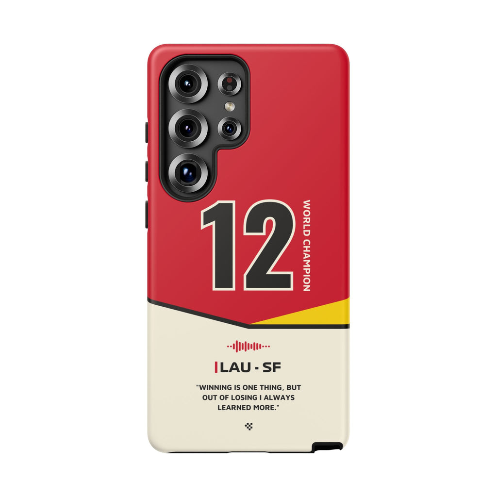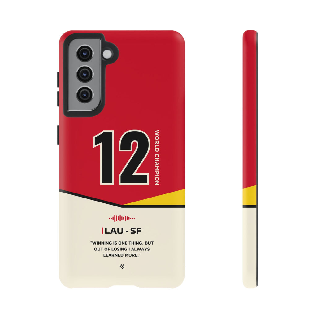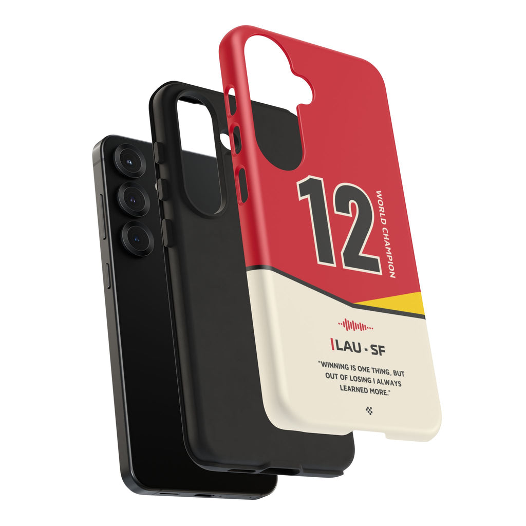 Make sure his legacy persists with the exclusive Niki Lauda F1 Legend Phone Case. It's the perfect accessory for every passionate Formula 1 and Lauda fan. Featuring Niki's iconic #12 race number and the bold 1975 Scuderia Ferrari team colors, this red phone case brings racing energy straight to your hand.
