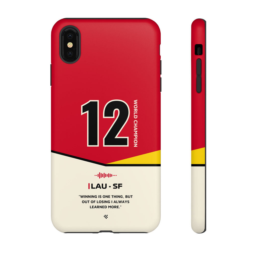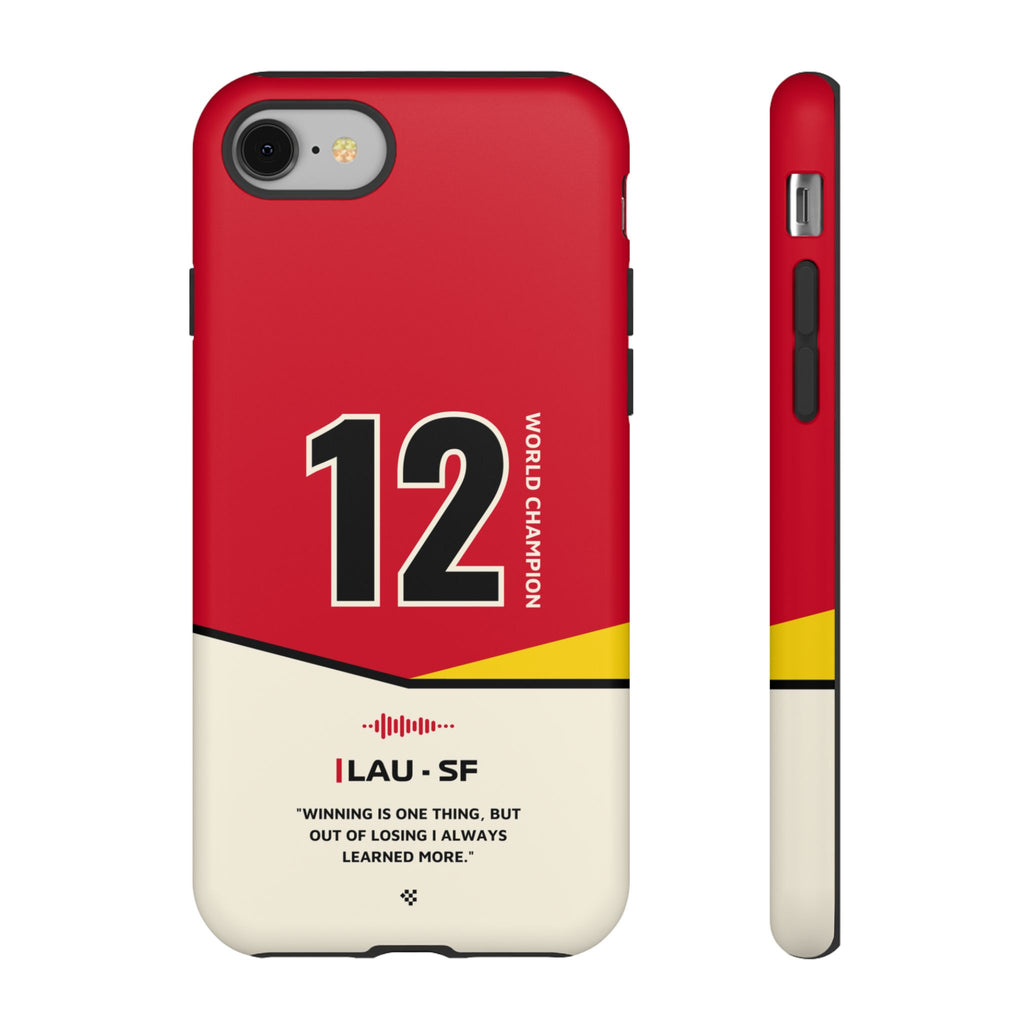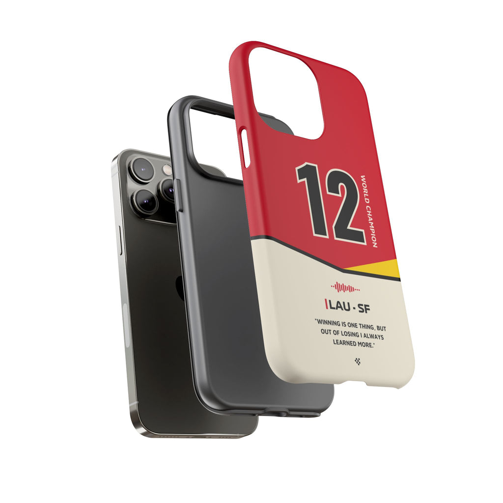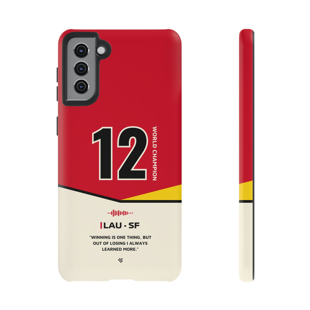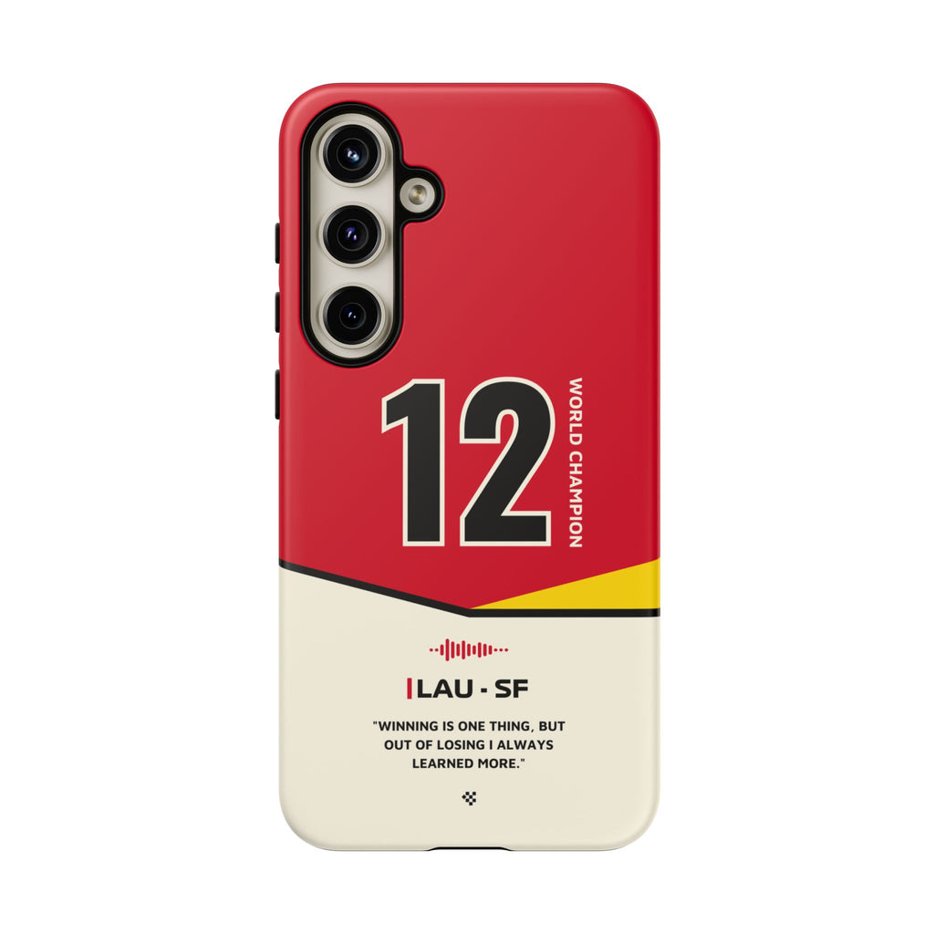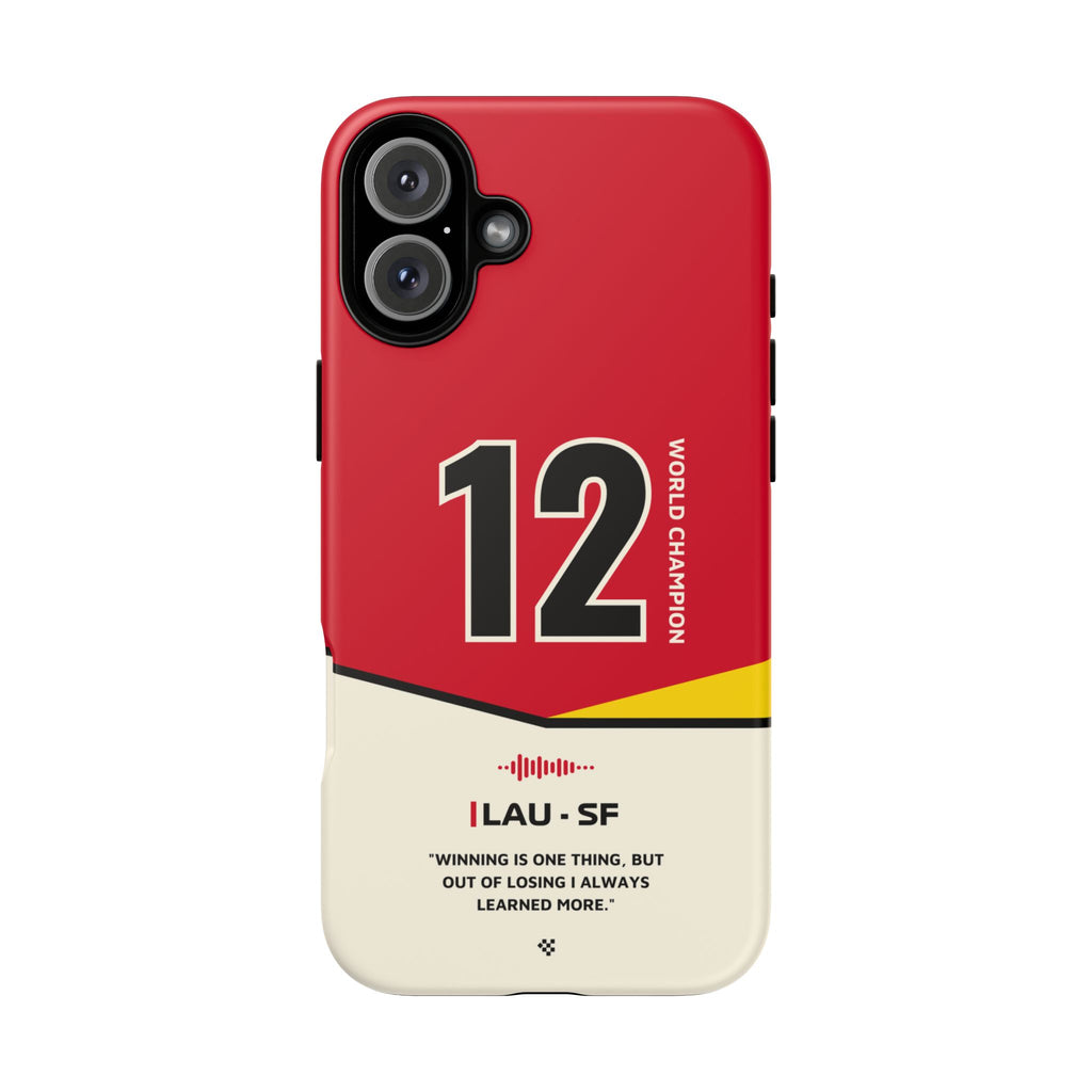 Make sure his legacy persists with the exclusive Niki Lauda F1 Legend Phone Case. It's the perfect accessory for every passionate Formula 1 and Lauda fan. Featuring Niki's iconic #12 race number and the bold 1975 Scuderia Ferrari team colors, this red phone case brings racing energy straight to your hand.