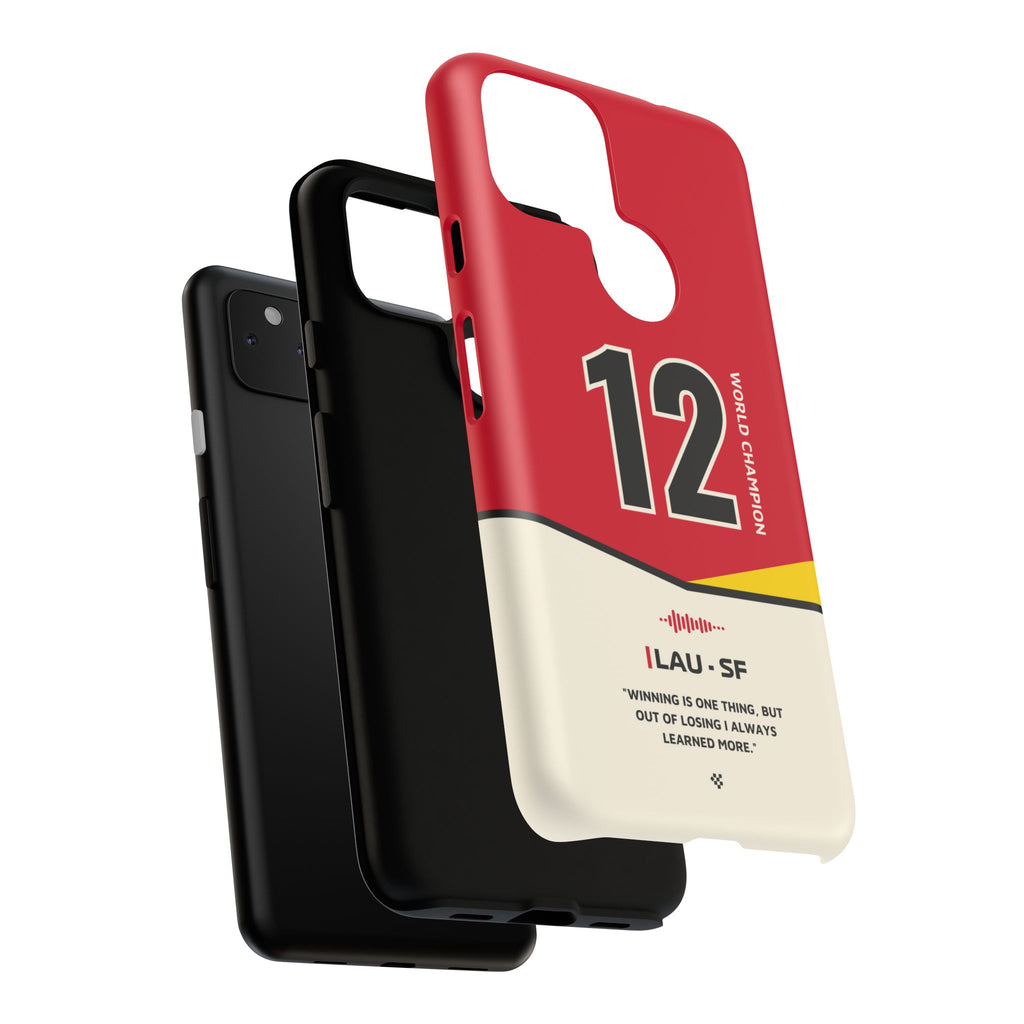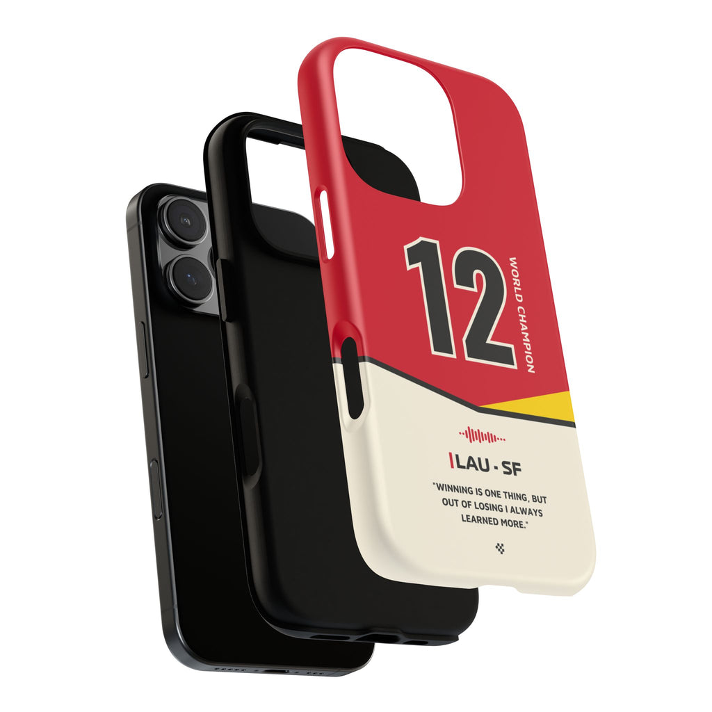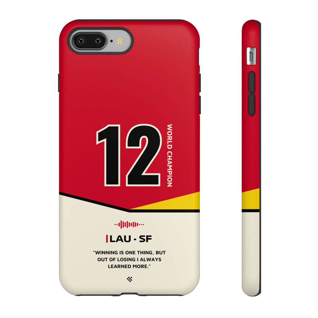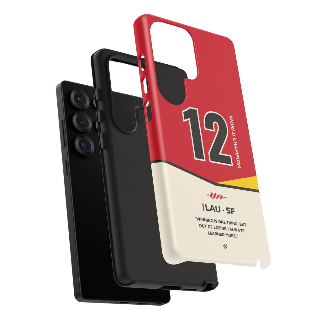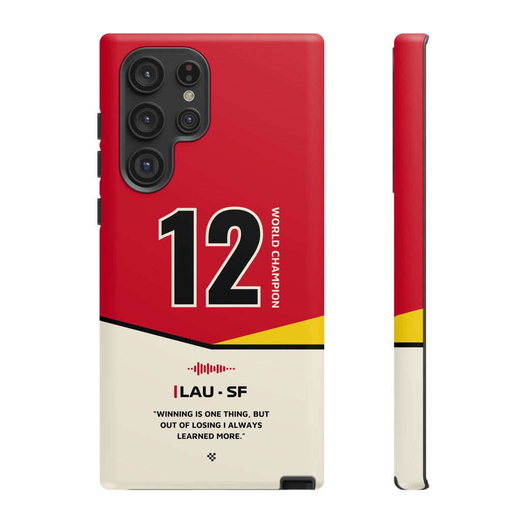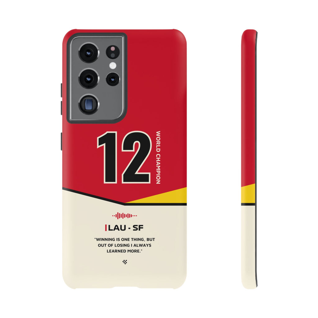 Make sure his legacy persists with the exclusive Niki Lauda F1 Legend Phone Case. It's the perfect accessory for every passionate Formula 1 and Lauda fan. Featuring Niki's iconic #12 race number and the bold 1975 Scuderia Ferrari team colors, this red phone case brings racing energy straight to your hand.