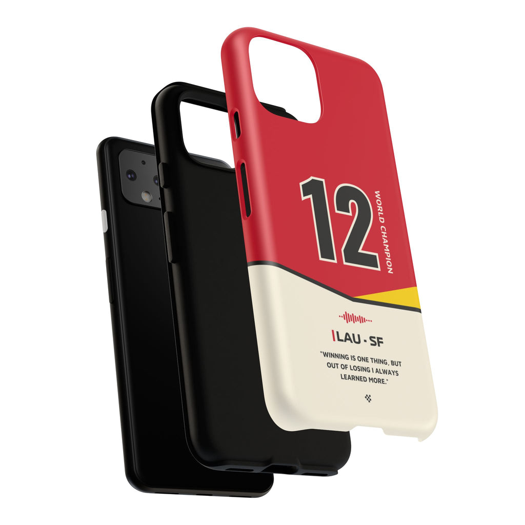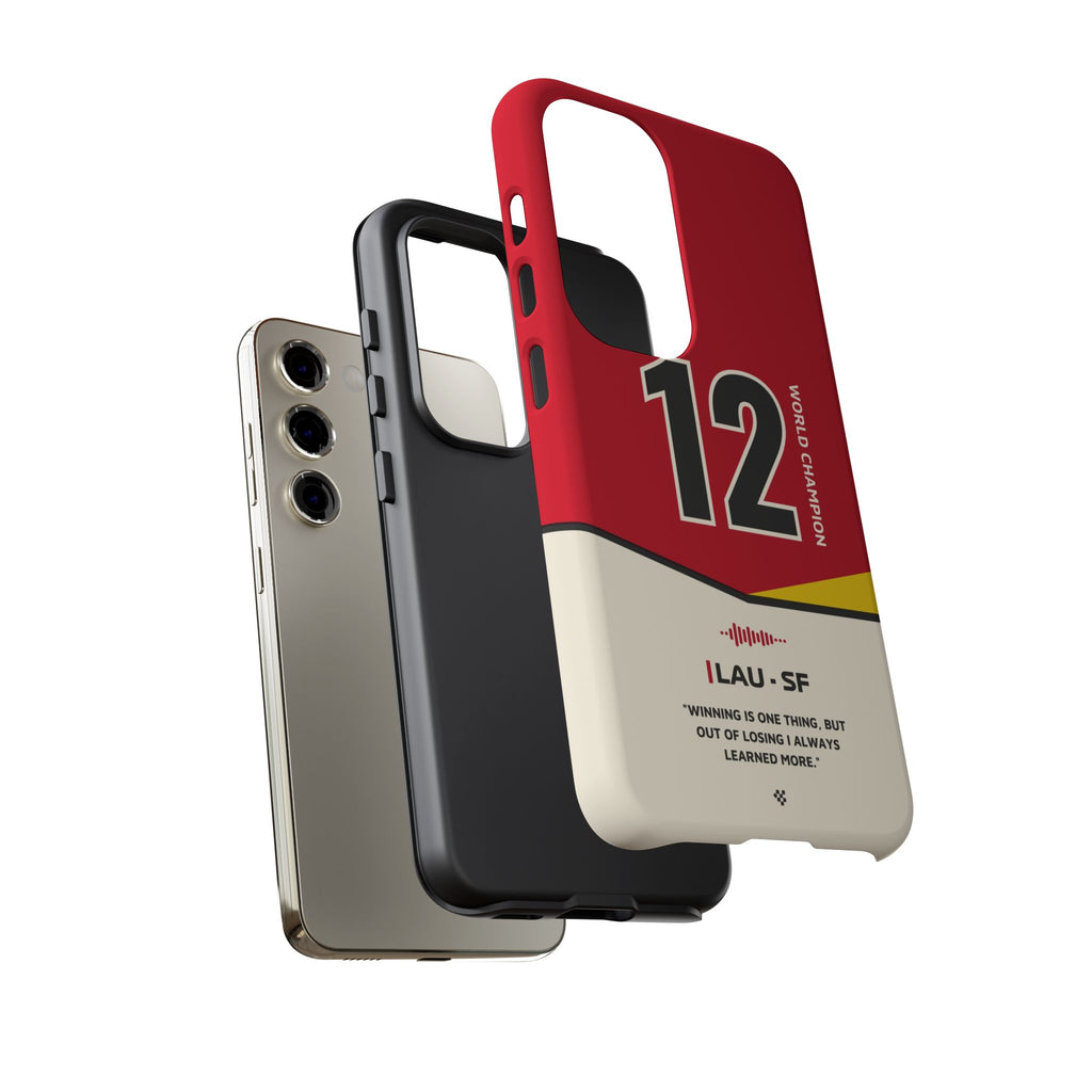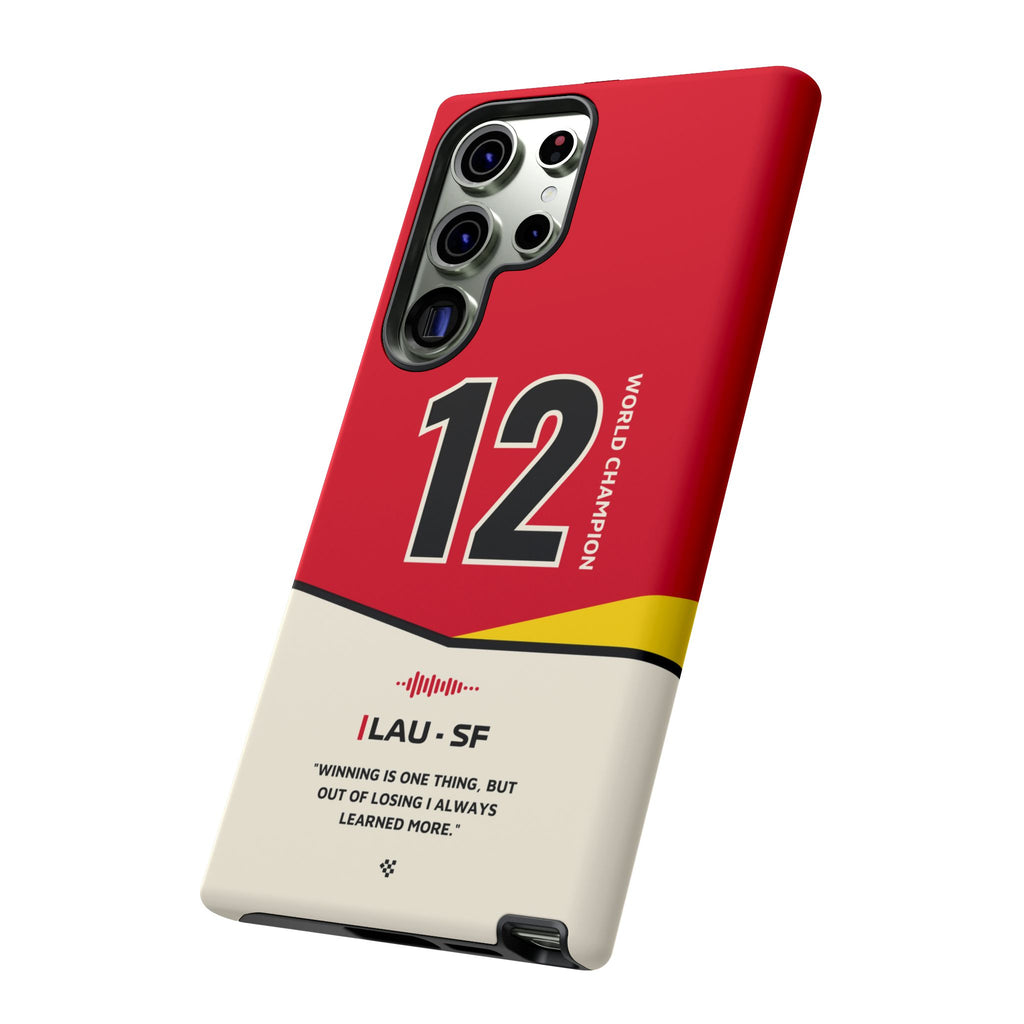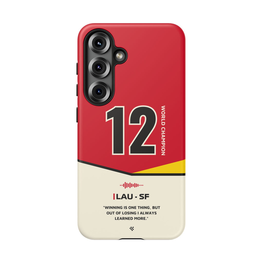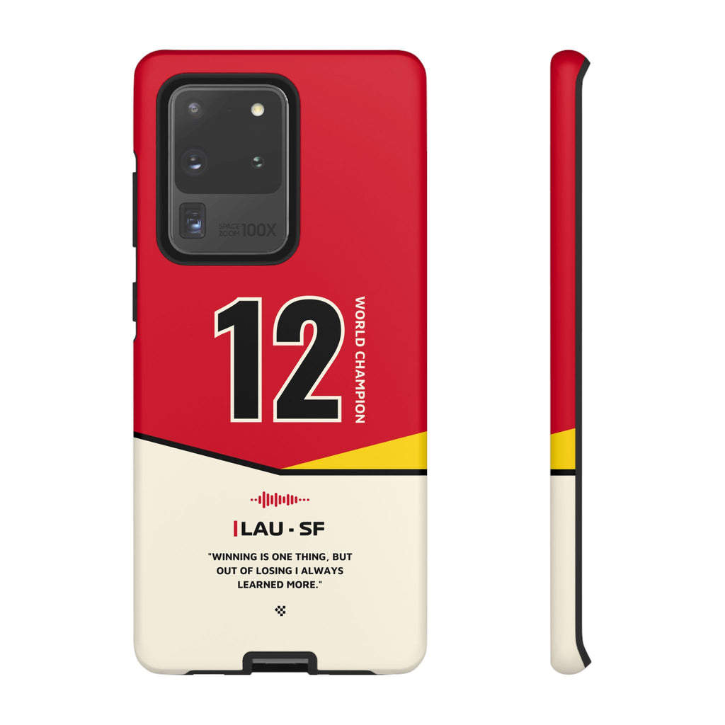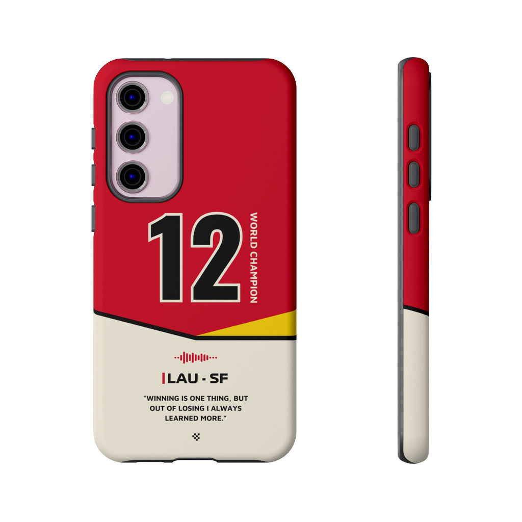 Make sure his legacy persists with the exclusive Niki Lauda F1 Legend Phone Case. It's the perfect accessory for every passionate Formula 1 and Lauda fan. Featuring Niki's iconic #12 race number and the bold 1975 Scuderia Ferrari team colors, this red phone case brings racing energy straight to your hand.