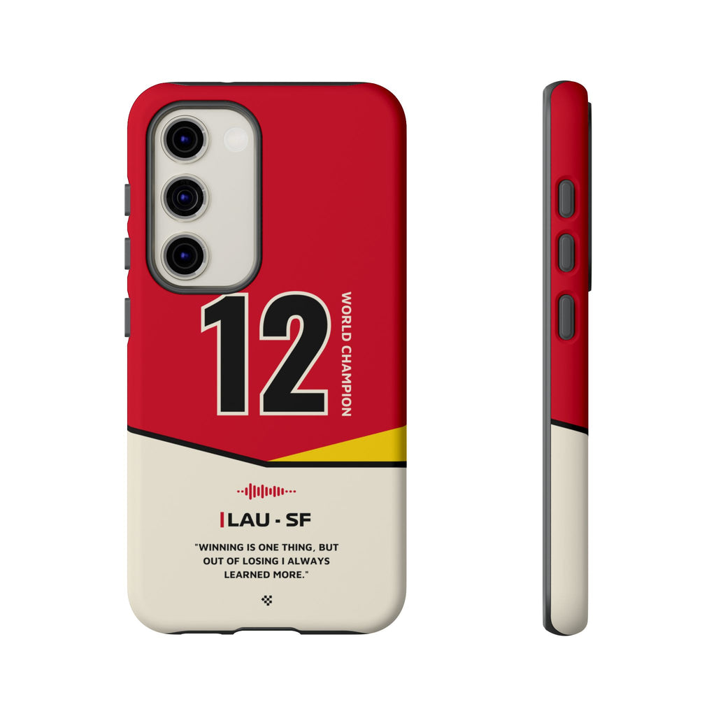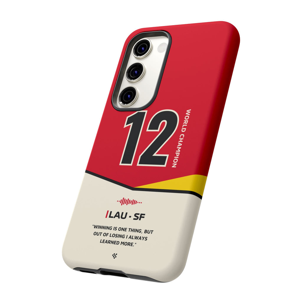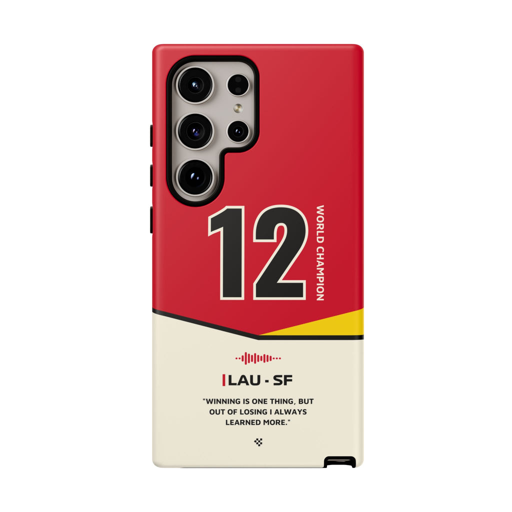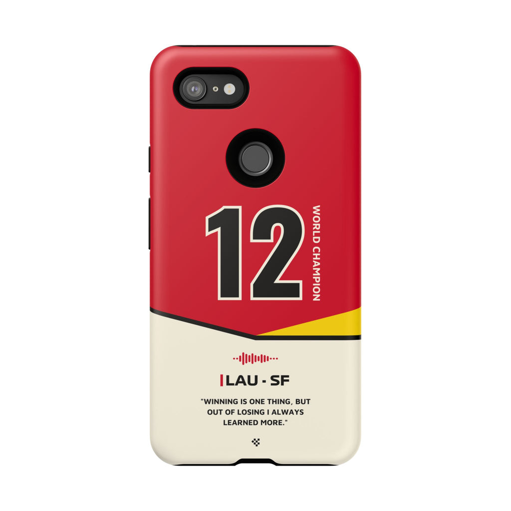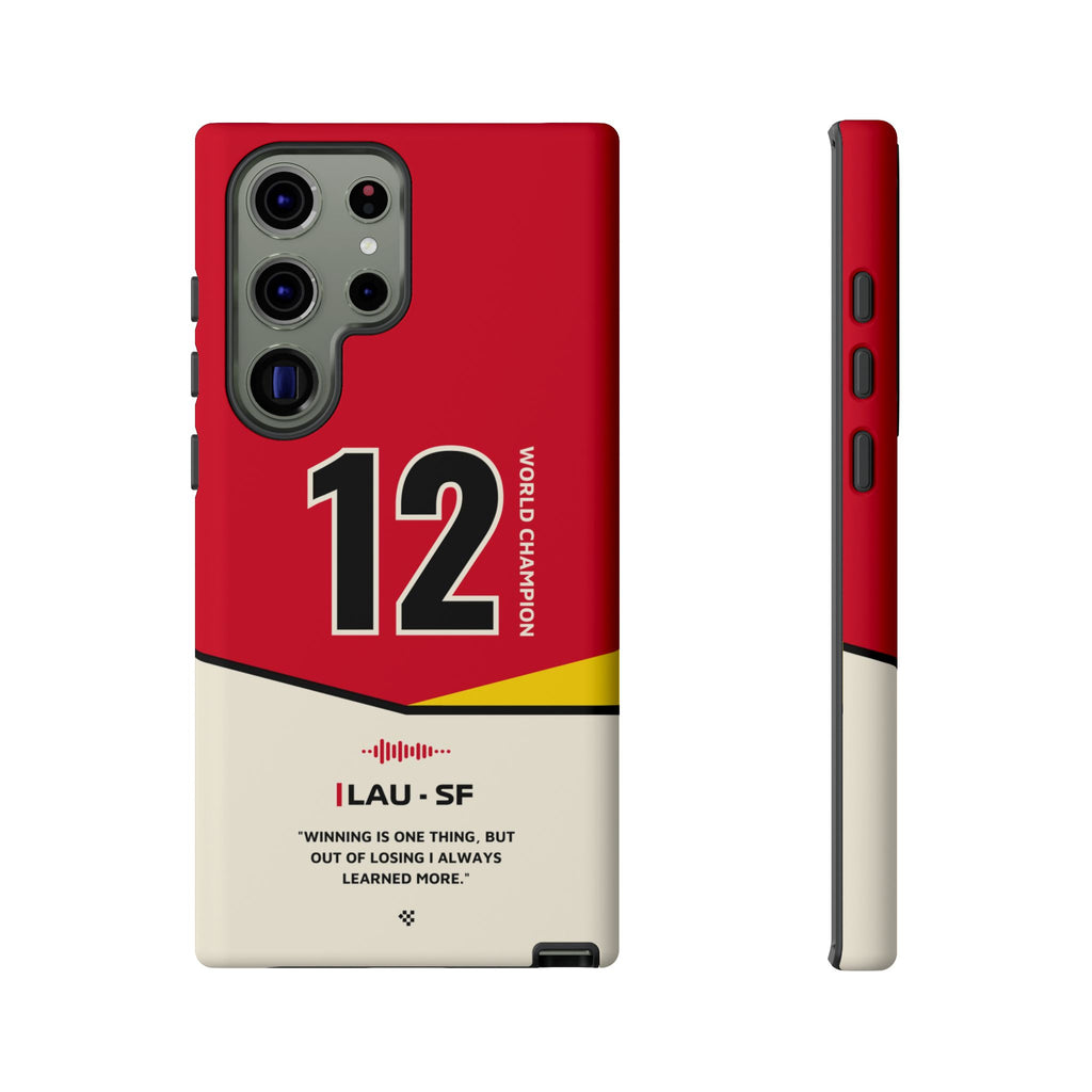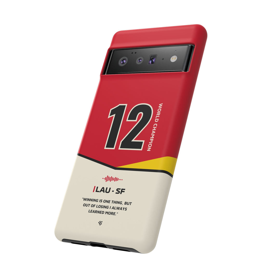 Make sure his legacy persists with the exclusive Niki Lauda F1 Legend Phone Case. It's the perfect accessory for every passionate Formula 1 and Lauda fan. Featuring Niki's iconic #12 race number and the bold 1975 Scuderia Ferrari team colors, this red phone case brings racing energy straight to your hand.