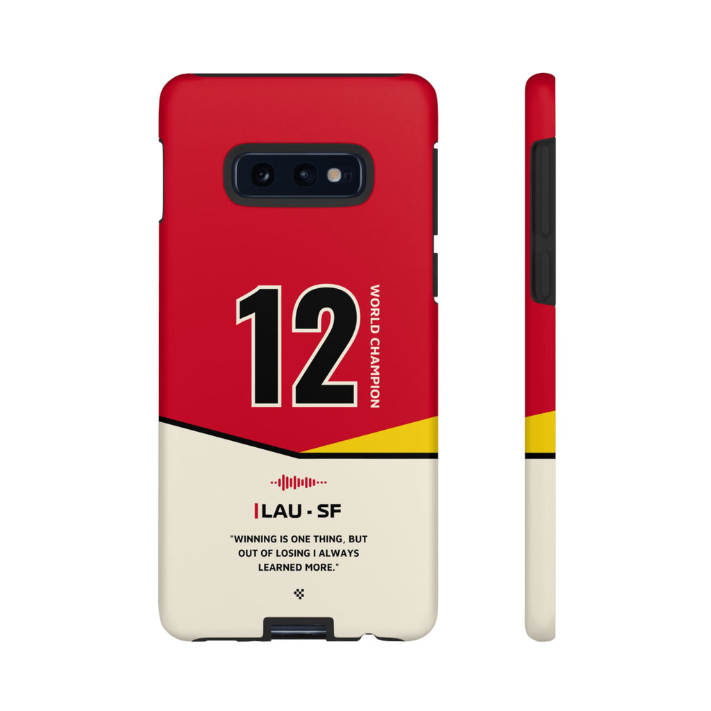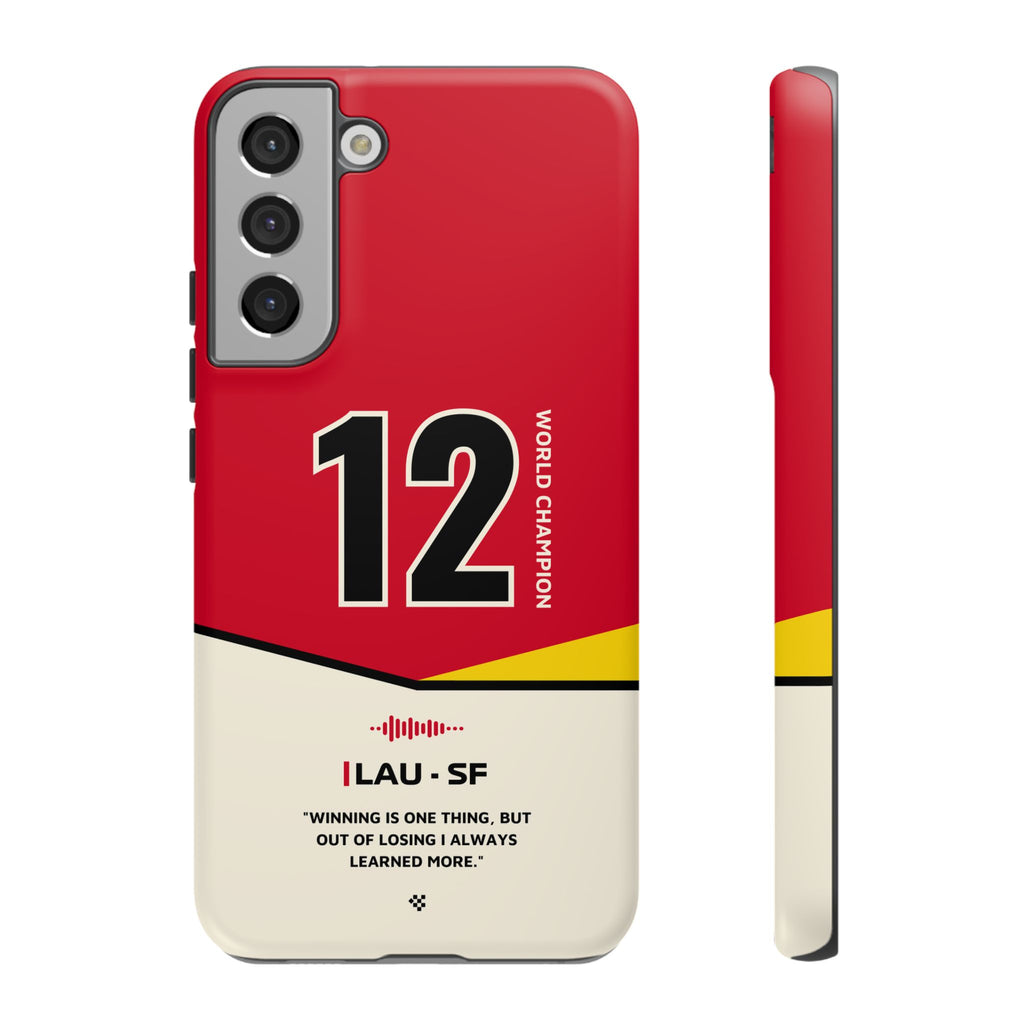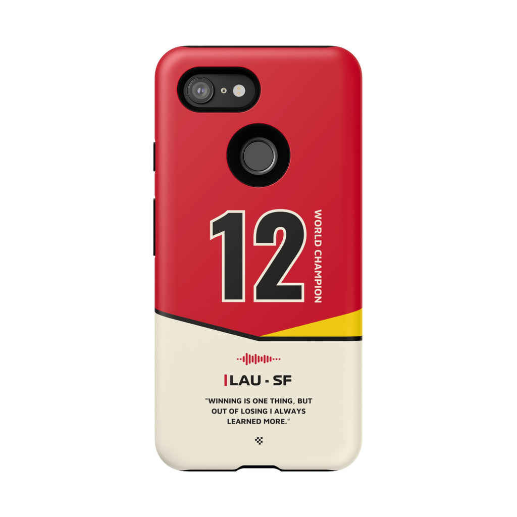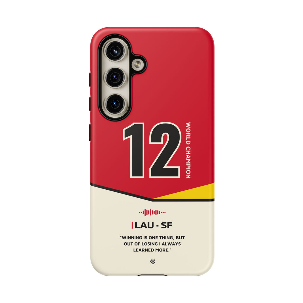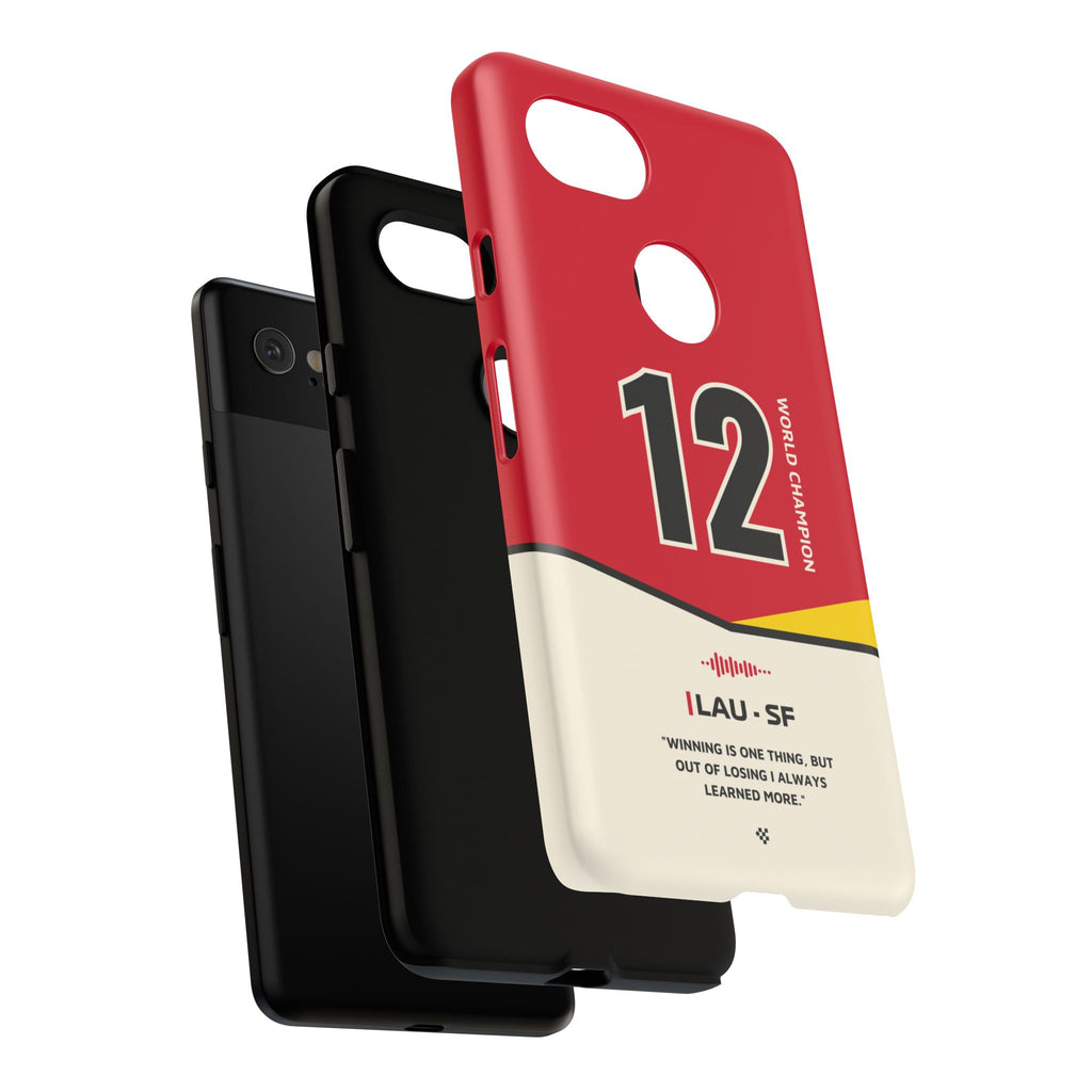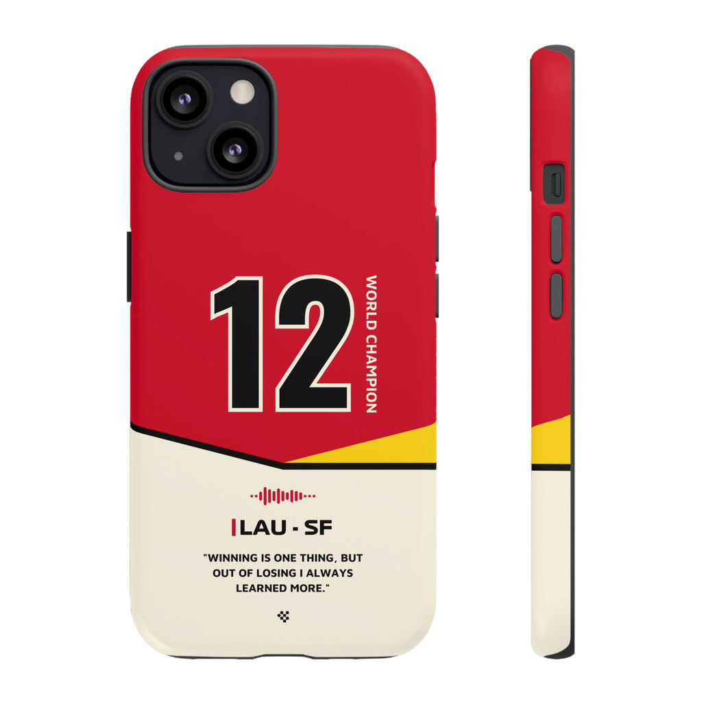 Make sure his legacy persists with the exclusive Niki Lauda F1 Legend Phone Case. It's the perfect accessory for every passionate Formula 1 and Lauda fan. Featuring Niki's iconic #12 race number and the bold 1975 Scuderia Ferrari team colors, this red phone case brings racing energy straight to your hand.