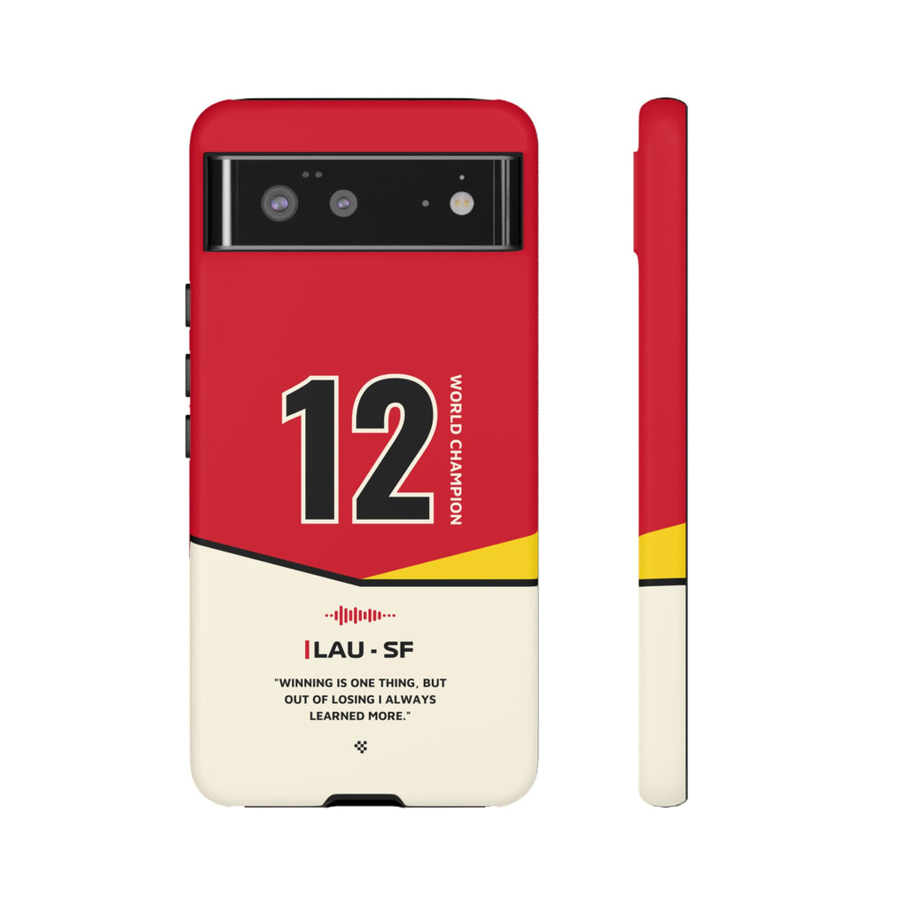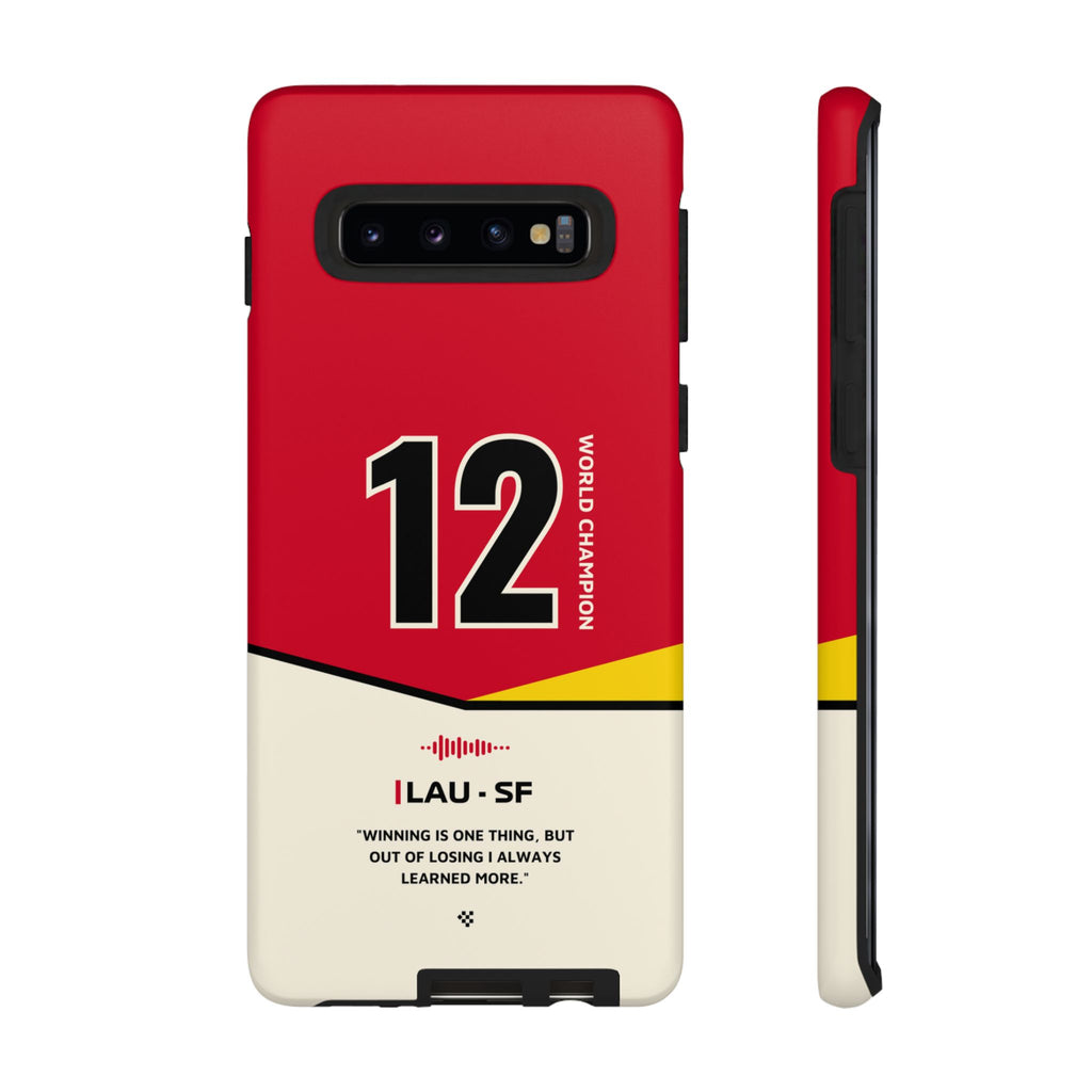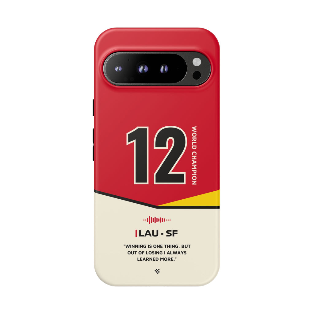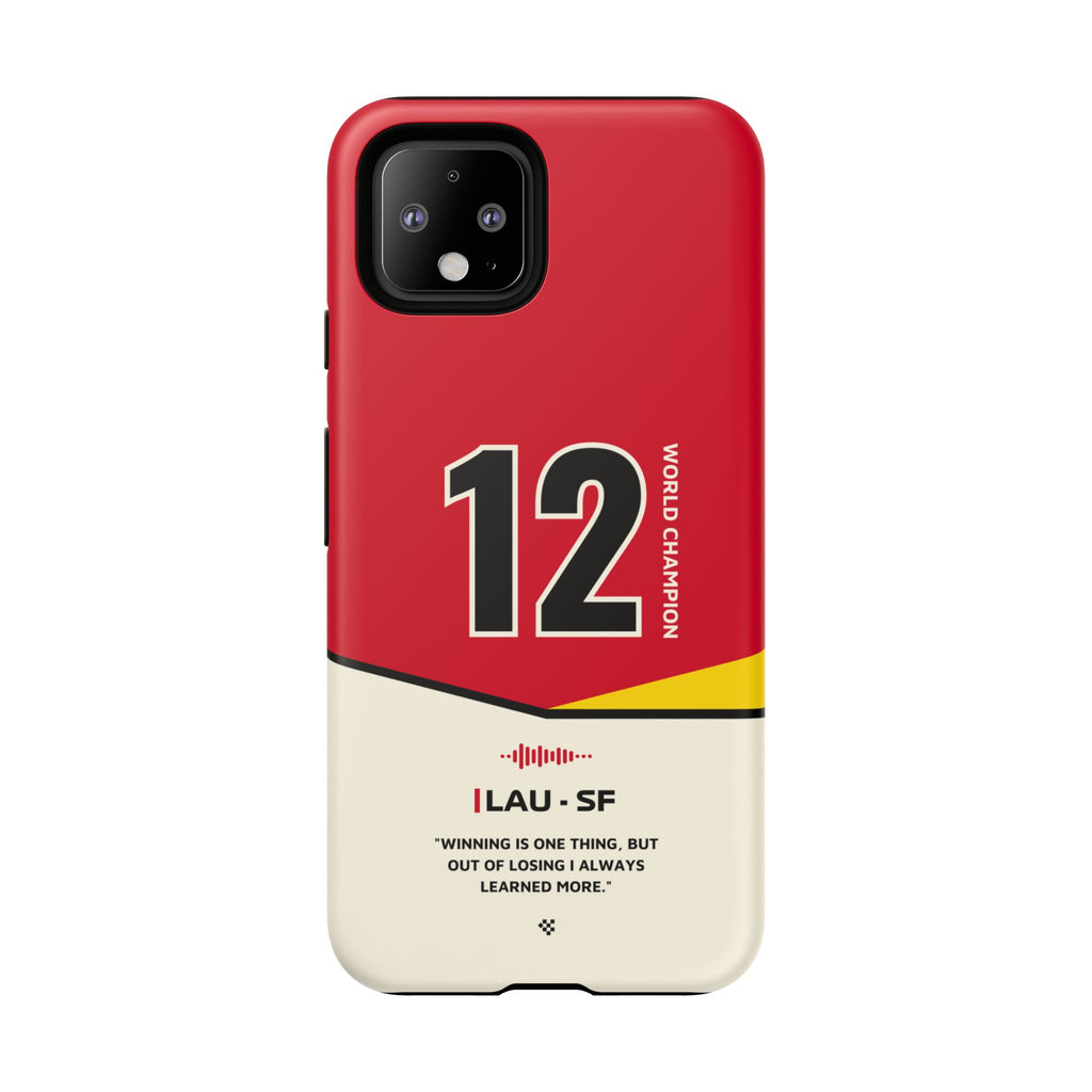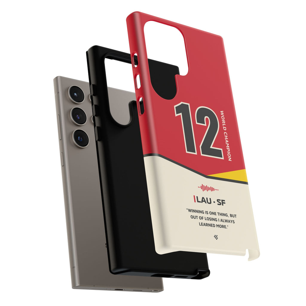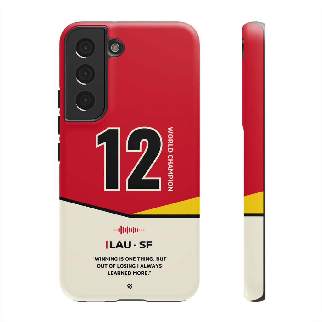 Make sure his legacy persists with the exclusive Niki Lauda F1 Legend Phone Case. It's the perfect accessory for every passionate Formula 1 and Lauda fan. Featuring Niki's iconic #12 race number and the bold 1975 Scuderia Ferrari team colors, this red phone case brings racing energy straight to your hand.