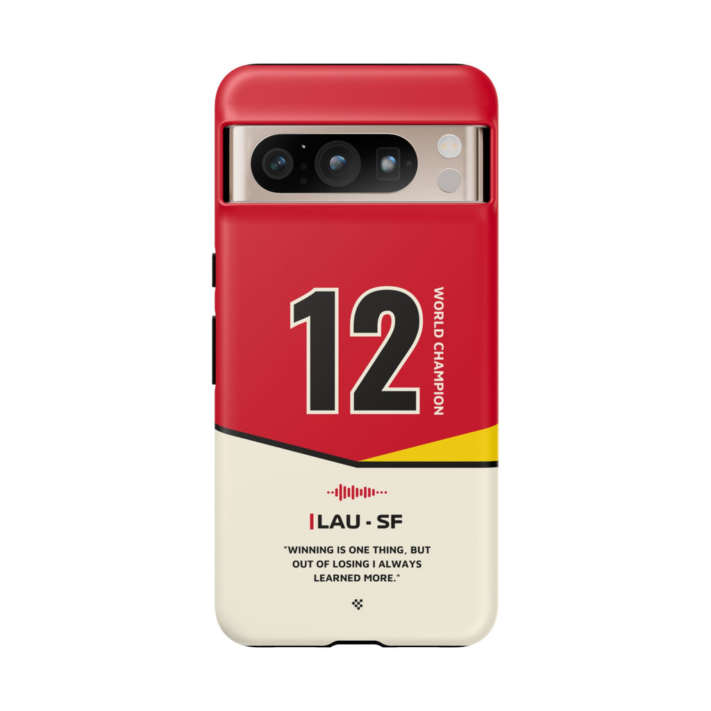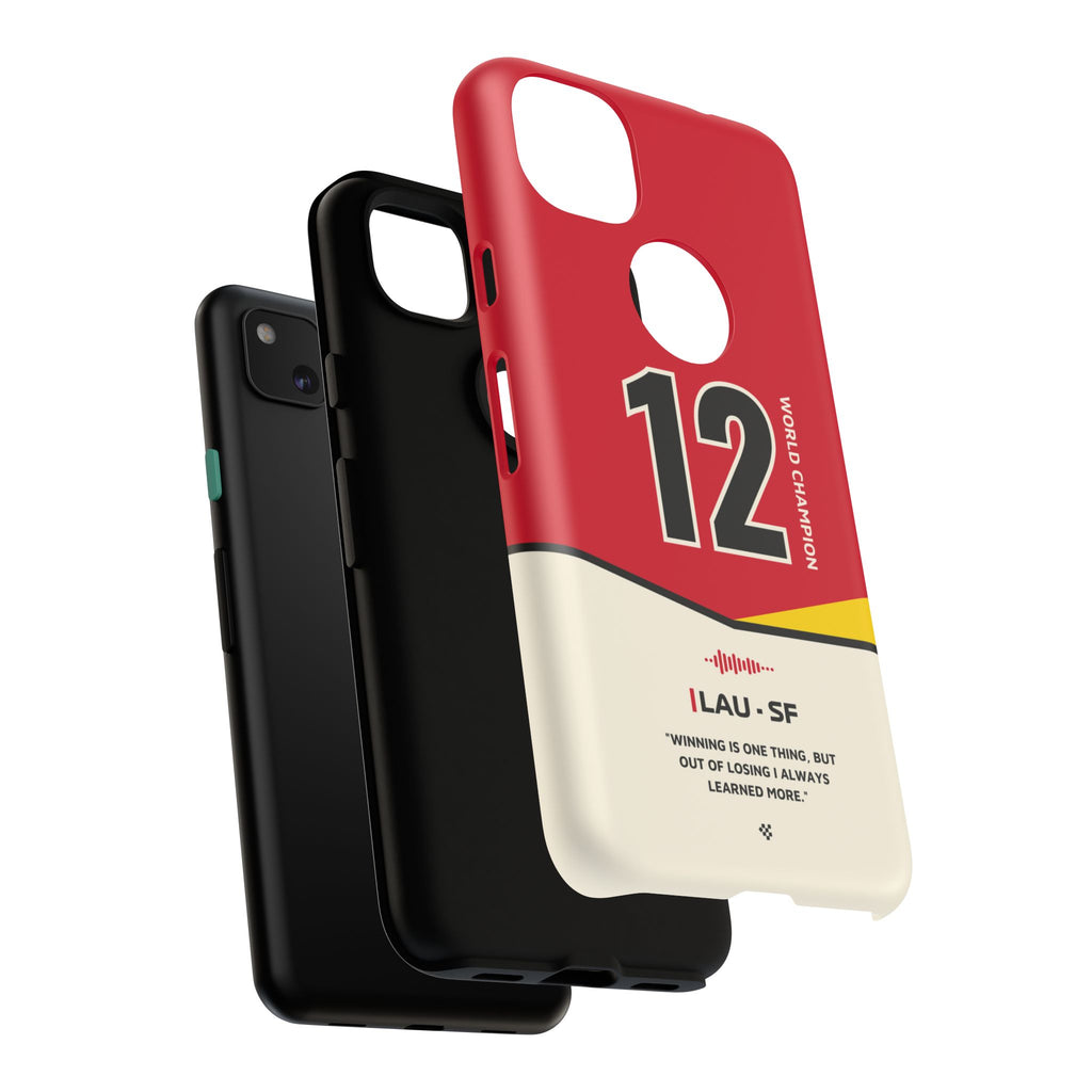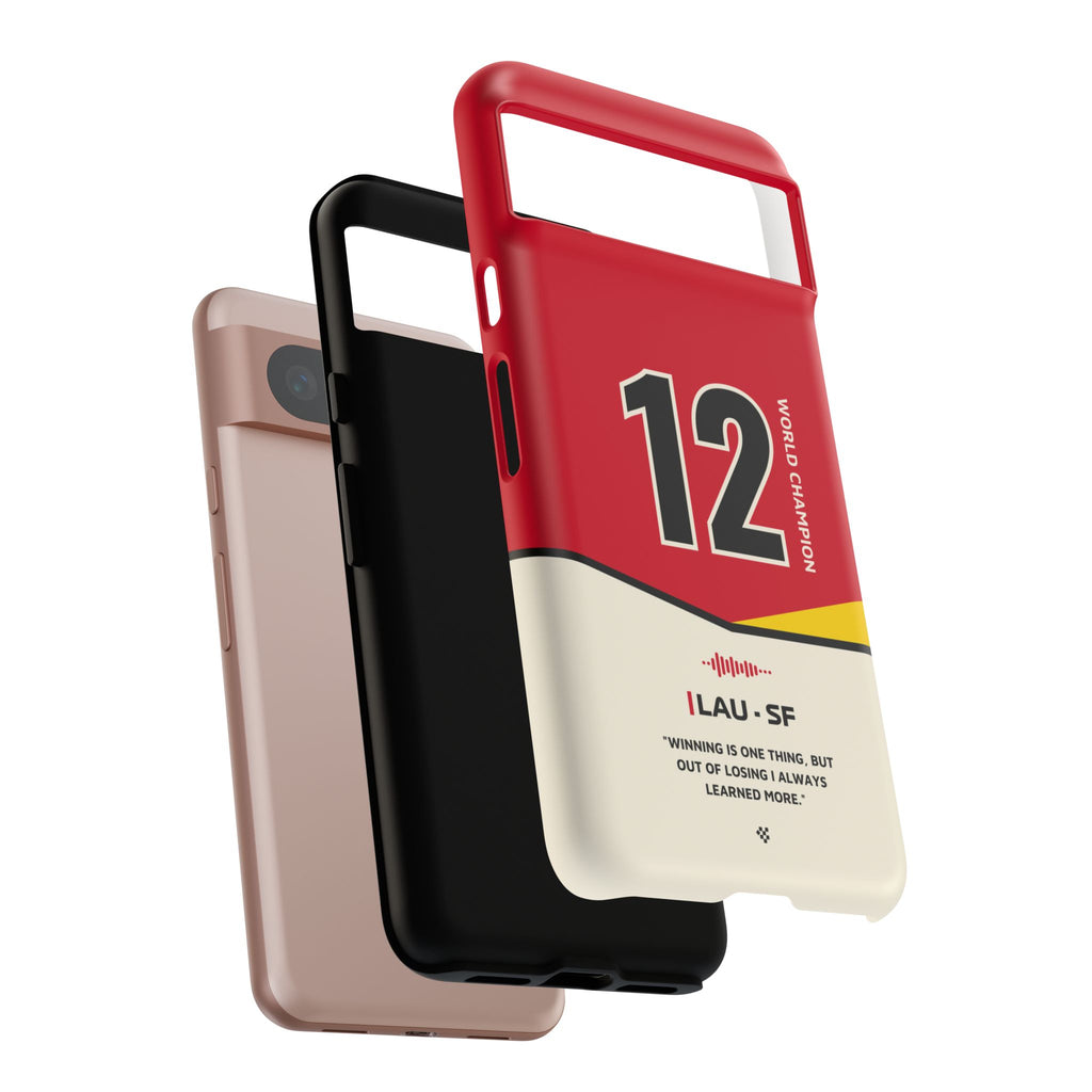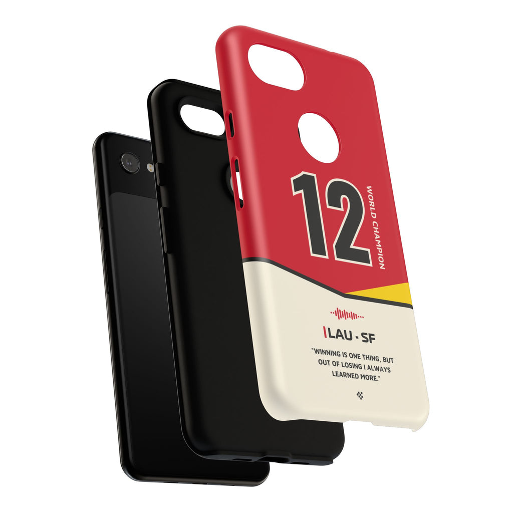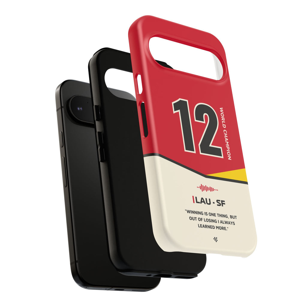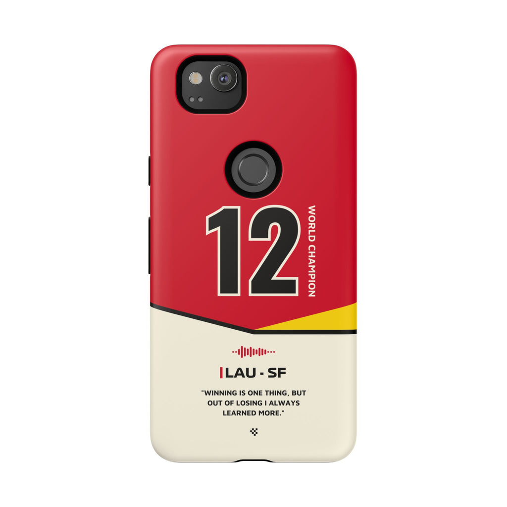 Make sure his legacy persists with the exclusive Niki Lauda F1 Legend Phone Case. It's the perfect accessory for every passionate Formula 1 and Lauda fan. Featuring Niki's iconic #12 race number and the bold 1975 Scuderia Ferrari team colors, this red phone case brings racing energy straight to your hand.