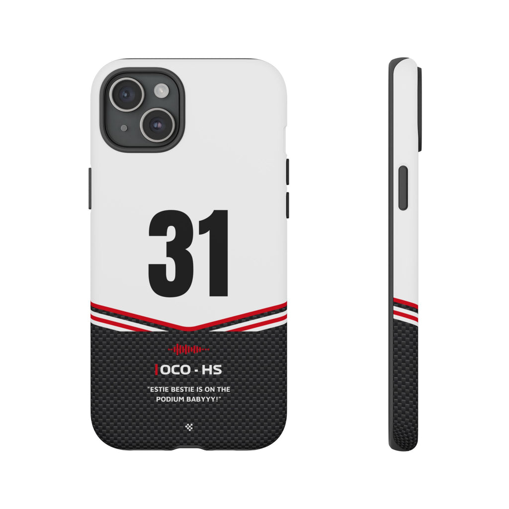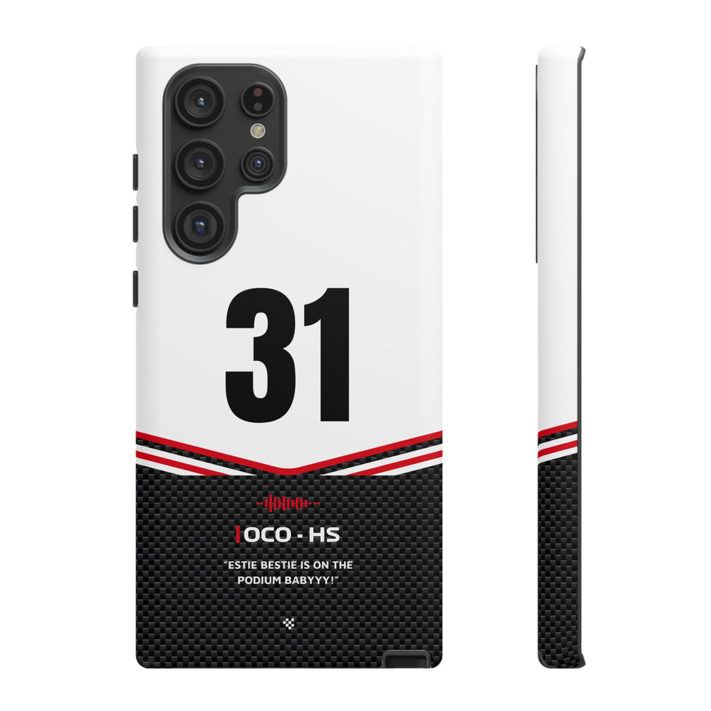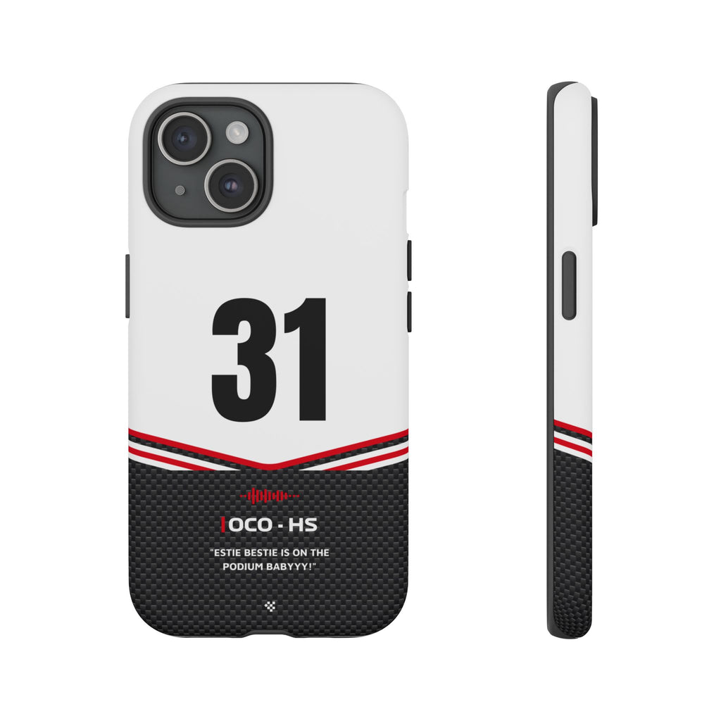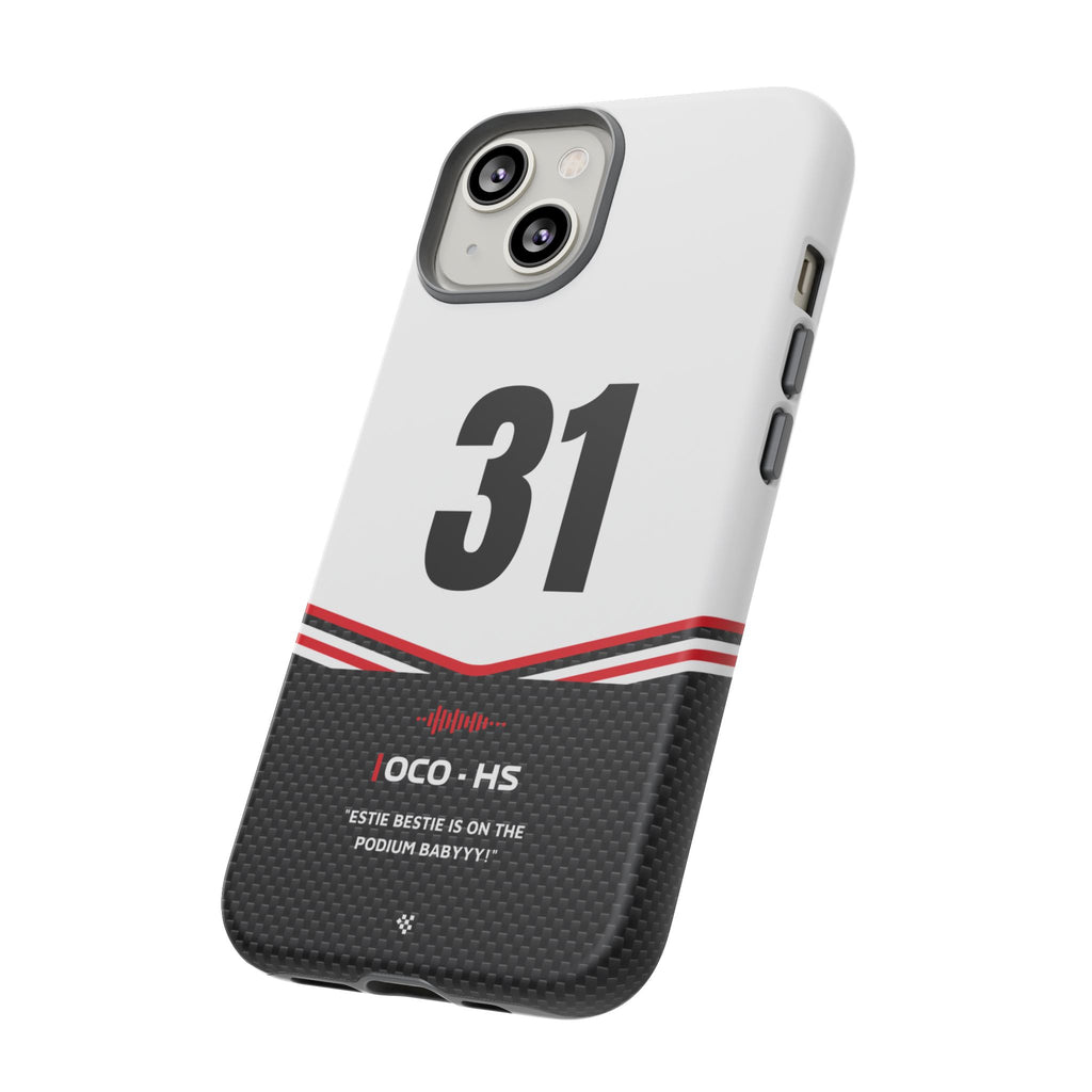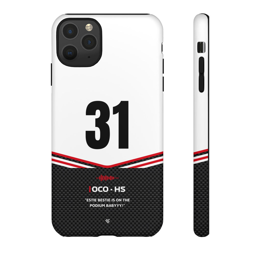 Support your favorite F1 driver with the exclusive Esteban Ocon F1 2025 Team Phone Case. It's the perfect accessory for every passionate Formula 1 and Ocon fan. Featuring Esteban's iconic #31 race number and the bold 2025 Haas team colors, this white phone case brings racing energy straight to your hand.