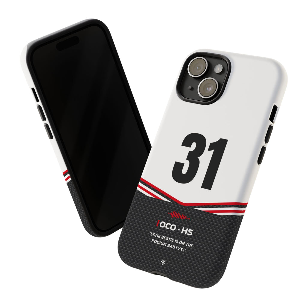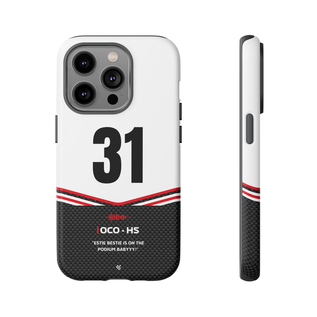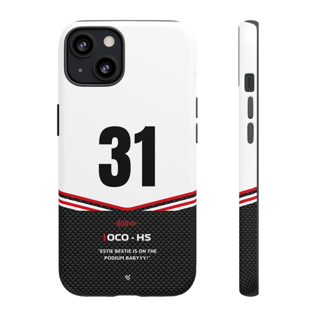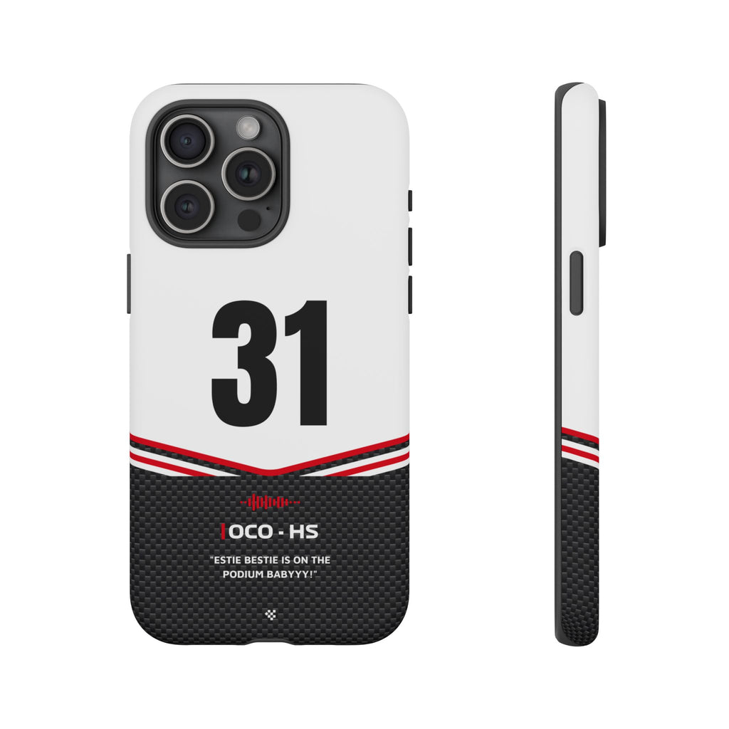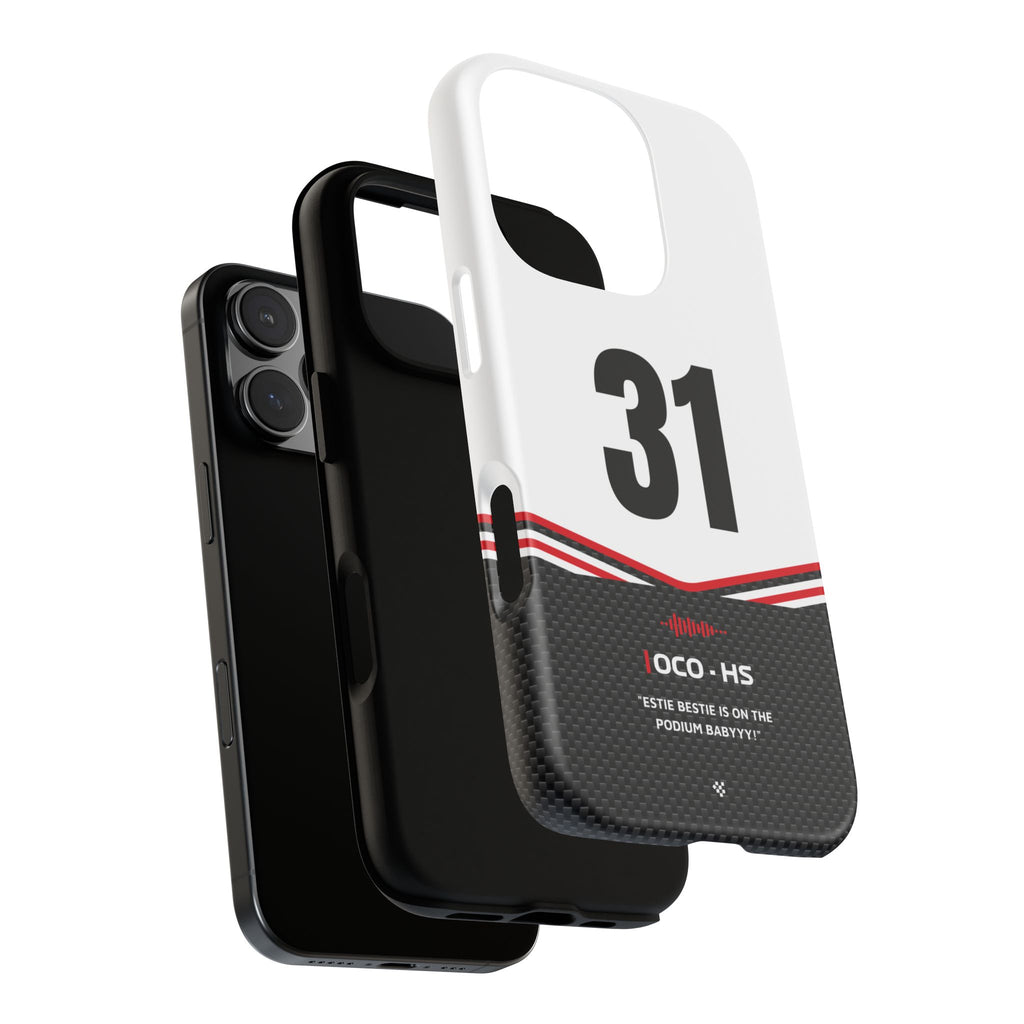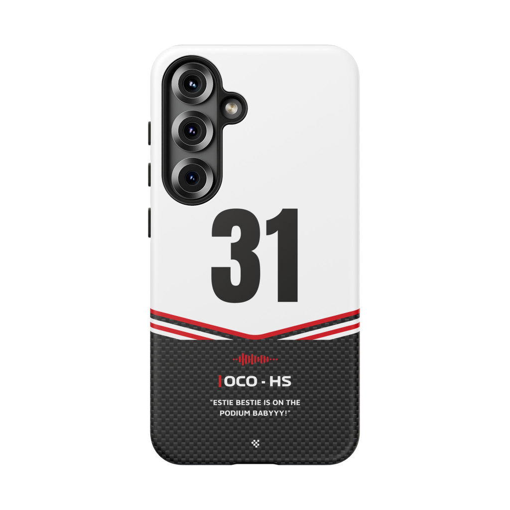 Support your favorite F1 driver with the exclusive Esteban Ocon F1 2025 Team Phone Case. It's the perfect accessory for every passionate Formula 1 and Ocon fan. Featuring Esteban's iconic #31 race number and the bold 2025 Haas team colors, this white phone case brings racing energy straight to your hand.