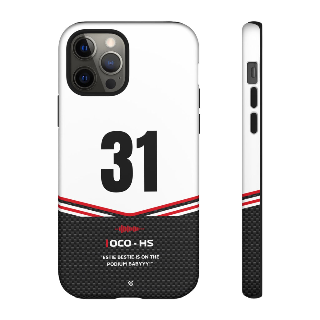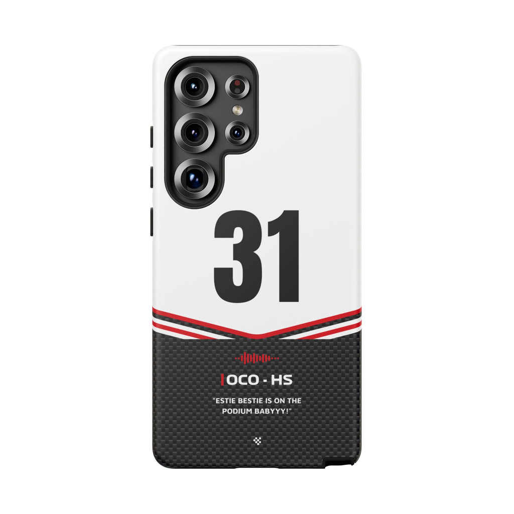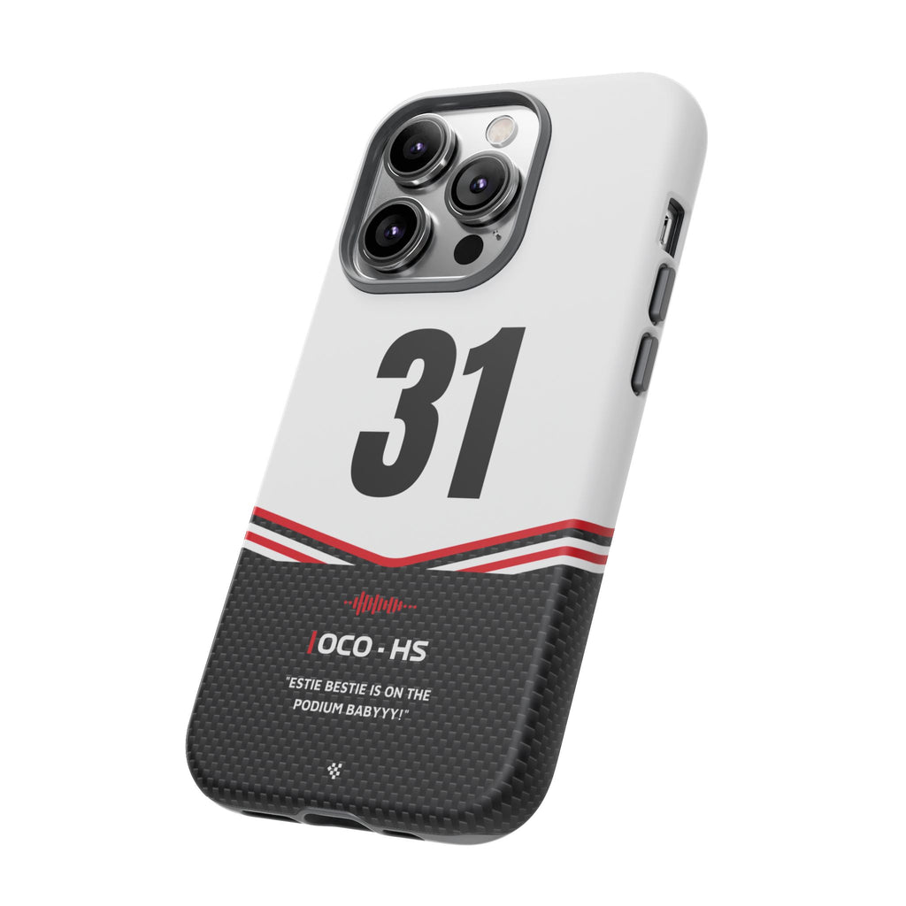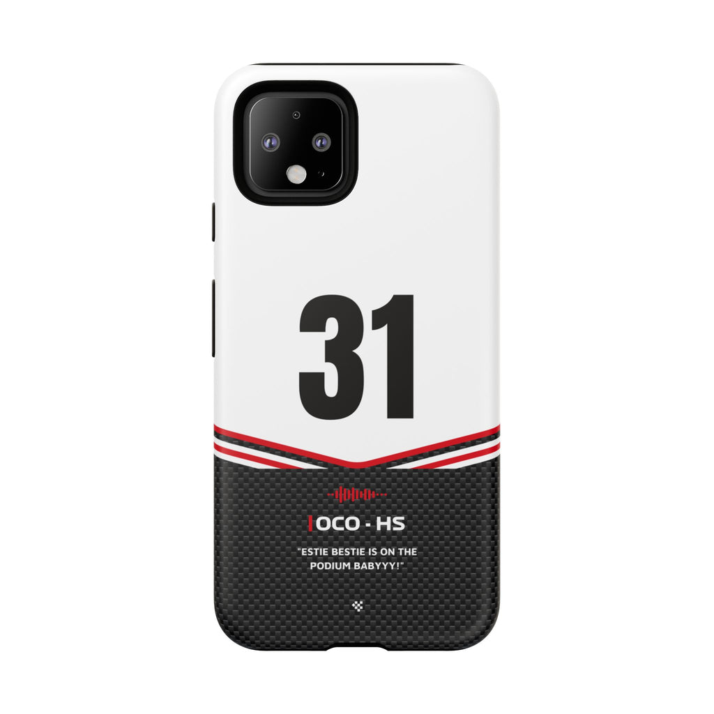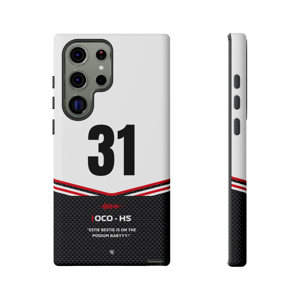 Support your favorite F1 driver with the exclusive Esteban Ocon F1 2025 Team Phone Case. It's the perfect accessory for every passionate Formula 1 and Ocon fan. Featuring Esteban's iconic #31 race number and the bold 2025 Haas team colors, this white phone case brings racing energy straight to your hand.