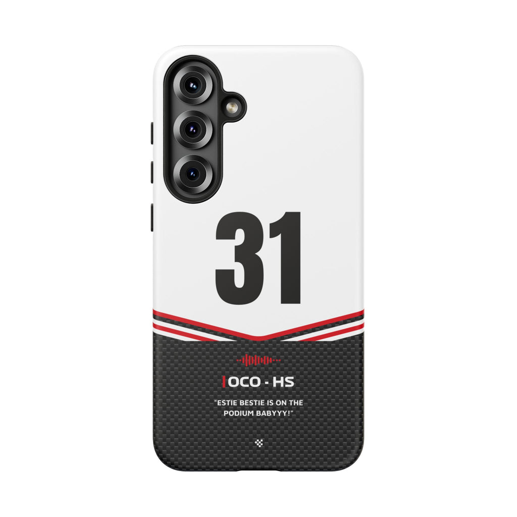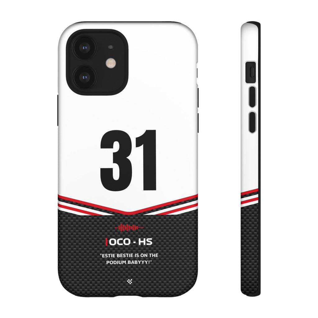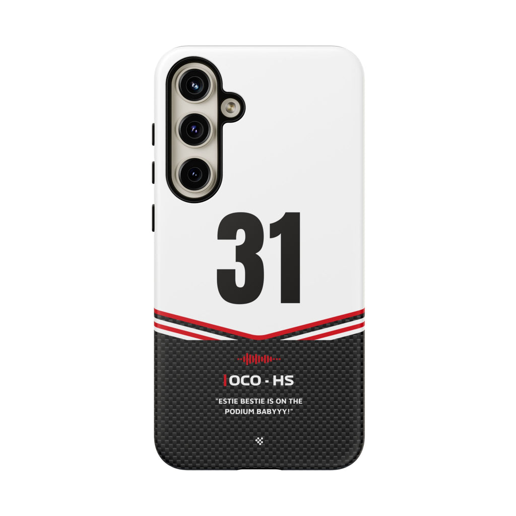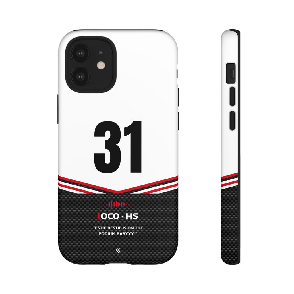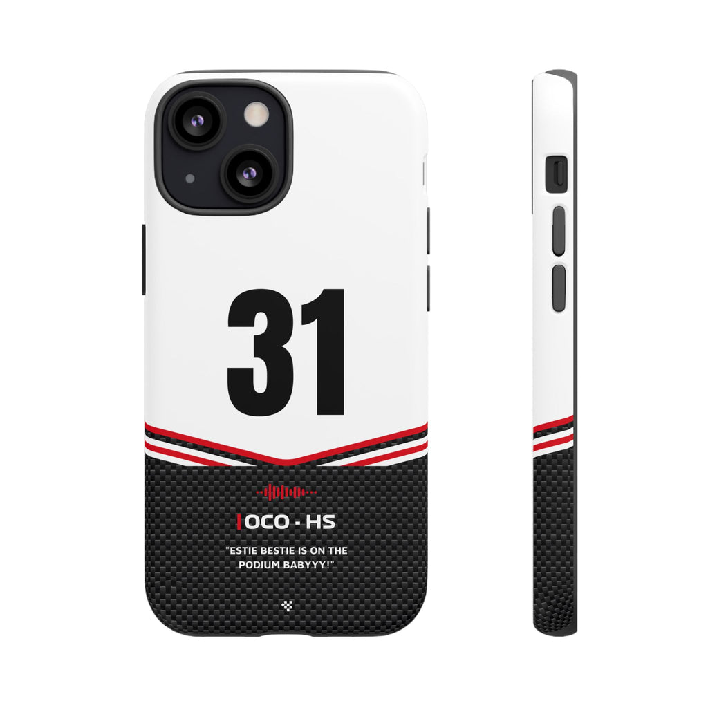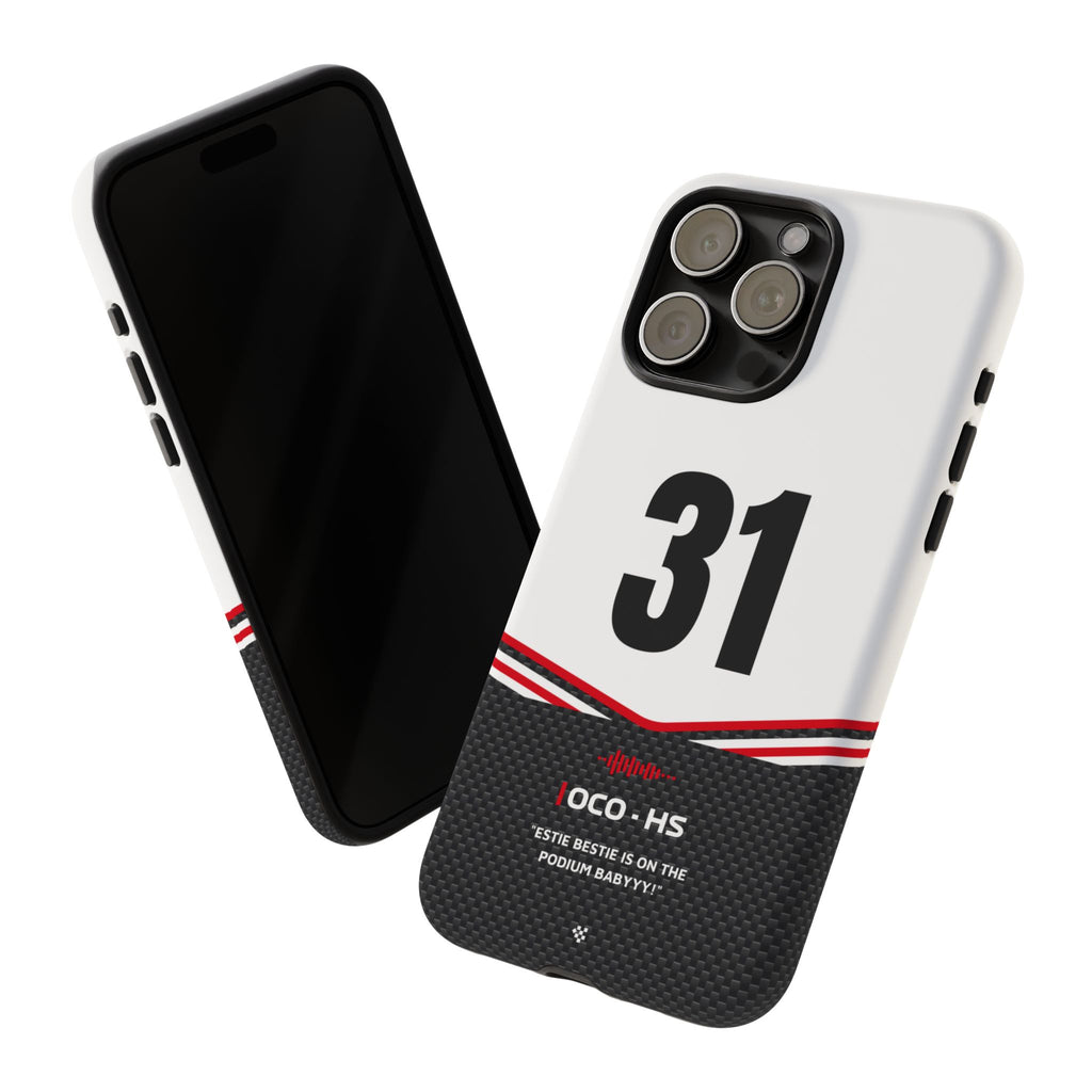 Support your favorite F1 driver with the exclusive Esteban Ocon F1 2025 Team Phone Case. It's the perfect accessory for every passionate Formula 1 and Ocon fan. Featuring Esteban's iconic #31 race number and the bold 2025 Haas team colors, this white phone case brings racing energy straight to your hand.