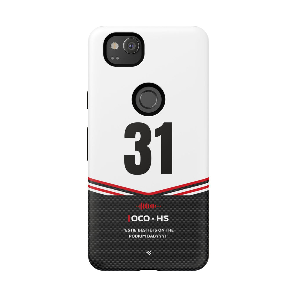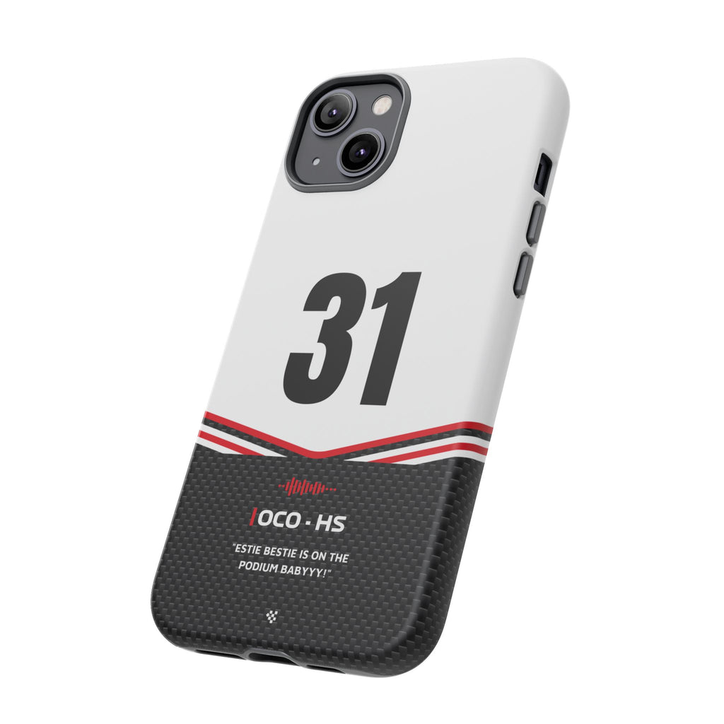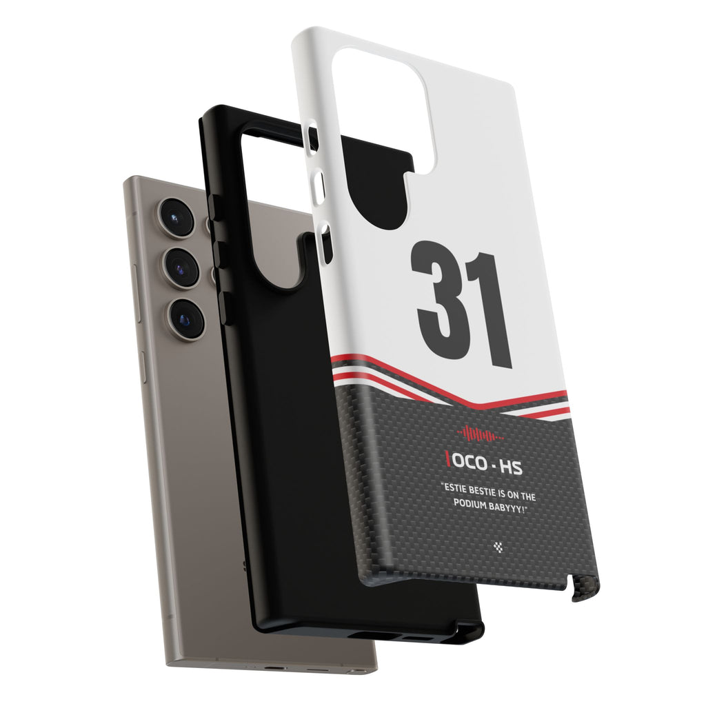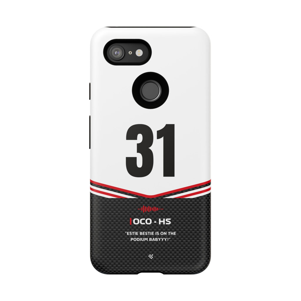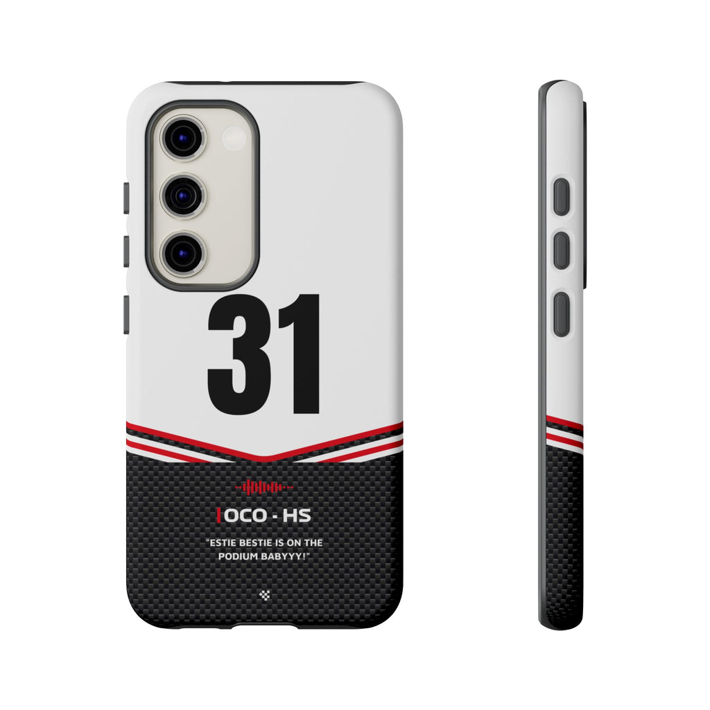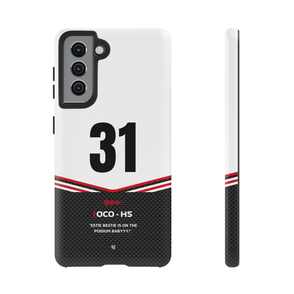 Support your favorite F1 driver with the exclusive Esteban Ocon F1 2025 Team Phone Case. It's the perfect accessory for every passionate Formula 1 and Ocon fan. Featuring Esteban's iconic #31 race number and the bold 2025 Haas team colors, this white phone case brings racing energy straight to your hand.