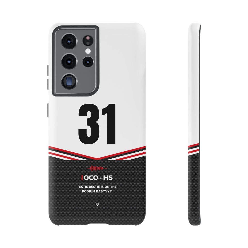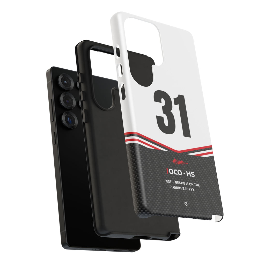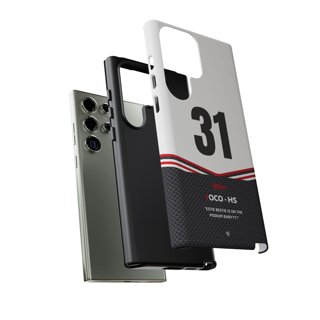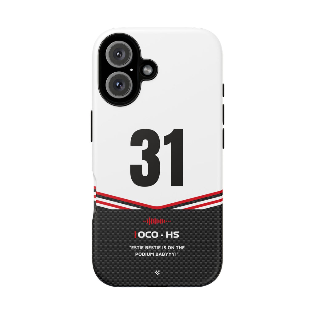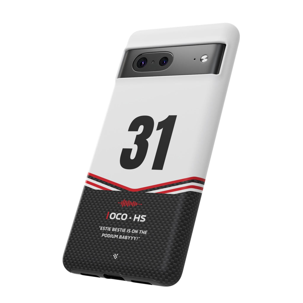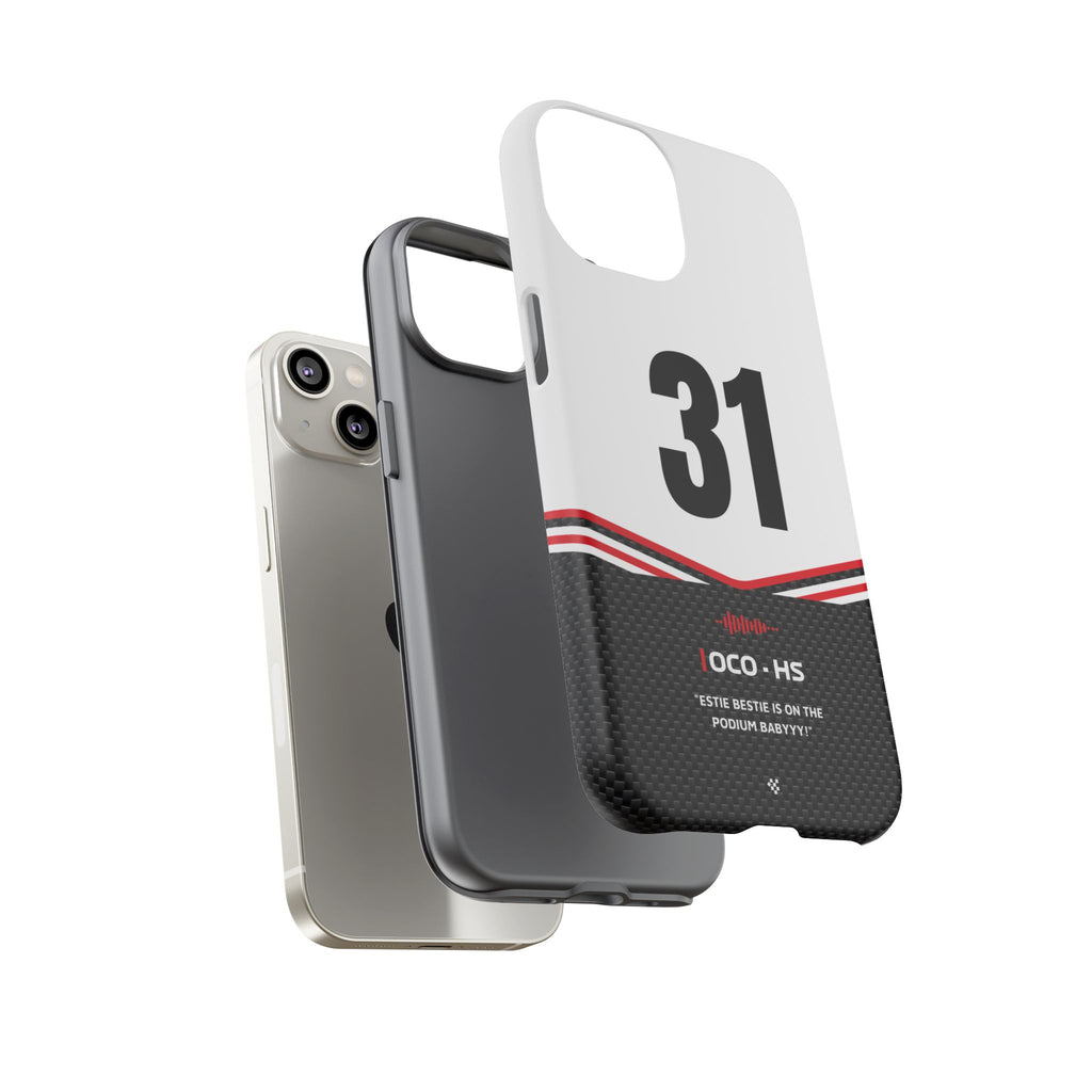 Support your favorite F1 driver with the exclusive Esteban Ocon F1 2025 Team Phone Case. It's the perfect accessory for every passionate Formula 1 and Ocon fan. Featuring Esteban's iconic #31 race number and the bold 2025 Haas team colors, this white phone case brings racing energy straight to your hand.