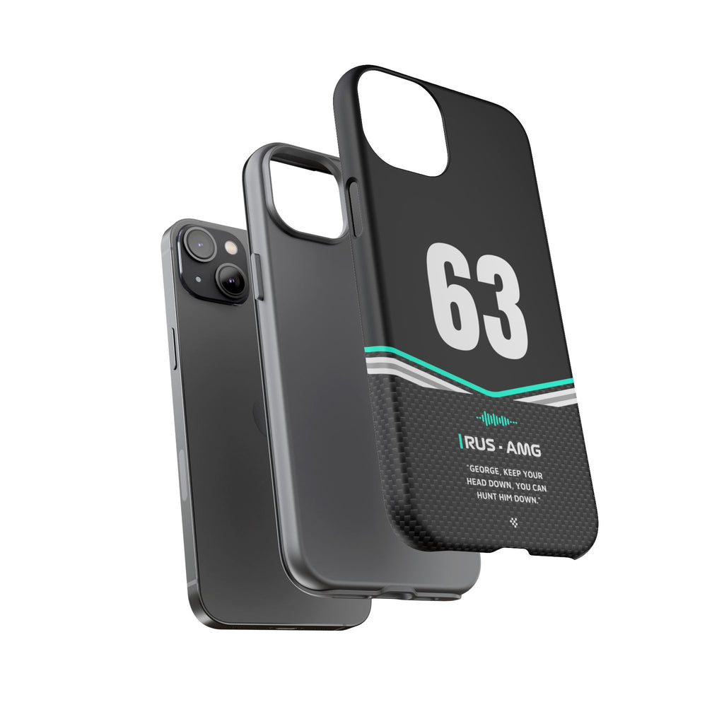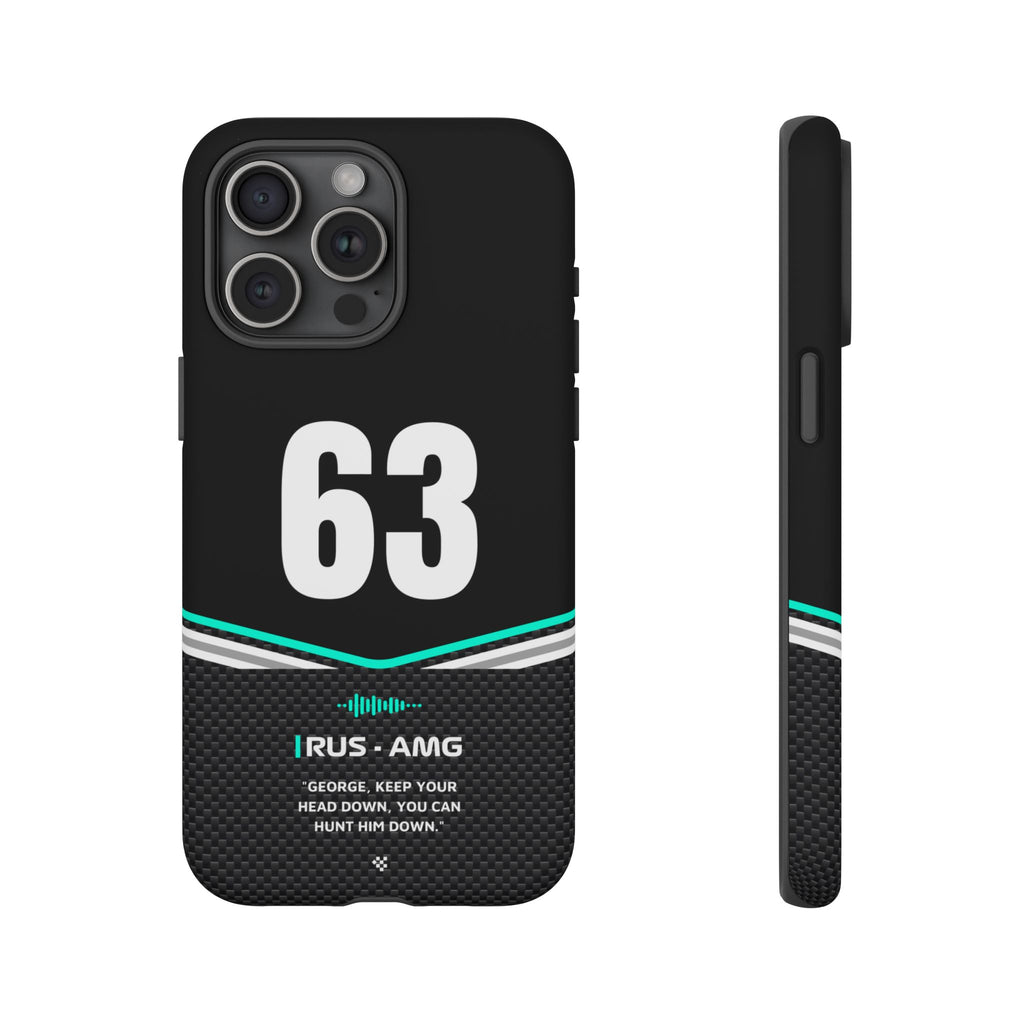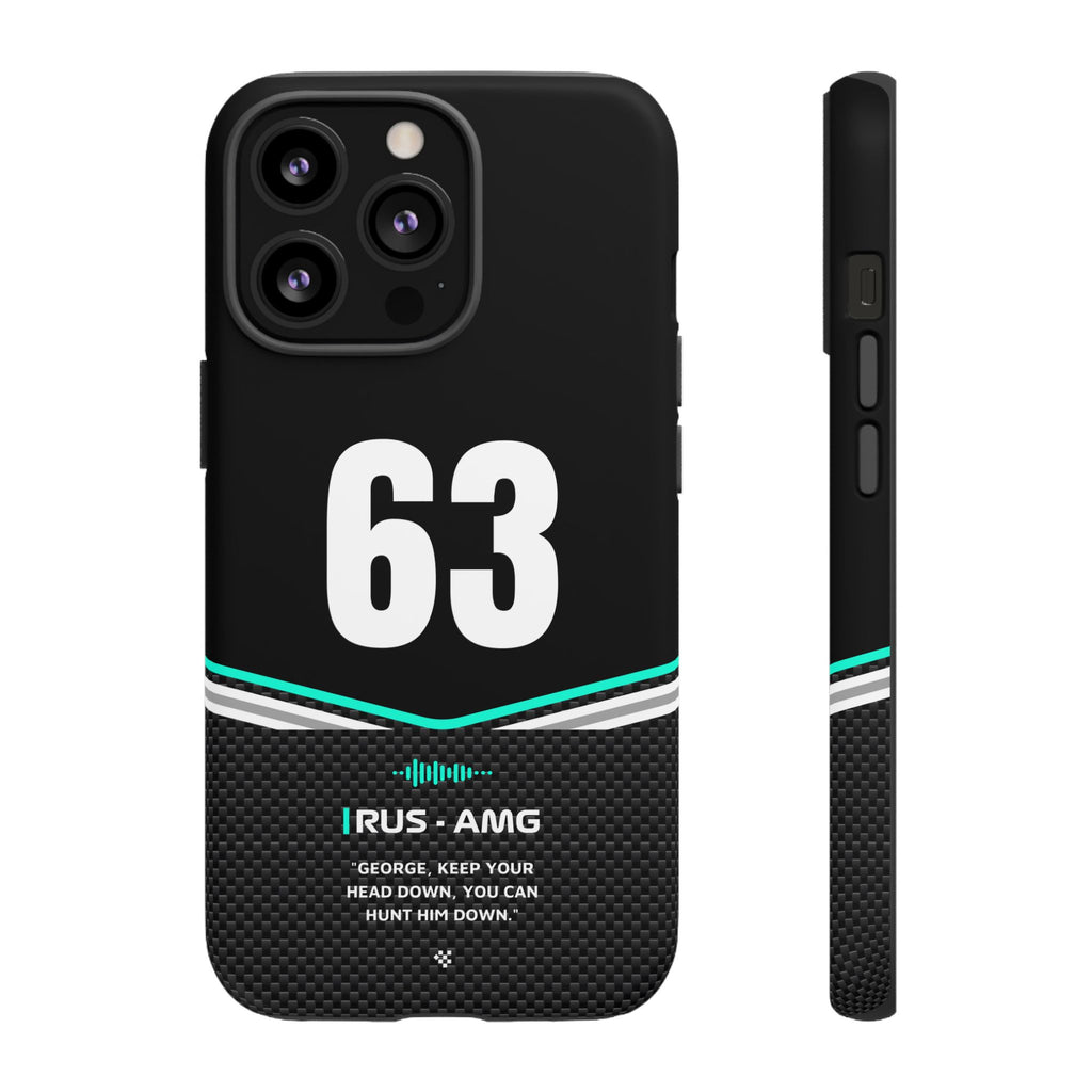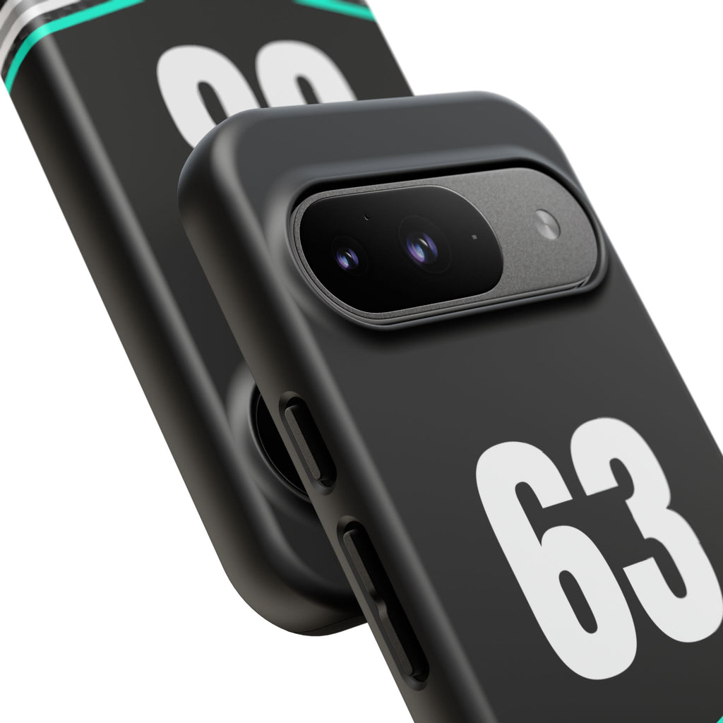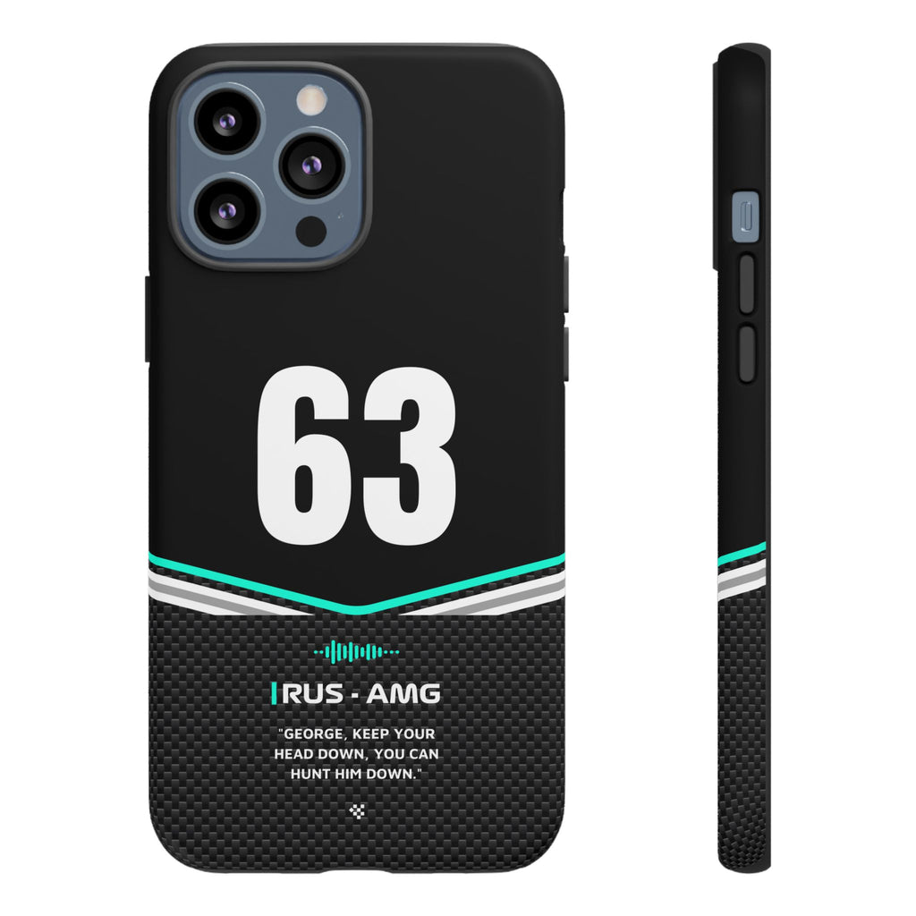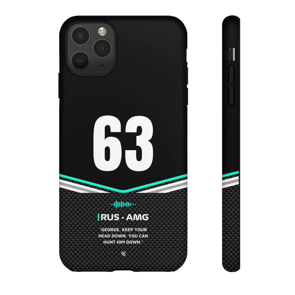 Support your favorite F1 driver with the exclusive George Russell F1 2025 Team Phone Case. It's the perfect accessory for every passionate Formula 1 and Russell fan. Featuring George's iconic #63 race number and the bold 2025 Mercedes-AMG Petronas team colors, this black phone case brings racing energy straight to your hand.