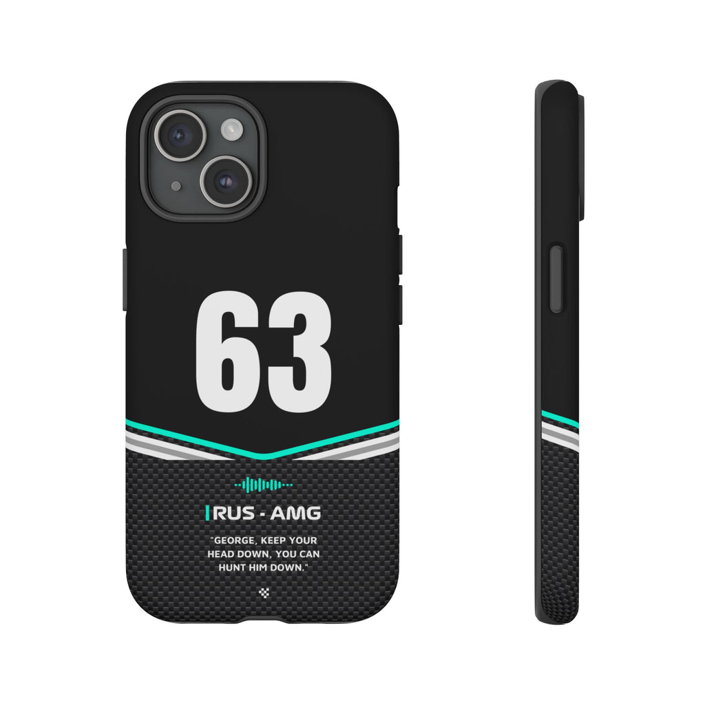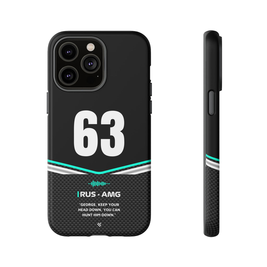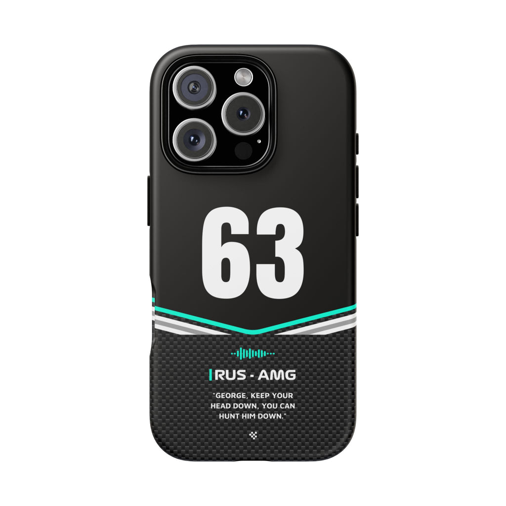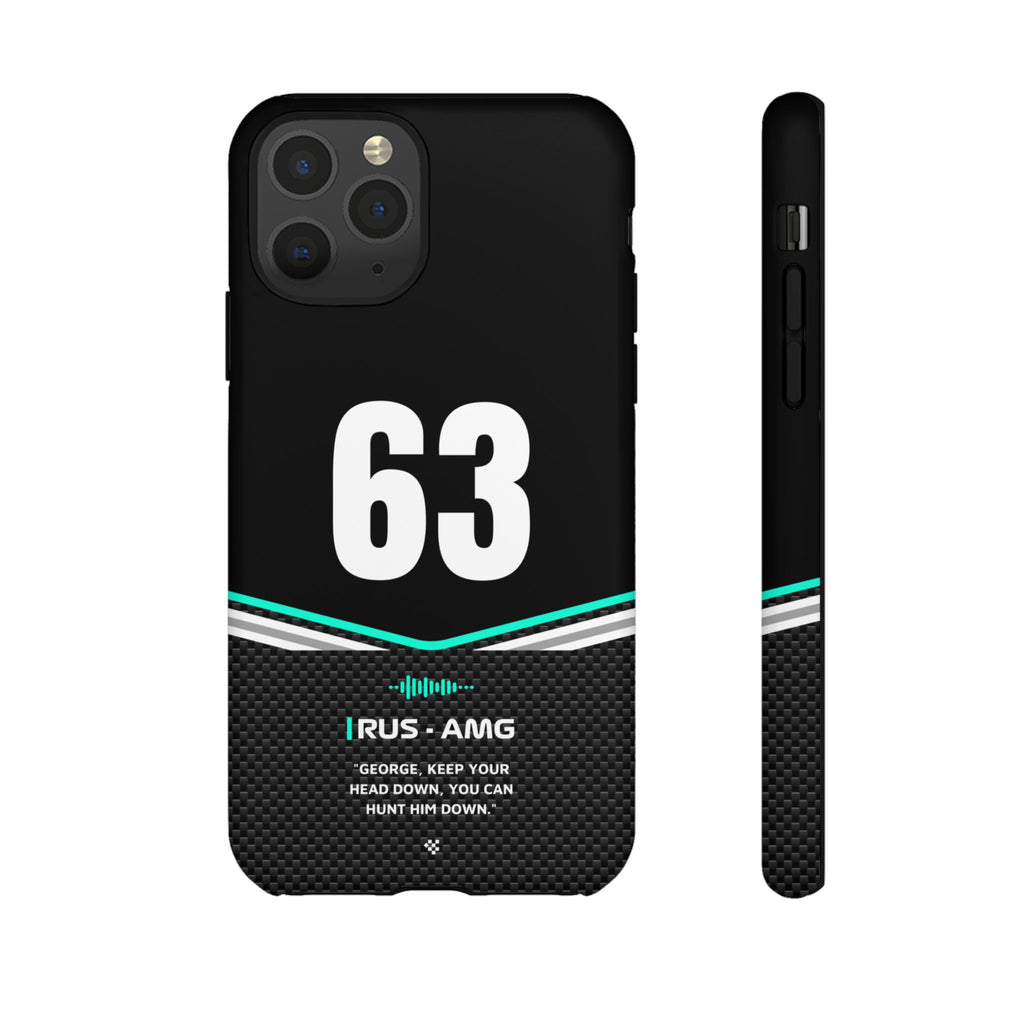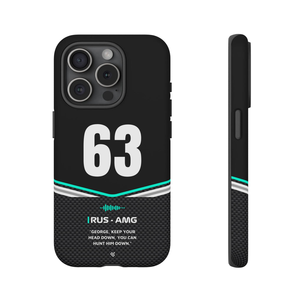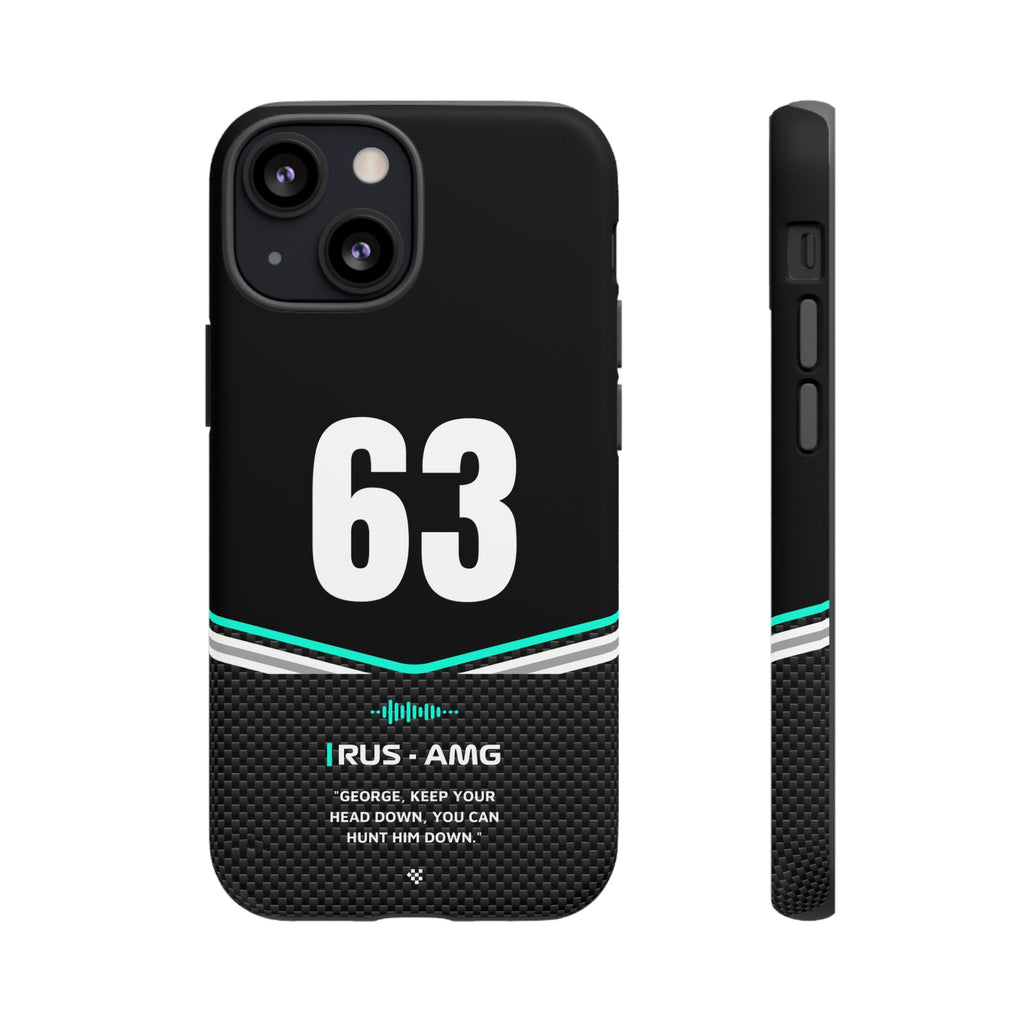 Support your favorite F1 driver with the exclusive George Russell F1 2025 Team Phone Case. It's the perfect accessory for every passionate Formula 1 and Russell fan. Featuring George's iconic #63 race number and the bold 2025 Mercedes-AMG Petronas team colors, this black phone case brings racing energy straight to your hand.
