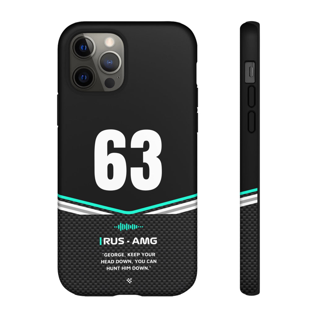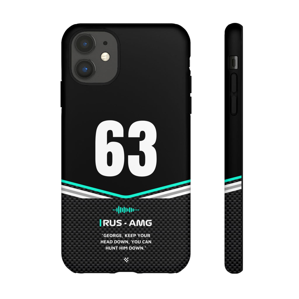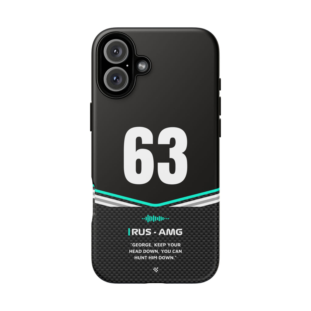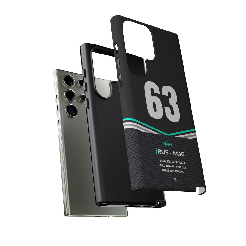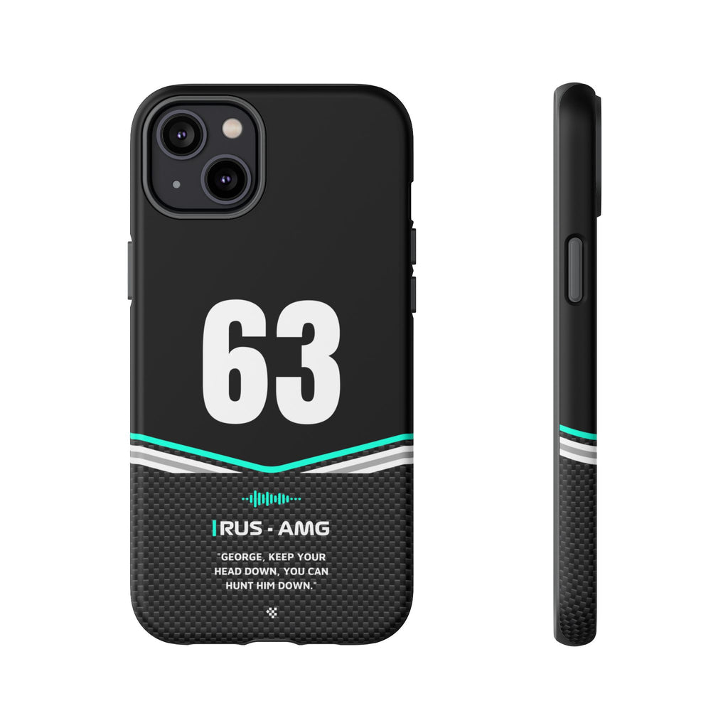 Support your favorite F1 driver with the exclusive George Russell F1 2025 Team Phone Case. It's the perfect accessory for every passionate Formula 1 and Russell fan. Featuring George's iconic #63 race number and the bold 2025 Mercedes-AMG Petronas team colors, this black phone case brings racing energy straight to your hand.