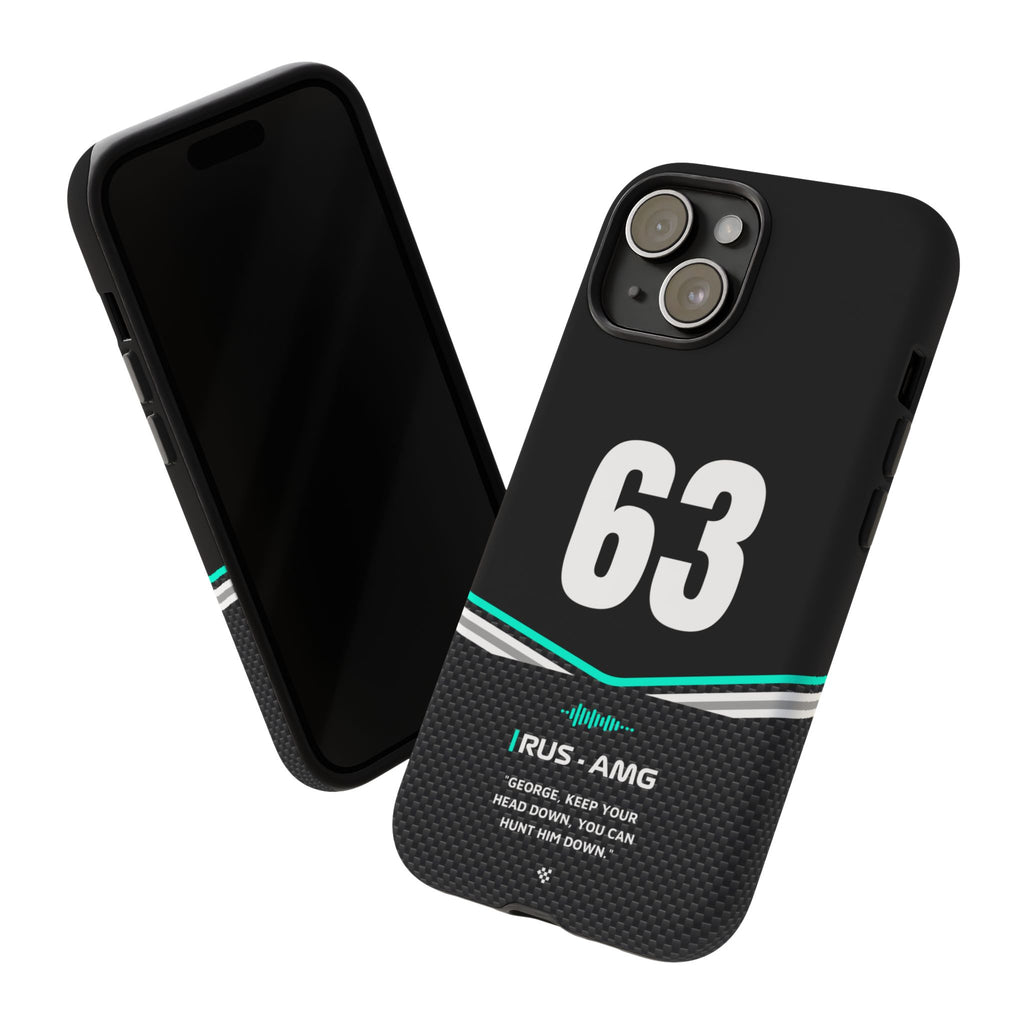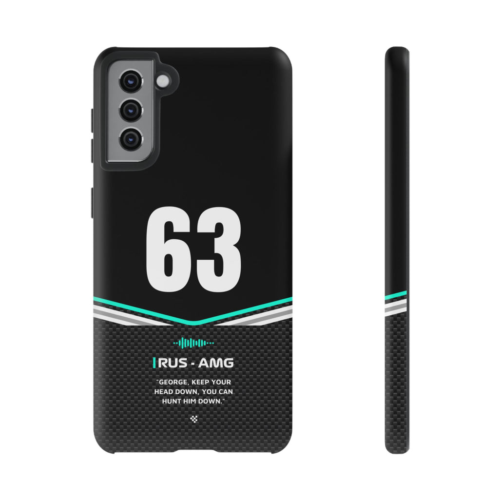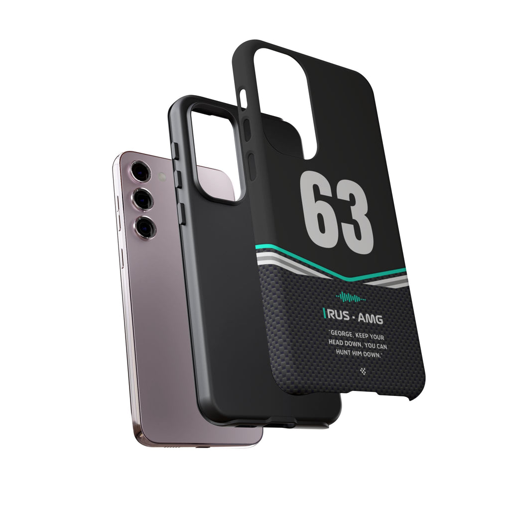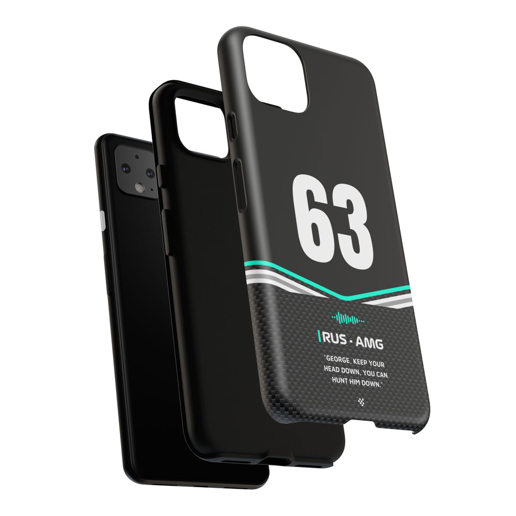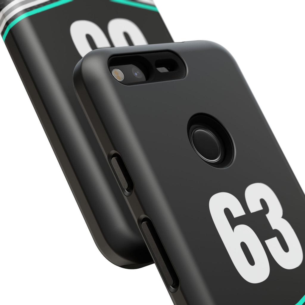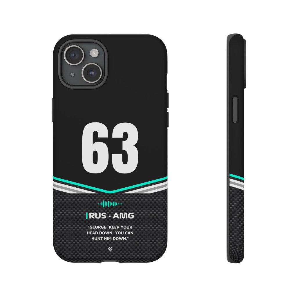 Support your favorite F1 driver with the exclusive George Russell F1 2025 Team Phone Case. It's the perfect accessory for every passionate Formula 1 and Russell fan. Featuring George's iconic #63 race number and the bold 2025 Mercedes-AMG Petronas team colors, this black phone case brings racing energy straight to your hand.