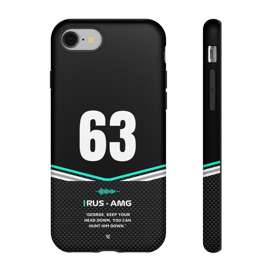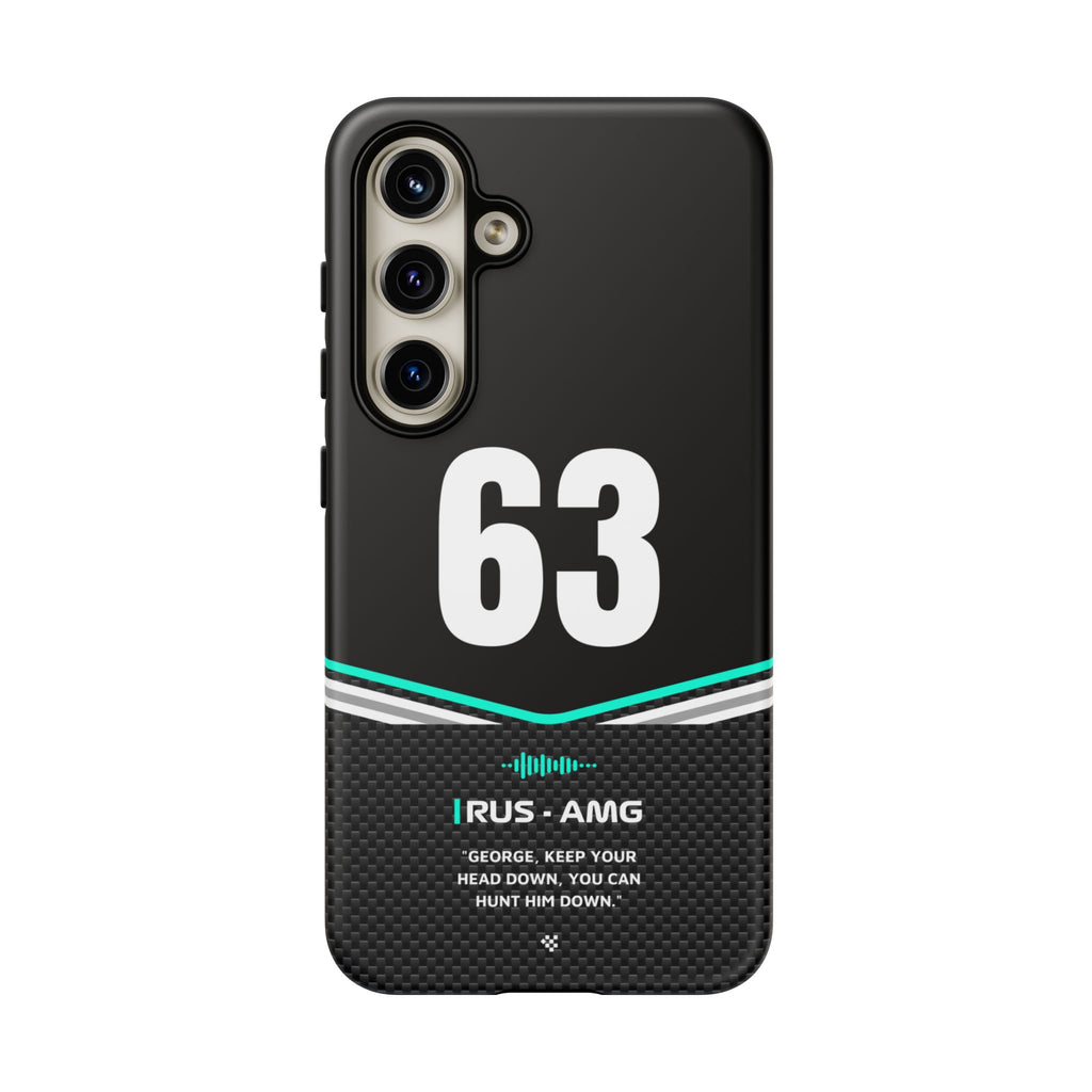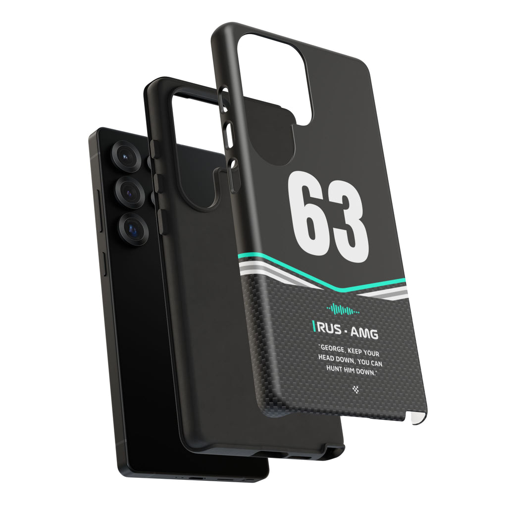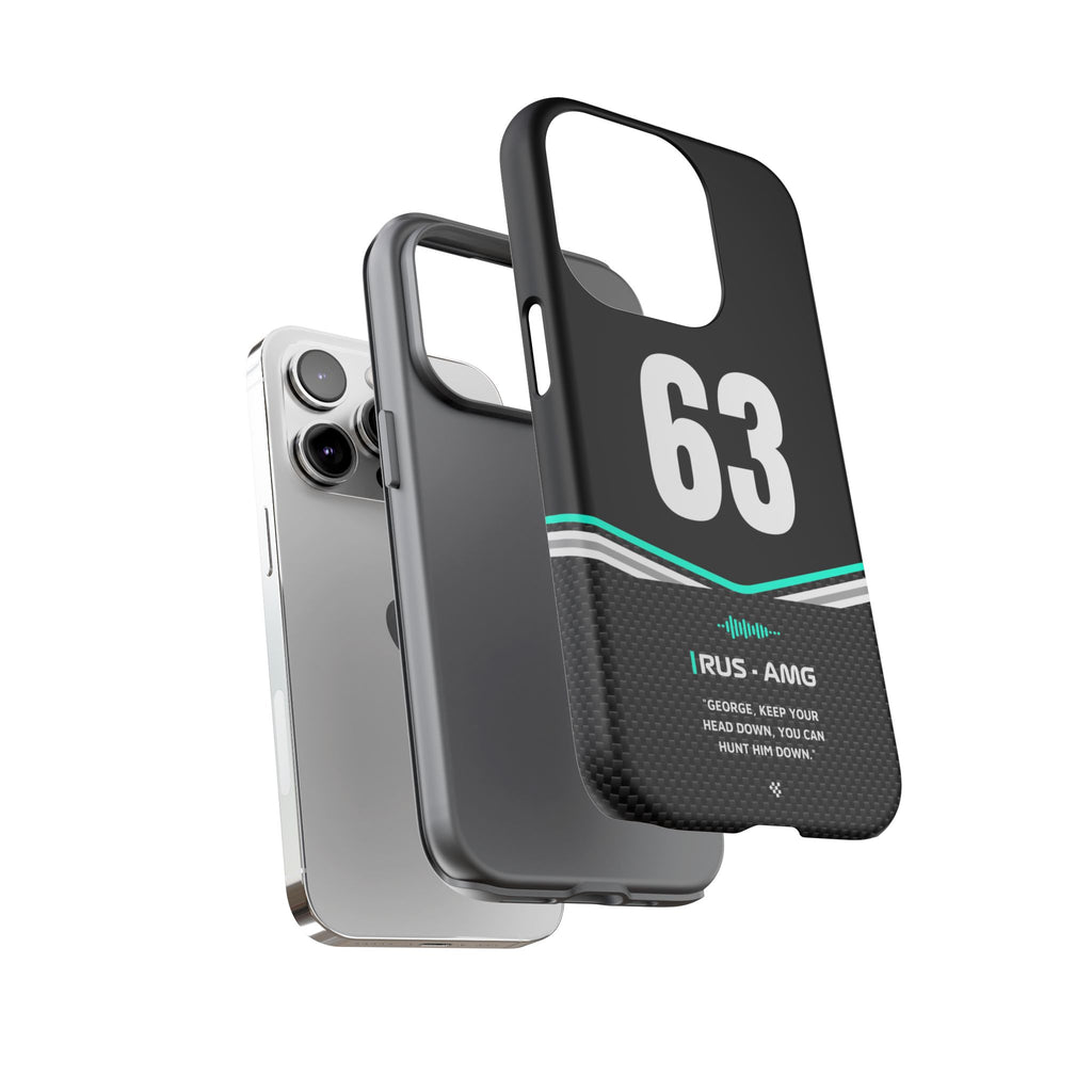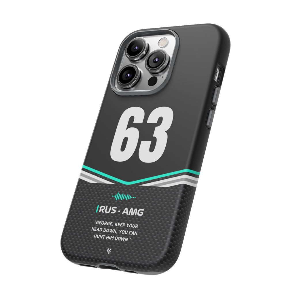 Support your favorite F1 driver with the exclusive George Russell F1 2025 Team Phone Case. It's the perfect accessory for every passionate Formula 1 and Russell fan. Featuring George's iconic #63 race number and the bold 2025 Mercedes-AMG Petronas team colors, this black phone case brings racing energy straight to your hand.