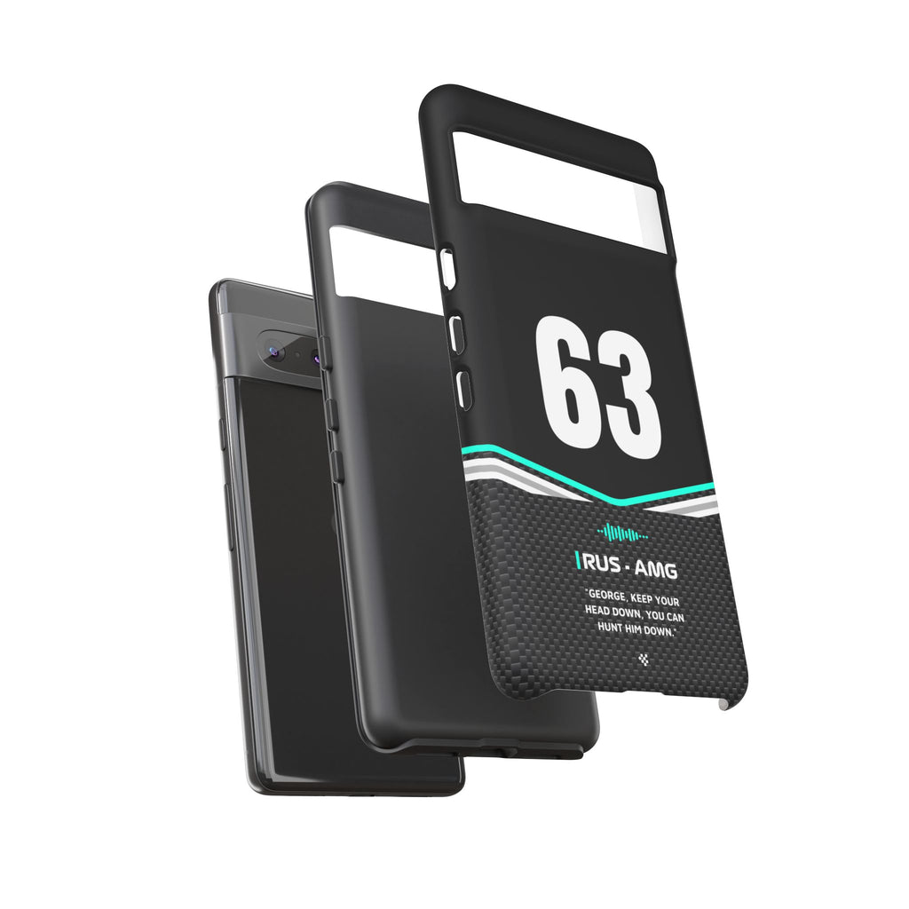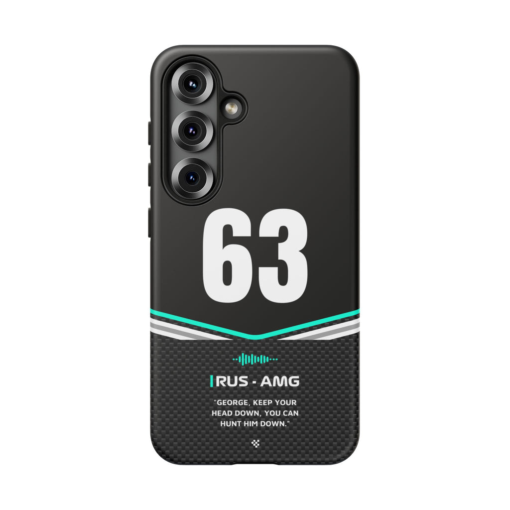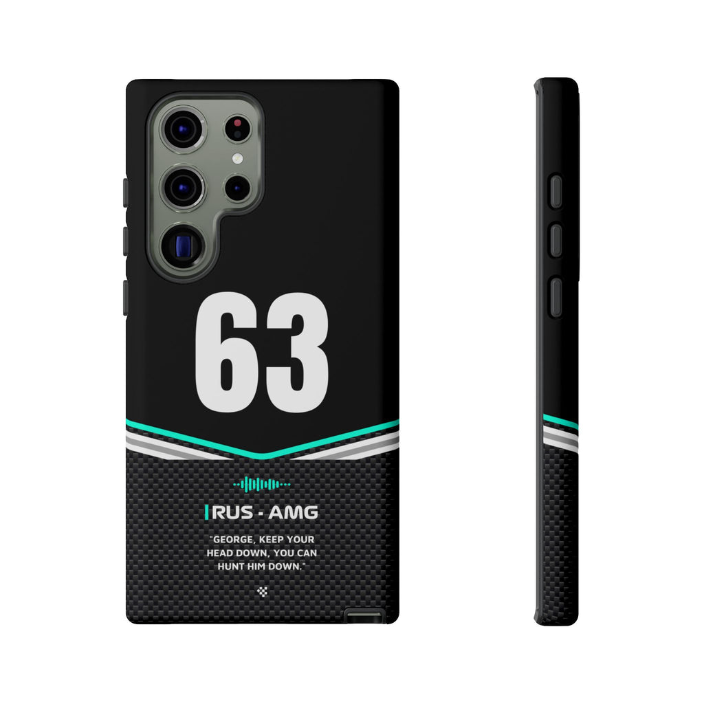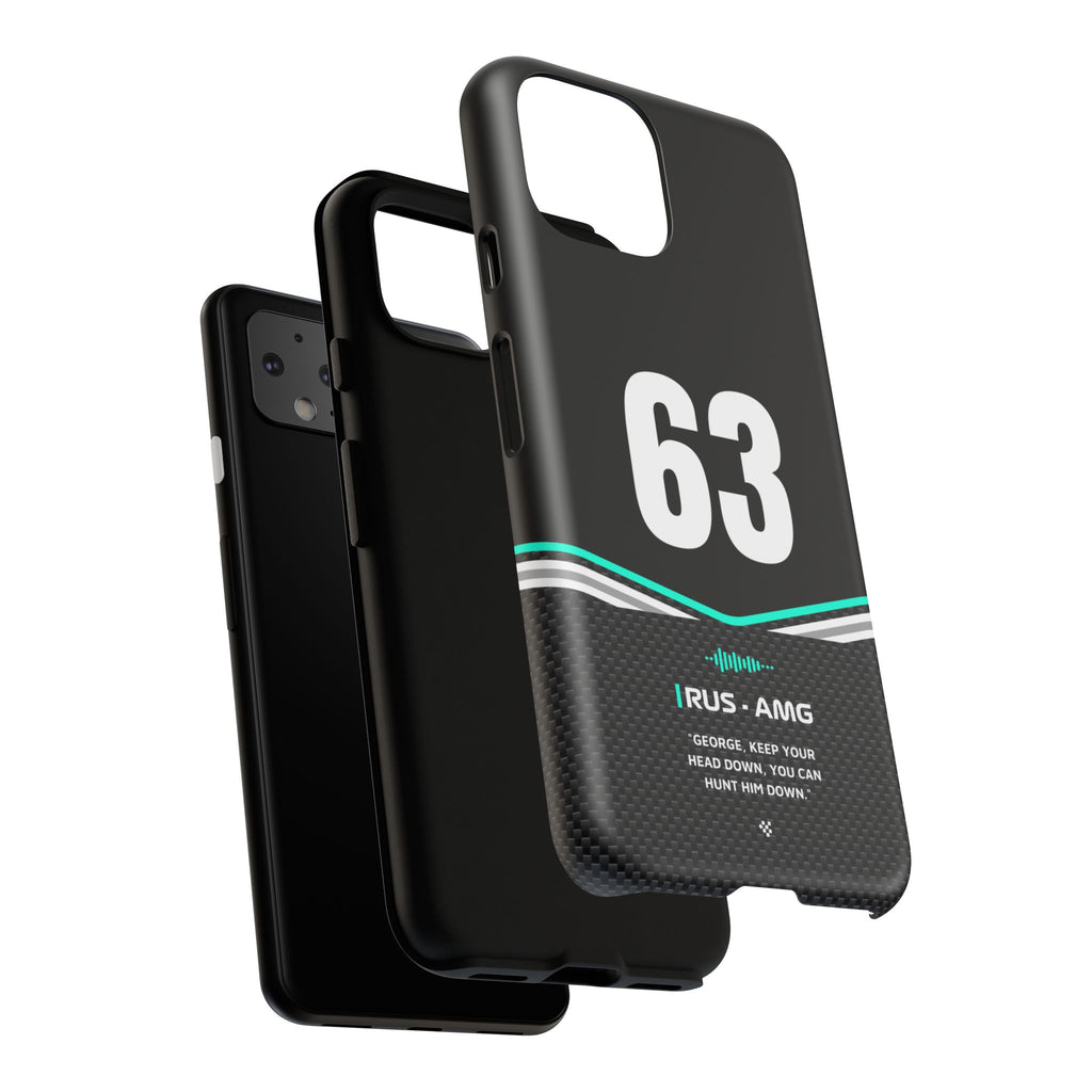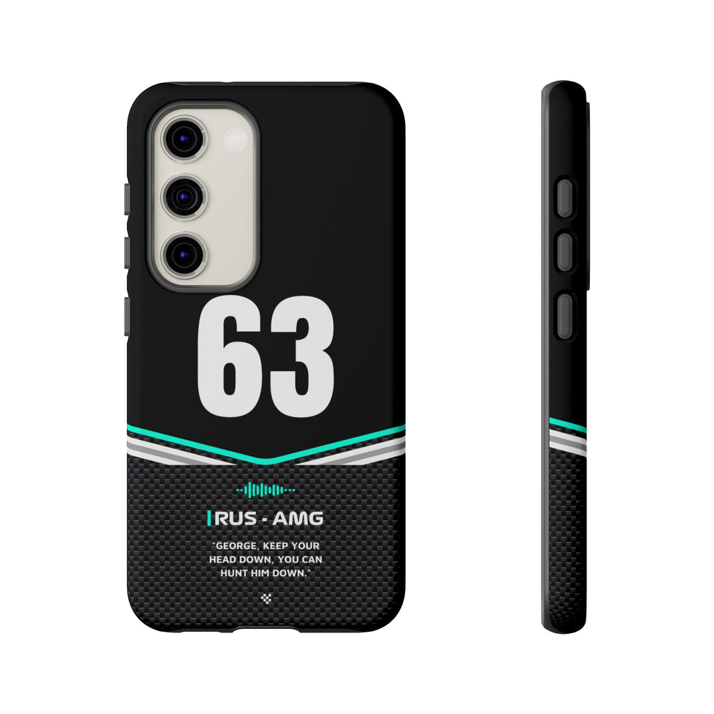 Support your favorite F1 driver with the exclusive George Russell F1 2025 Team Phone Case. It's the perfect accessory for every passionate Formula 1 and Russell fan. Featuring George's iconic #63 race number and the bold 2025 Mercedes-AMG Petronas team colors, this black phone case brings racing energy straight to your hand.