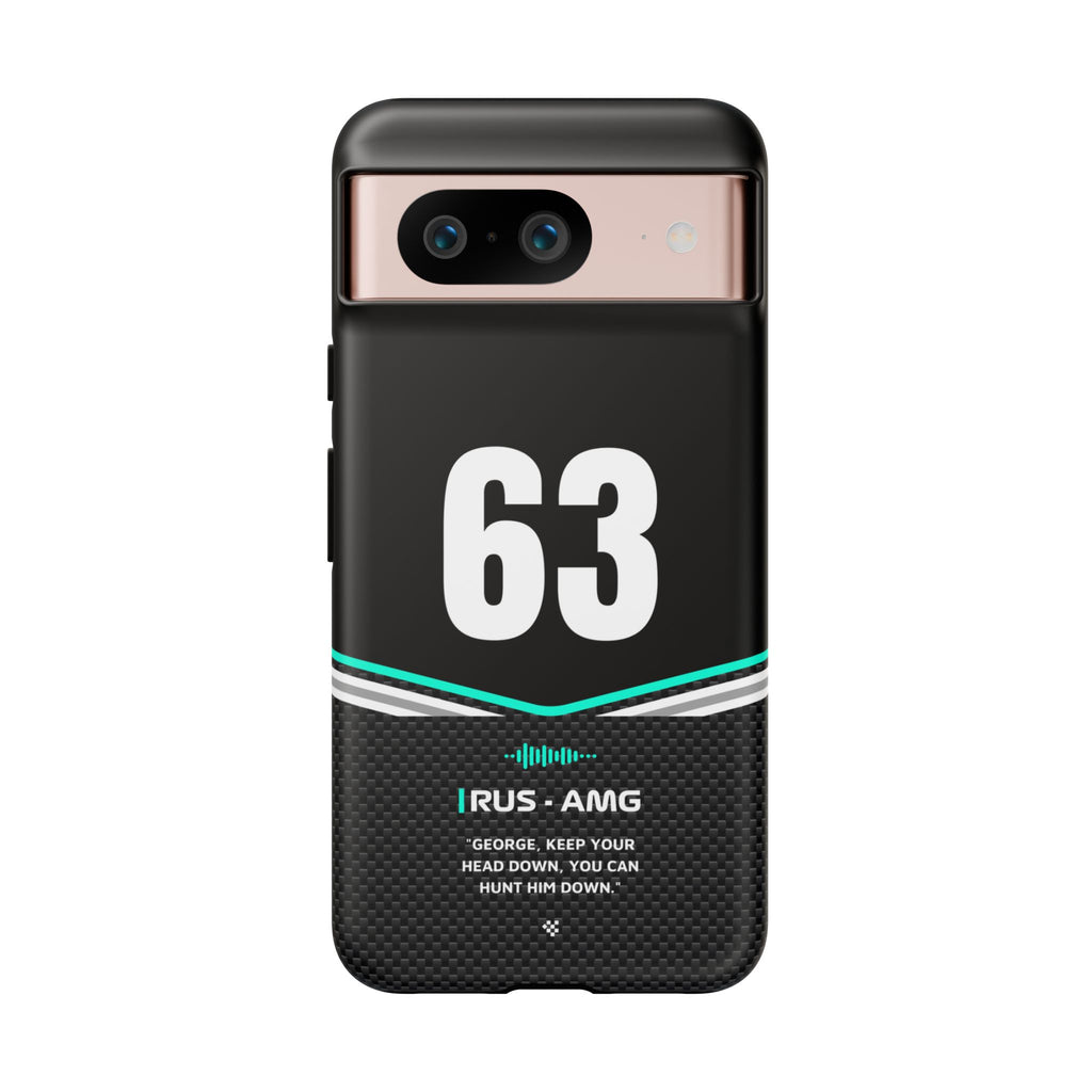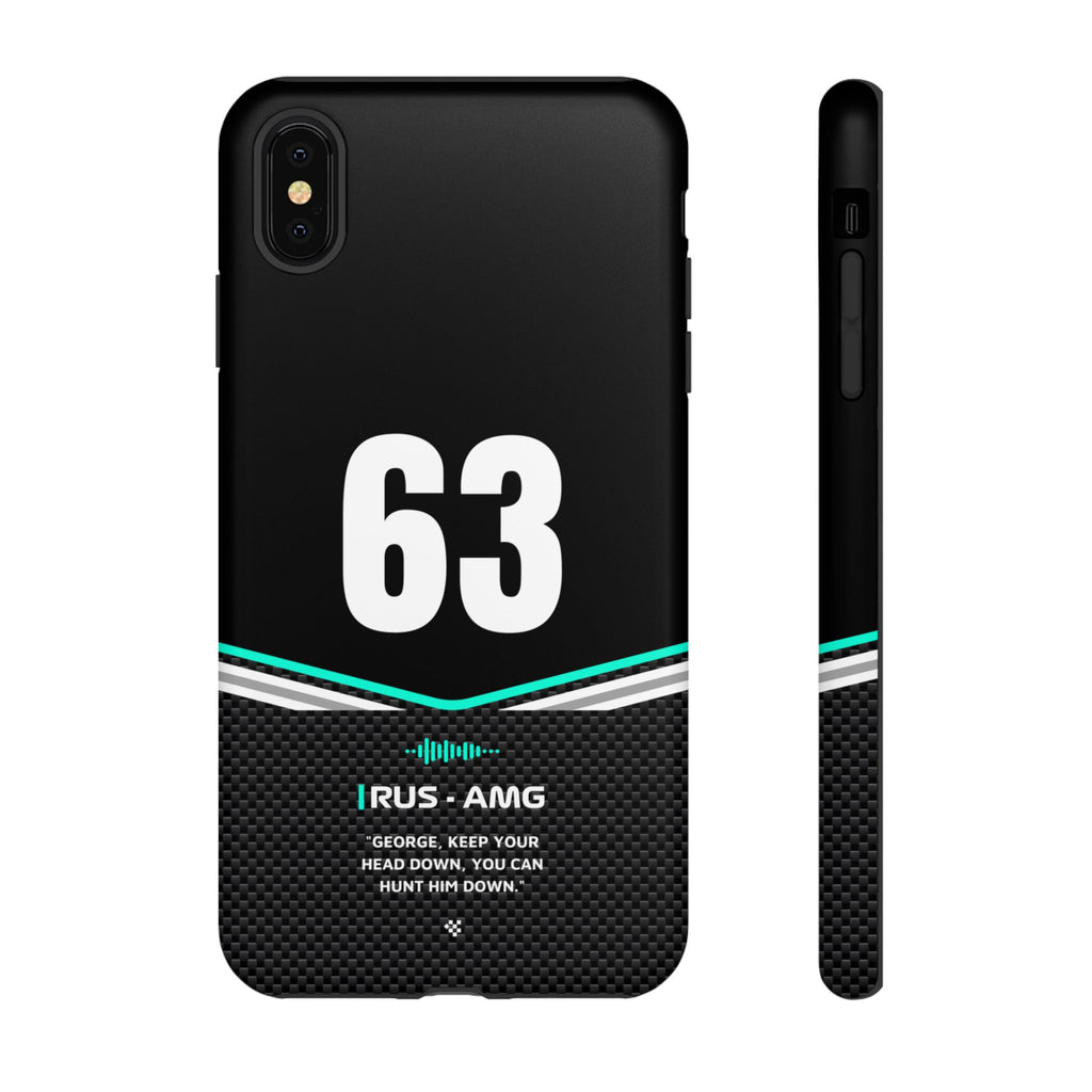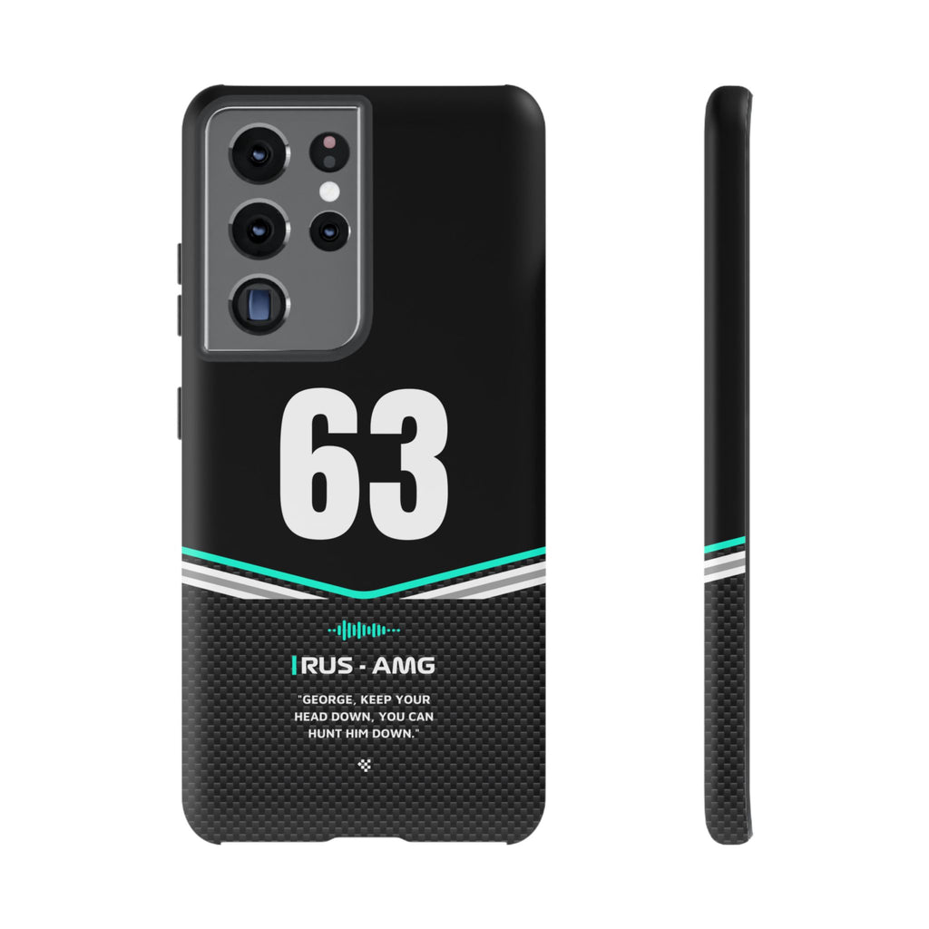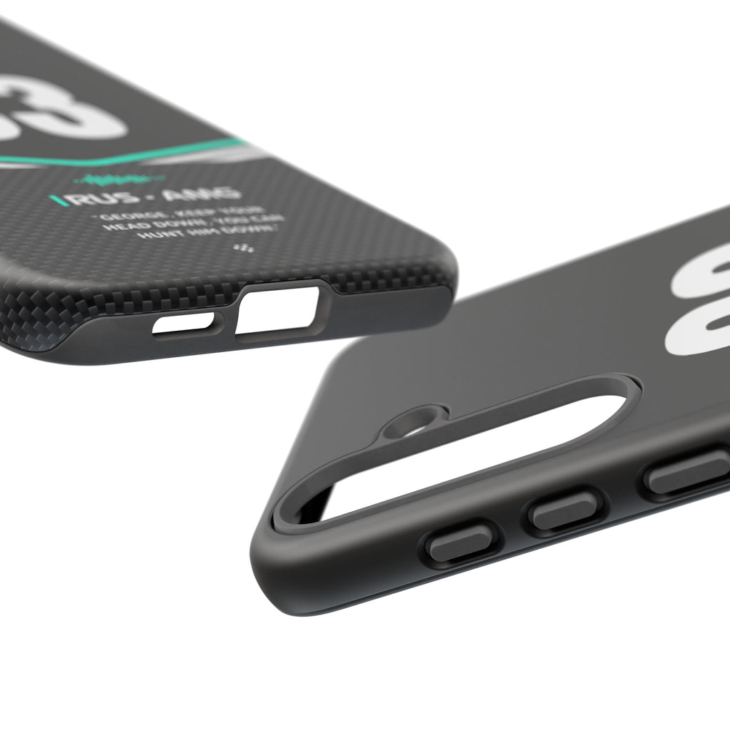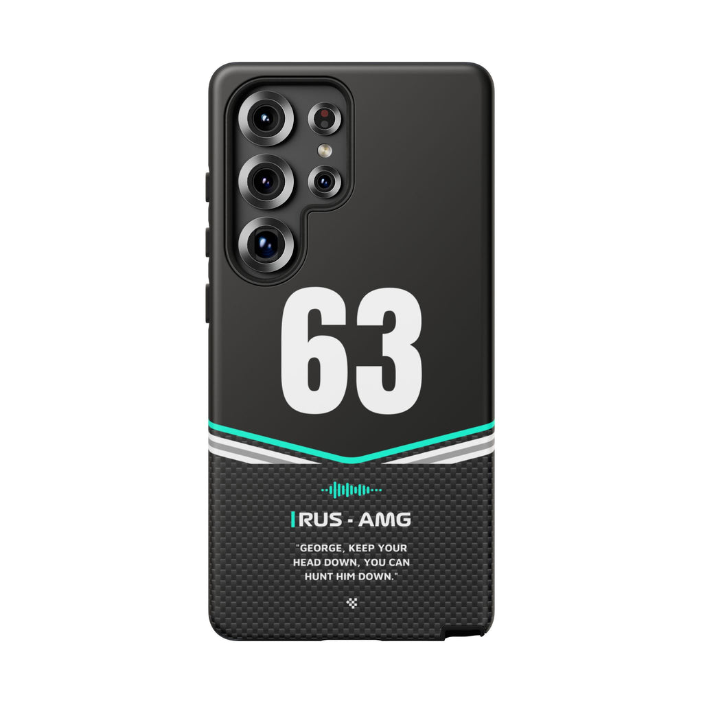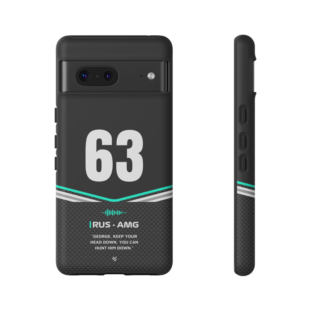 Support your favorite F1 driver with the exclusive George Russell F1 2025 Team Phone Case. It's the perfect accessory for every passionate Formula 1 and Russell fan. Featuring George's iconic #63 race number and the bold 2025 Mercedes-AMG Petronas team colors, this black phone case brings racing energy straight to your hand.