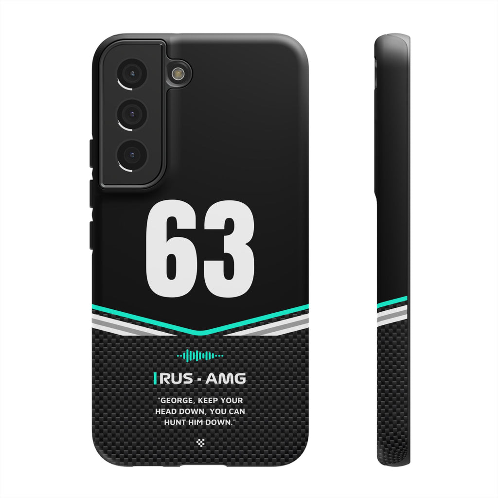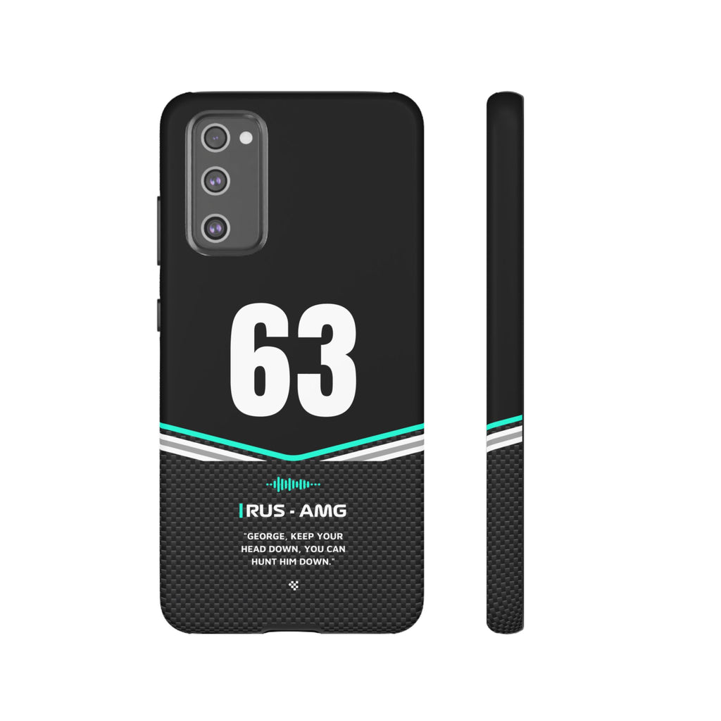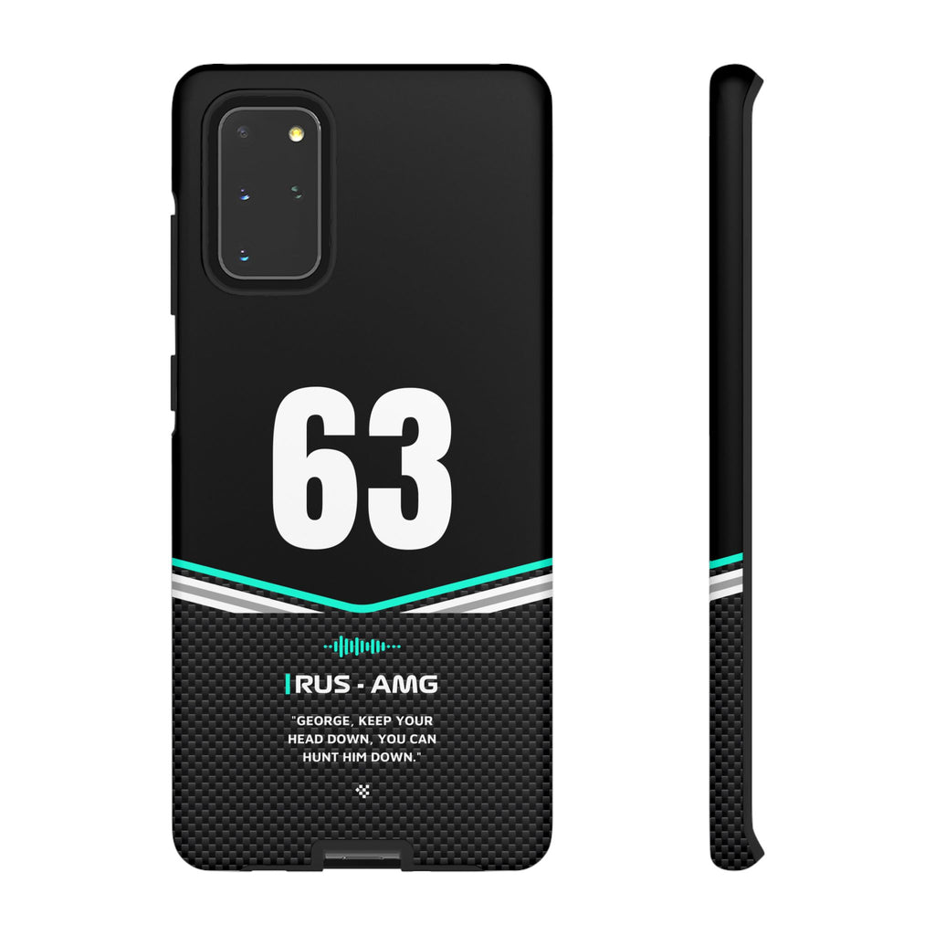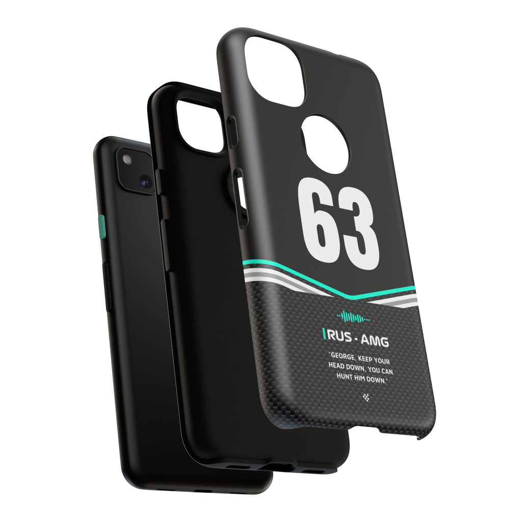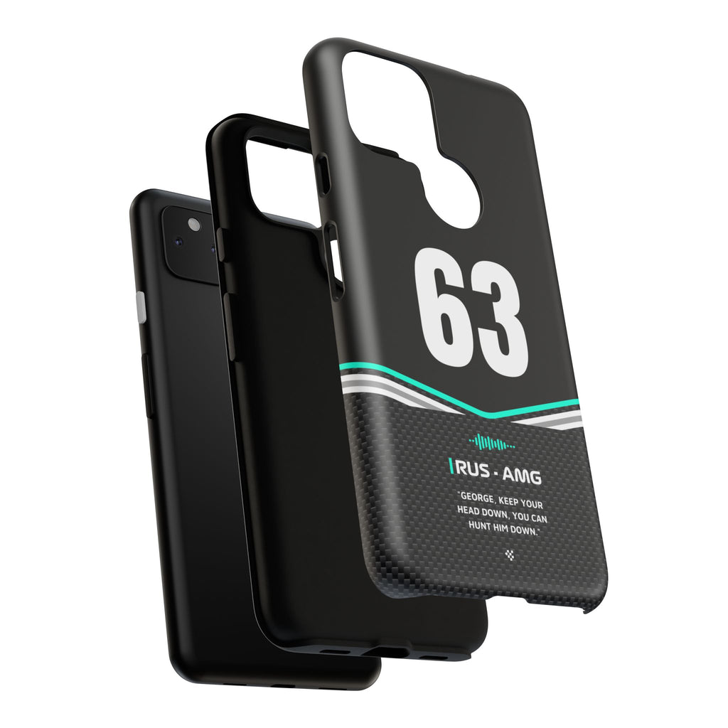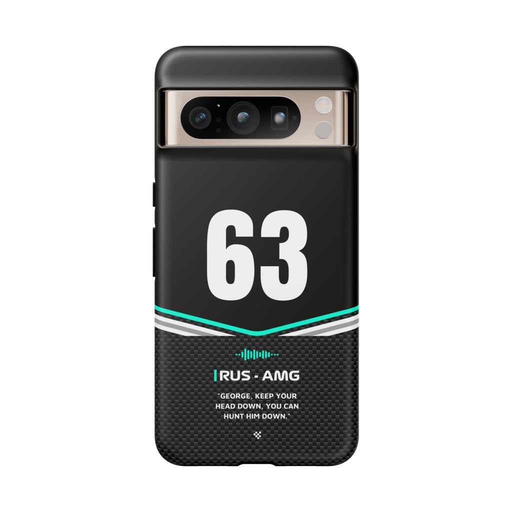 Support your favorite F1 driver with the exclusive George Russell F1 2025 Team Phone Case. It's the perfect accessory for every passionate Formula 1 and Russell fan. Featuring George's iconic #63 race number and the bold 2025 Mercedes-AMG Petronas team colors, this black phone case brings racing energy straight to your hand.