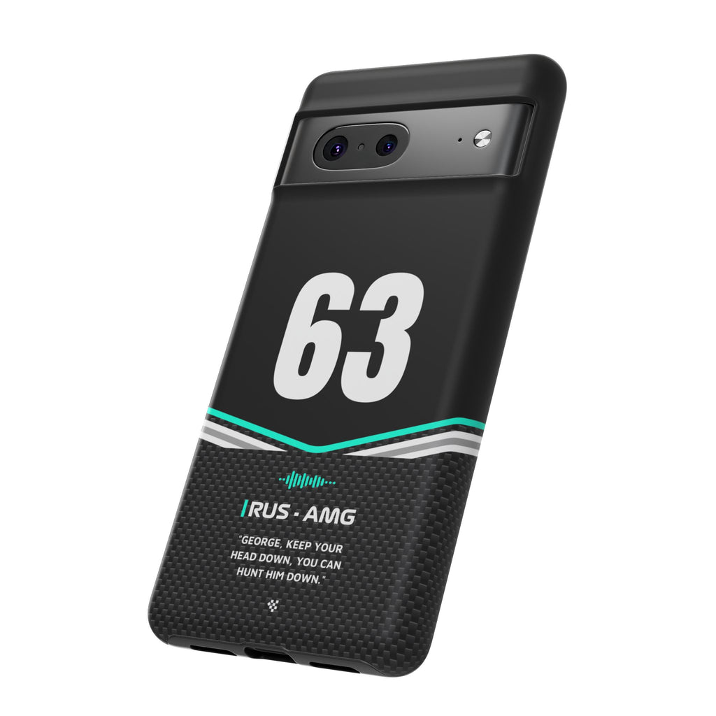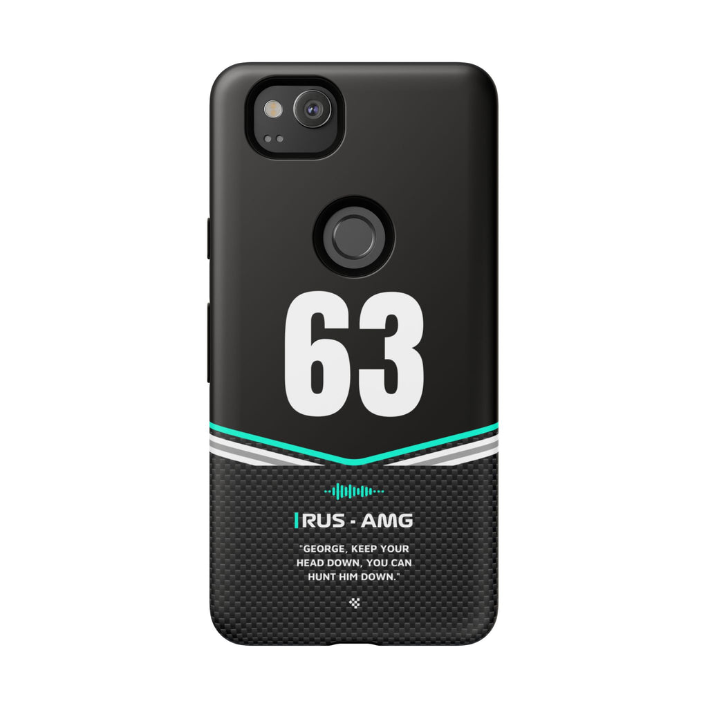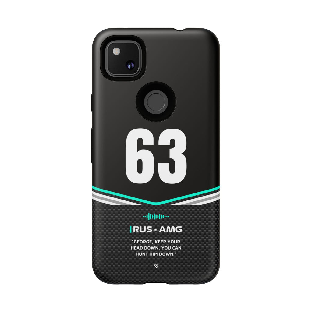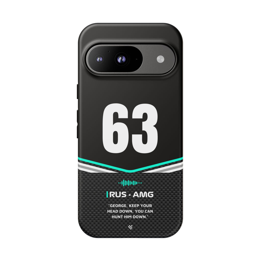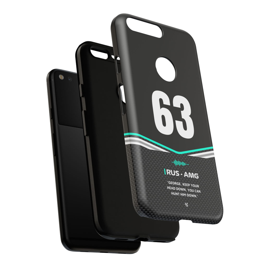 Support your favorite F1 driver with the exclusive George Russell F1 2025 Team Phone Case. It's the perfect accessory for every passionate Formula 1 and Russell fan. Featuring George's iconic #63 race number and the bold 2025 Mercedes-AMG Petronas team colors, this black phone case brings racing energy straight to your hand.
