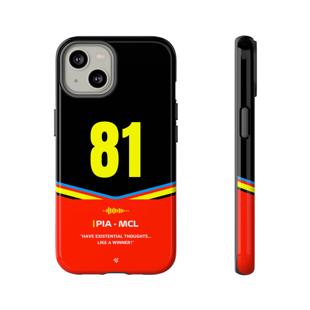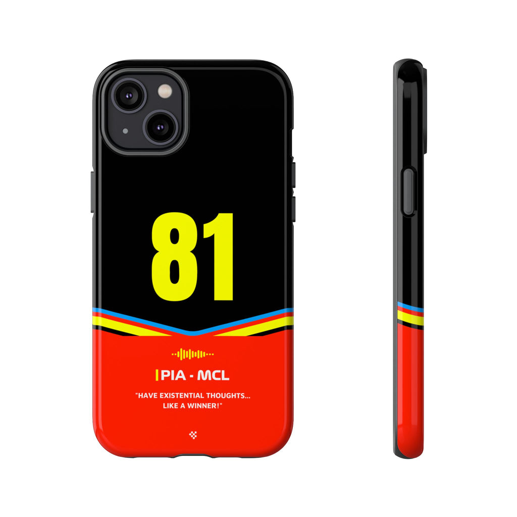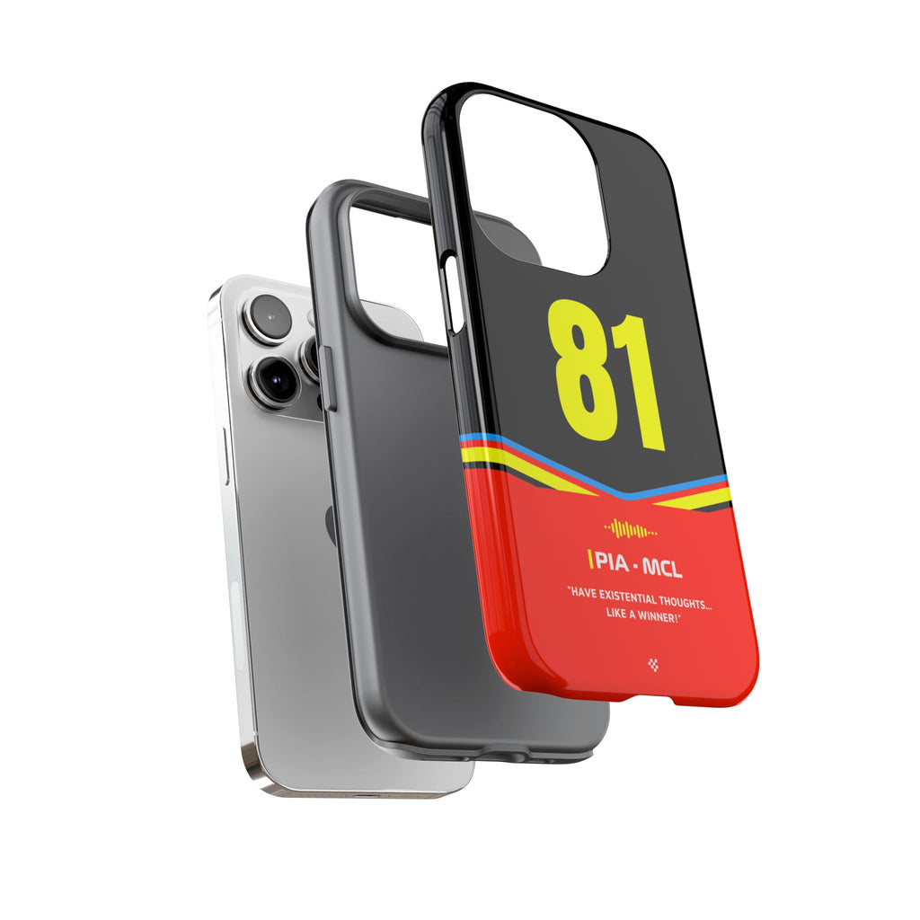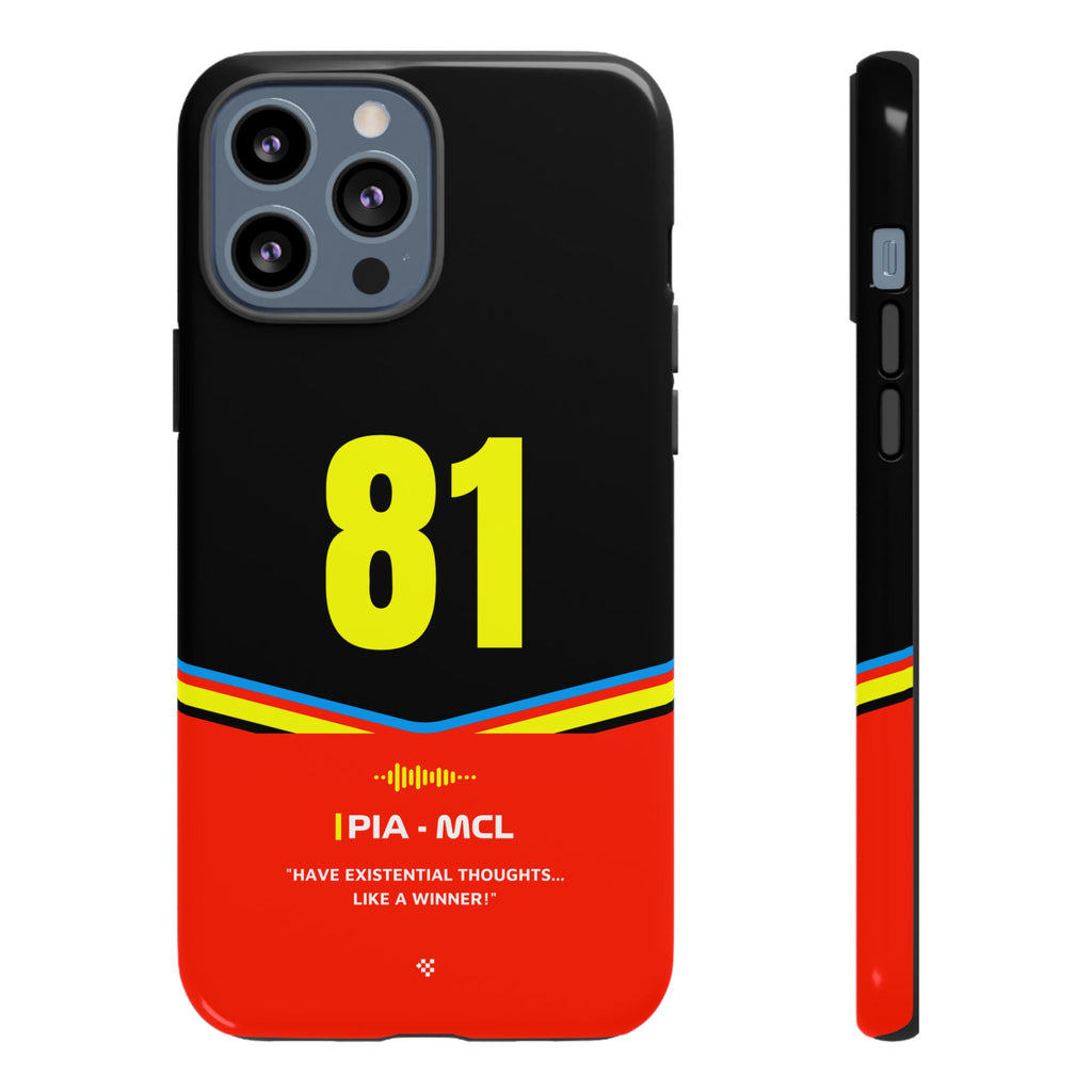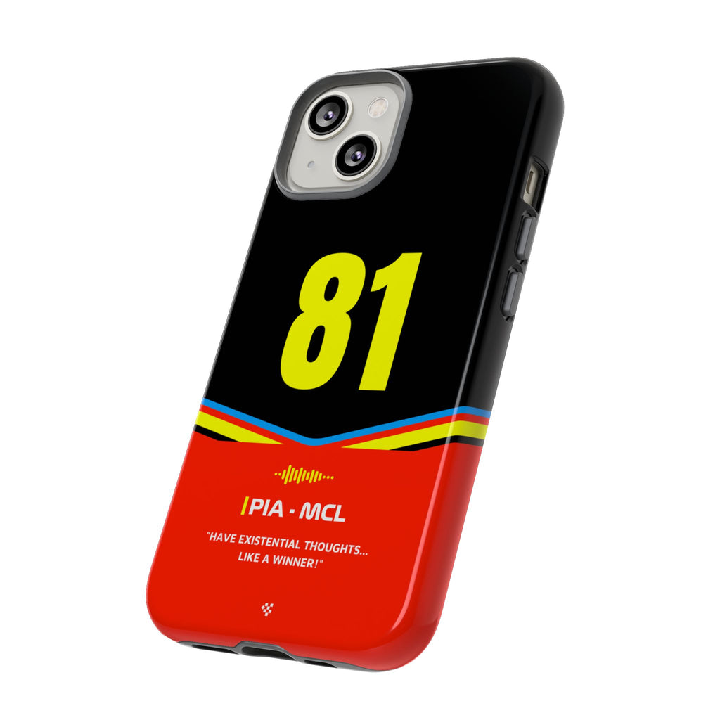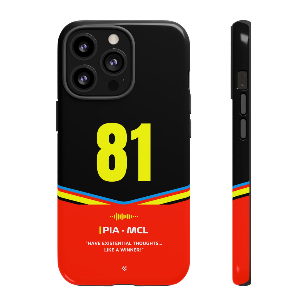 Support your favorite F1 driver with the exclusive Oscar Piastri F1 2025 Helmet Phone Case. It's the perfect accessory for every passionate Formula 1 and Piastri fan. Featuring Oscar's iconic #81 race number and his bold 2025 helmet colors, this black phone case brings racing energy straight to your hand.