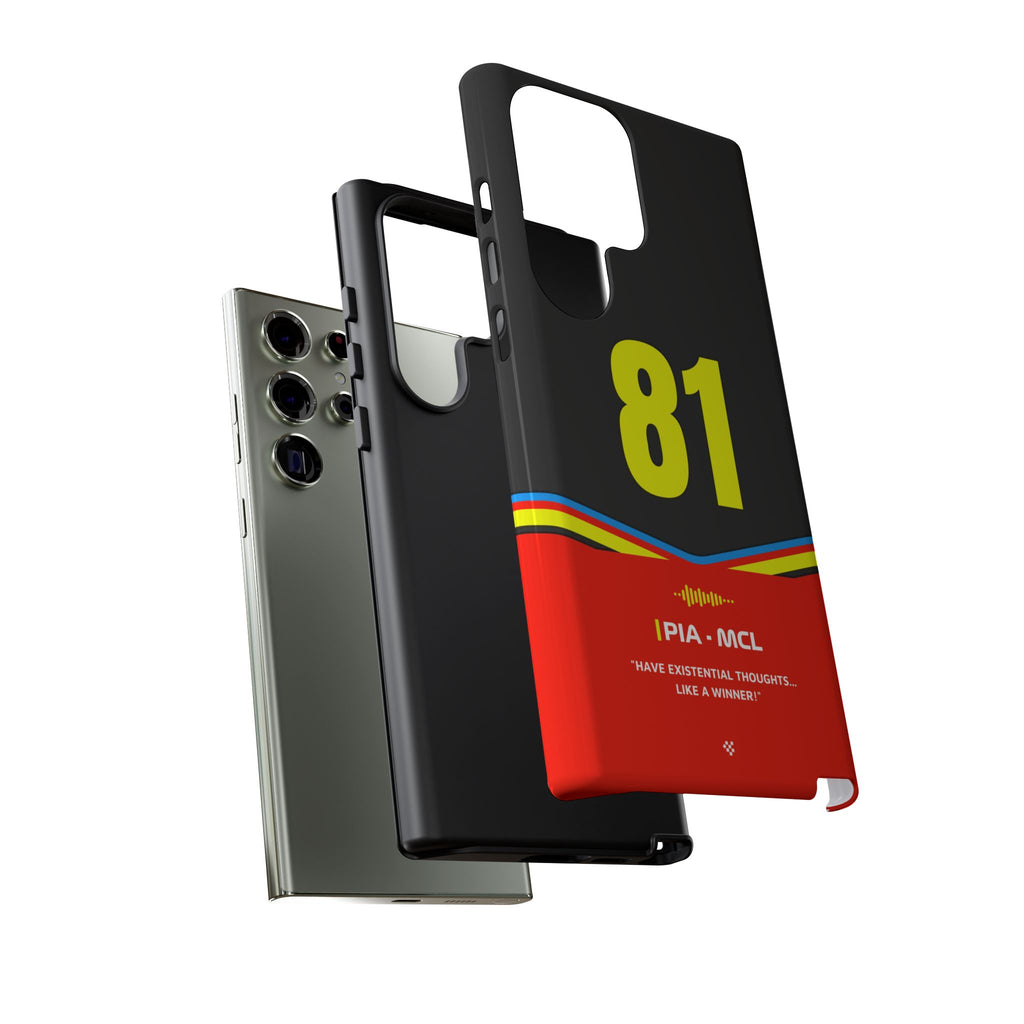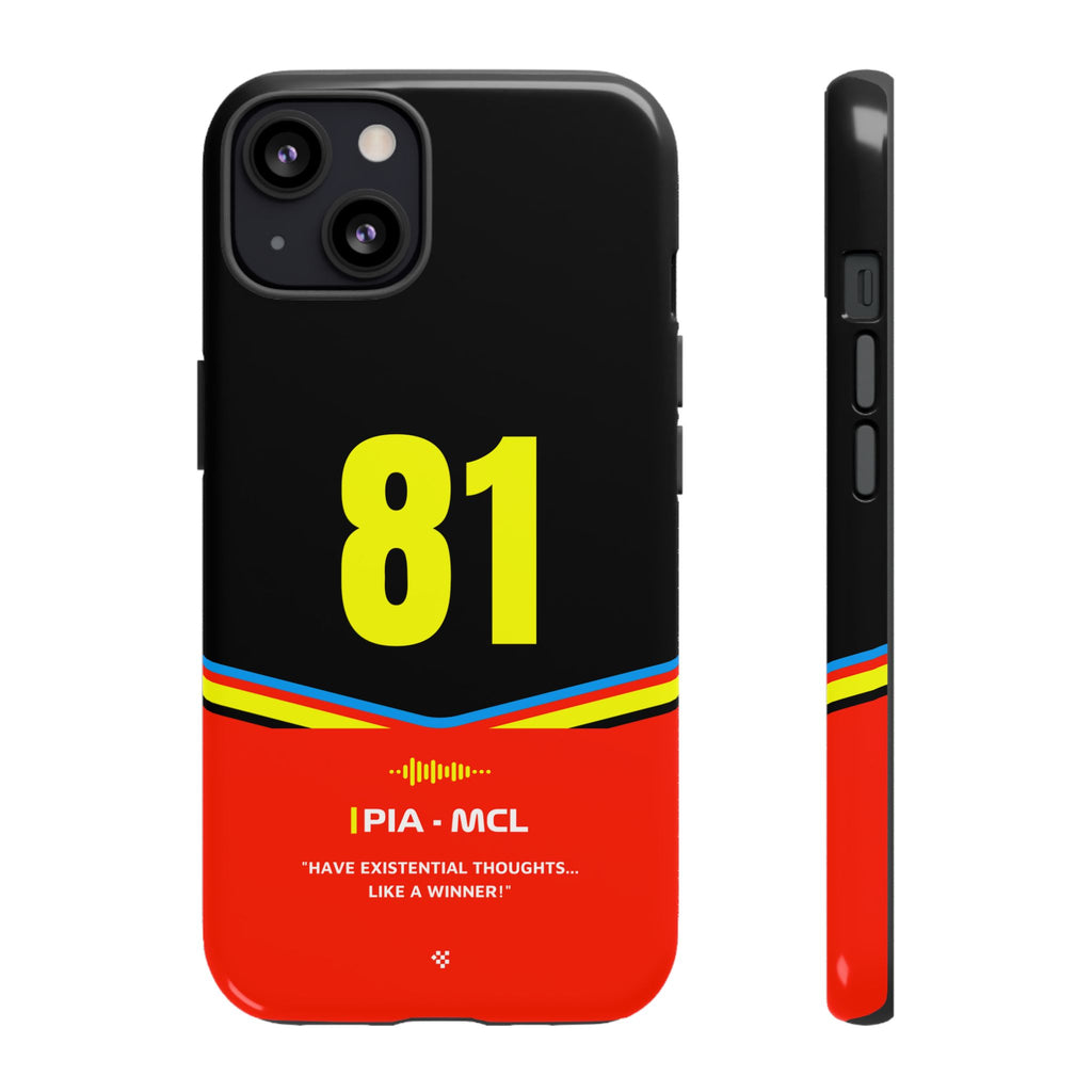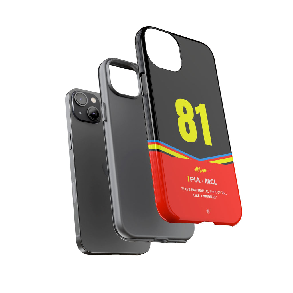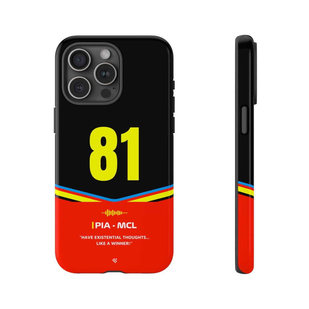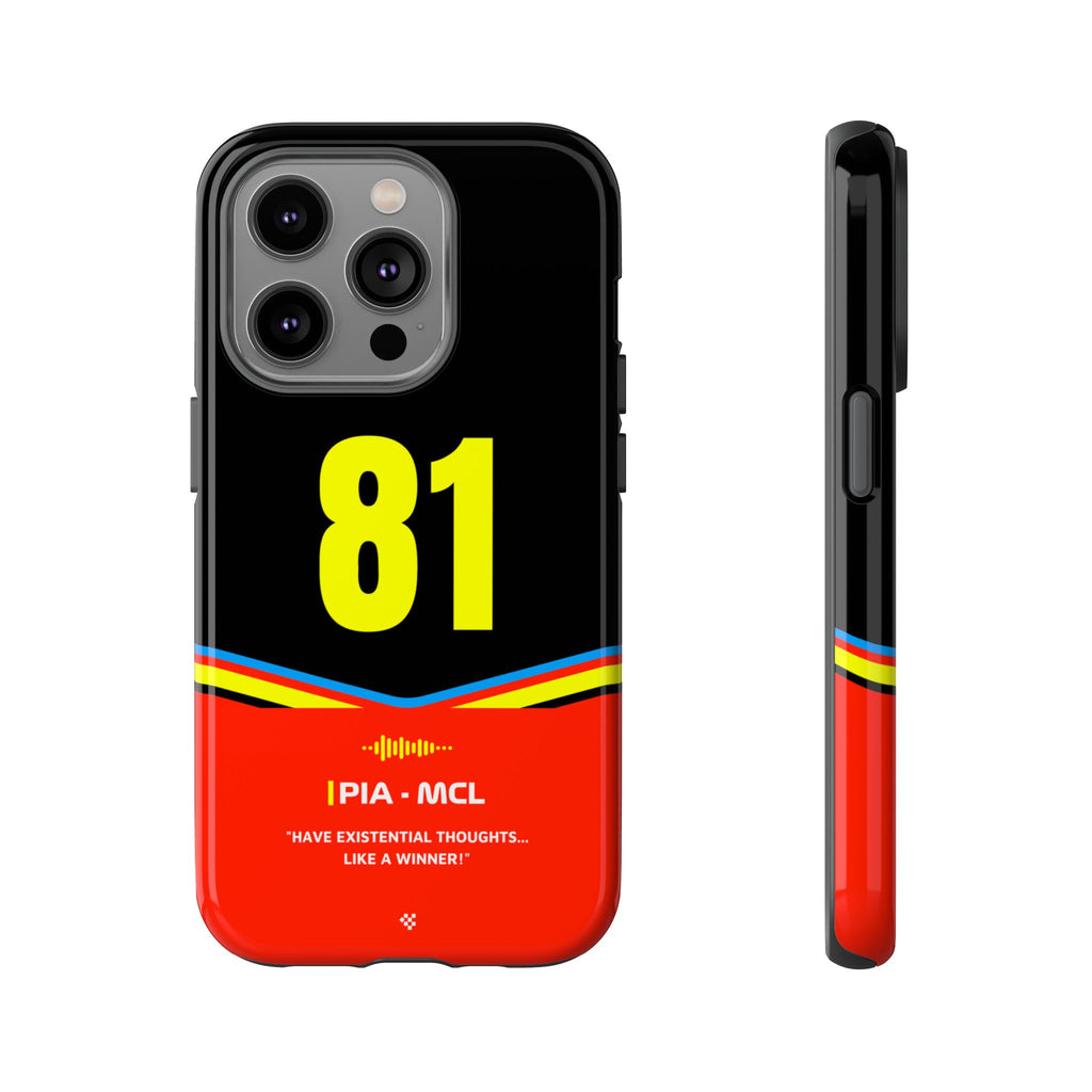 Support your favorite F1 driver with the exclusive Oscar Piastri F1 2025 Helmet Phone Case. It's the perfect accessory for every passionate Formula 1 and Piastri fan. Featuring Oscar's iconic #81 race number and his bold 2025 helmet colors, this black phone case brings racing energy straight to your hand.