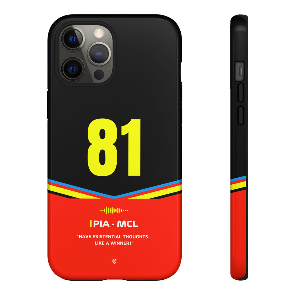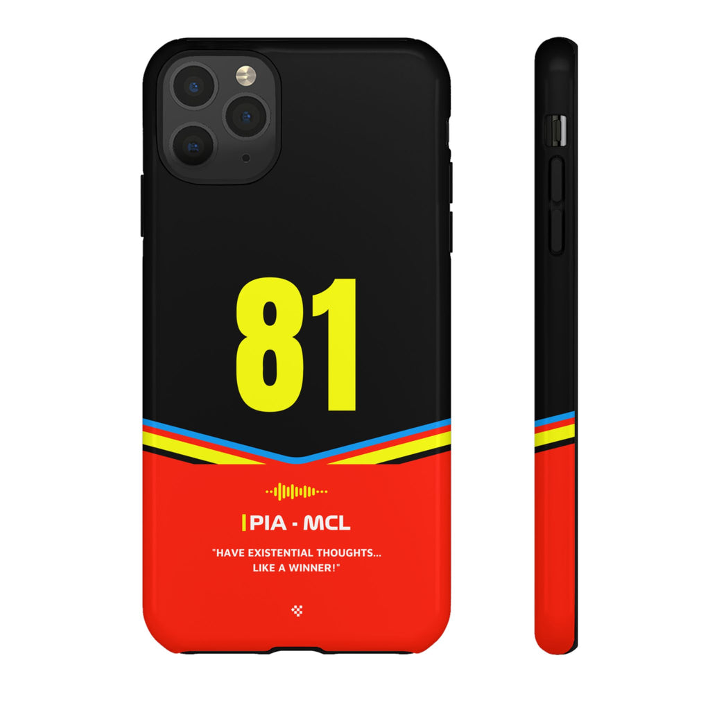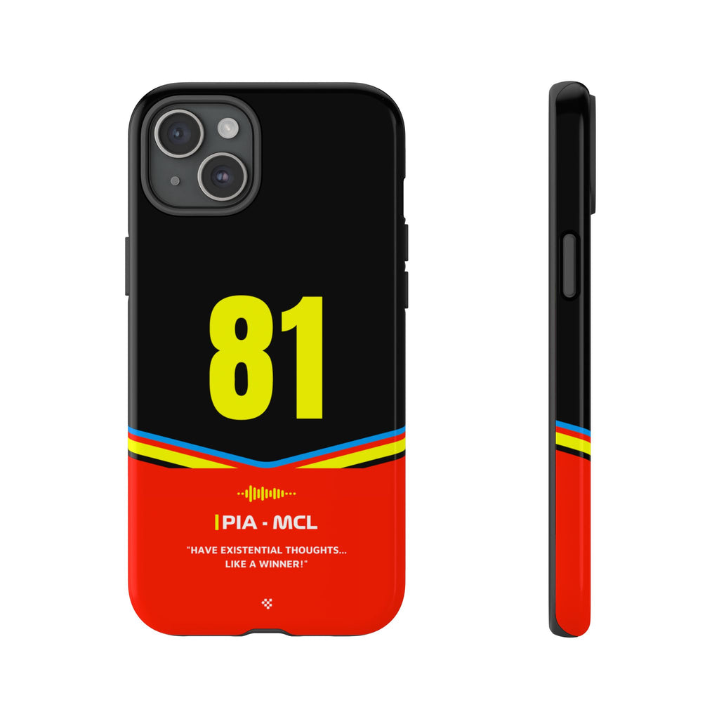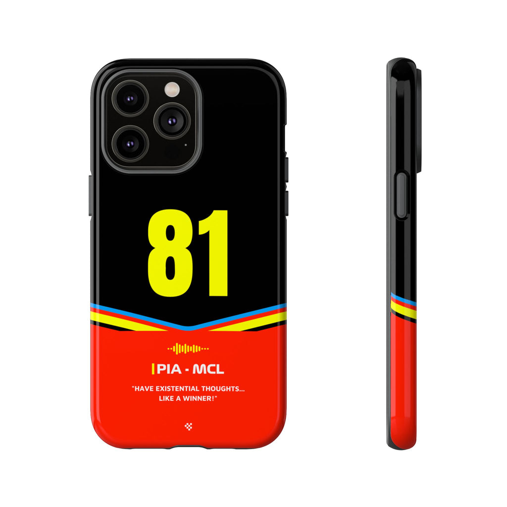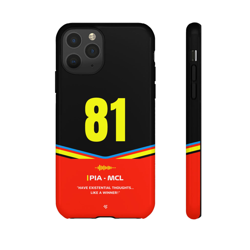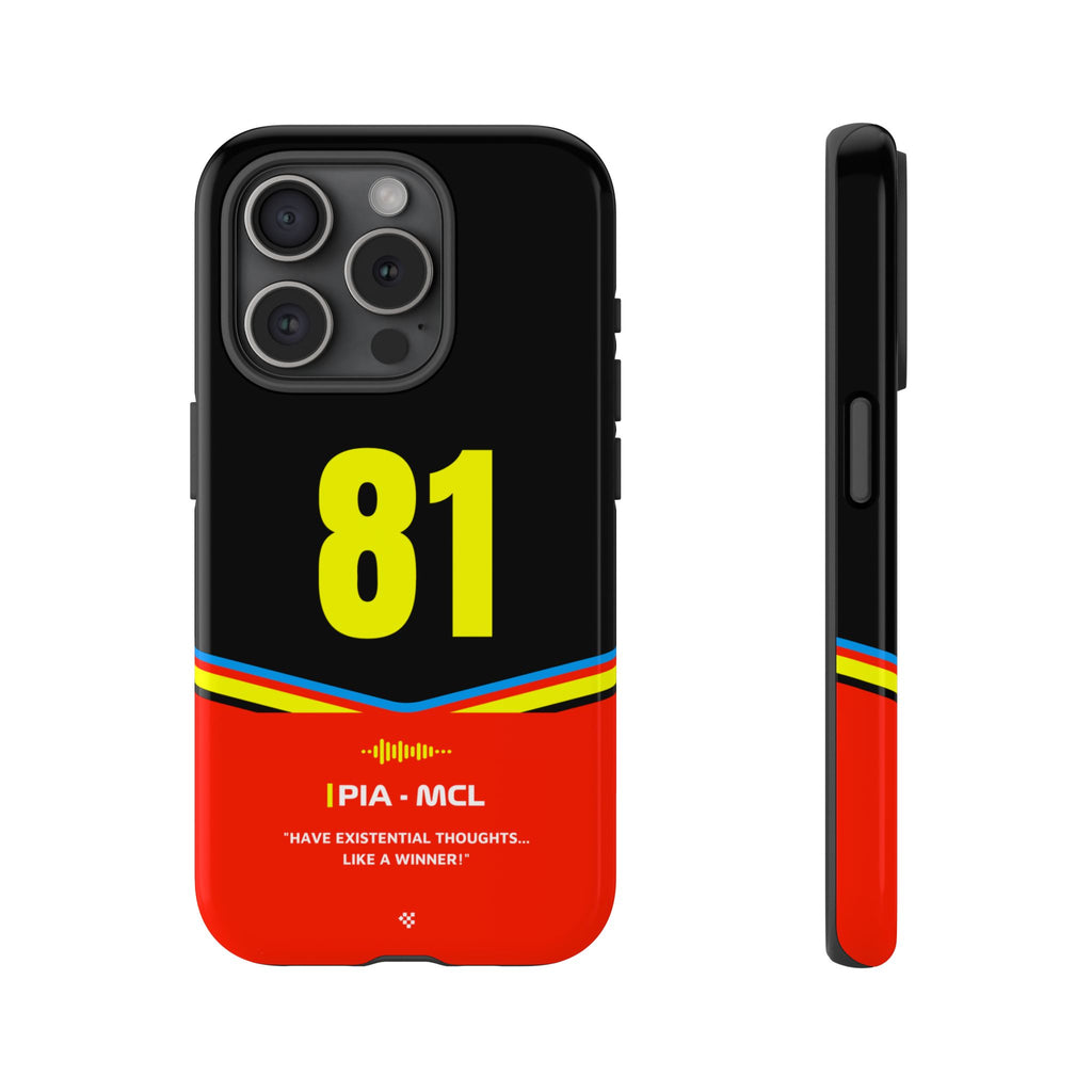 Support your favorite F1 driver with the exclusive Oscar Piastri F1 2025 Helmet Phone Case. It's the perfect accessory for every passionate Formula 1 and Piastri fan. Featuring Oscar's iconic #81 race number and his bold 2025 helmet colors, this black phone case brings racing energy straight to your hand.