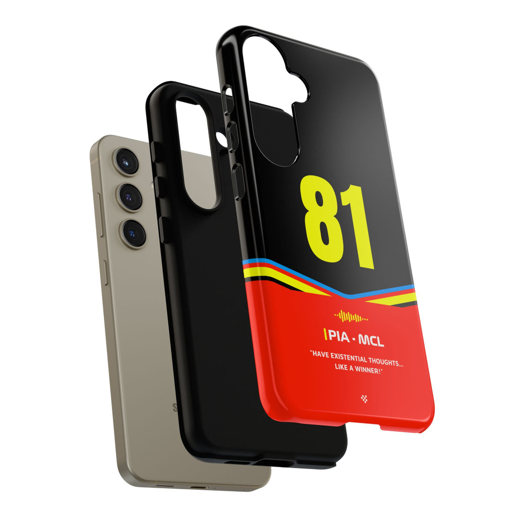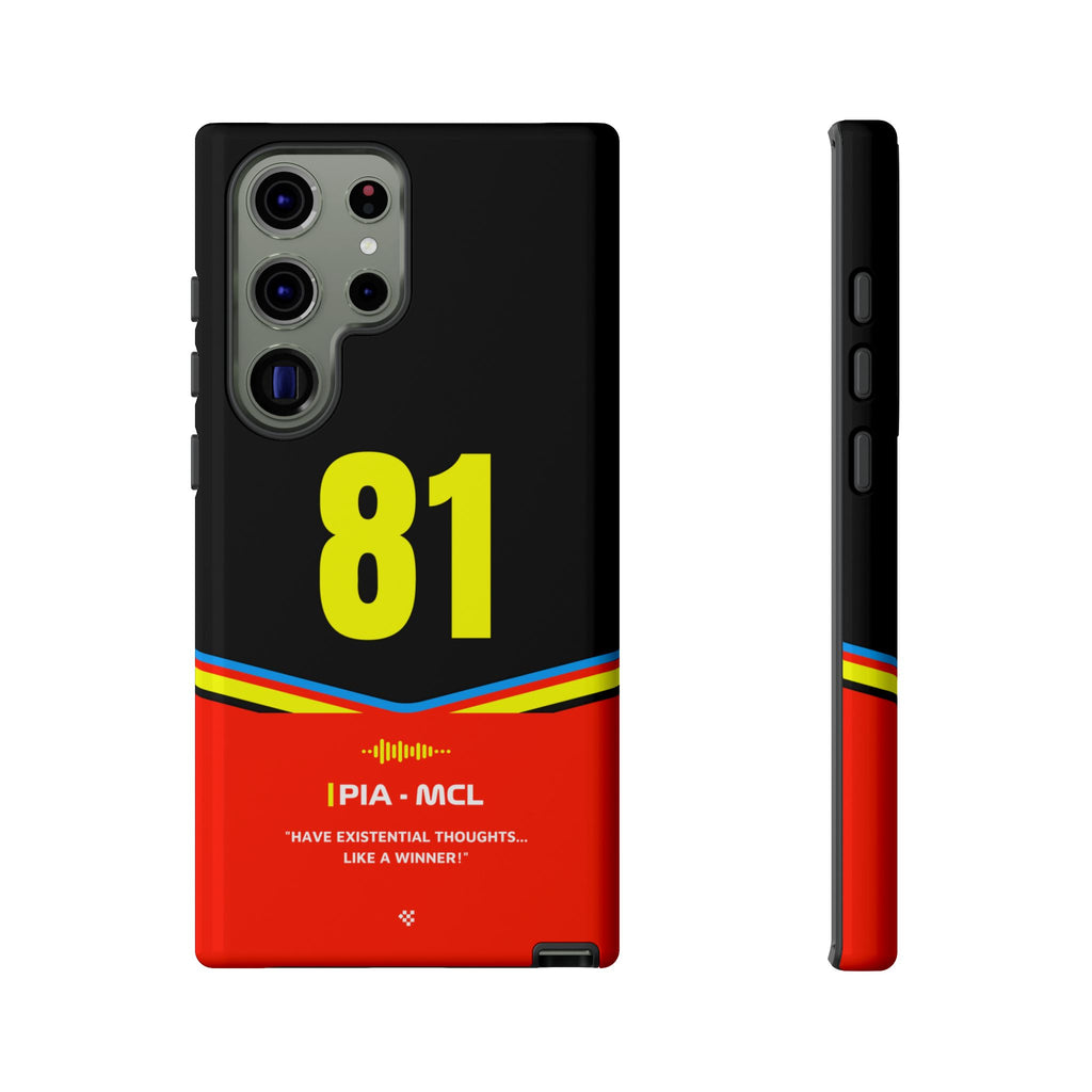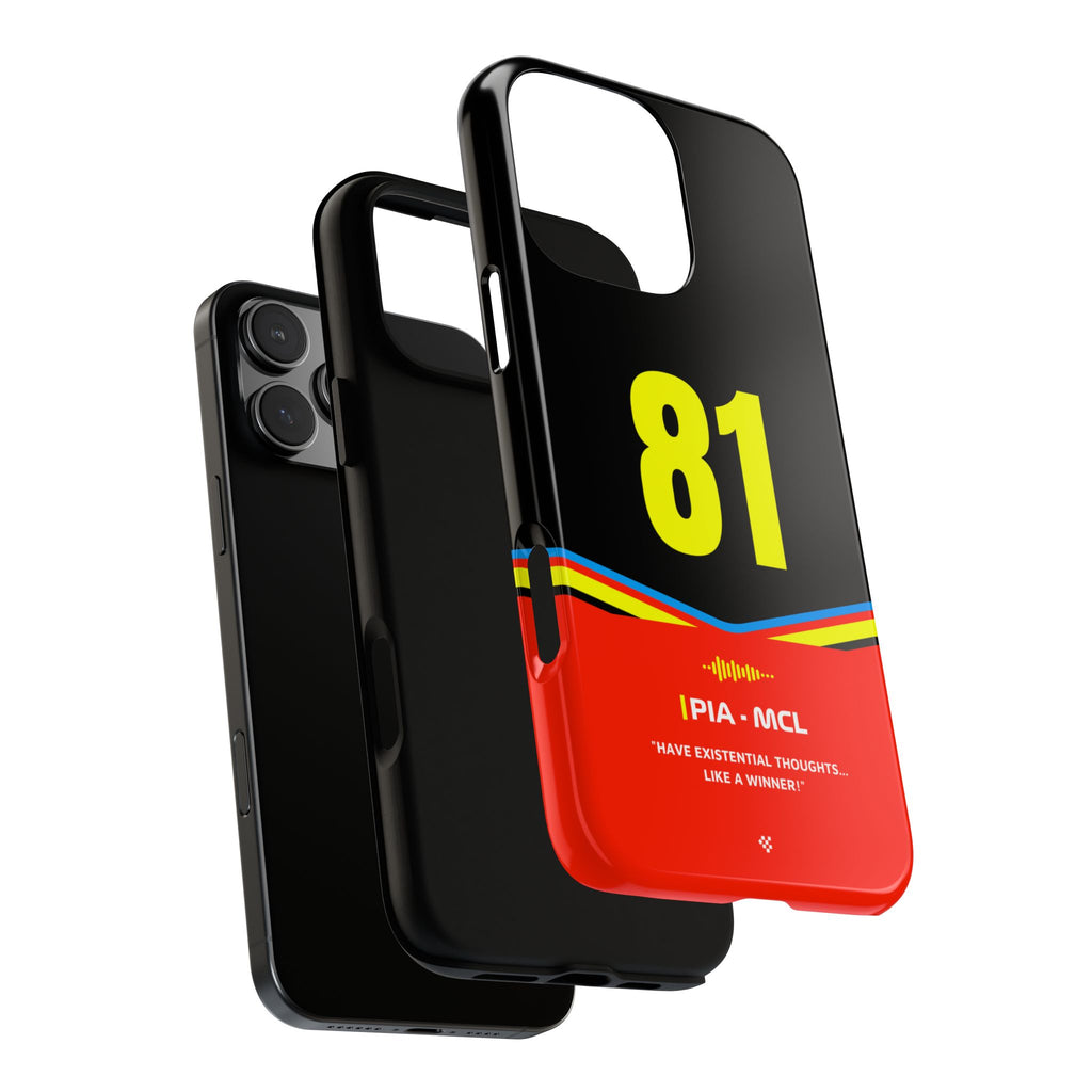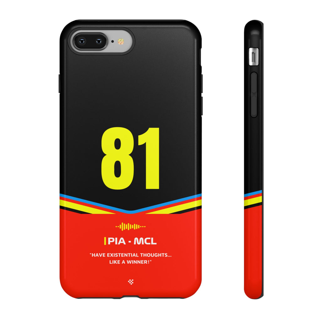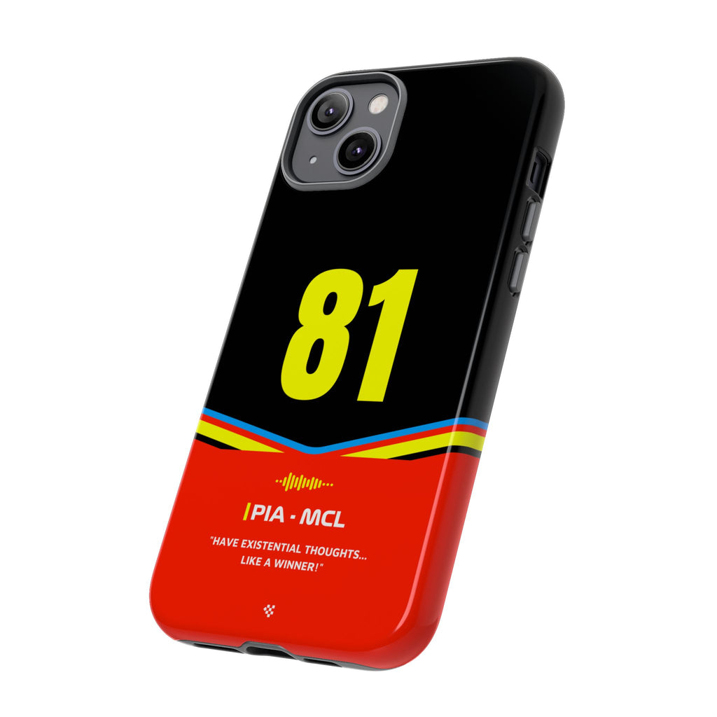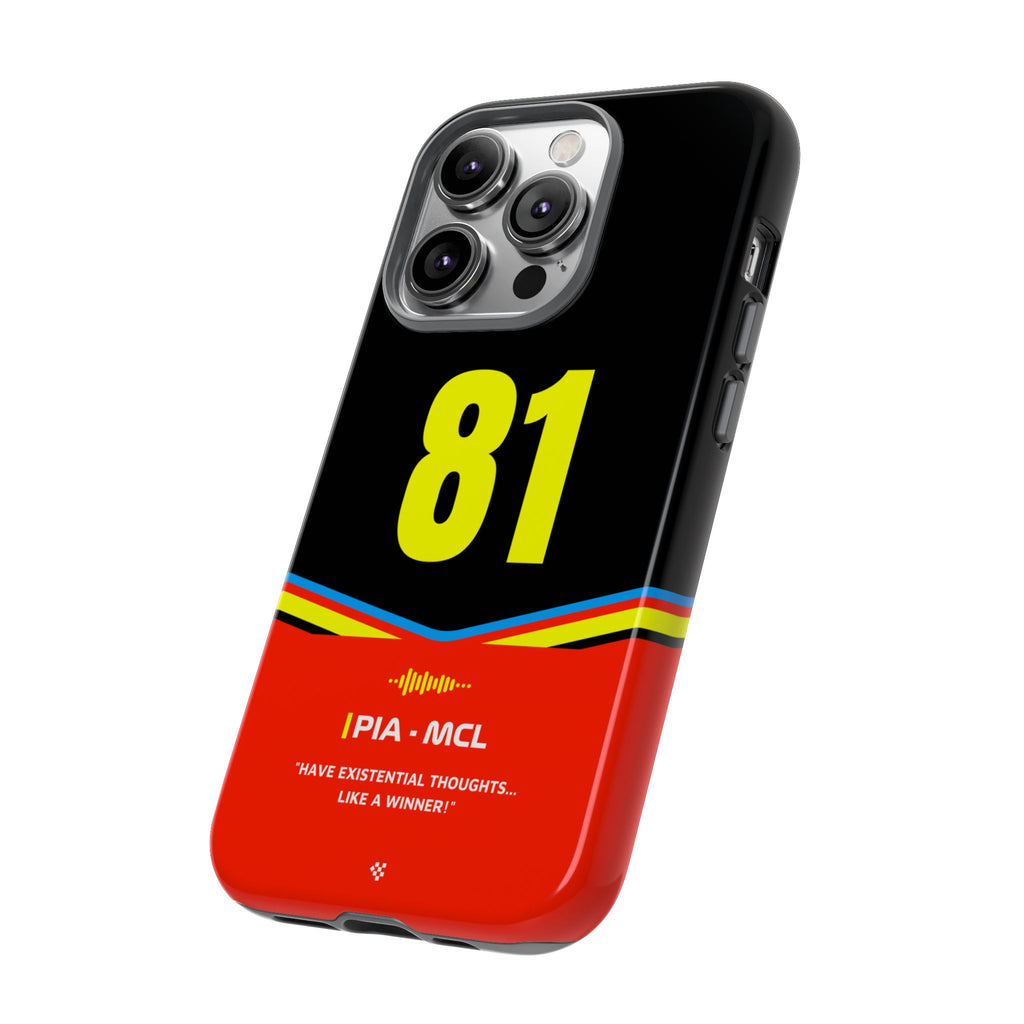 Support your favorite F1 driver with the exclusive Oscar Piastri F1 2025 Helmet Phone Case. It's the perfect accessory for every passionate Formula 1 and Piastri fan. Featuring Oscar's iconic #81 race number and his bold 2025 helmet colors, this black phone case brings racing energy straight to your hand.