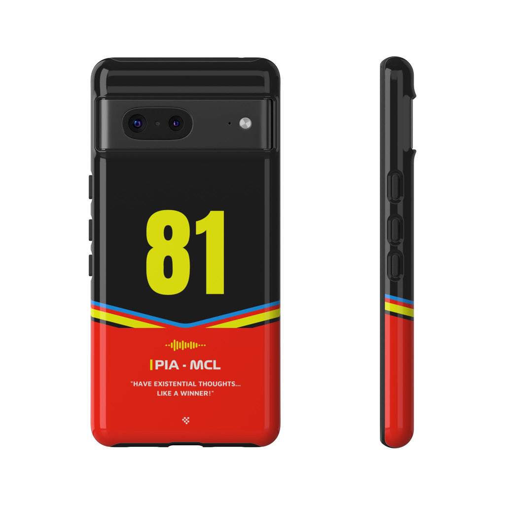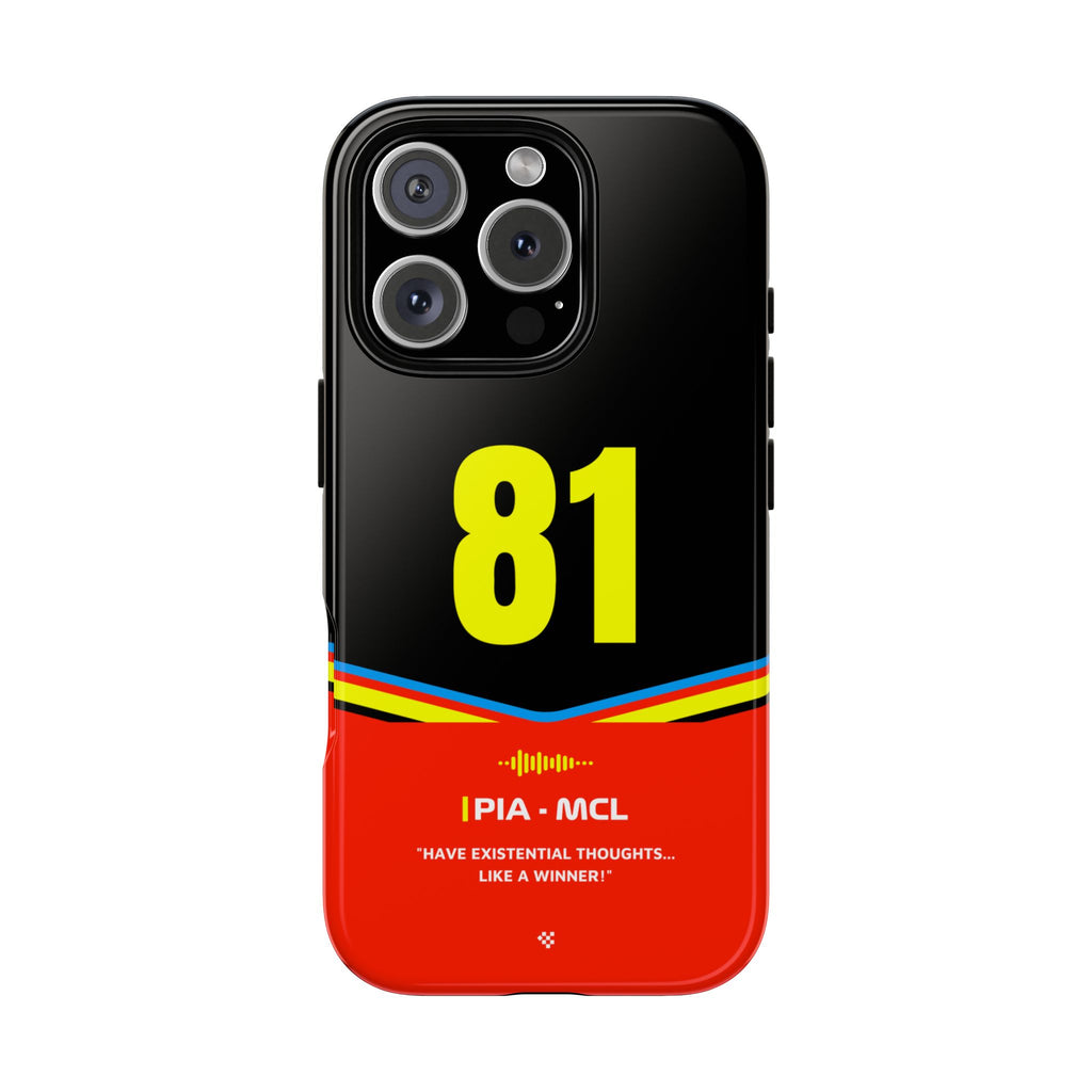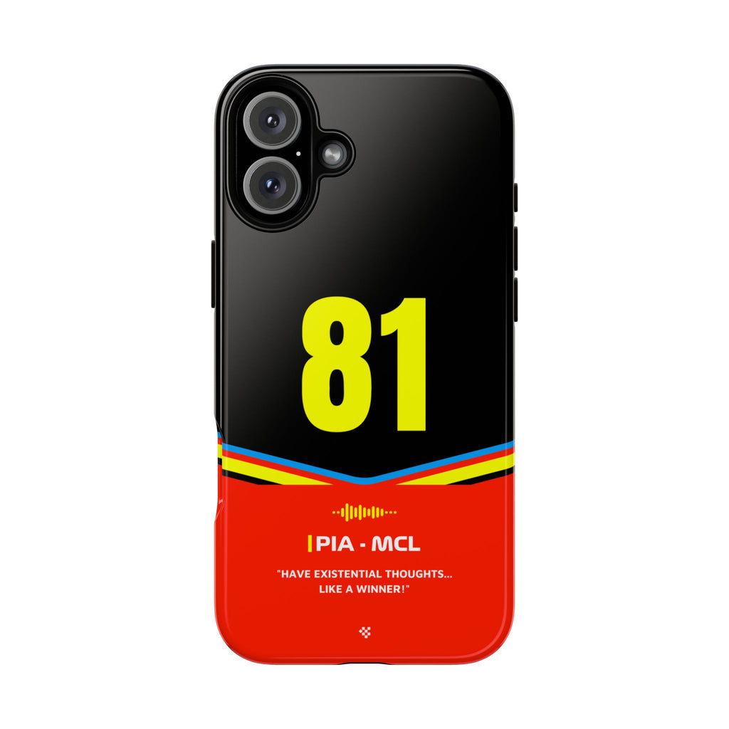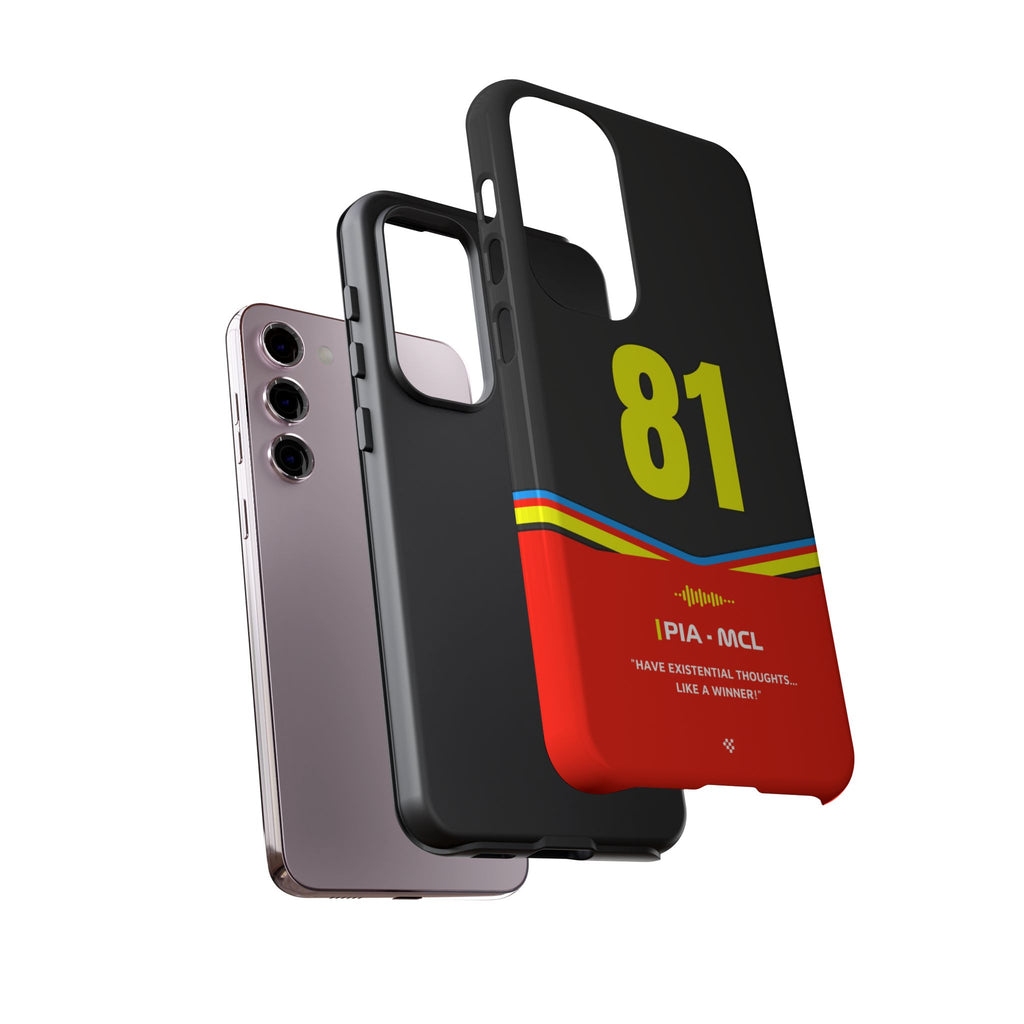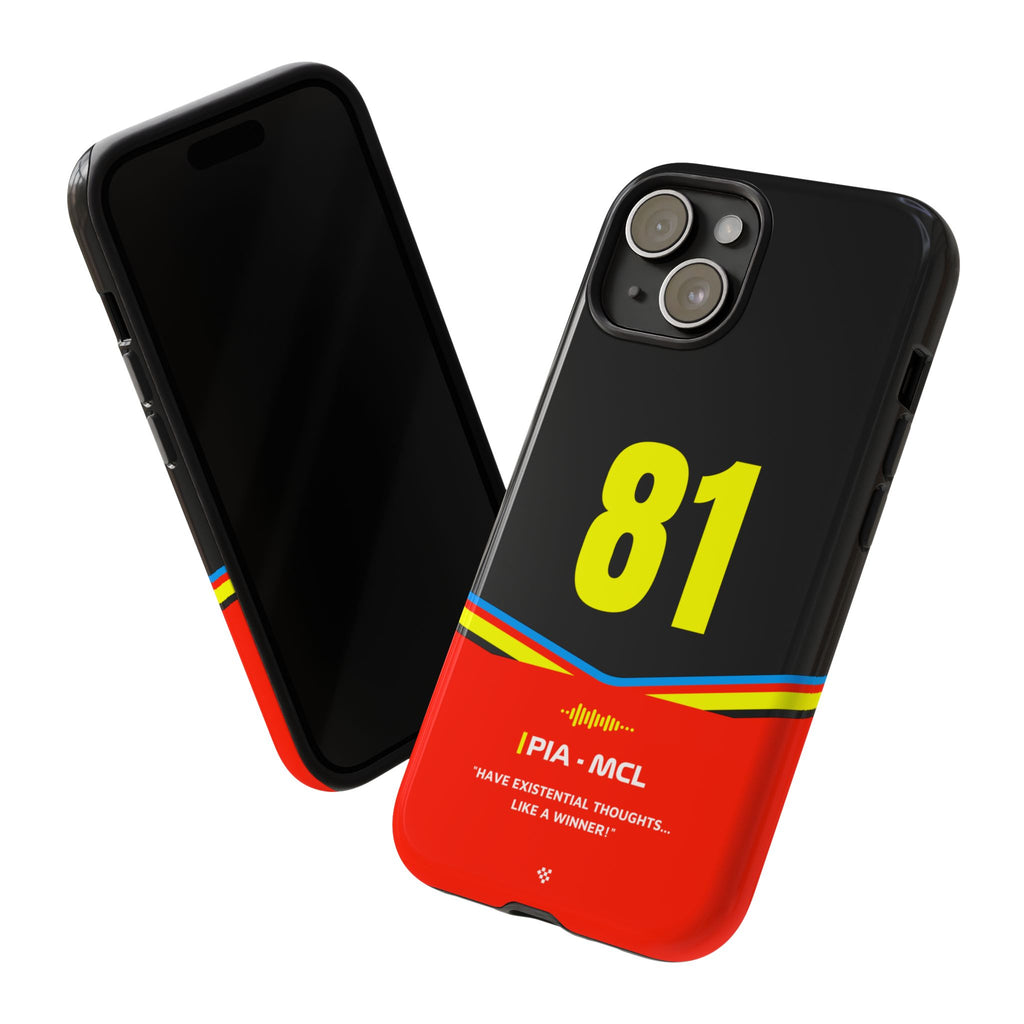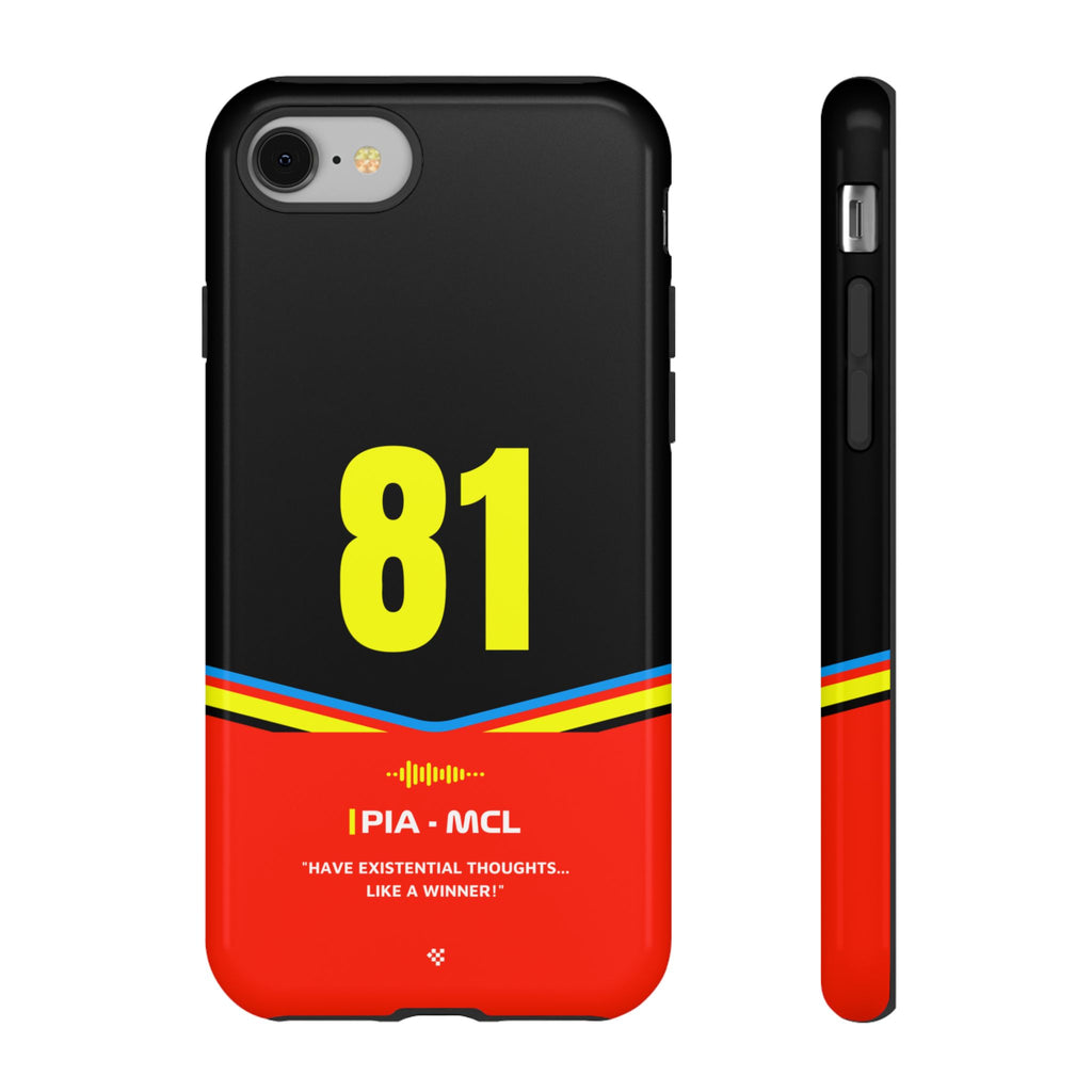 Support your favorite F1 driver with the exclusive Oscar Piastri F1 2025 Helmet Phone Case. It's the perfect accessory for every passionate Formula 1 and Piastri fan. Featuring Oscar's iconic #81 race number and his bold 2025 helmet colors, this black phone case brings racing energy straight to your hand.
