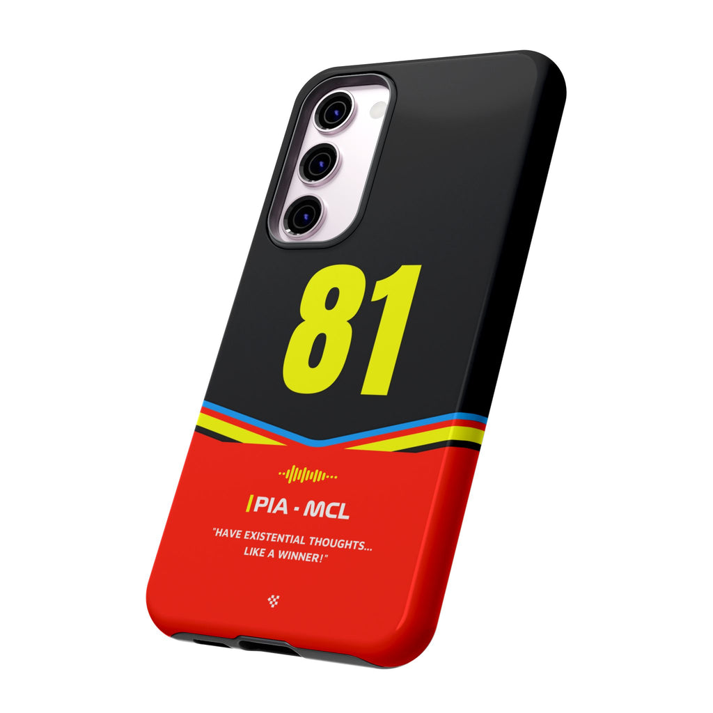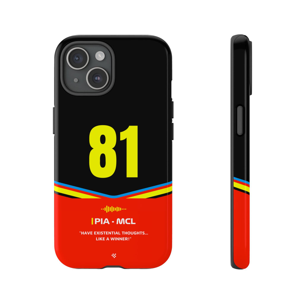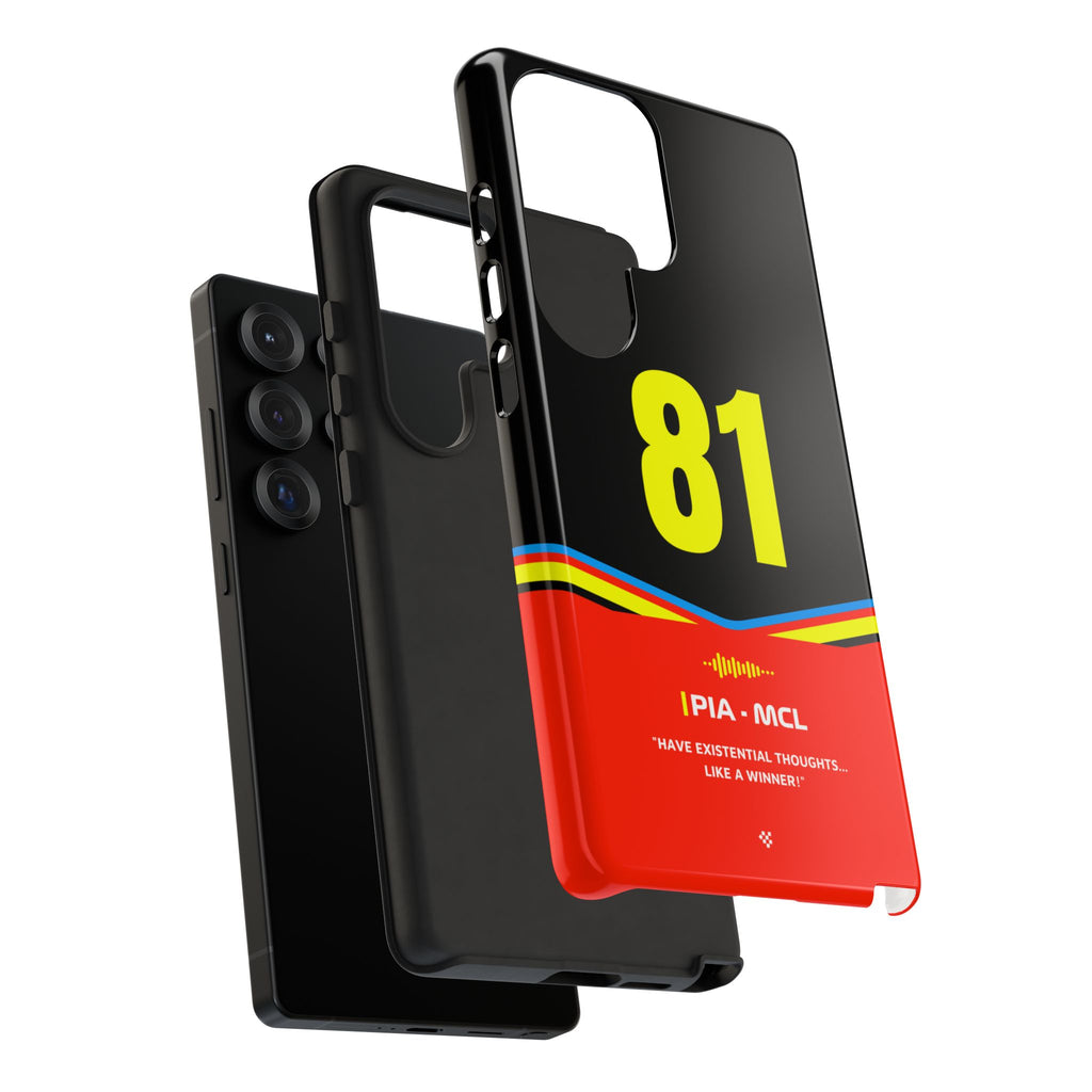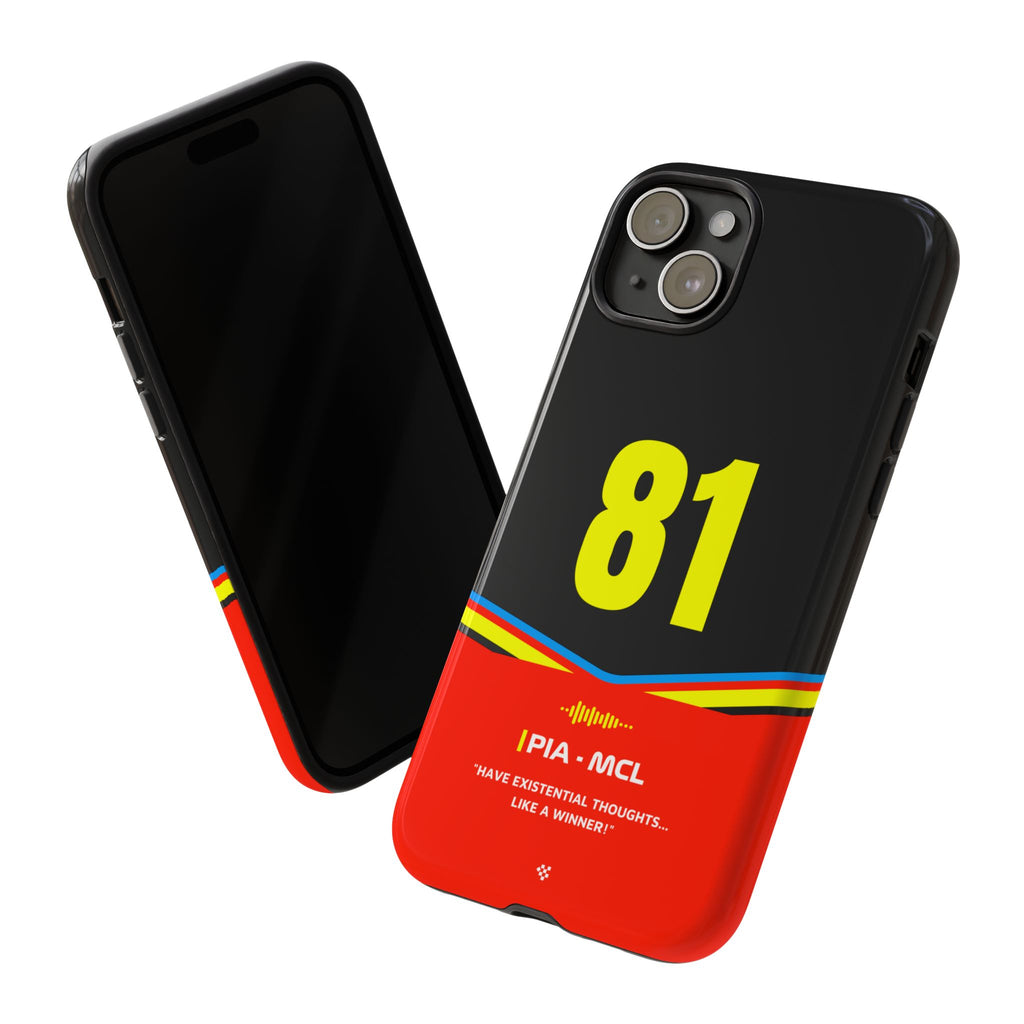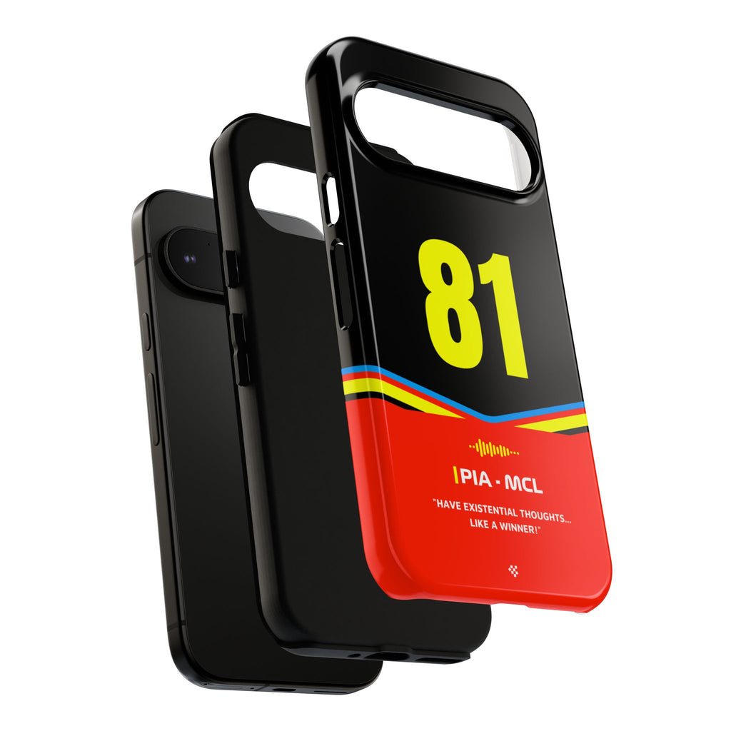 Support your favorite F1 driver with the exclusive Oscar Piastri F1 2025 Helmet Phone Case. It's the perfect accessory for every passionate Formula 1 and Piastri fan. Featuring Oscar's iconic #81 race number and his bold 2025 helmet colors, this black phone case brings racing energy straight to your hand.