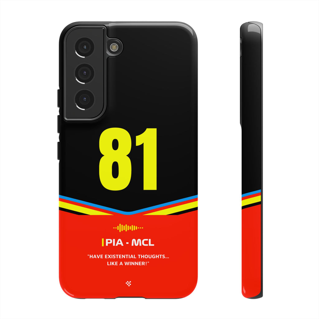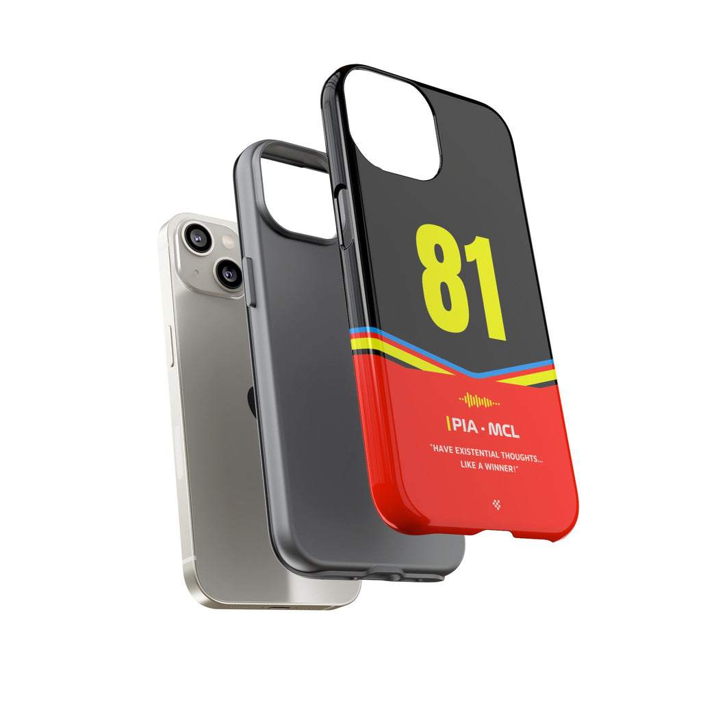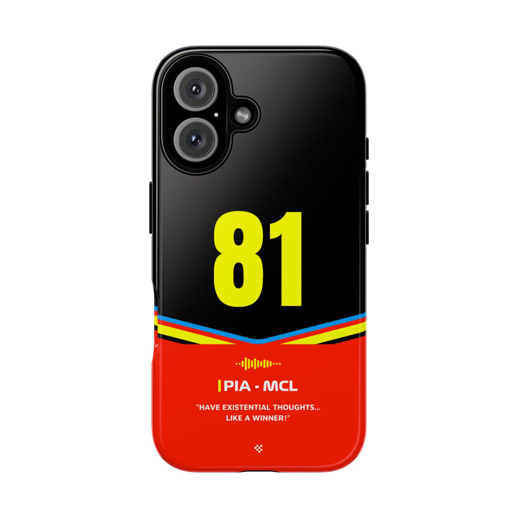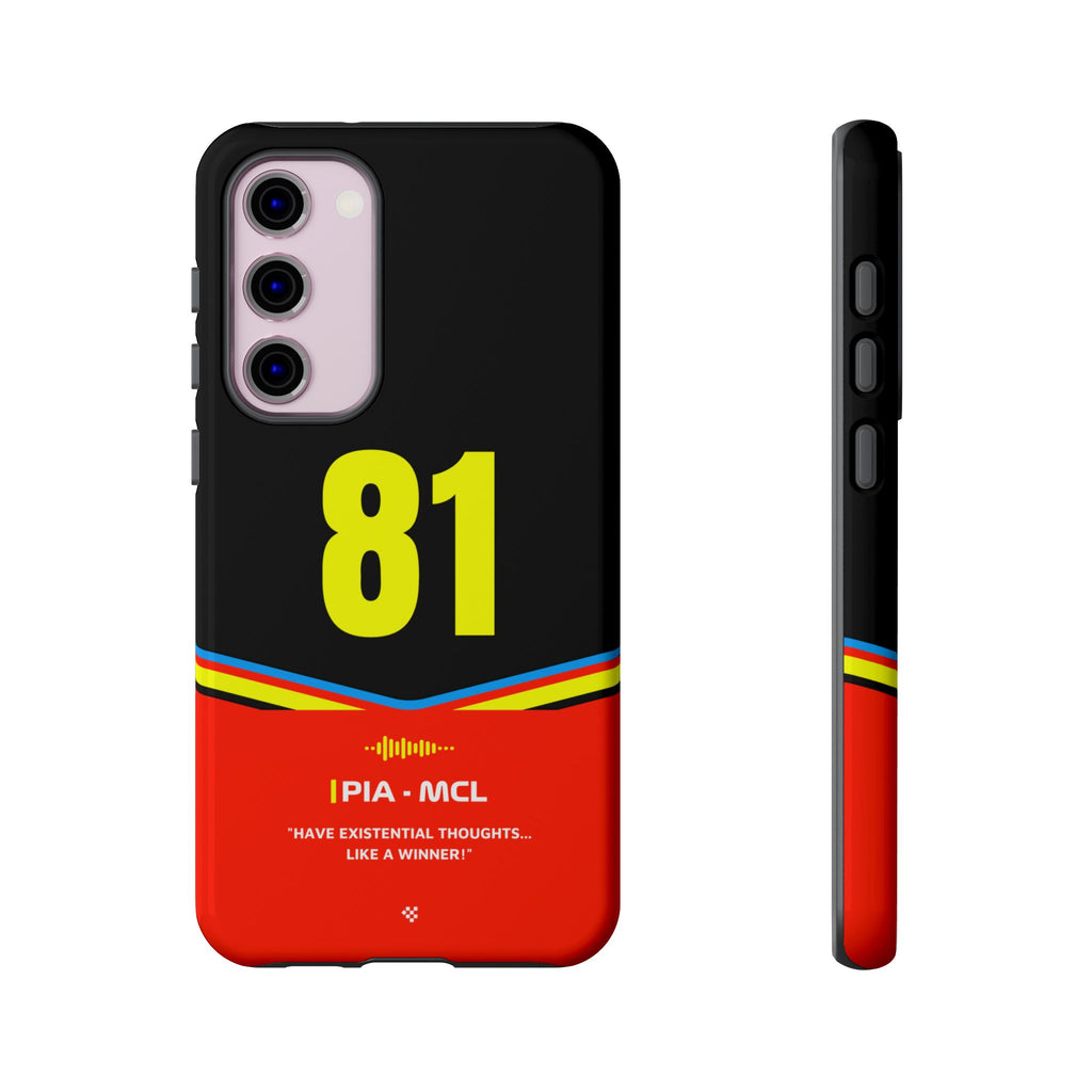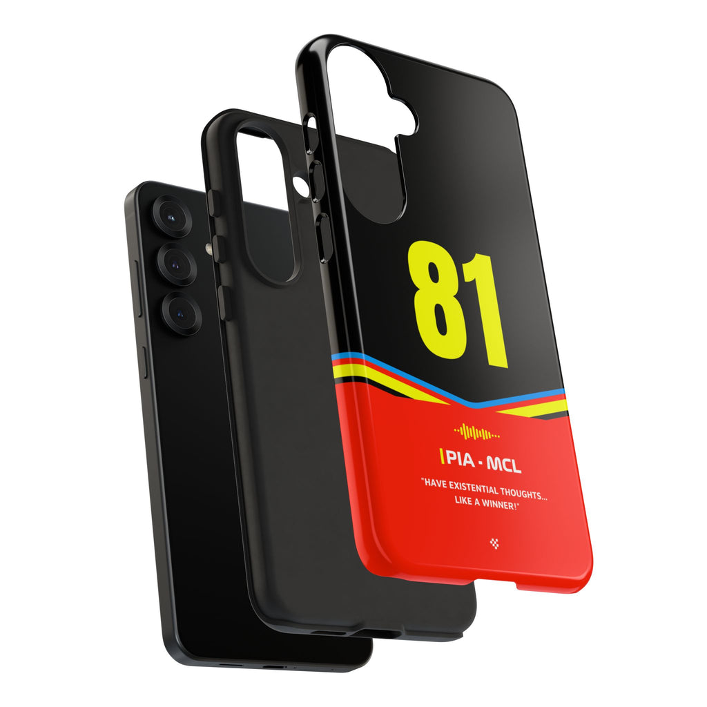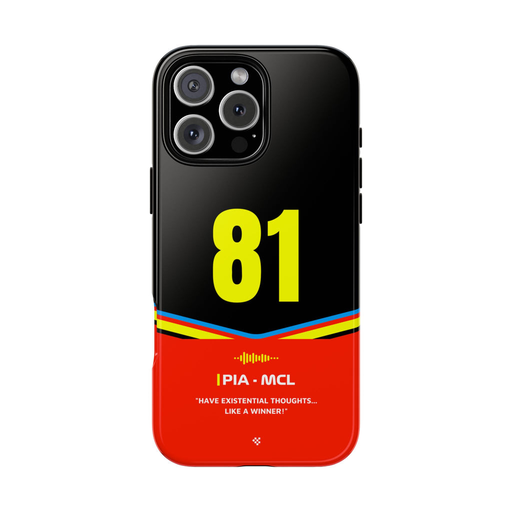 Support your favorite F1 driver with the exclusive Oscar Piastri F1 2025 Helmet Phone Case. It's the perfect accessory for every passionate Formula 1 and Piastri fan. Featuring Oscar's iconic #81 race number and his bold 2025 helmet colors, this black phone case brings racing energy straight to your hand.